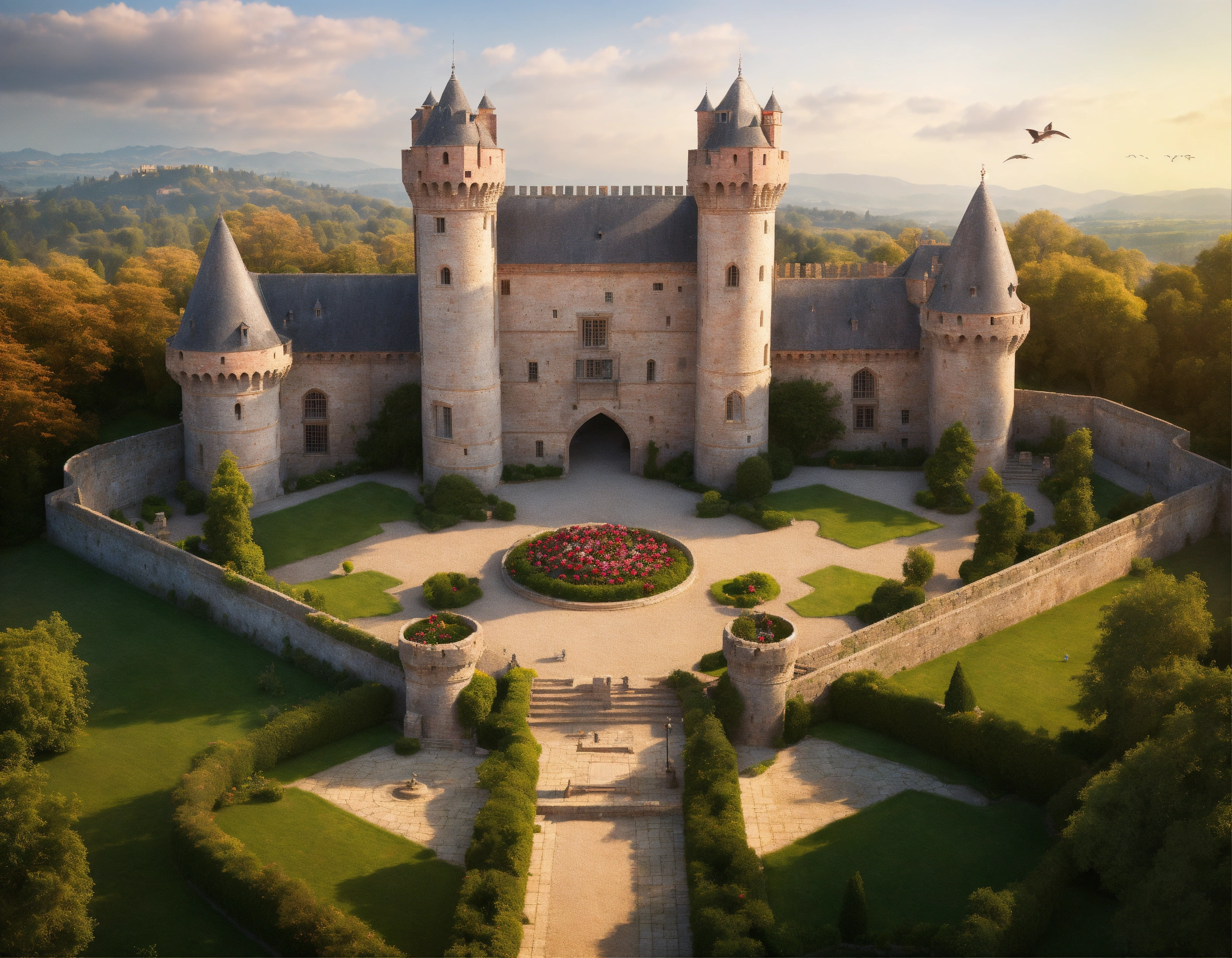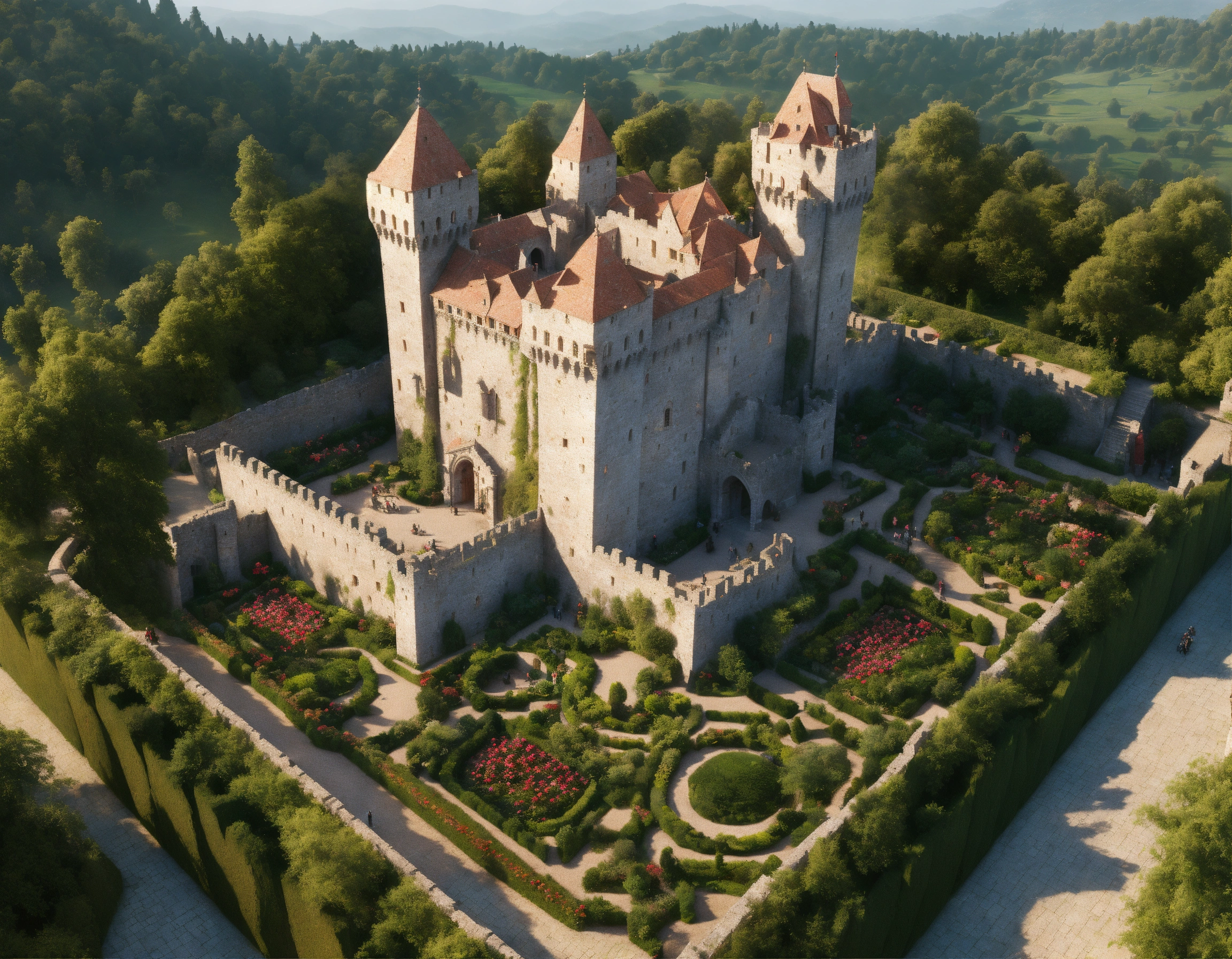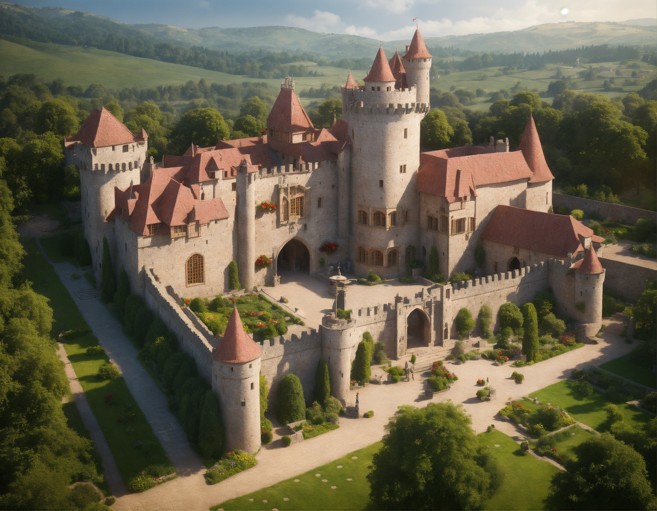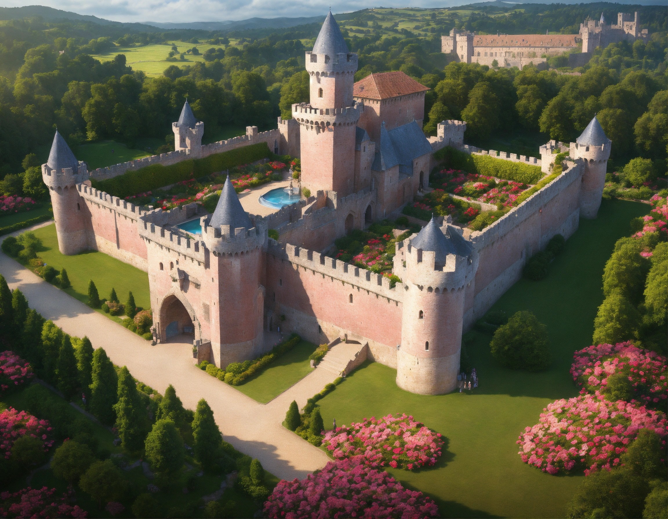 Ultra realistic, photorealistic, bird's eye view of a medieval castle, palace of roses, rose bowers, magnificent rose garden and arcades, magnificent fountain, marble figures, massive crenellated stone wall with wall gate and watchtowers, with a large inner courtyard and several servants' quarters, extensive rose fields on hilly landscapes in the area, very detailled, focus on castle, sharp focus, sharp, ambient lighting