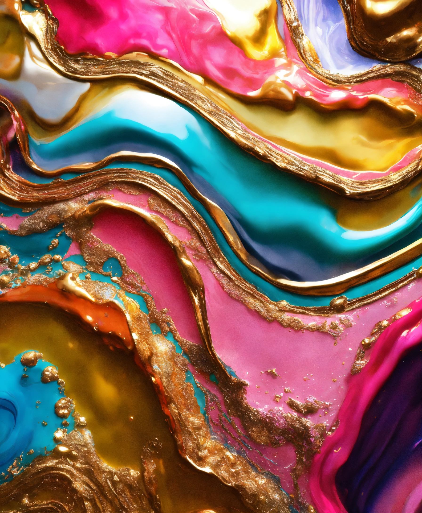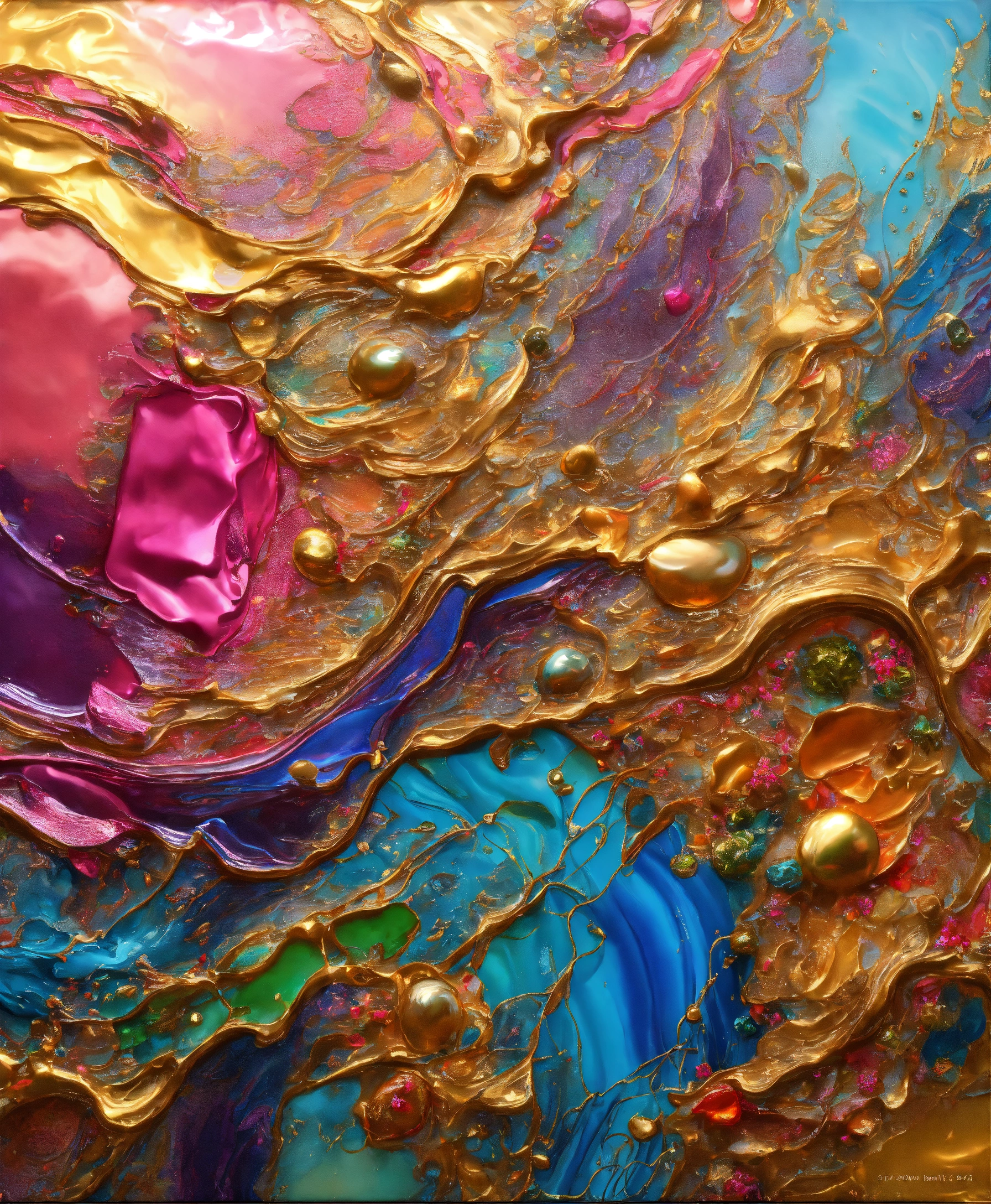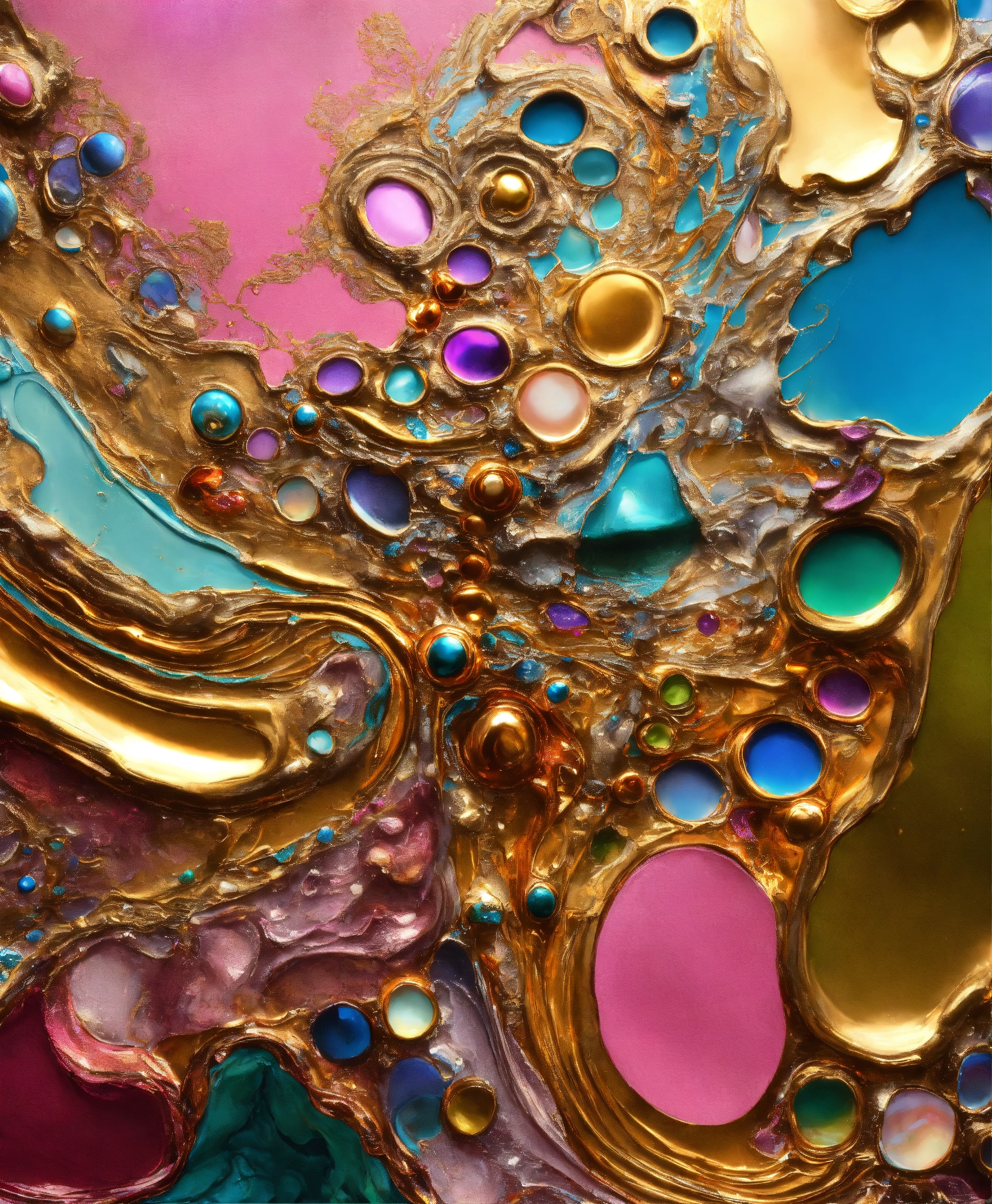 Colorful abstract painting oil and water complex complicated bright vivid colors beautiful opulent wealthy intricate all hues primary secondary and tertiary colors pink peridot sky blue lilac green magenta orange gold silver bronze copper mother of pearl magnificent amazing sublime delicate hyperdetailed masterpiece complex extraordinary metallic sheen elaborate awesome 24k bright gold and silver trims everywhere oil and water abstract art 24k bright gold trim everywhere glossy hyperdetailed 12k