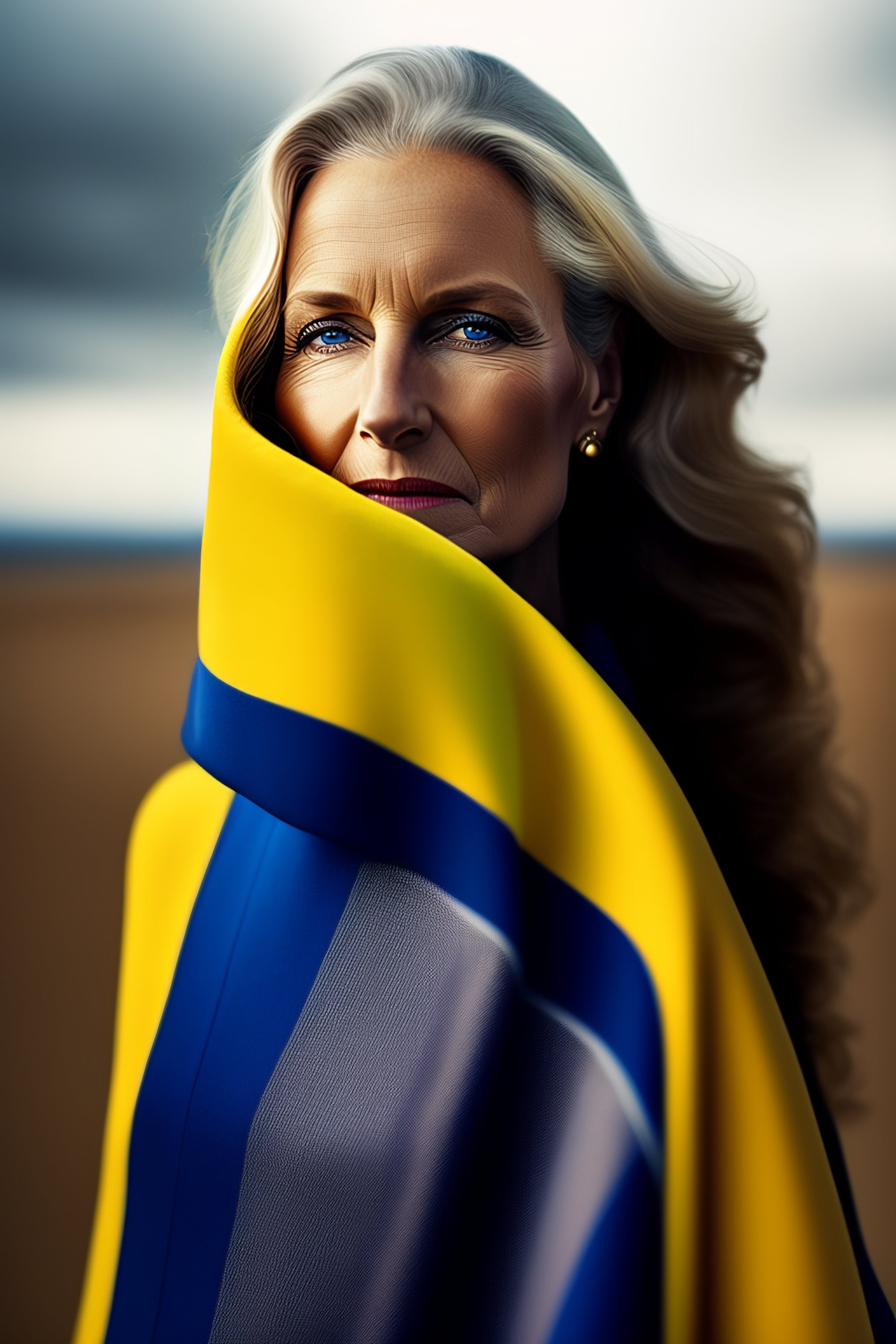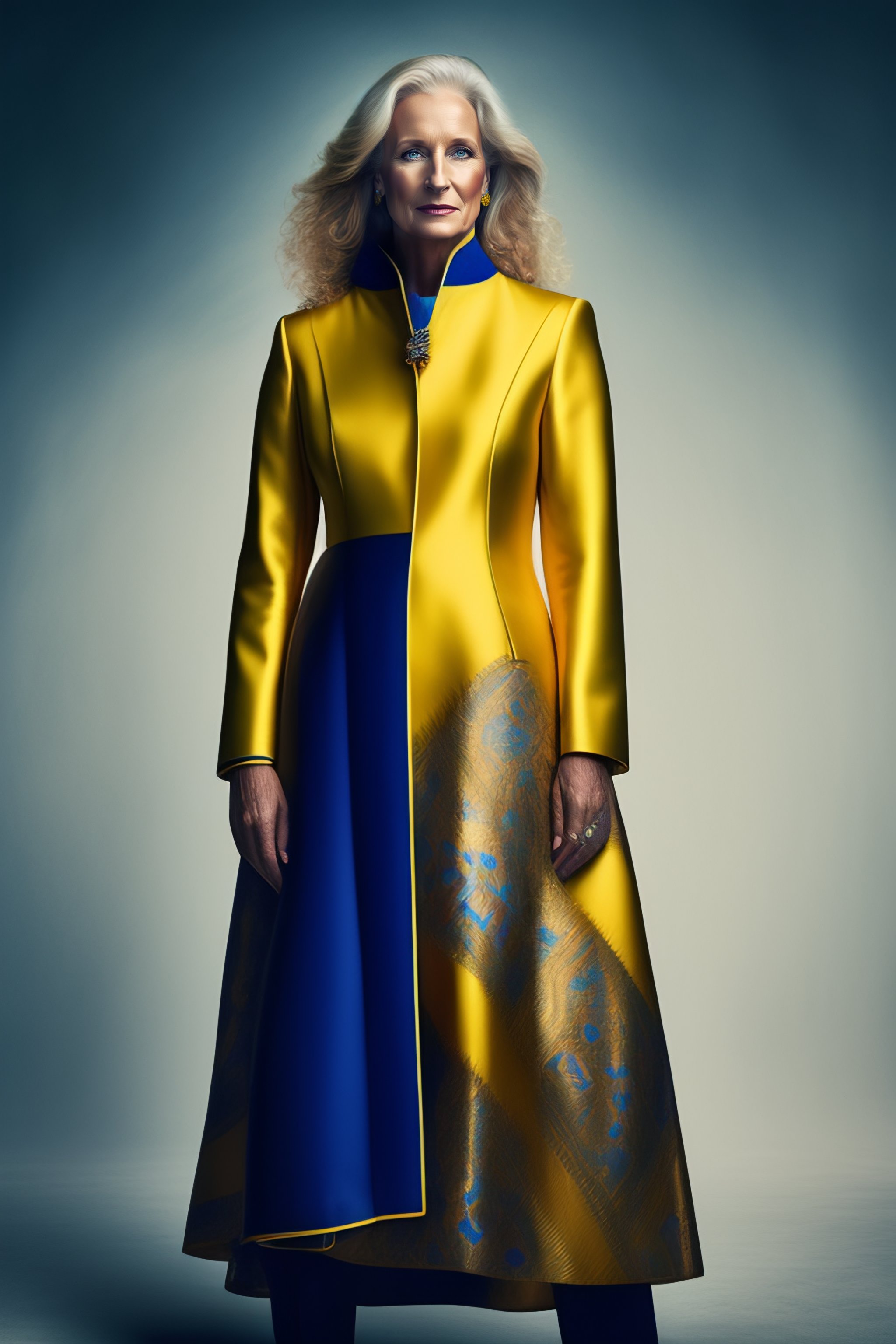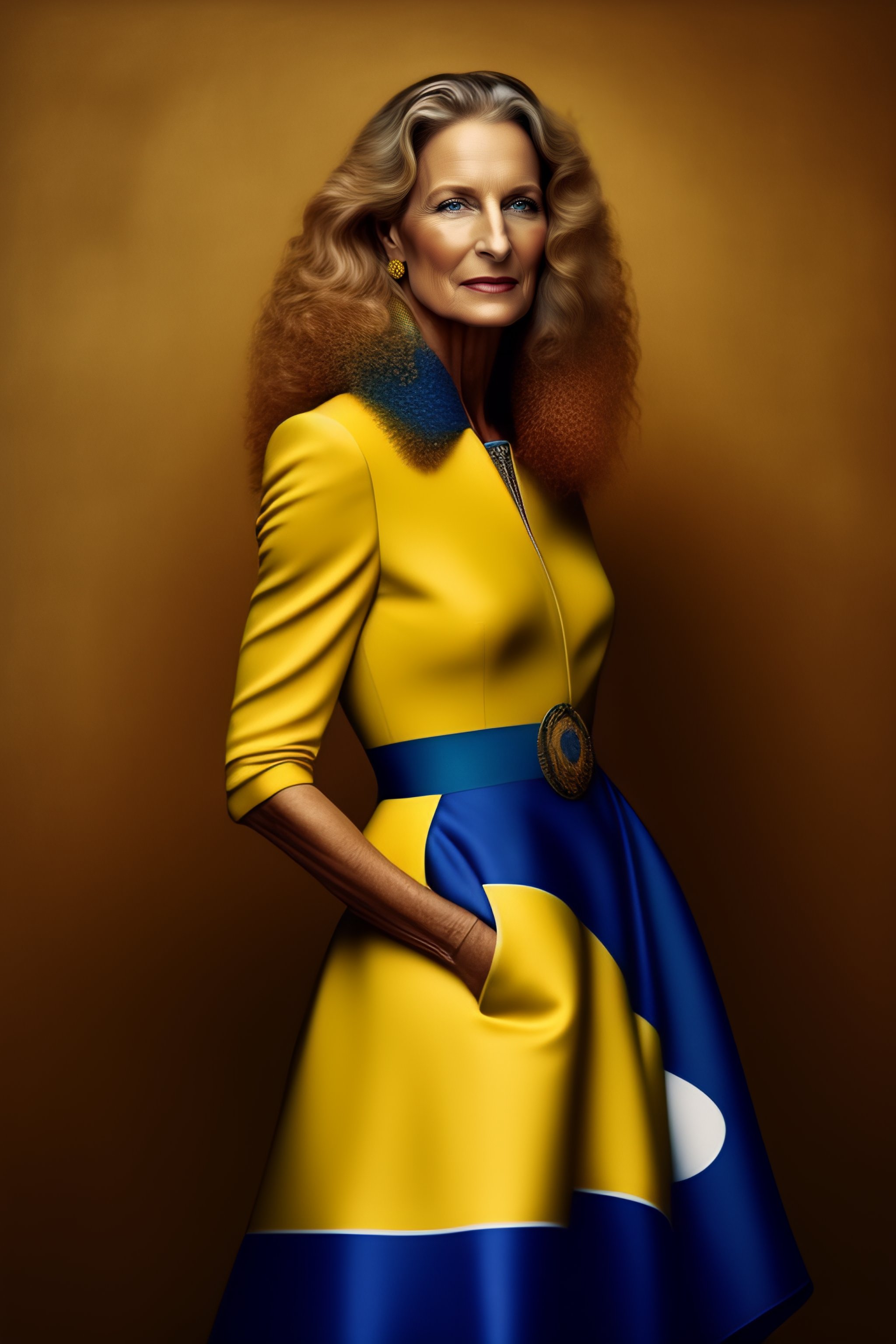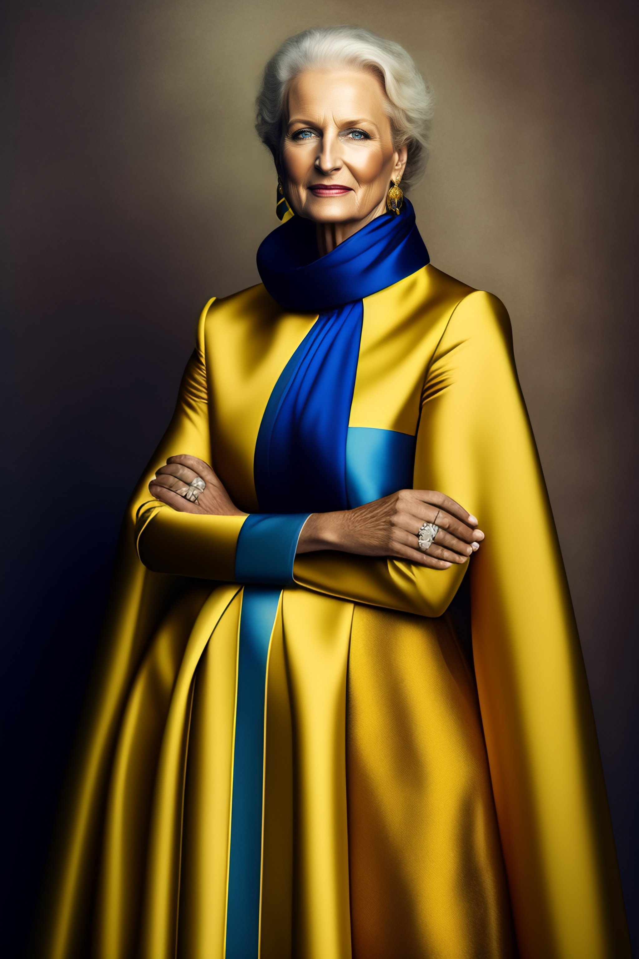 Annie leibovitz wearing dress of ukrainian flag colours, portrait, photo, photography –s 625 –q 2 –iw 3