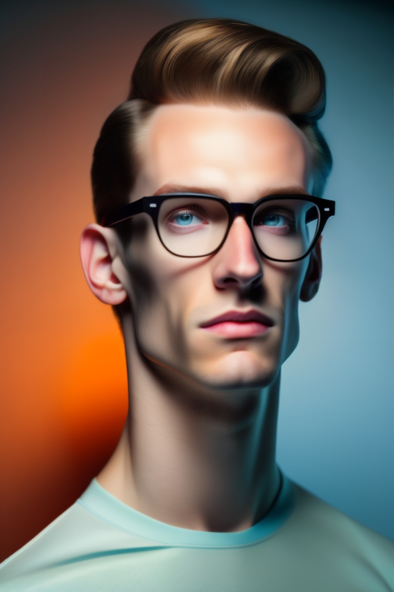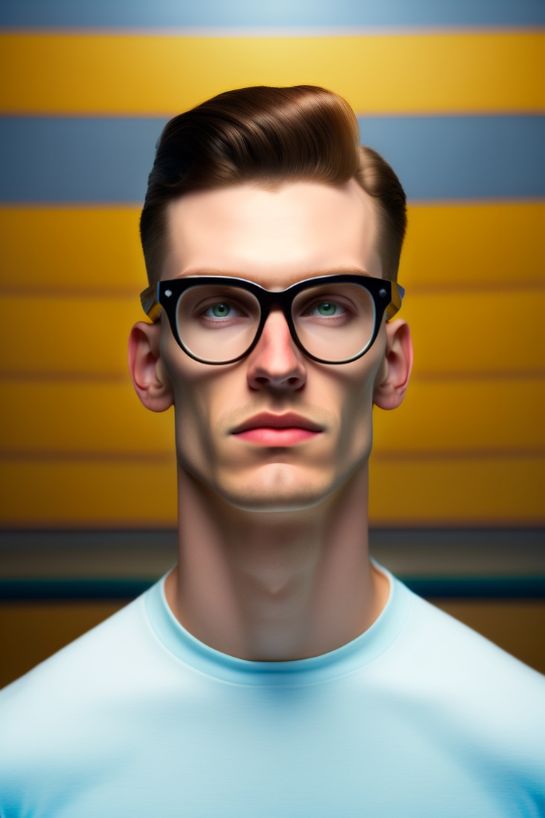 Beautiful studio photograph of colorful portrait photography one caucasian men with square glasses and hair bun, beautiful symmetrical face accurate face detailed face realistic proportions by ron mueck and matthew barney and greg rutkowski, hysterical realism intense cinematic lighting shocking detail 8 k, hyperrealistic, realistic light and shadows