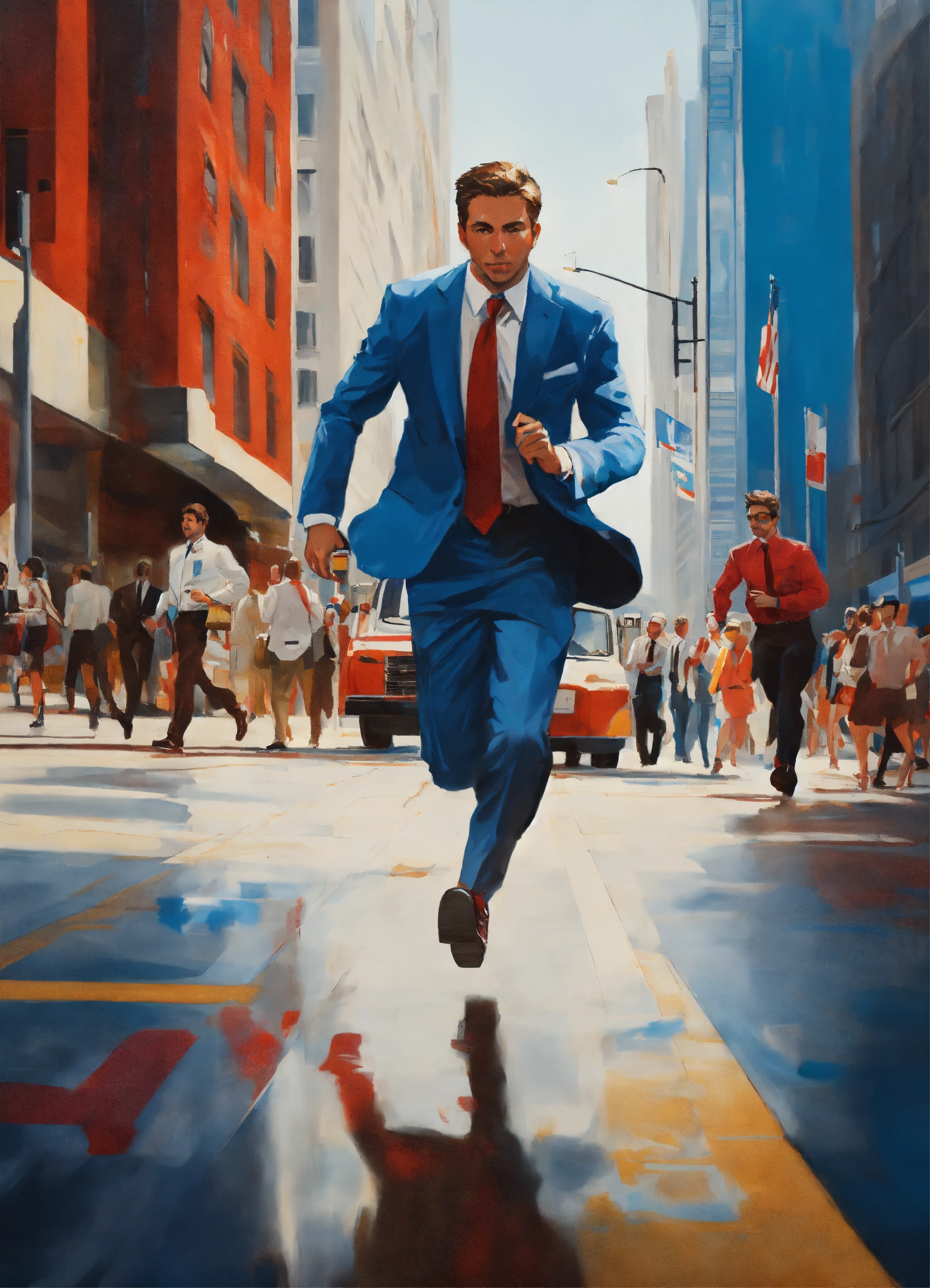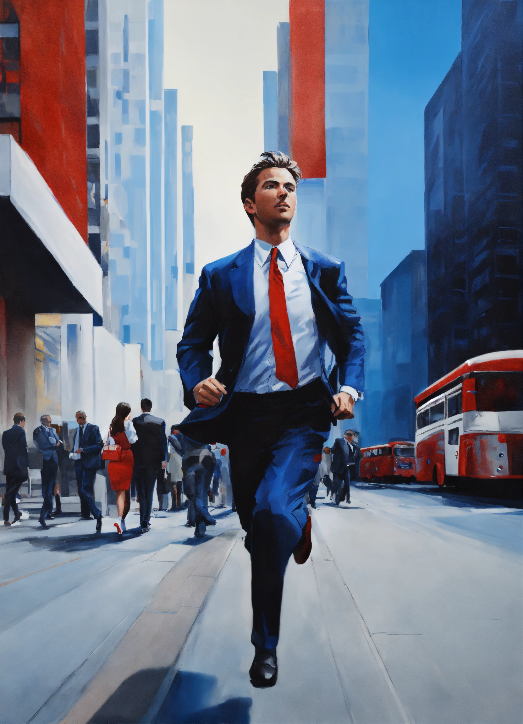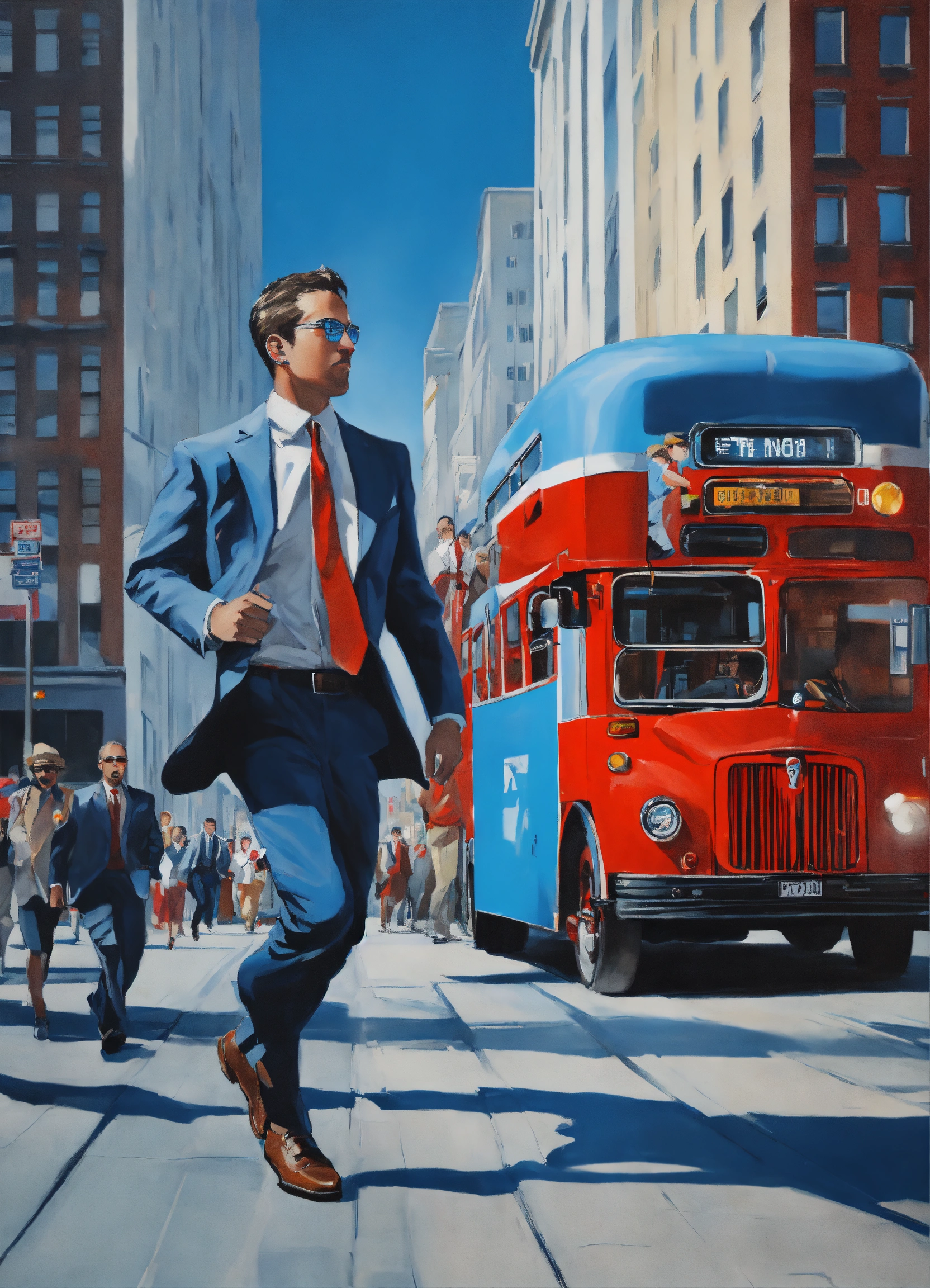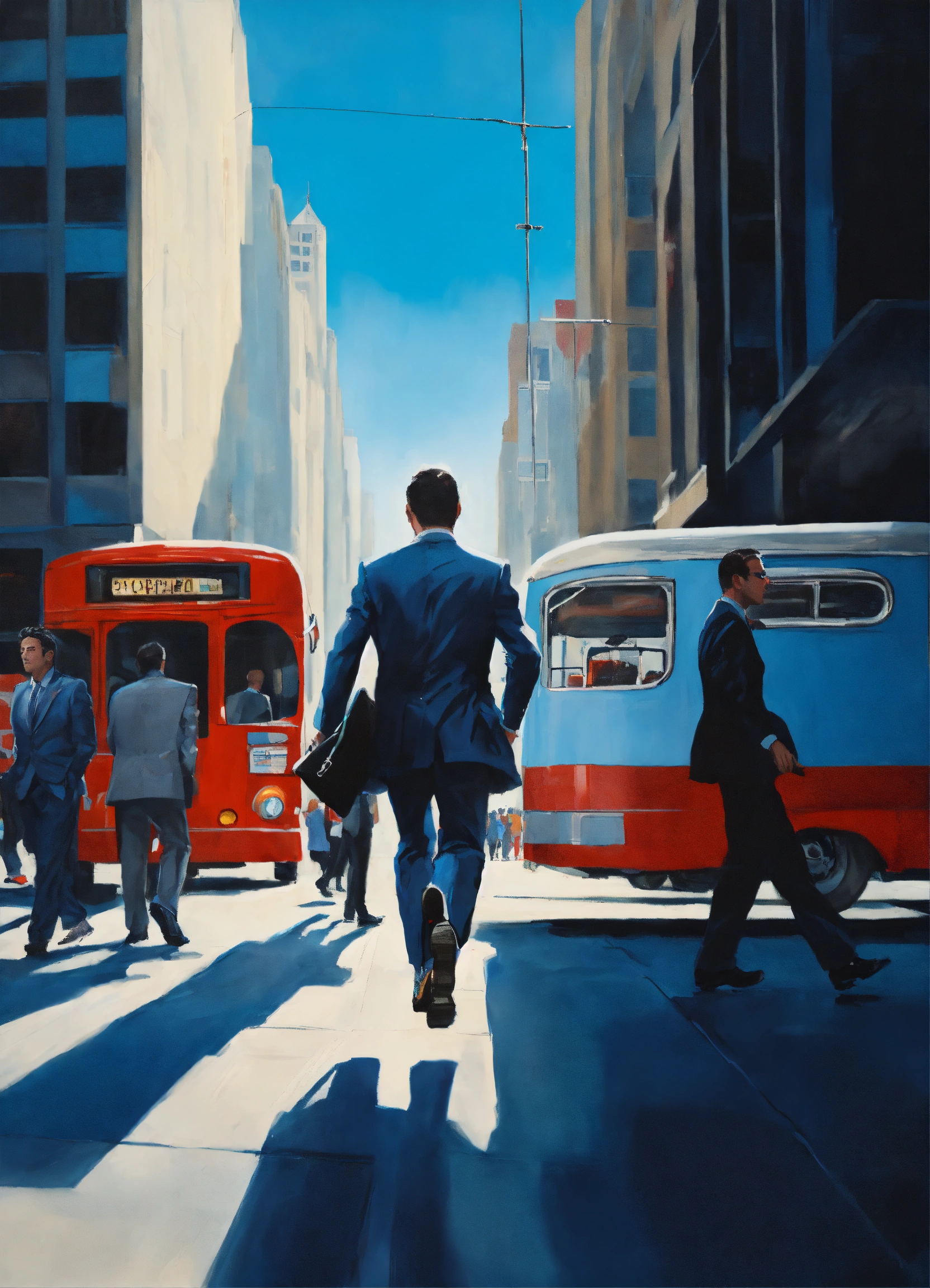 Superrealist style, urban style, a businessman running to a bus in the street, many people, blue, red, white, pale blue