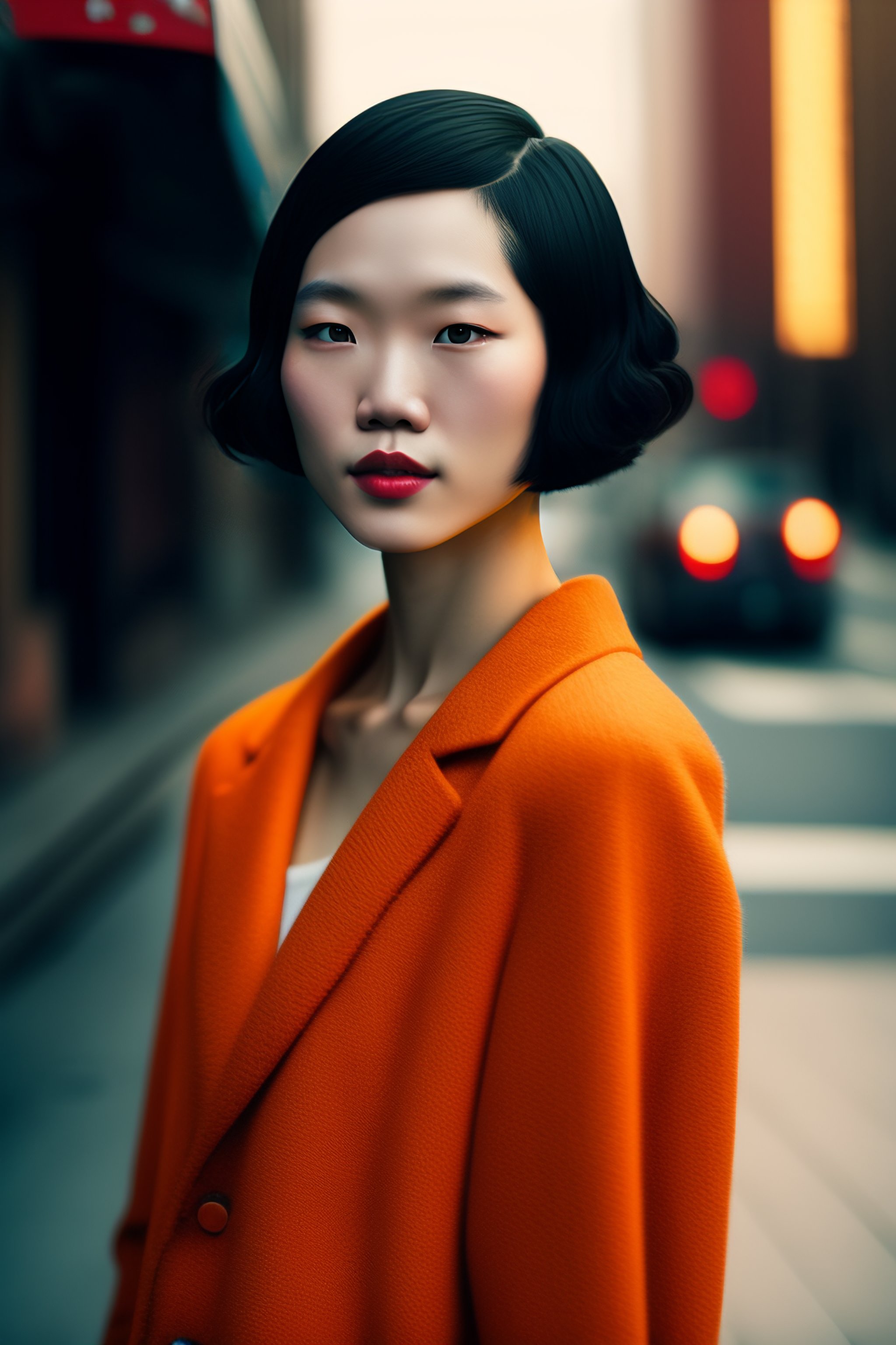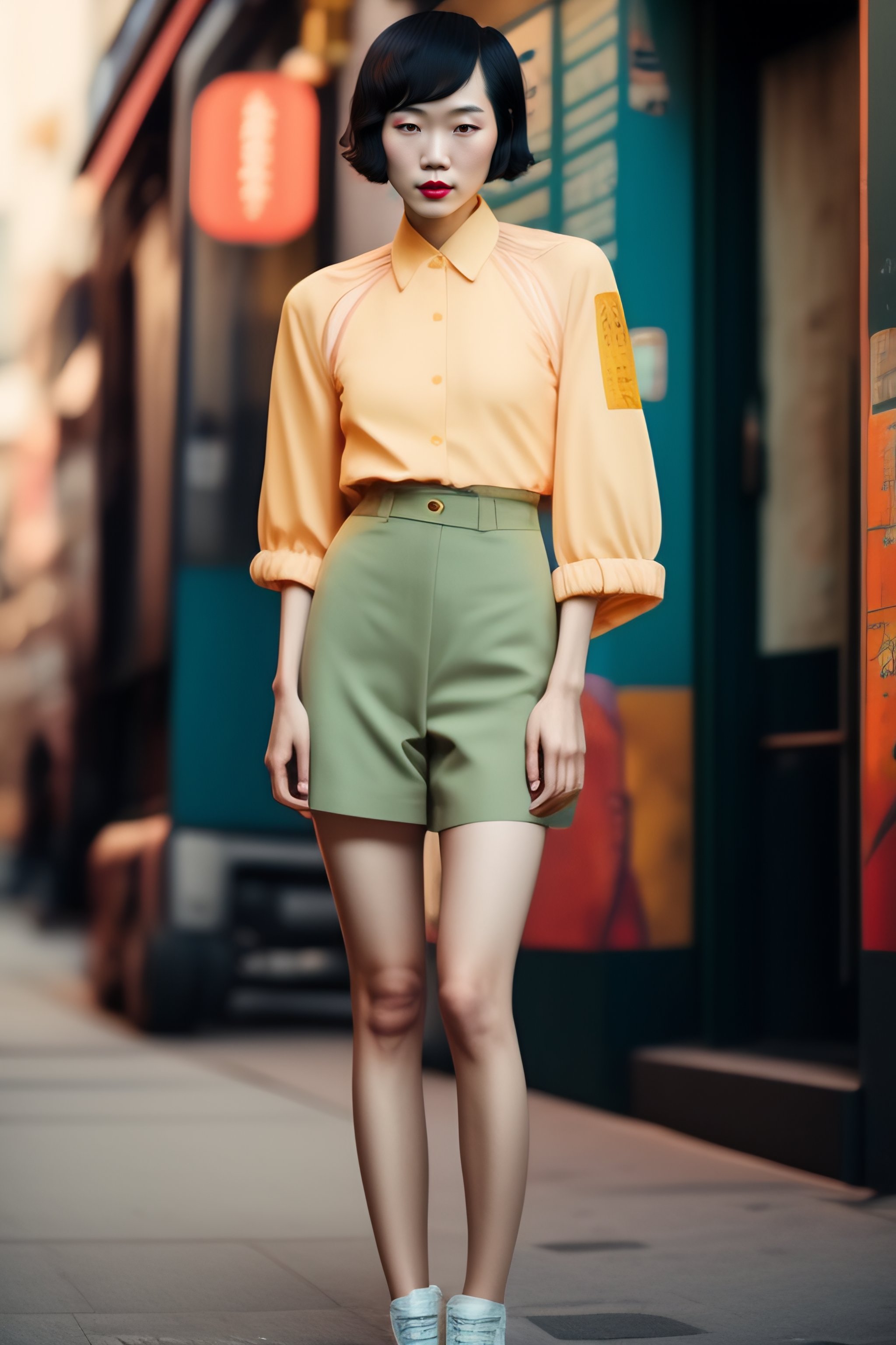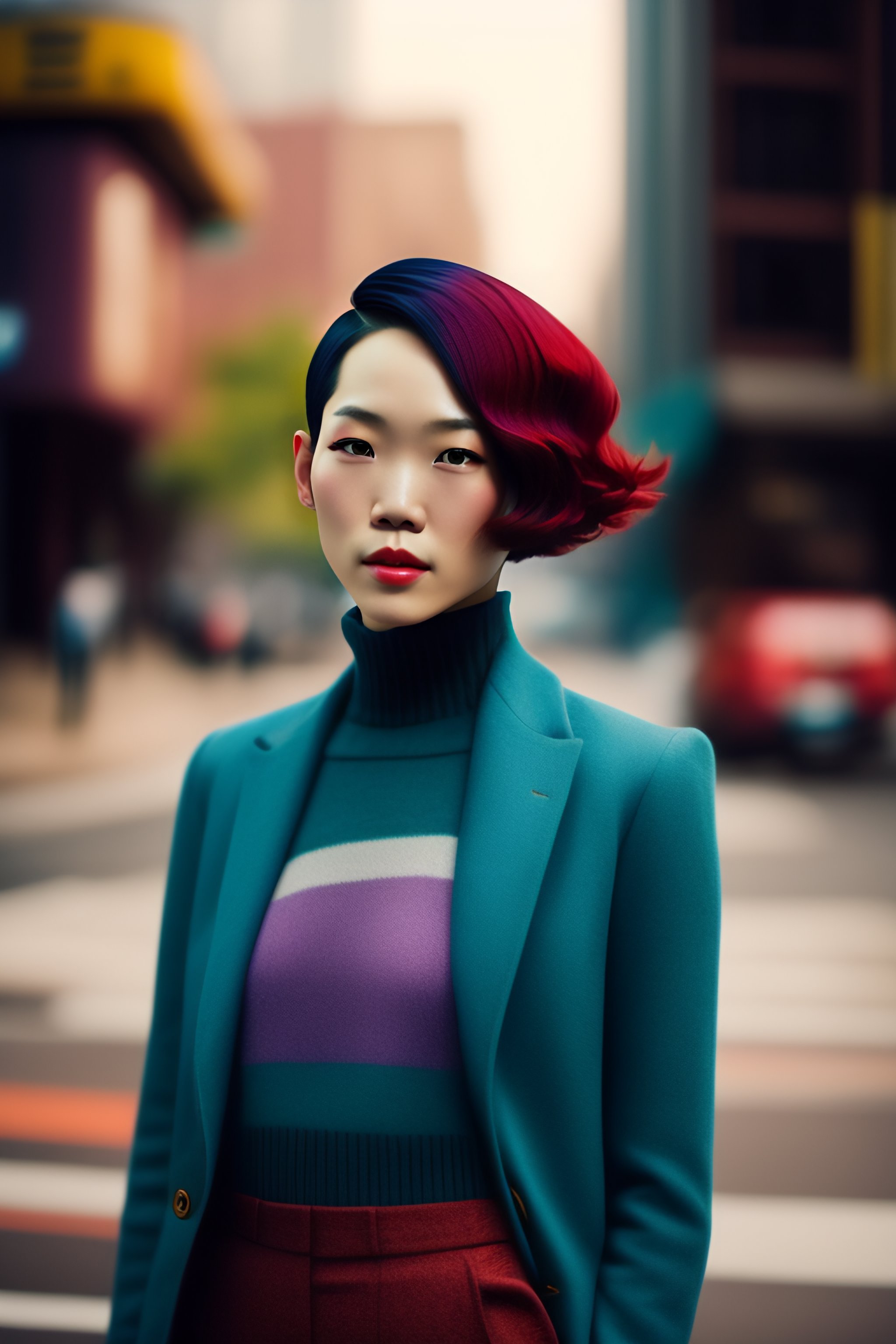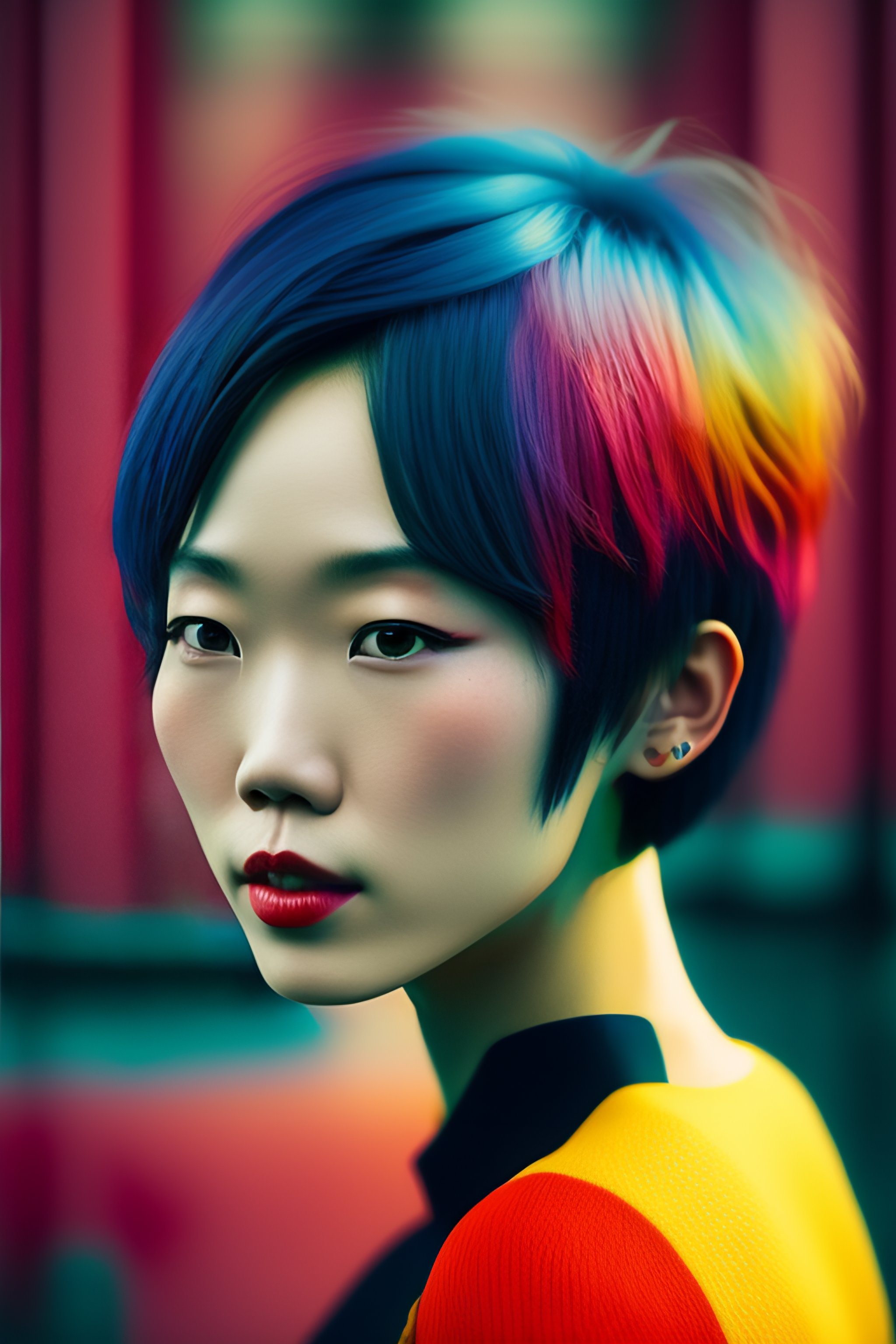 American-japanese woman in 20s, like kiko mizuhara, colorful short hair, bob hair, lots of details, hyper realistic, high heels, imperfect skin, unkempt, no makeup, urban background, portrait, skin pores, full length pose, stylish pose, full length photo, full body pose, solo