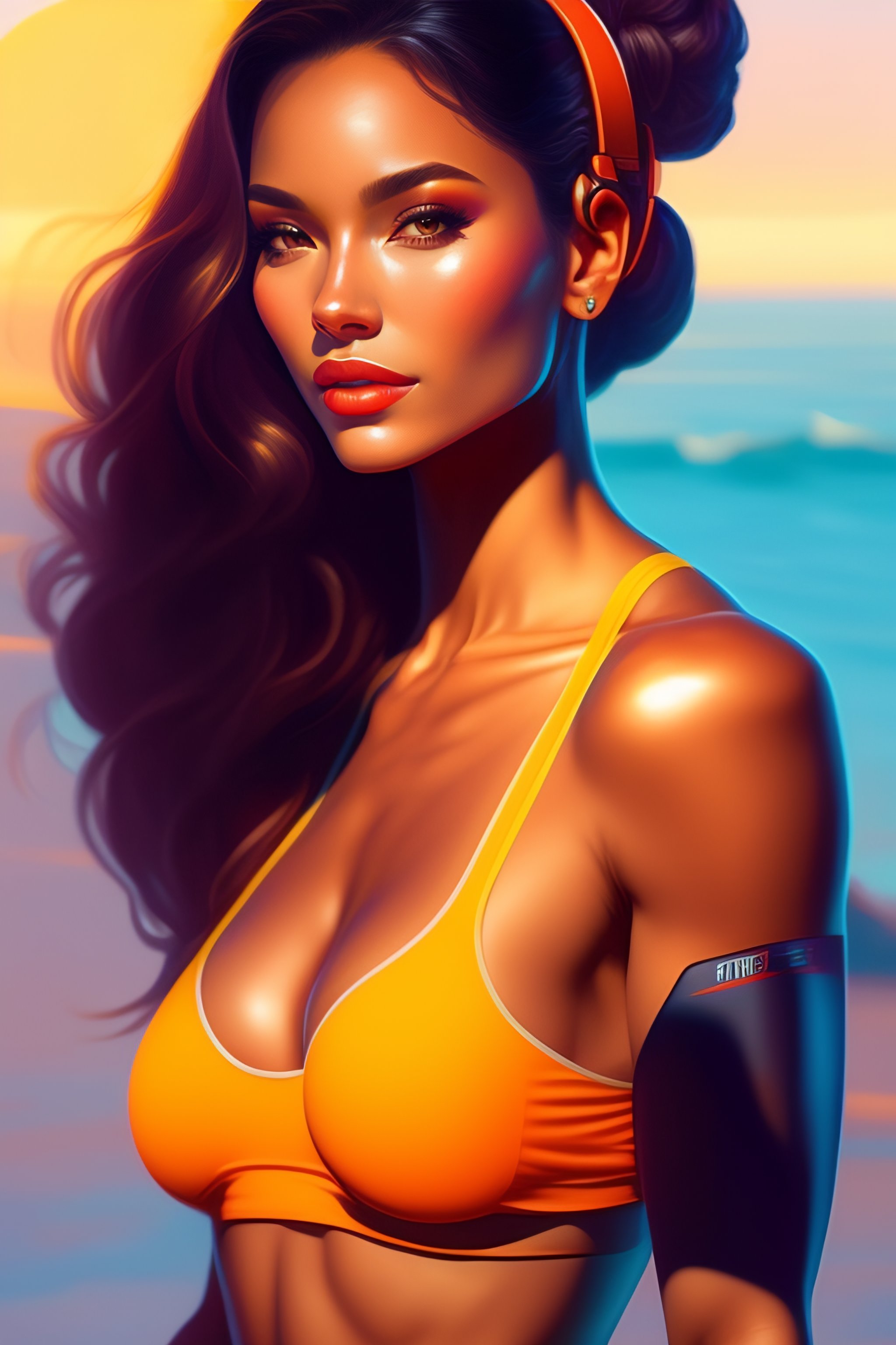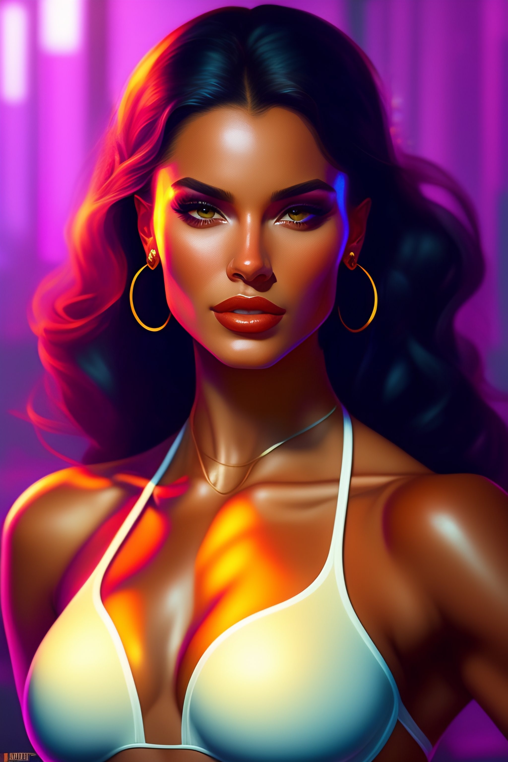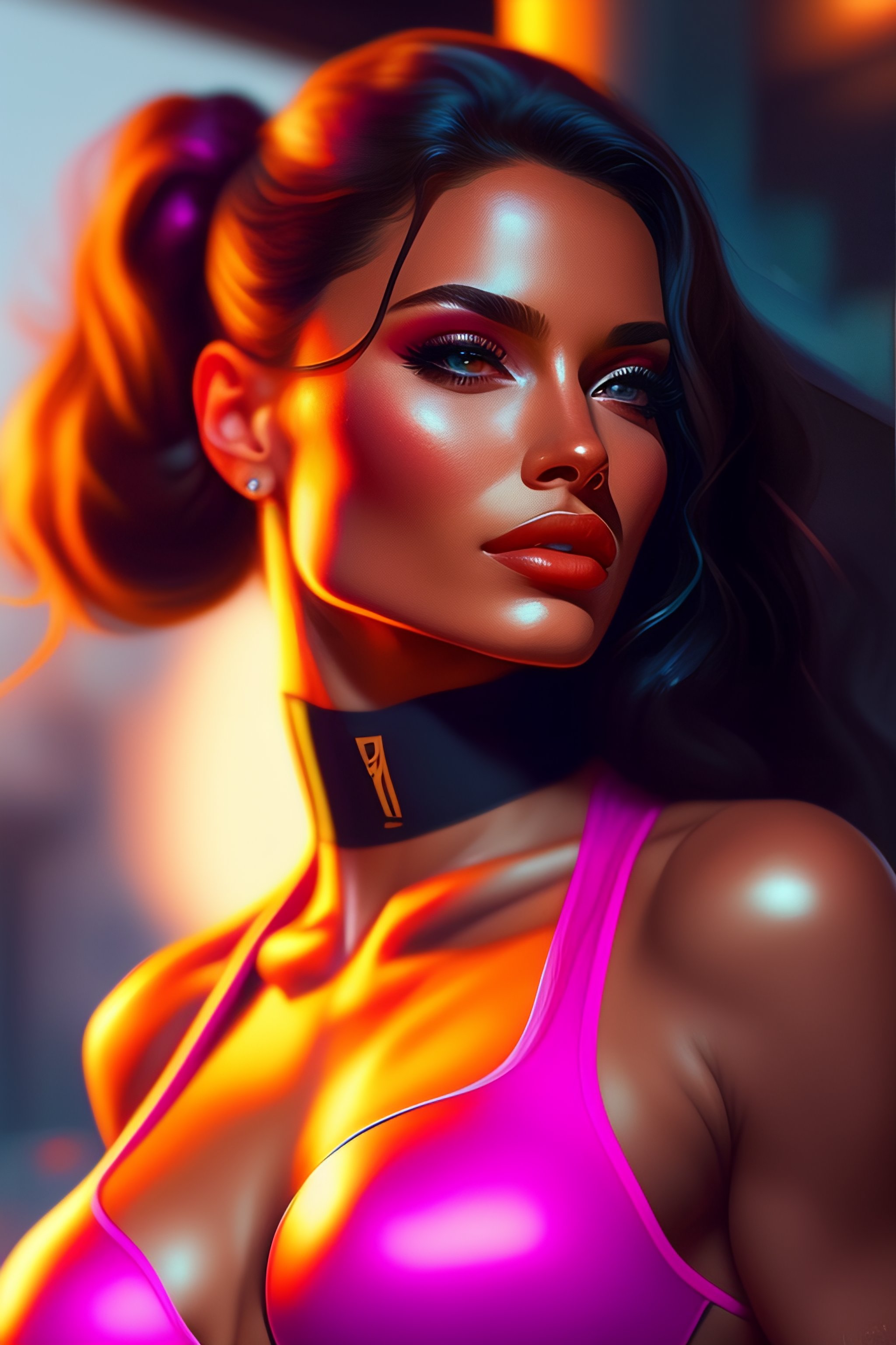 Pretty woman with vr headset, playboy posing, two piece workout clothes, training bra, photorealistic lighting, vibrant colors, gta 5 skin tone, tooth wu artgerm greg rutkowski alphonse mucha beeple artstation deviantart