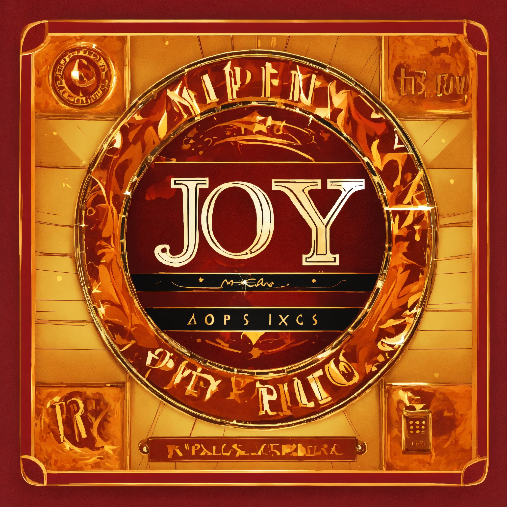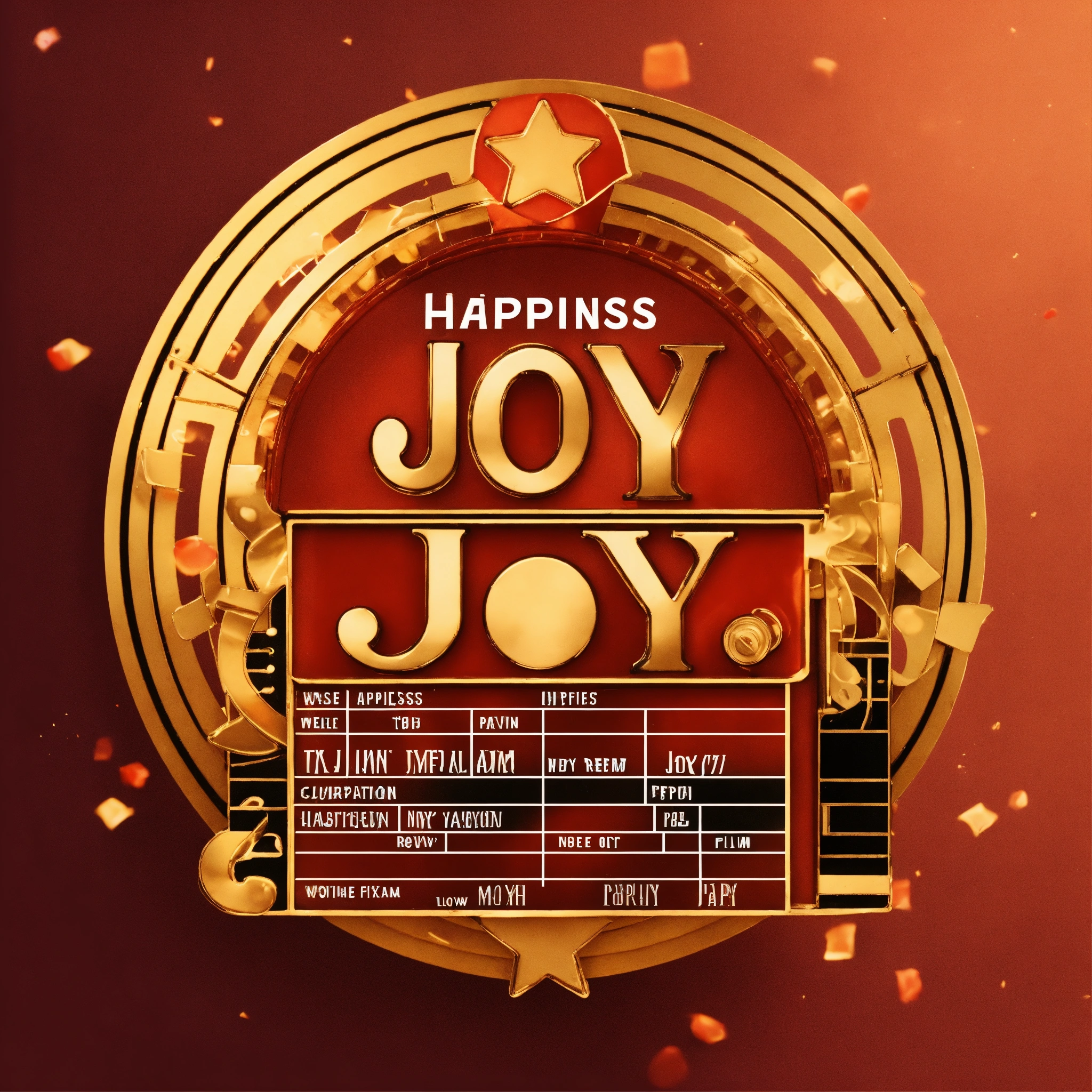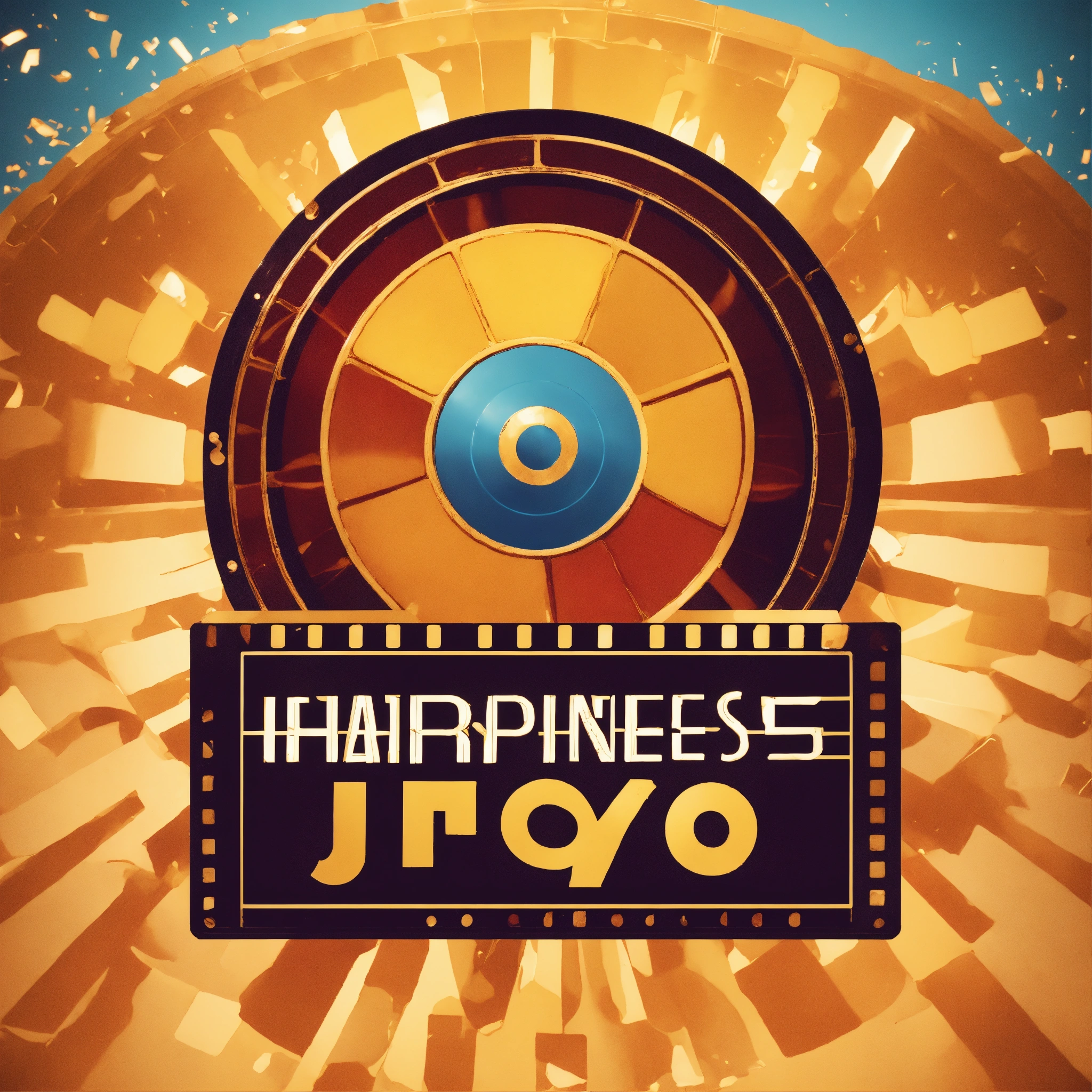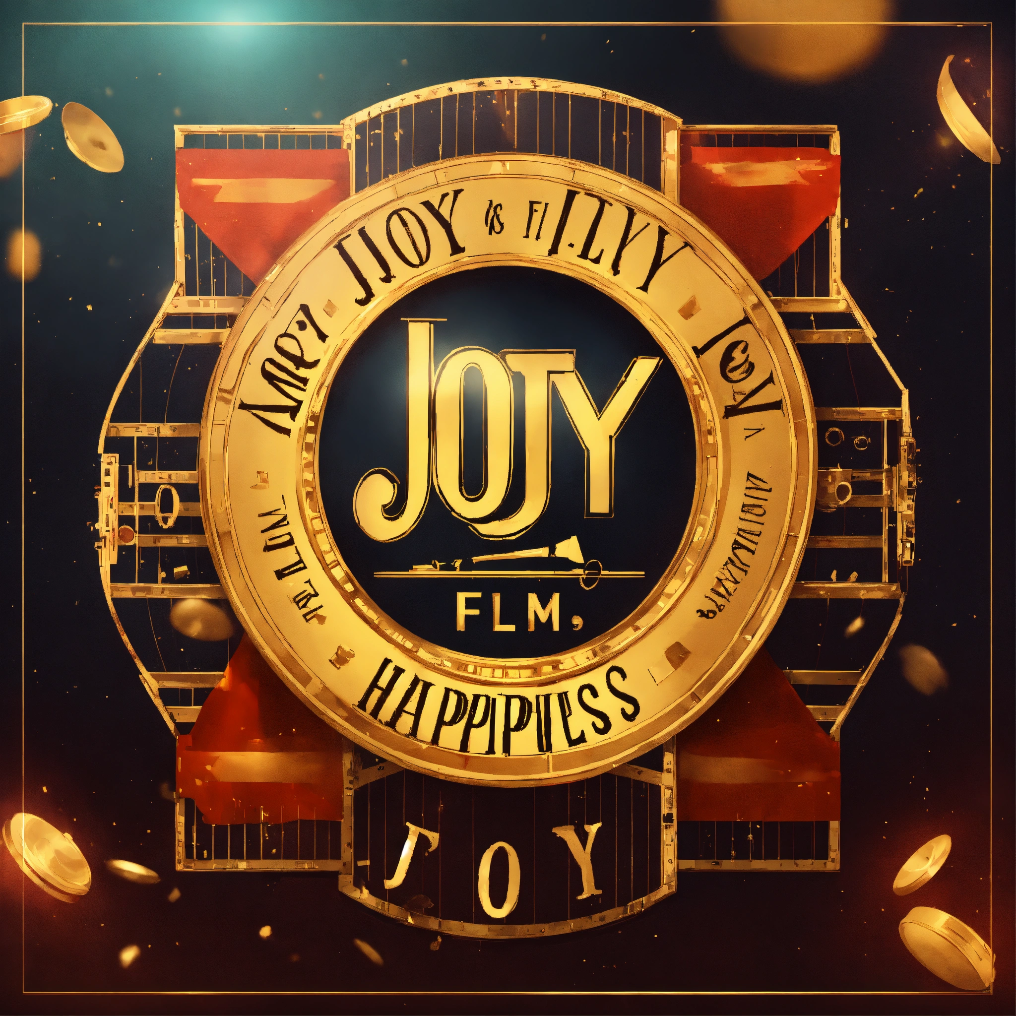 Movie production logo, tex as "joy films" happiness and joy, lettering art, film reel and clapboard elements, dynamic wide low angle