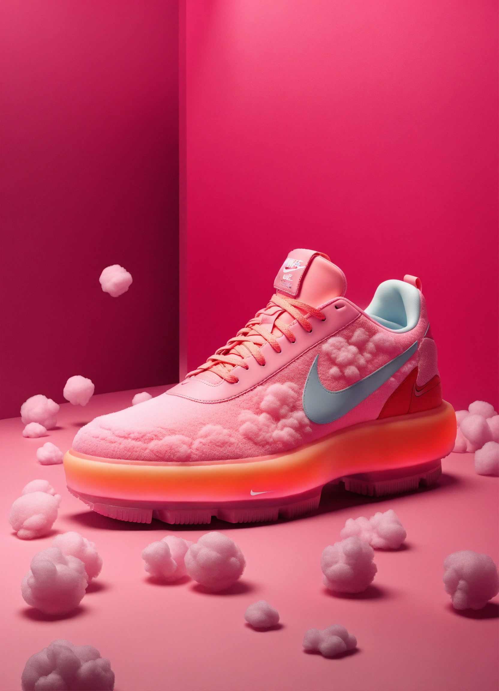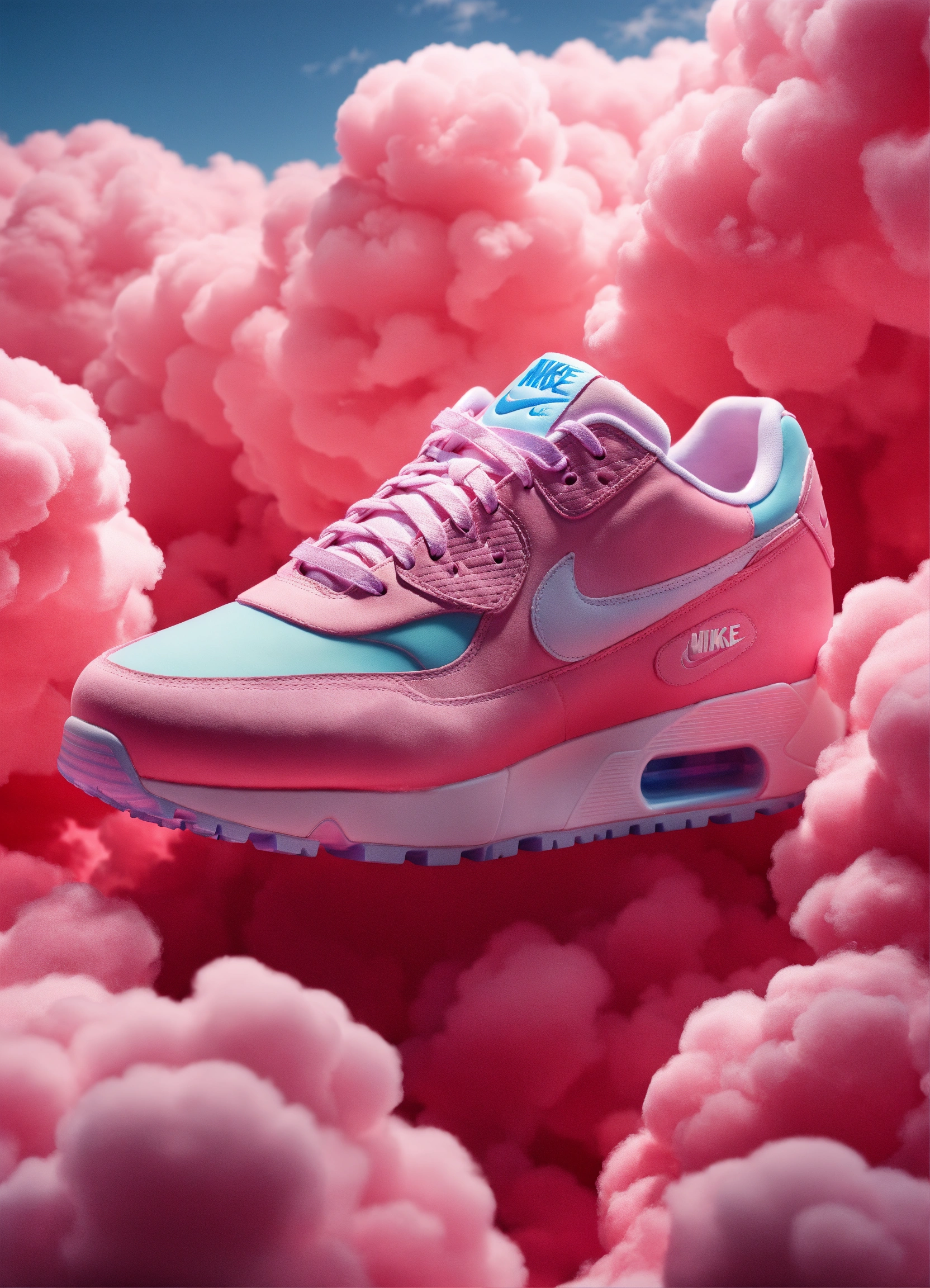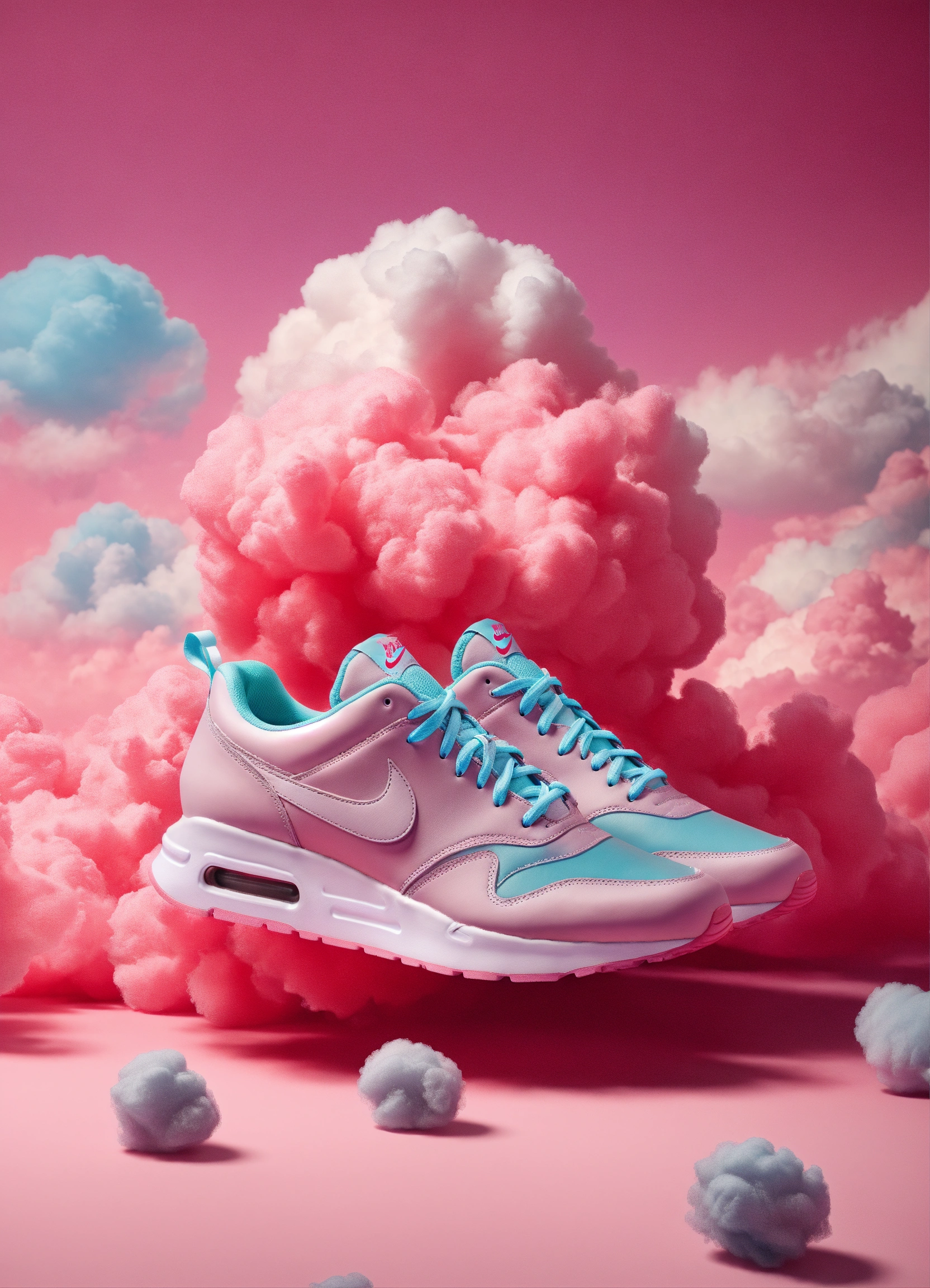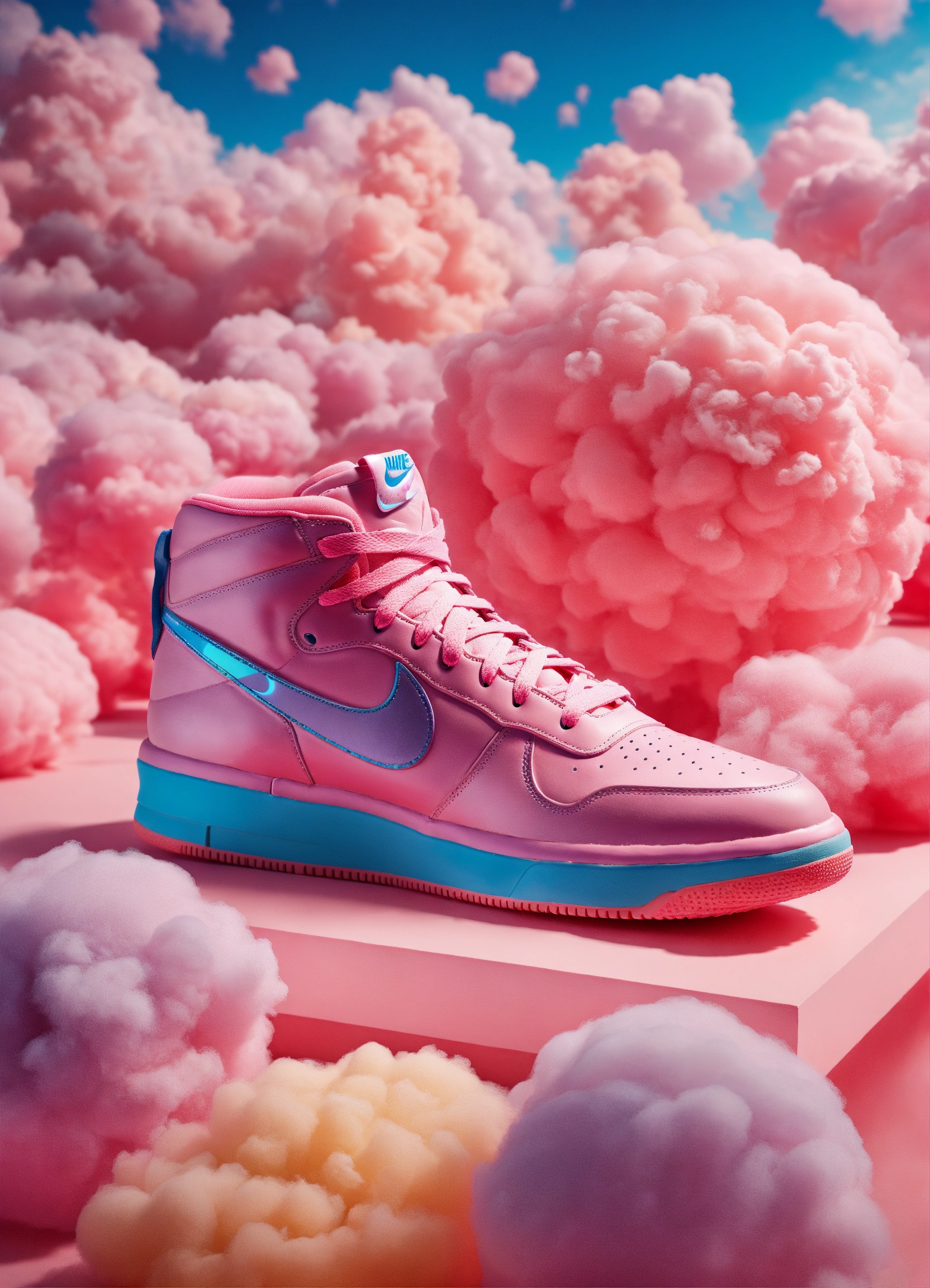 Nike sneaker concept, made out of cotton candy clouds, luxury, futurist, stunning unreal engine render, product photography, 8k, hyper-realistic. surrealism