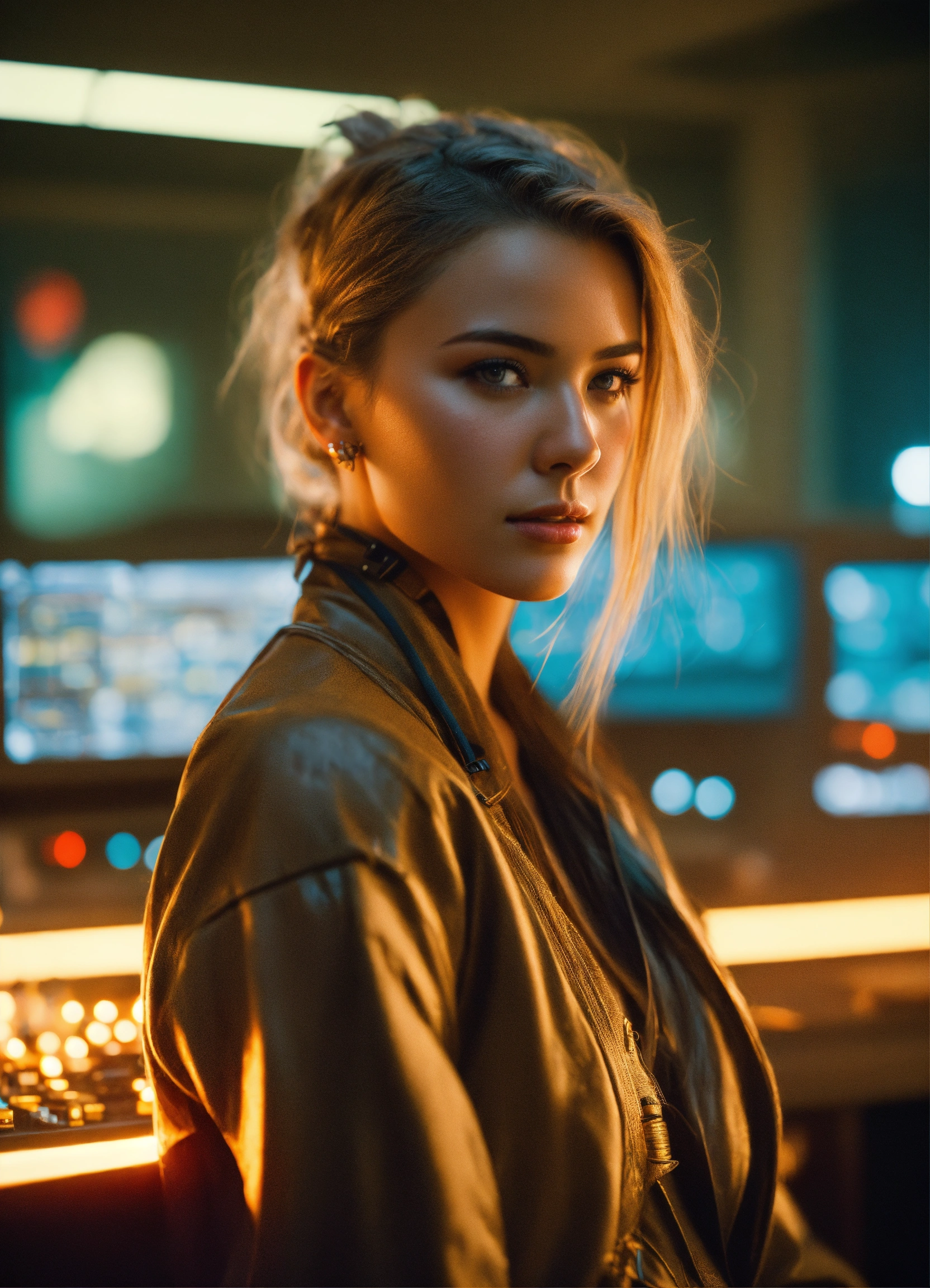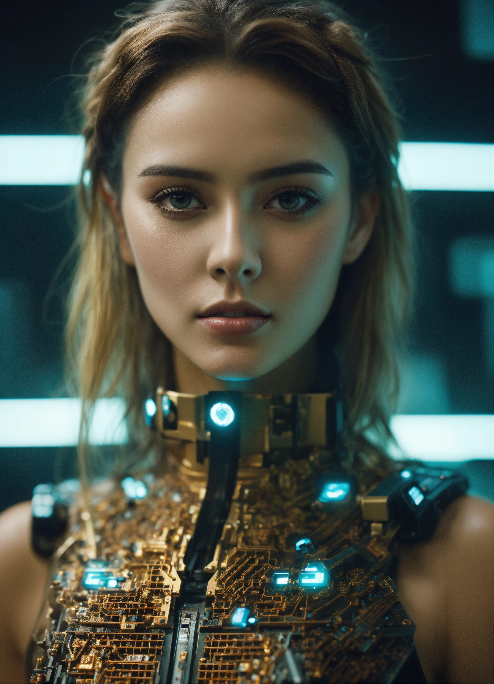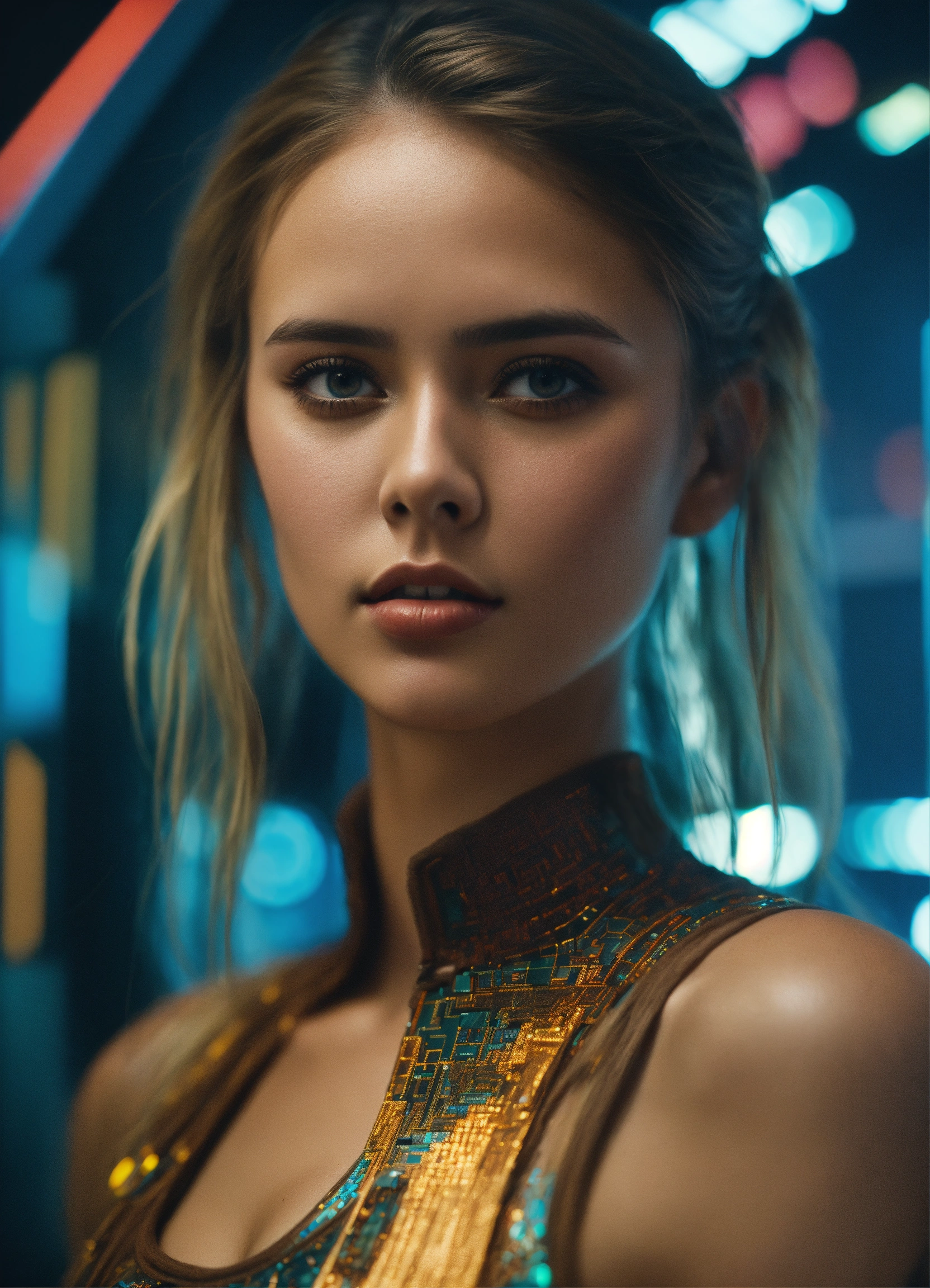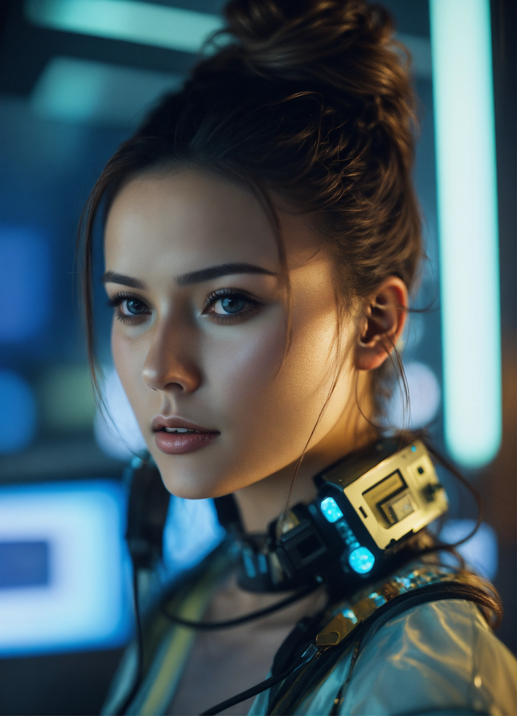 Cyberpunk, sci-fi, fantasy, kodak portra 400, 8k, soft light, volumetric lighting, highly detailed, britt marling style 3/4, portrait photo of a beautiful girl in a futuristic quantum computing laboratory + face, face is la female star with tanned skin and dark brown hair tied back of the most beautiful head in paraguay, looking straight into the camera, close-up, intricate, elegant, highly detailed digital painting, art station, concept art, sharp soft focus, illustration