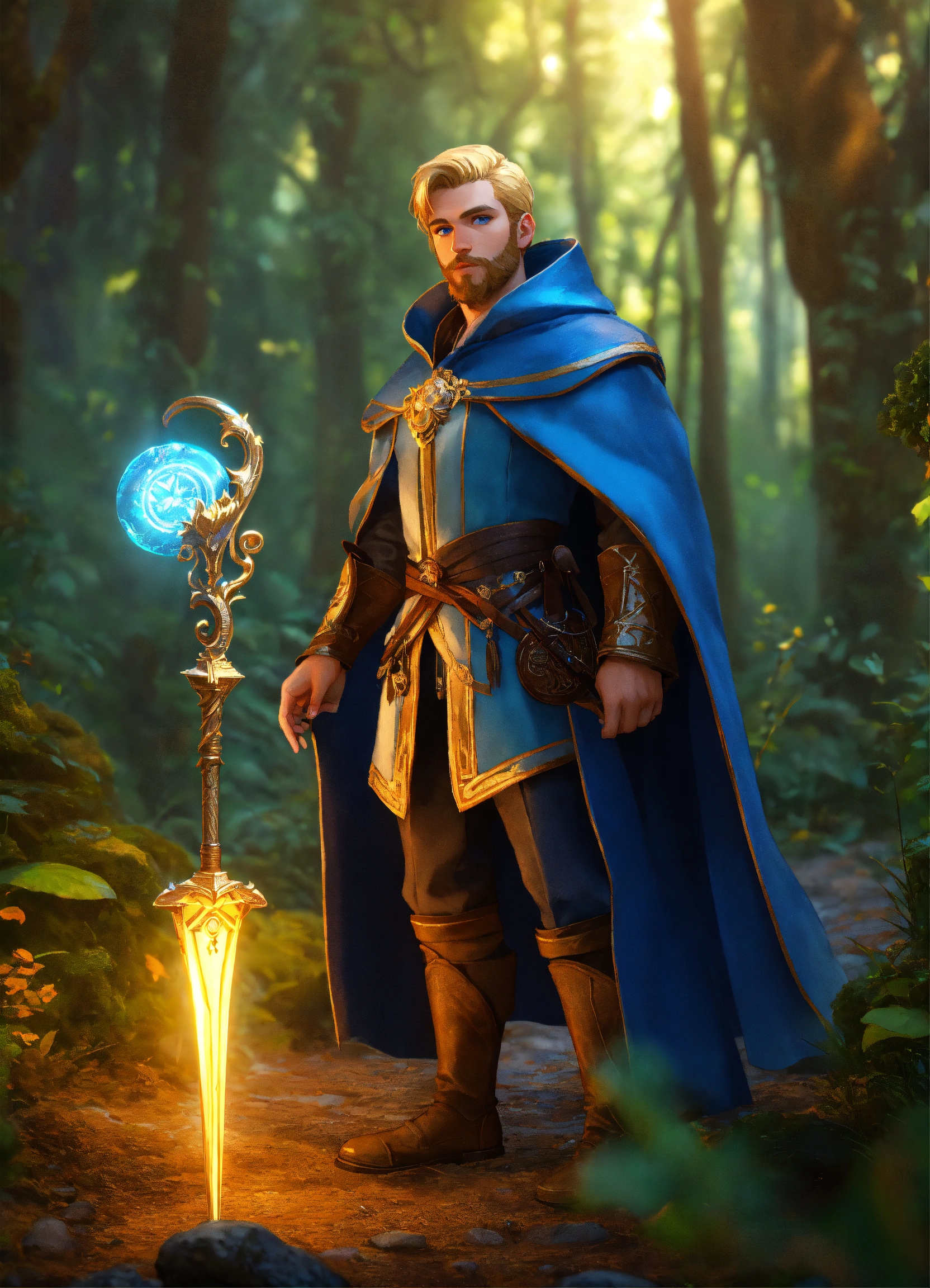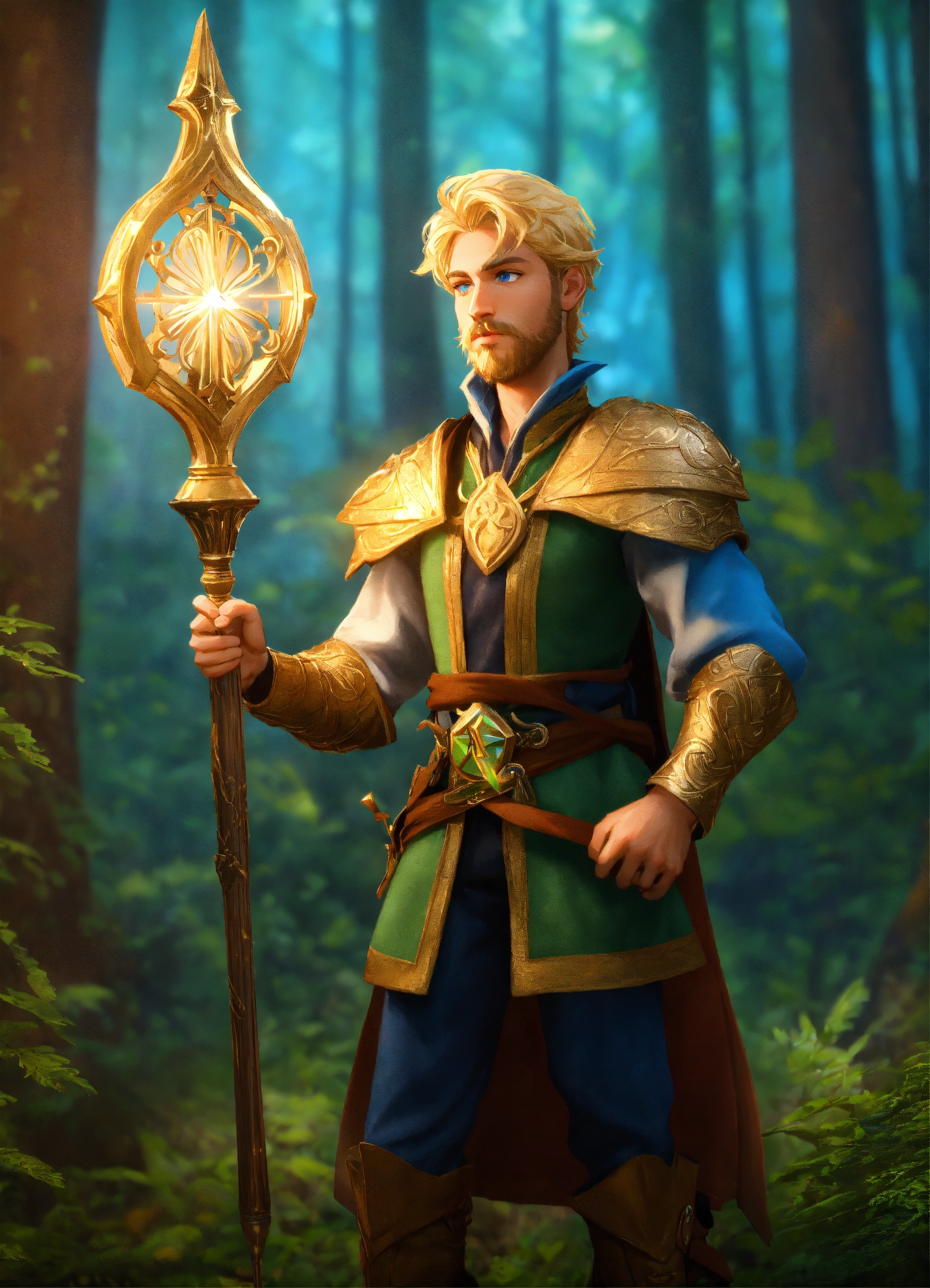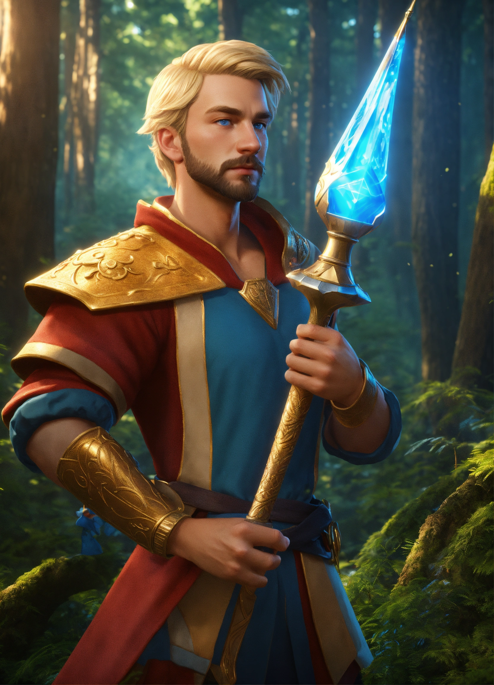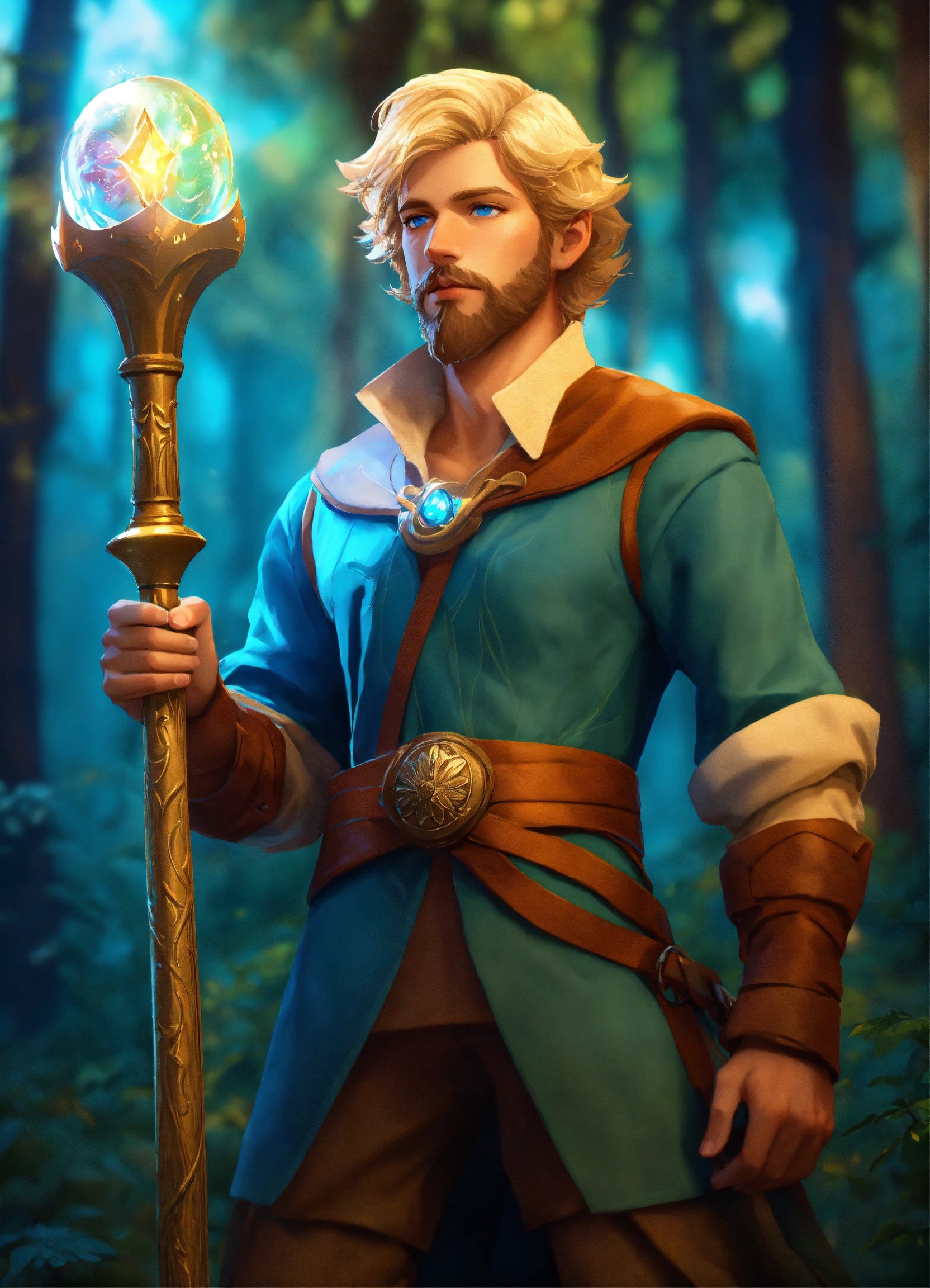 A cartoon mage, with short blond beard and blond hair, blue eyes eyes, with a scepter in his hand, in a forest, diego gisbert llorens, storybook illustration, a storybook illustration, fantasy, 8k unreal engine render