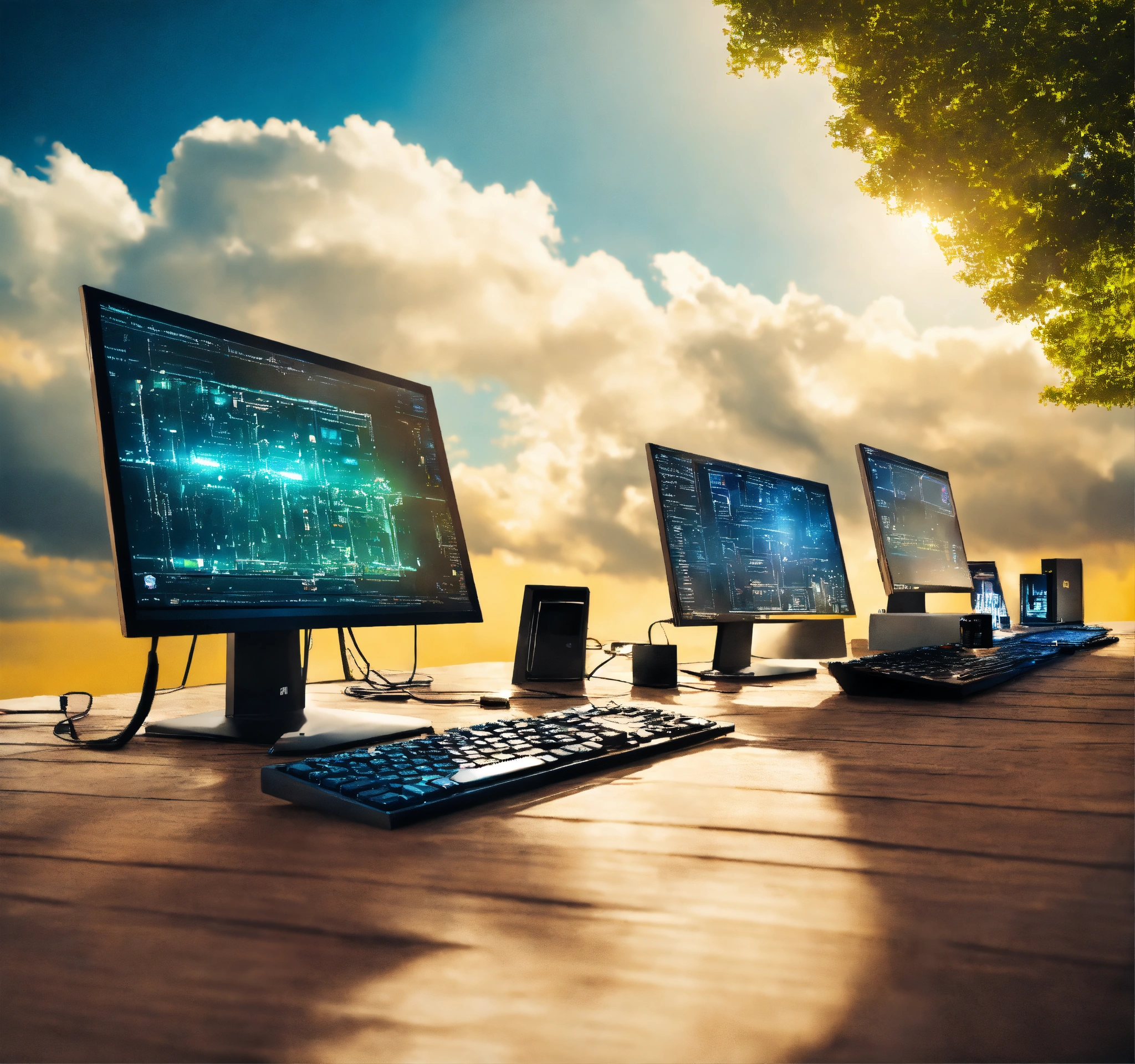 Please generate a lively picture of computers and cybersecurity under sunshine and clouds
