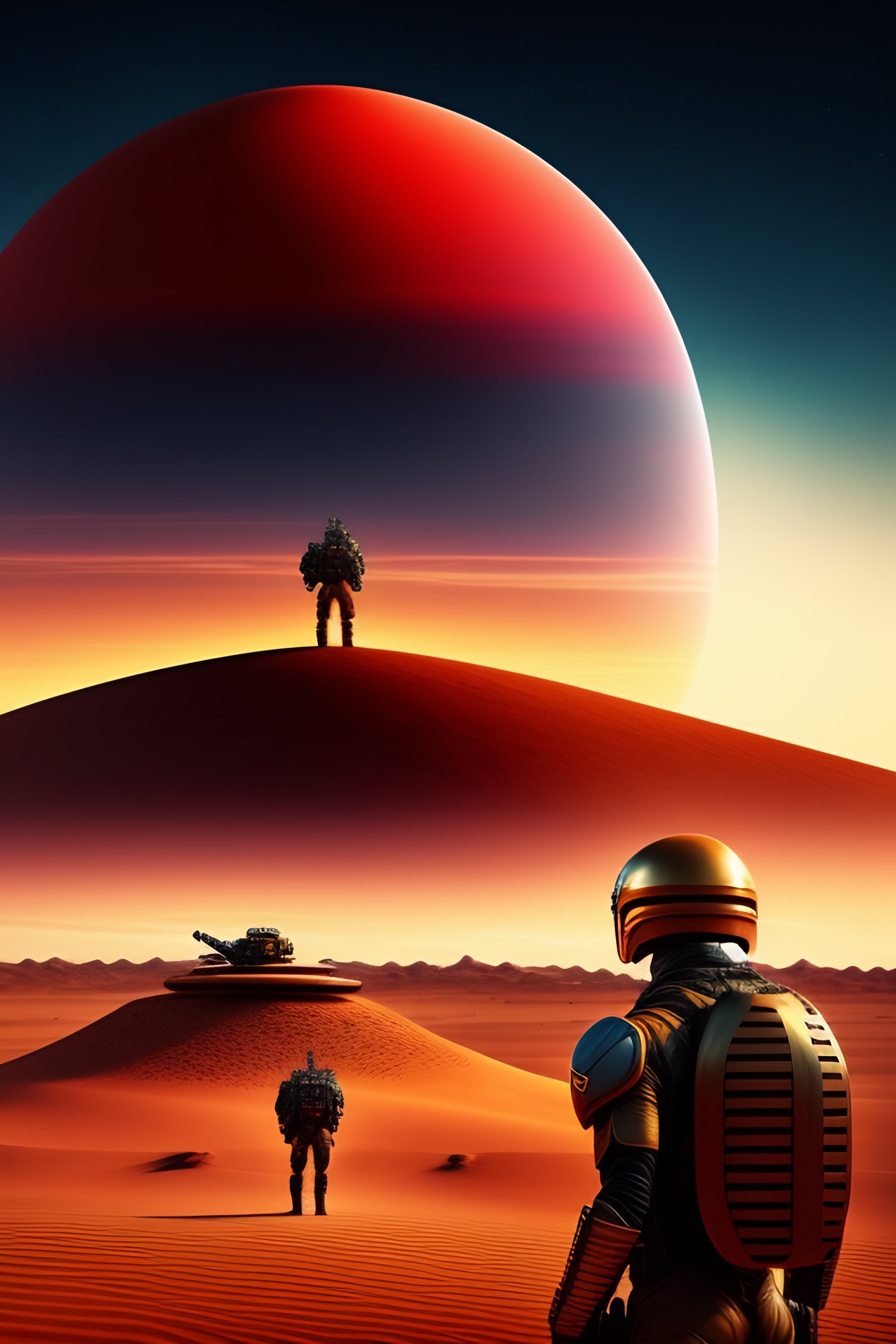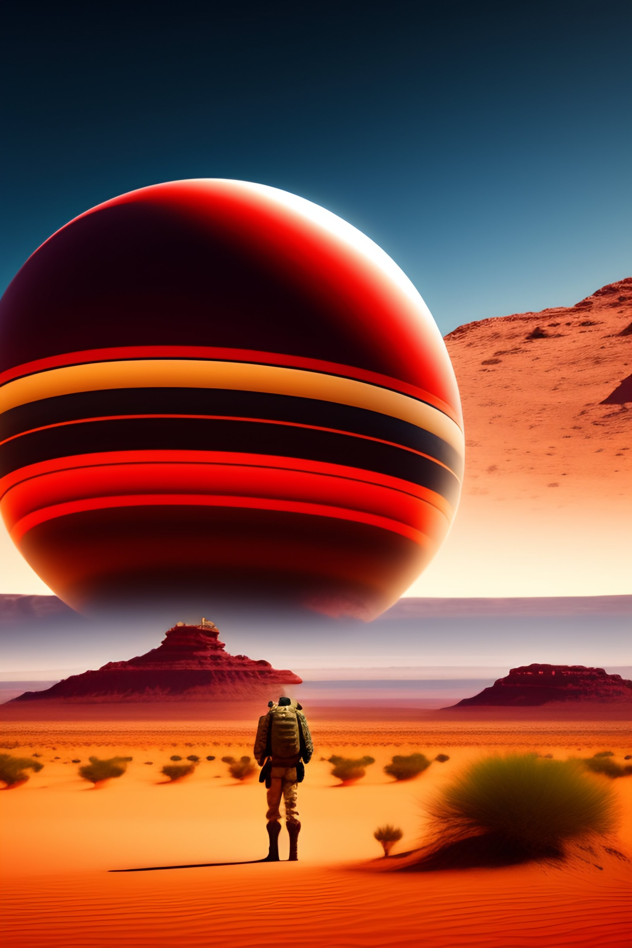 A human soldier fighting a red round shaped alien sphere, in a desert, god is looking from above, and talking to the alien and the human soldier into their heads