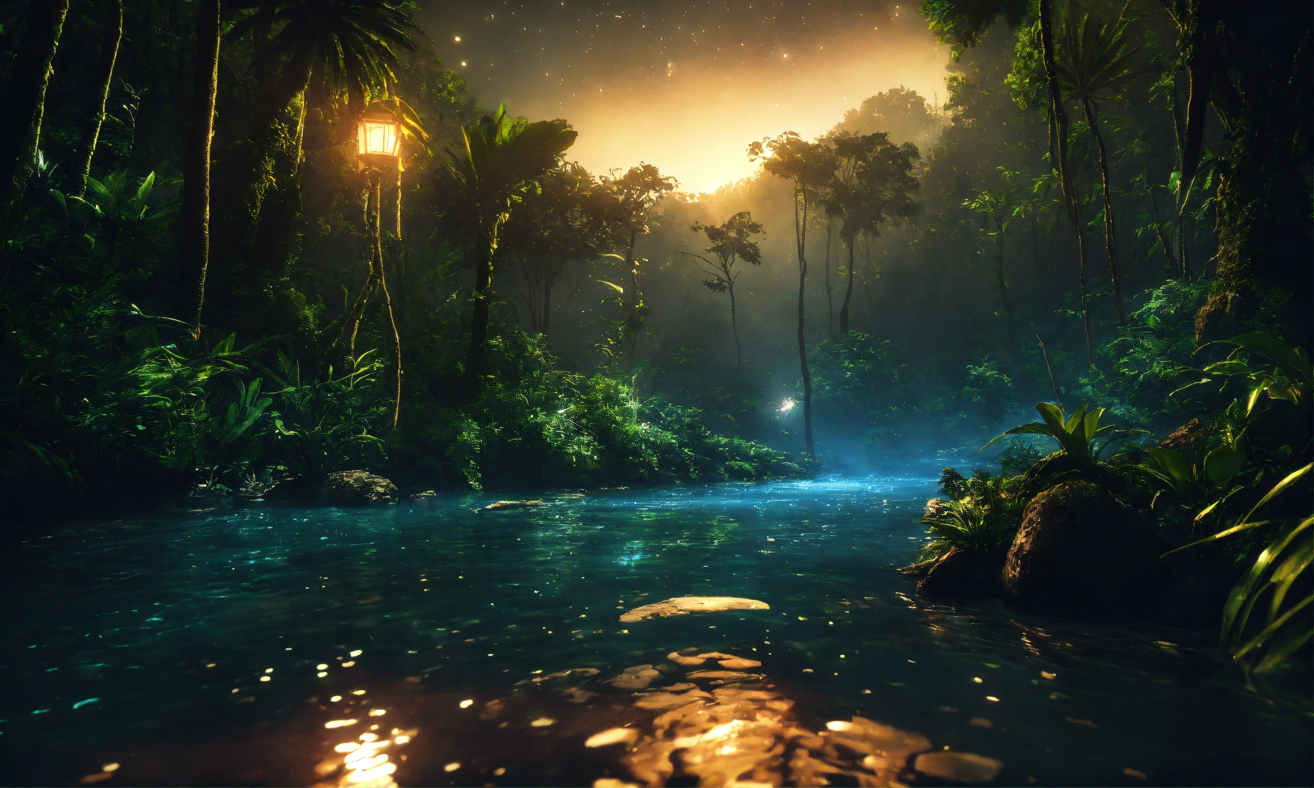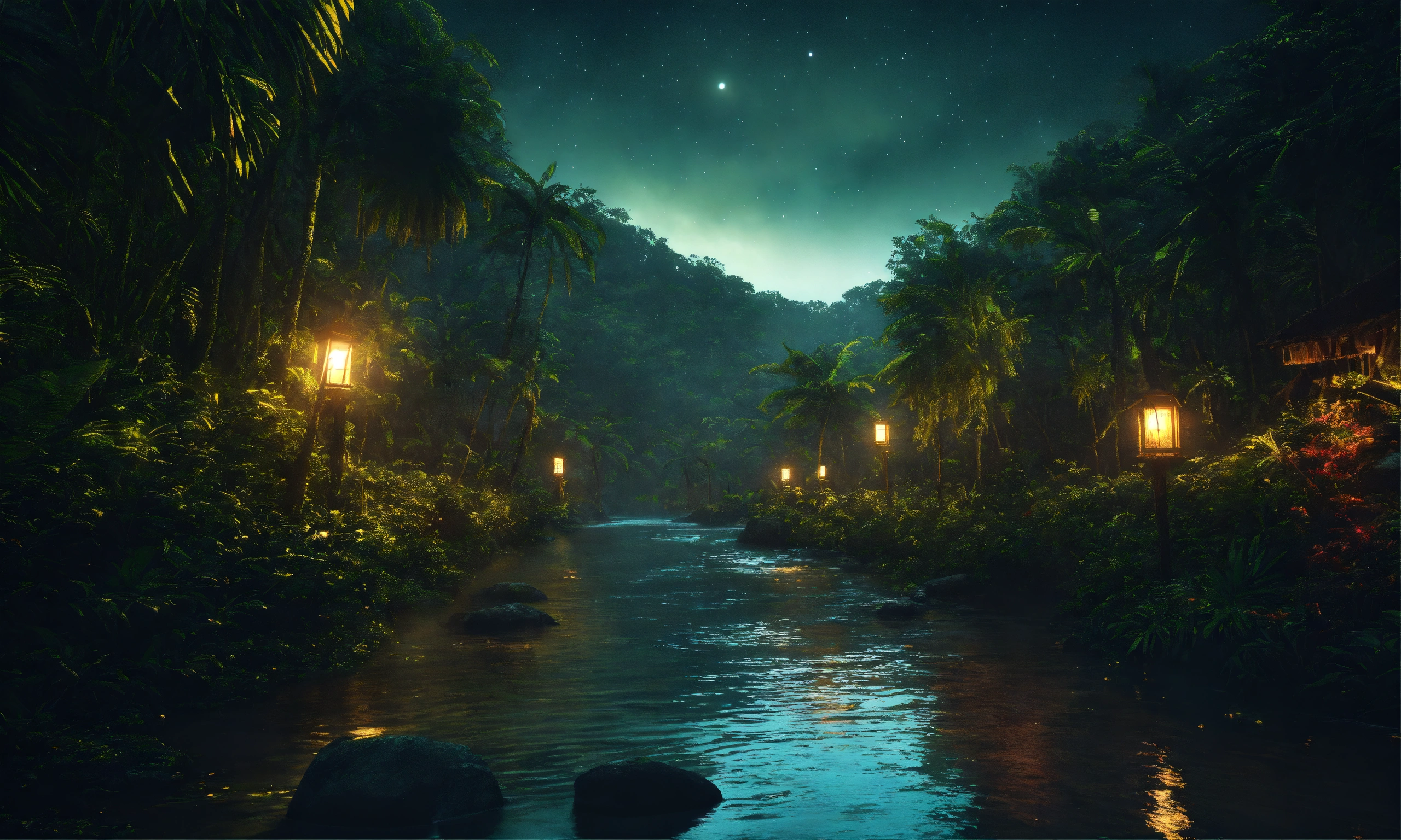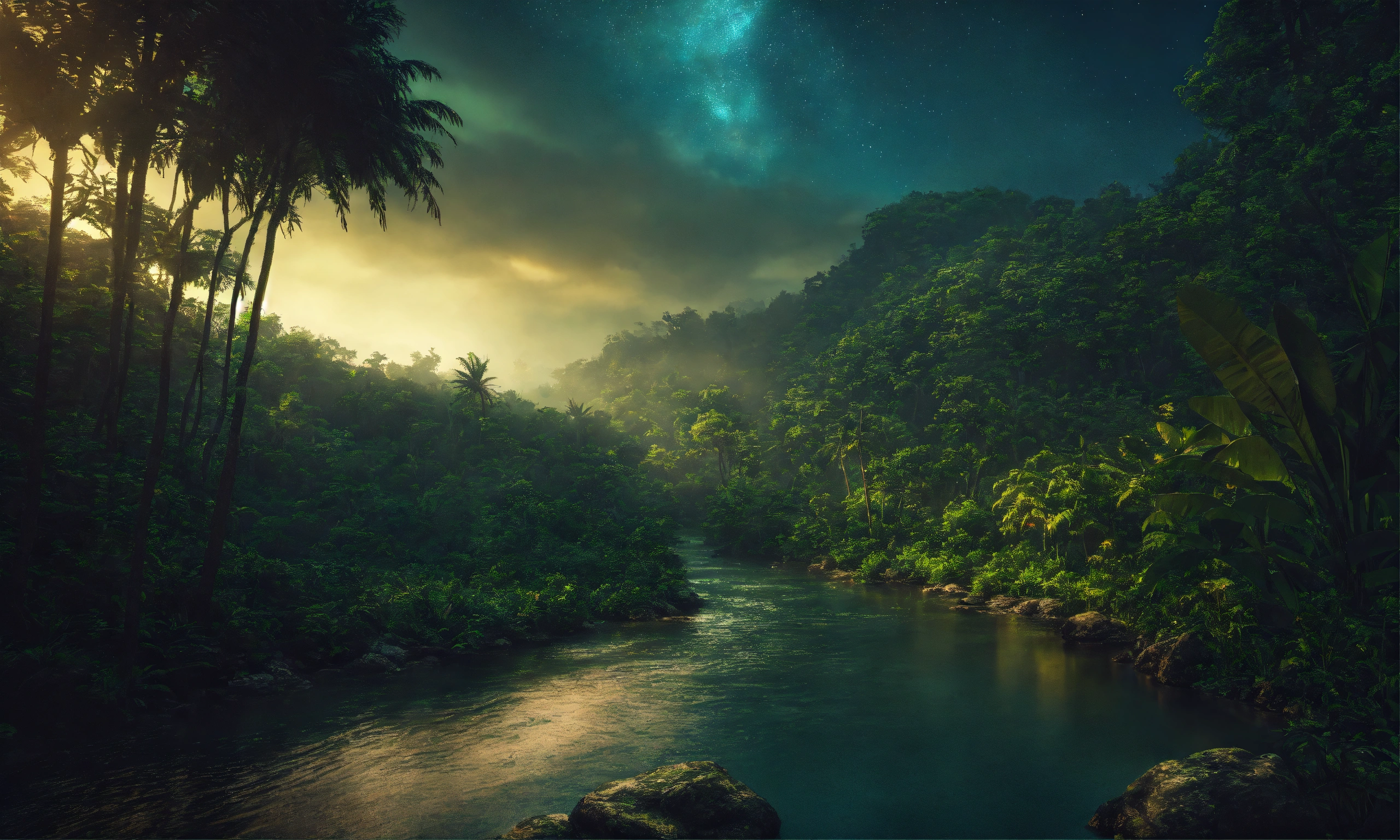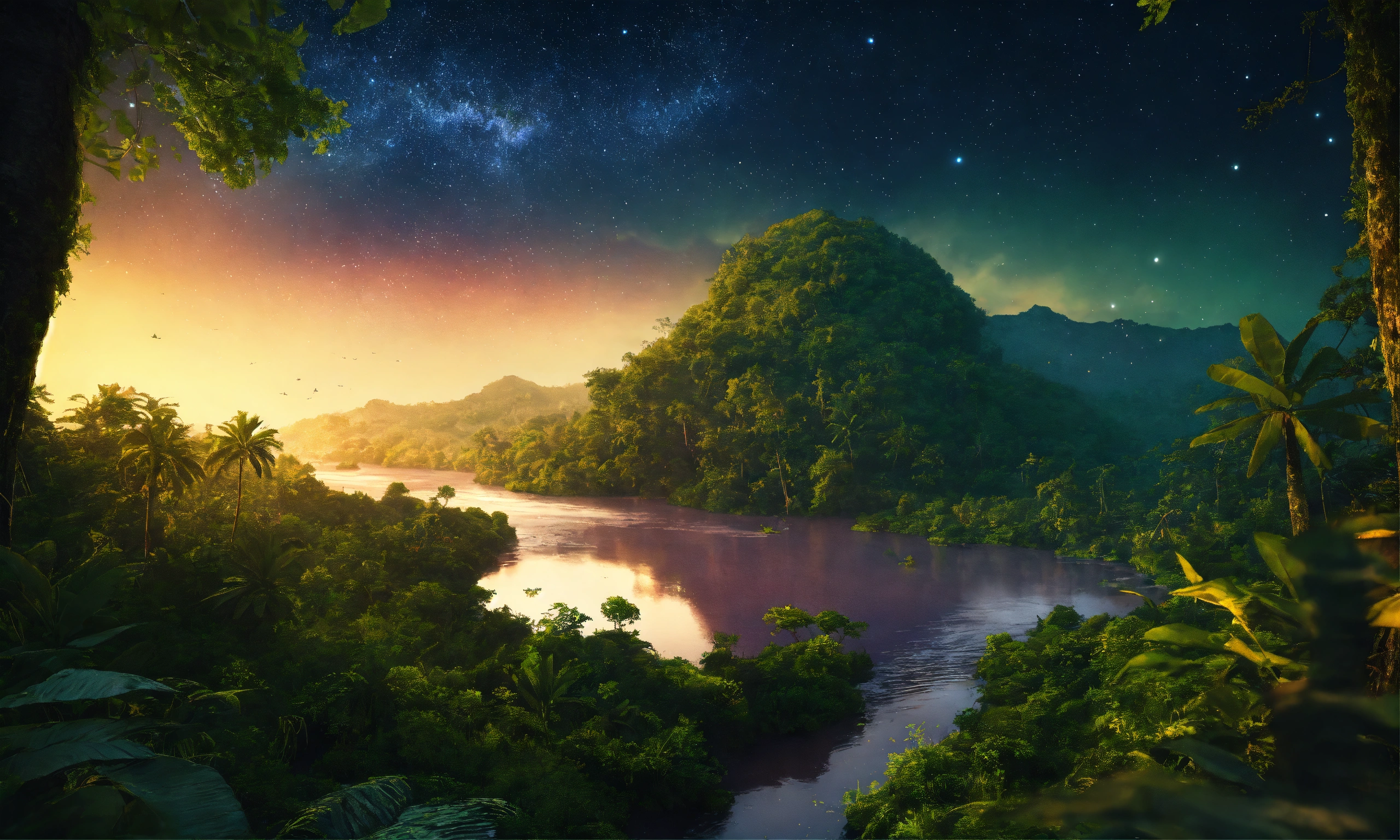 Draw a ultra realistic award winning photograph of a jungle with a river during a dark gloomy night with stars, ultra 8k, 3d, hyper realistic, insane detail, colorful, surreal, dream-like, beautiful, fantasy, immersive, intense shadows, eerie