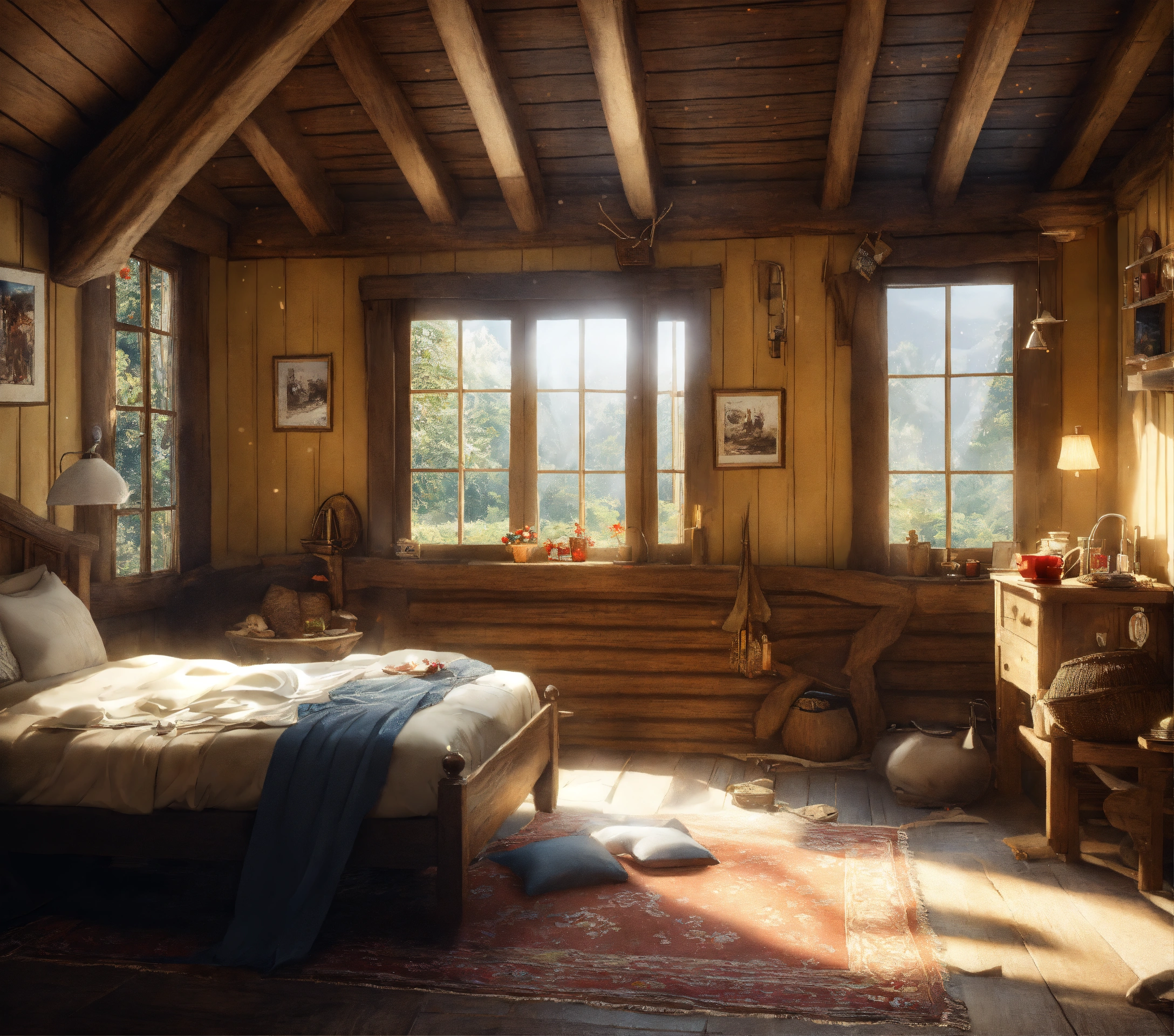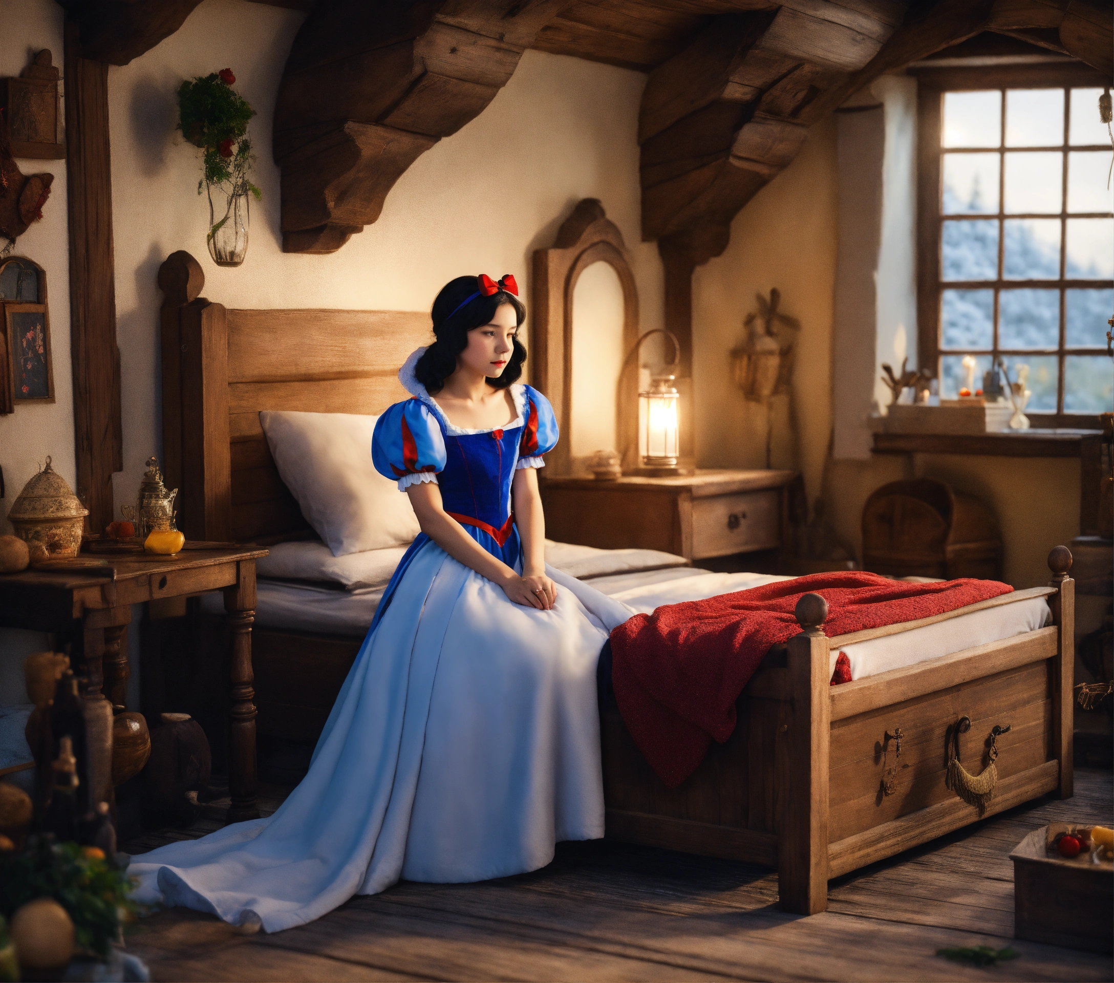 Snow white 15 years old in the cottage bedroom realistic photograph 8k
