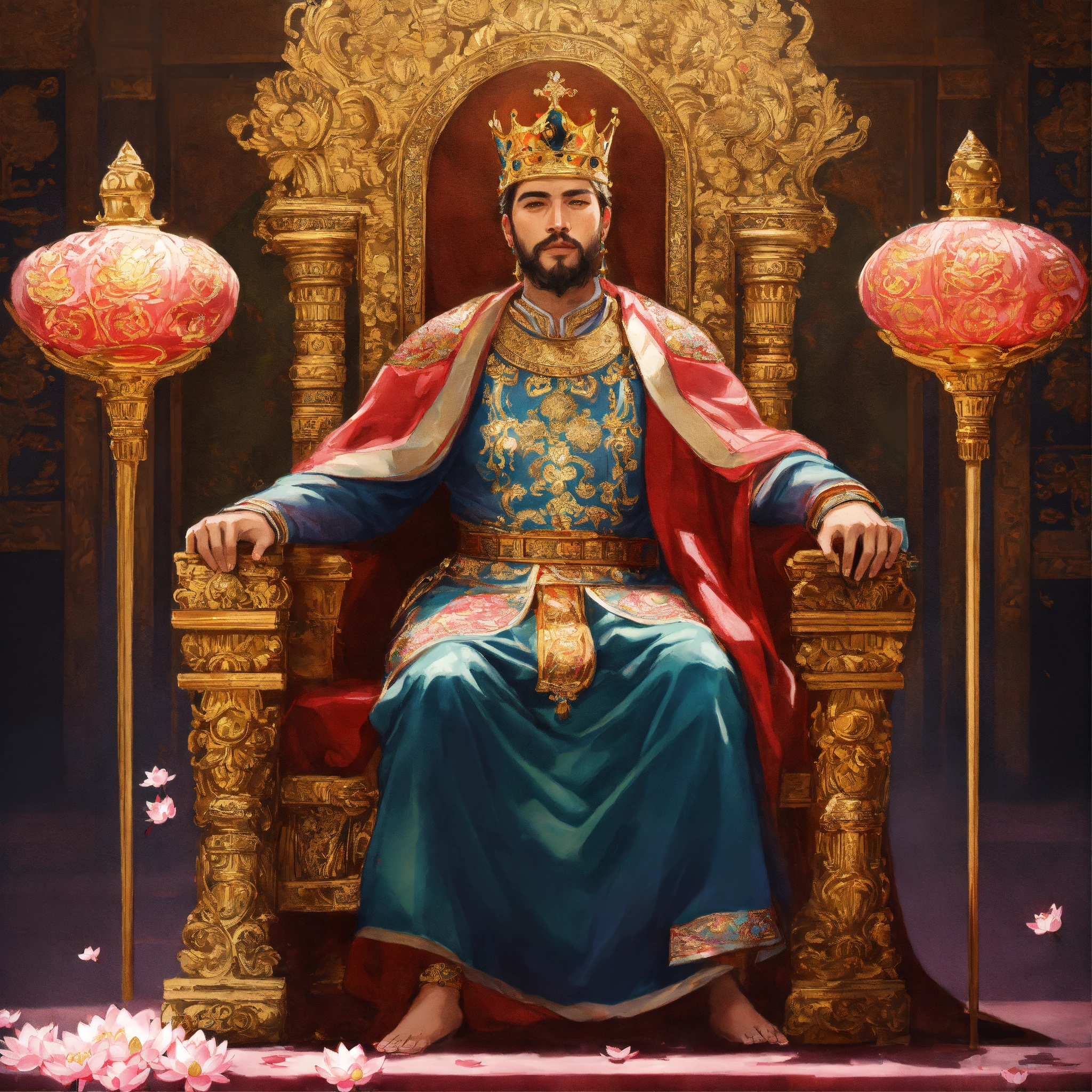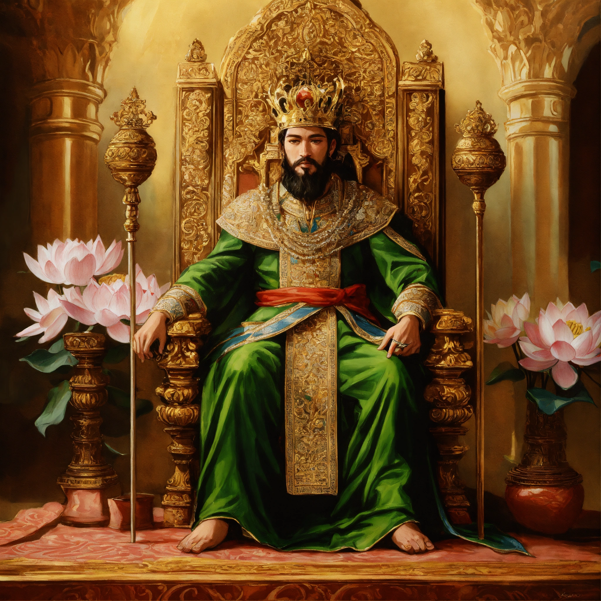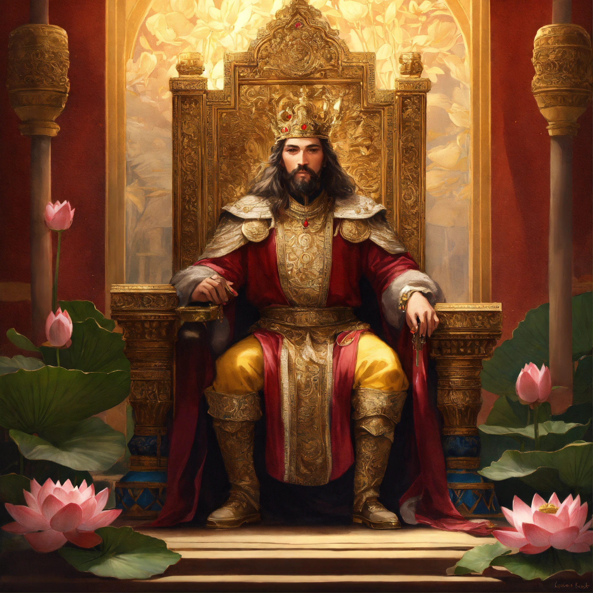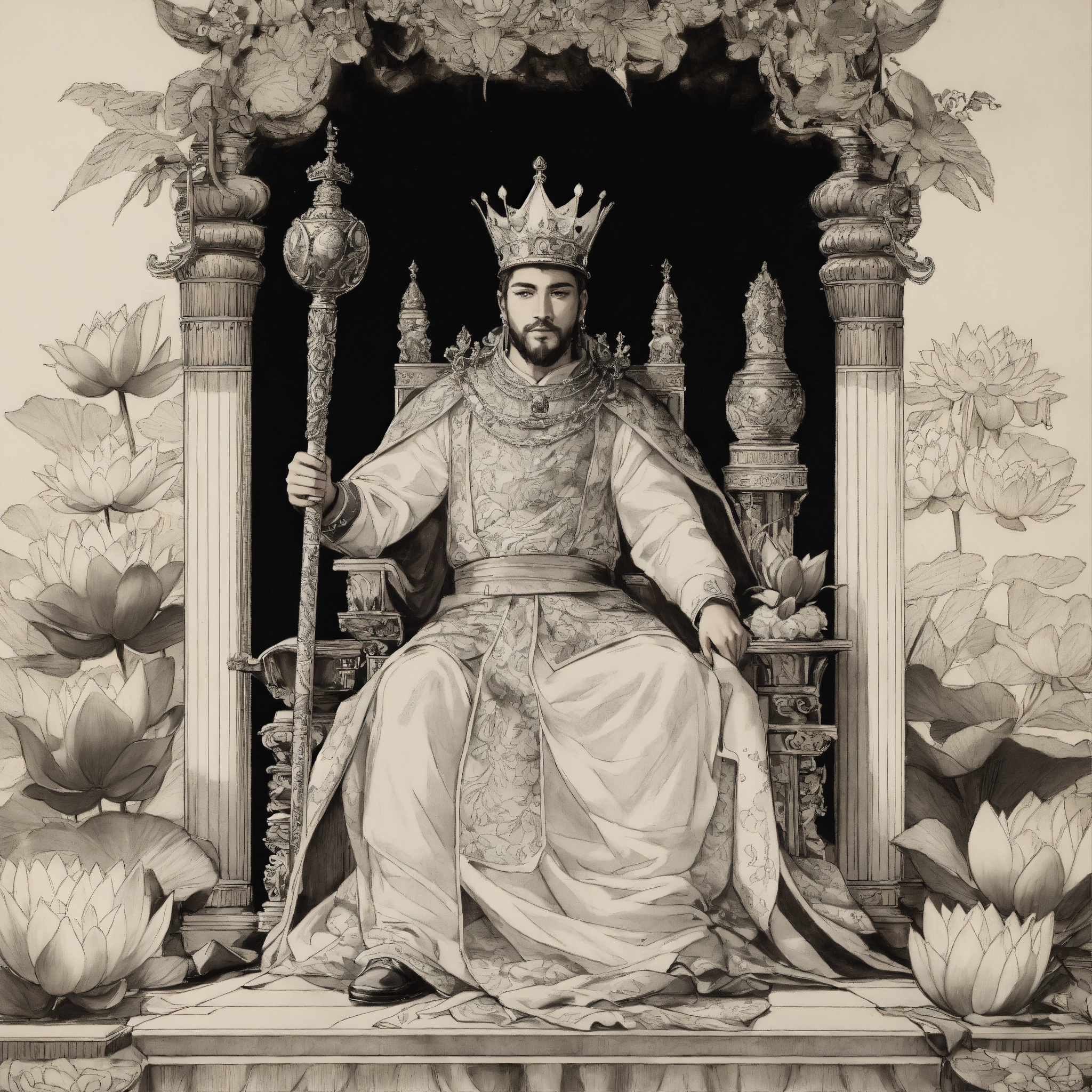 Realistic drawing, king sitting on his throne with his scepter in his left hand, lotus flowers in the background