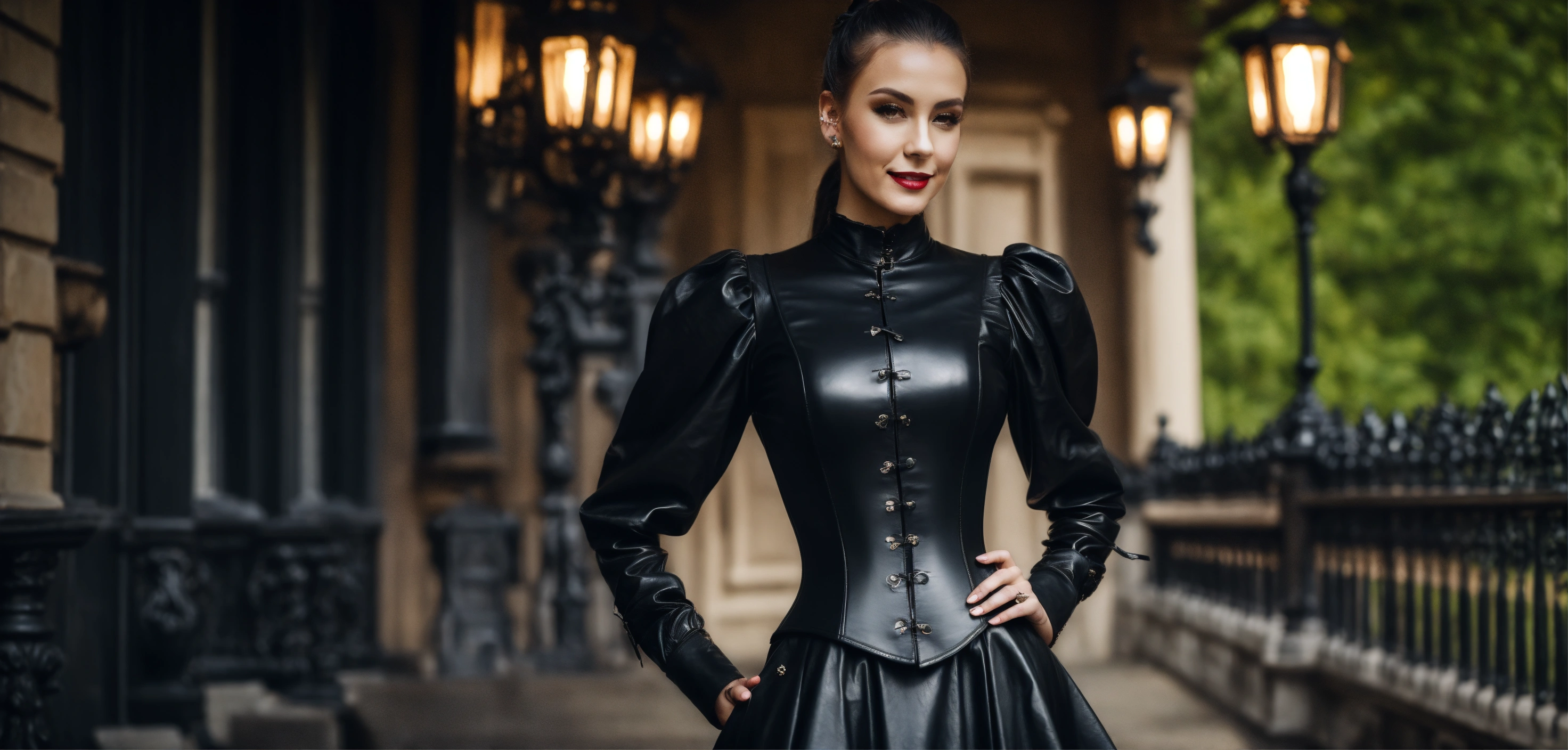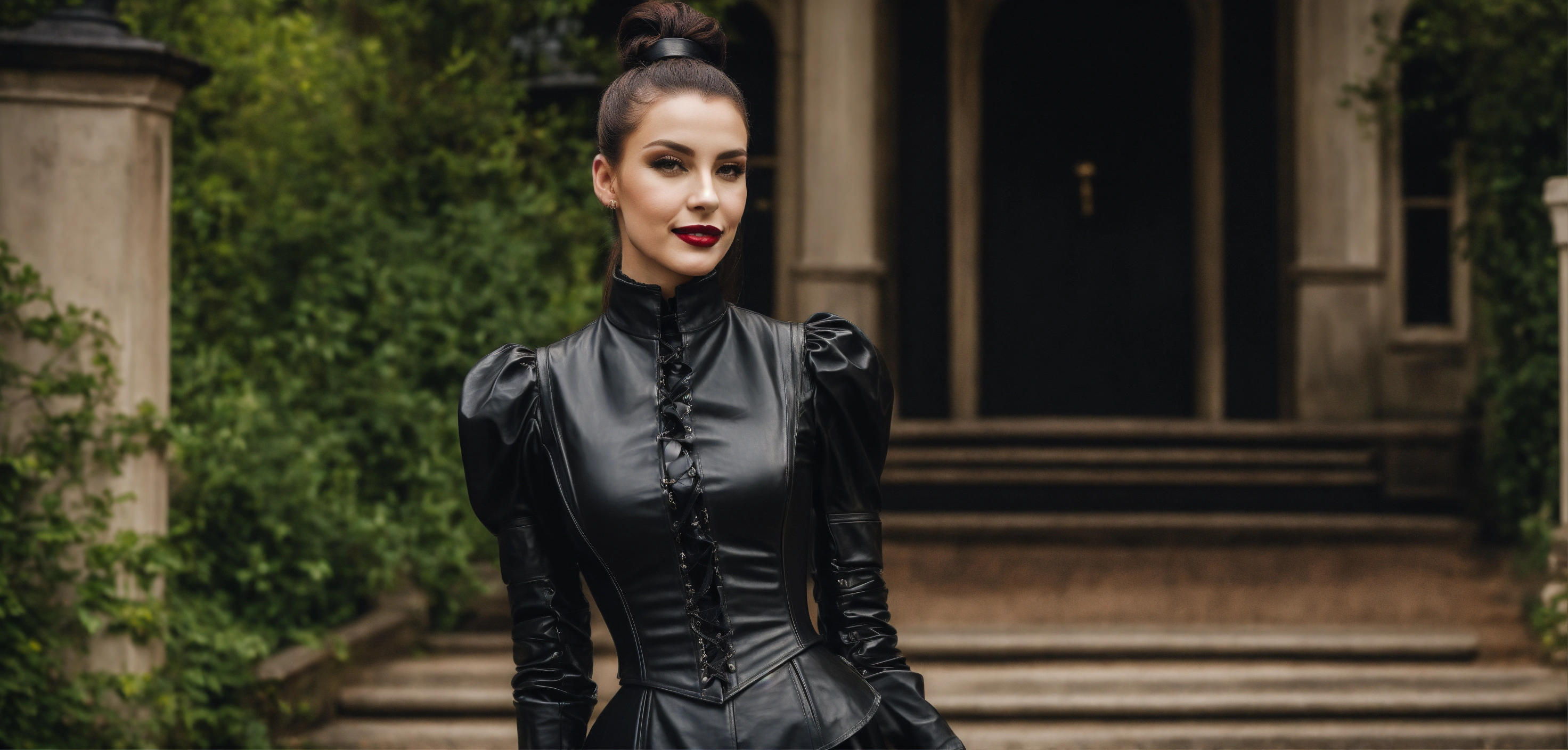 Stunning arrogant woman fashion model, evil smile, strict victorian black leather governess shirt dress buttons, long puff sleeves, black leather waist corset, black straight high ponytail, makeup, mansion park