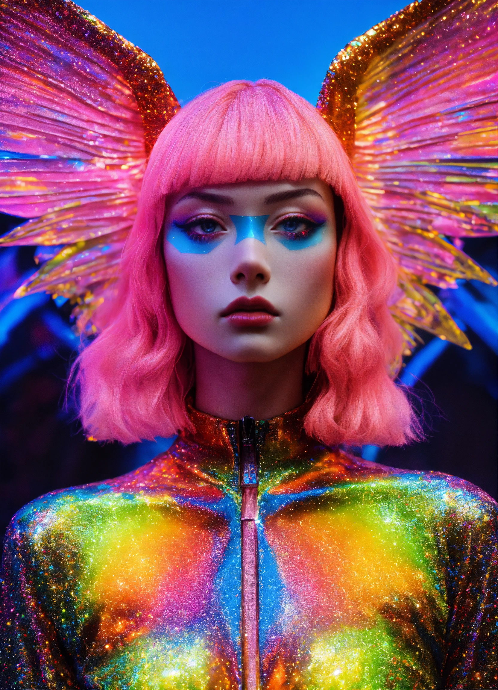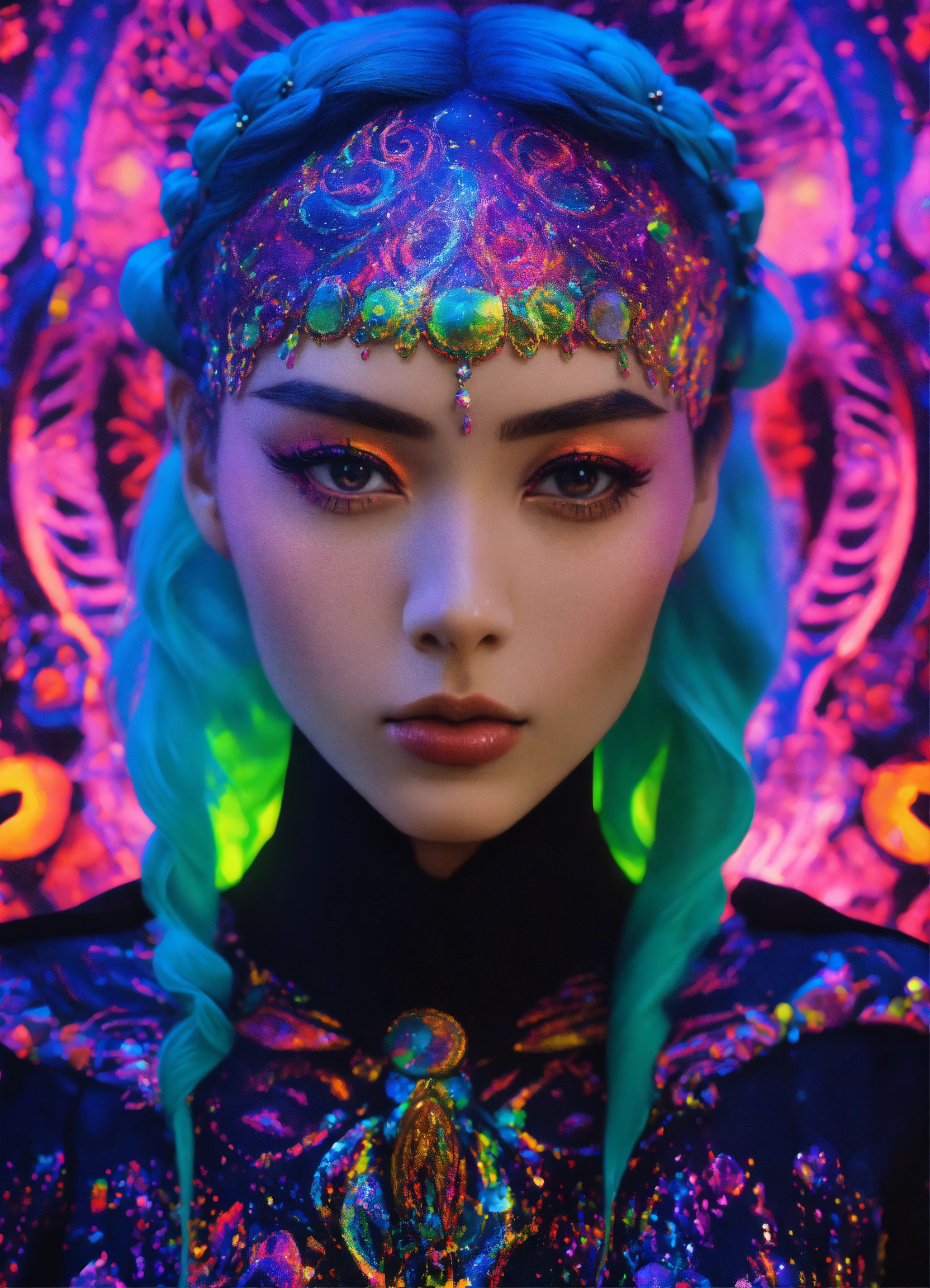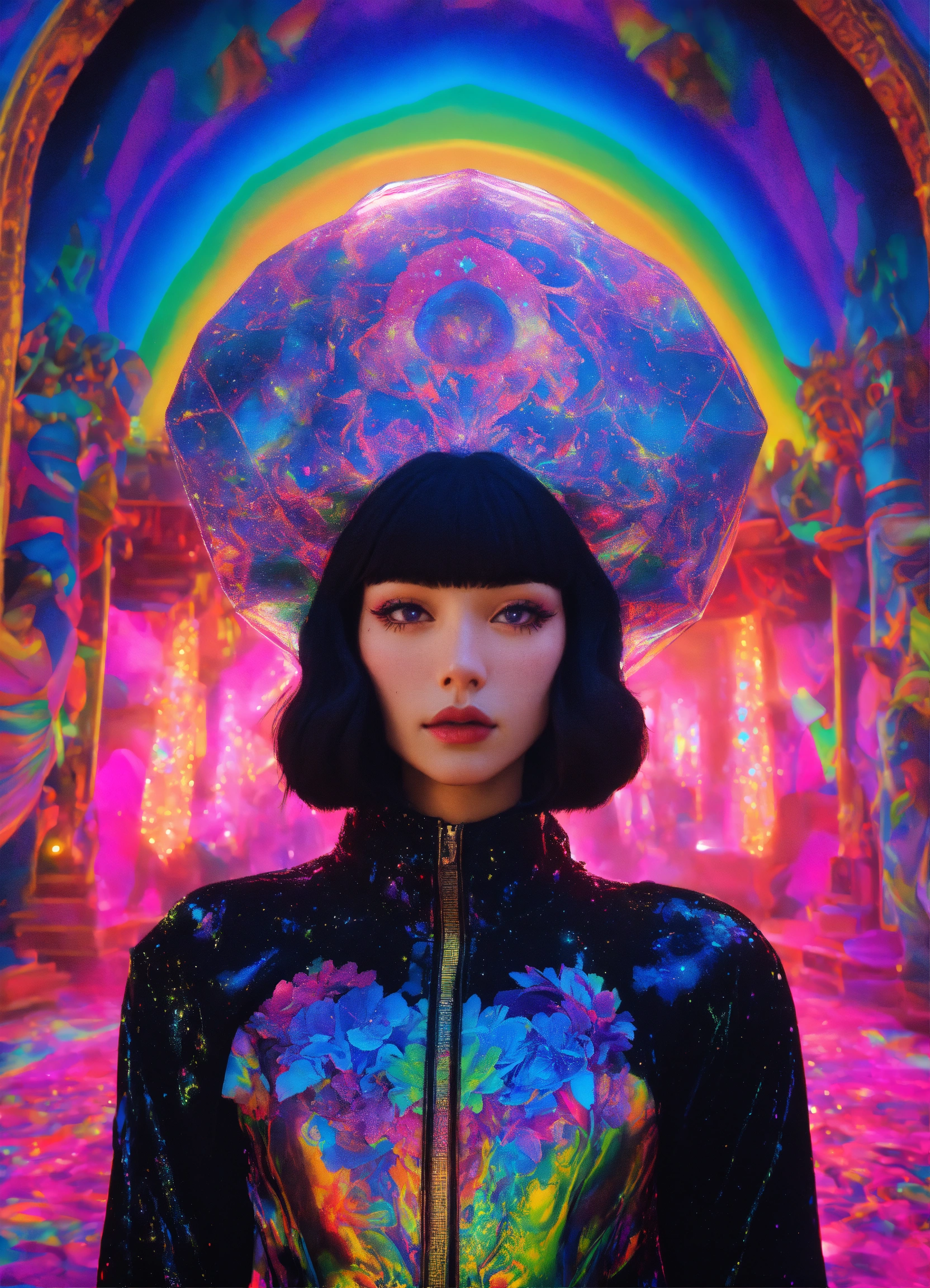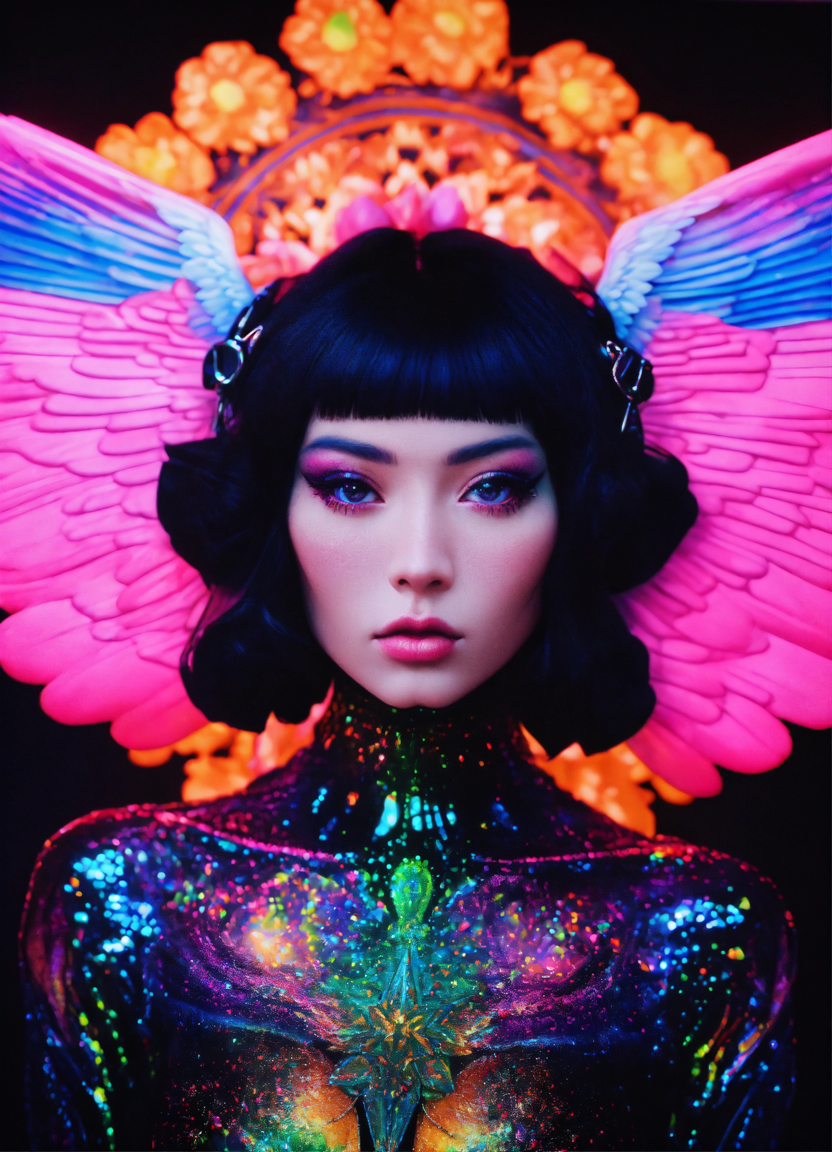 Photorealistic 3d portrait of gorgeous goth emo korean angel kawaii punk rock anime haute couture costume, of cosmic alex grey painting in a dmt black light glitter neon black rainbow glitter holographic paris fashion night 70mm film, art by salvador dali and holy mountain the movie.