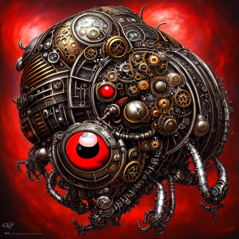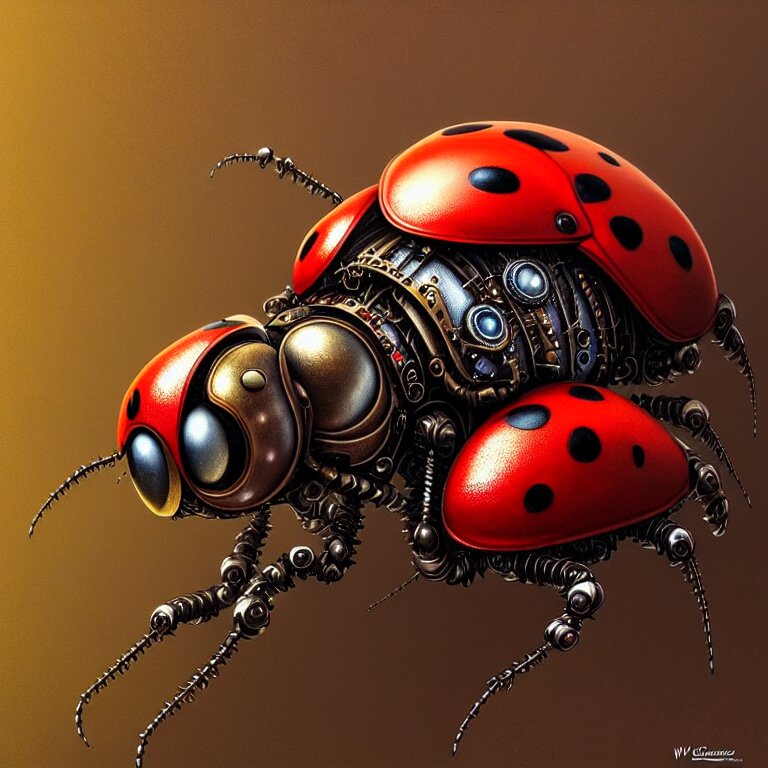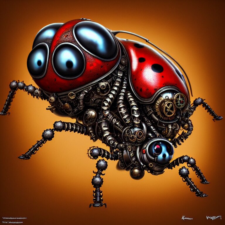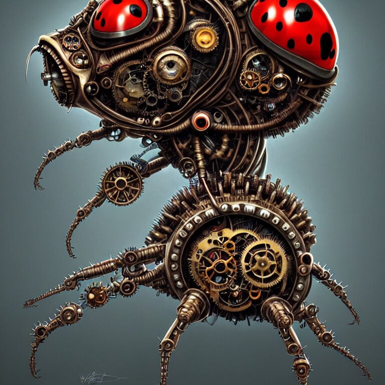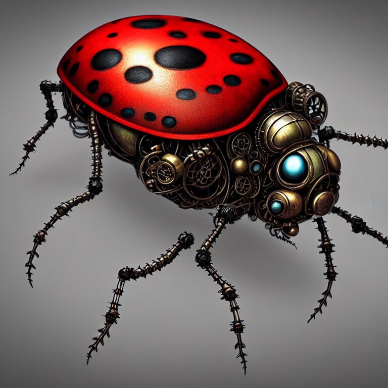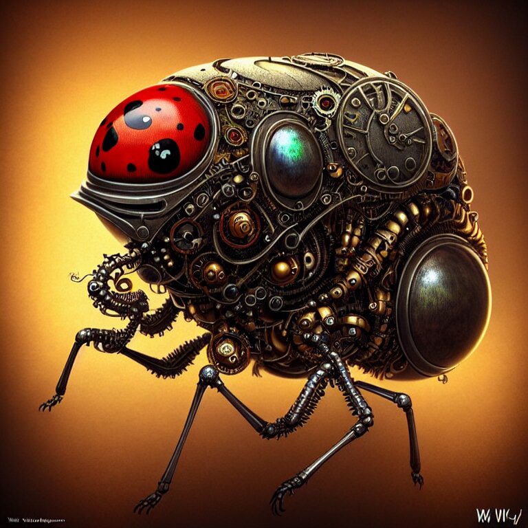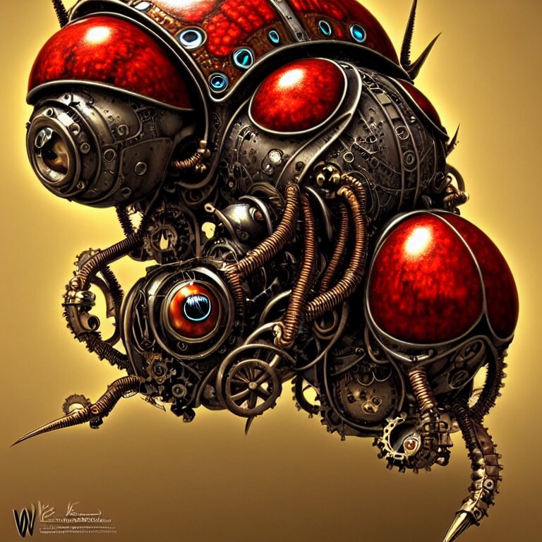 Steampunk ladybug, biomechanical, very coherent symmetrical artwork, 3 d model, unreal engine realistic render, 8 k, micro detail, intricate, elegant, highly detailed, centered, digital painting, smooth, sharp focus, illustration, artgerm, tomasz alen kopera, by wlop