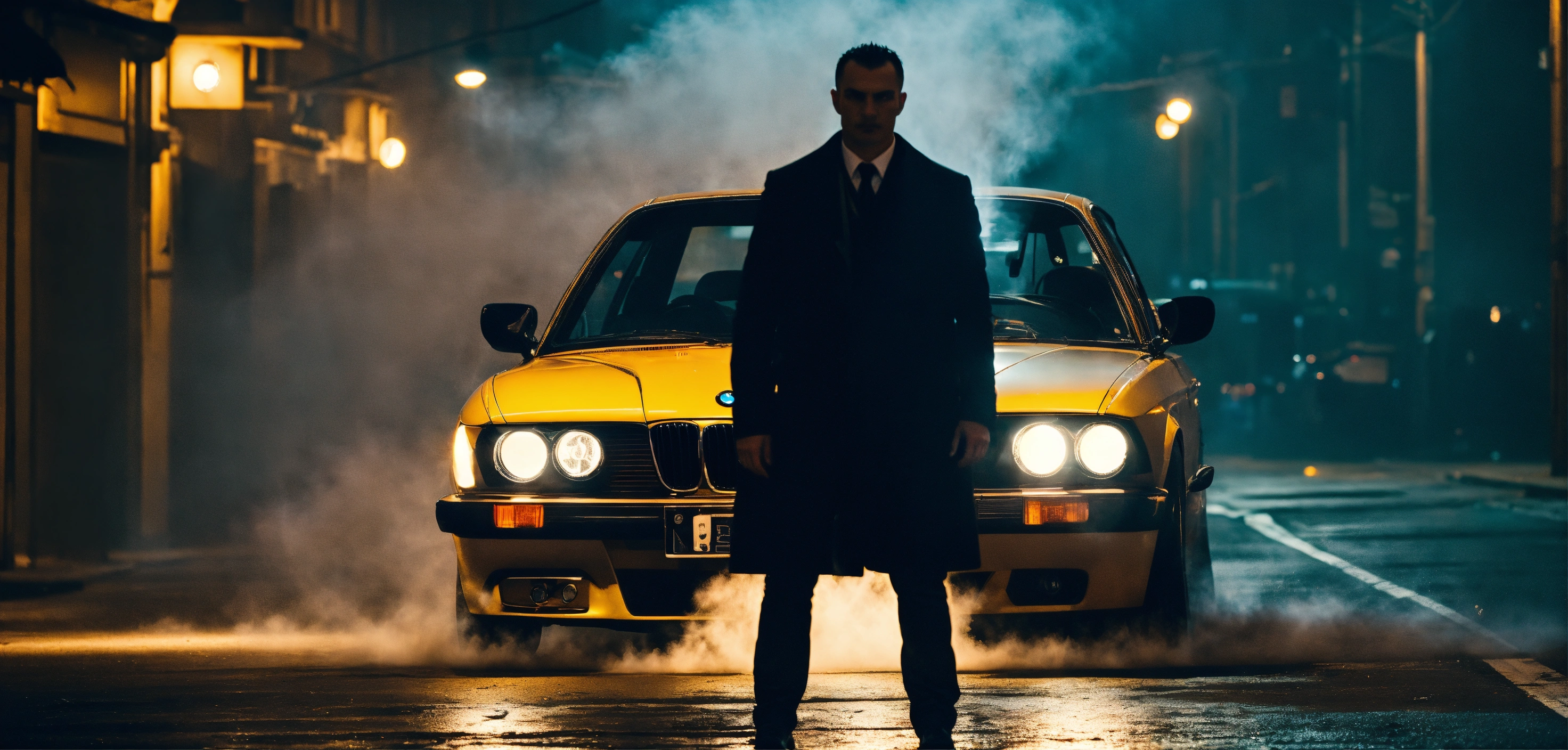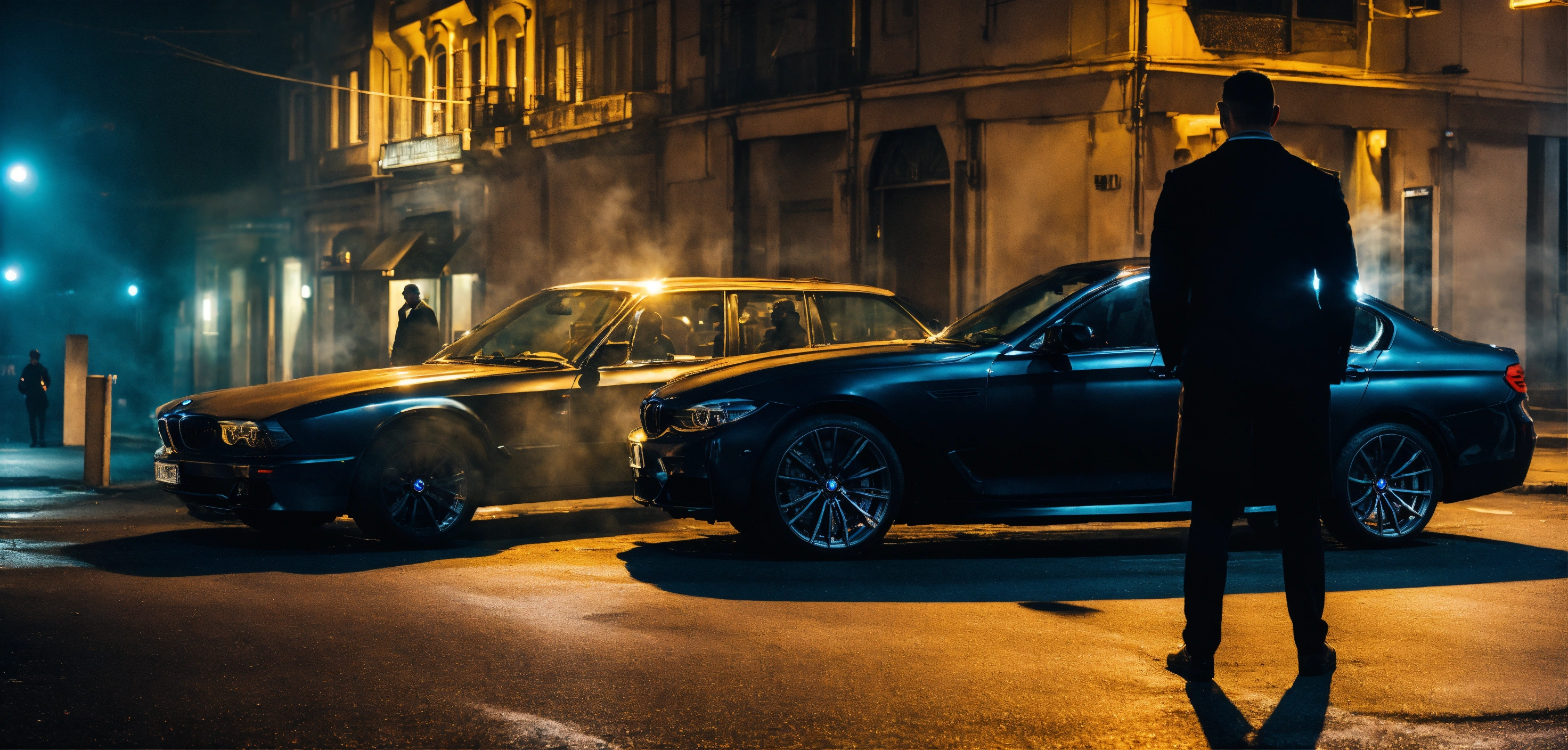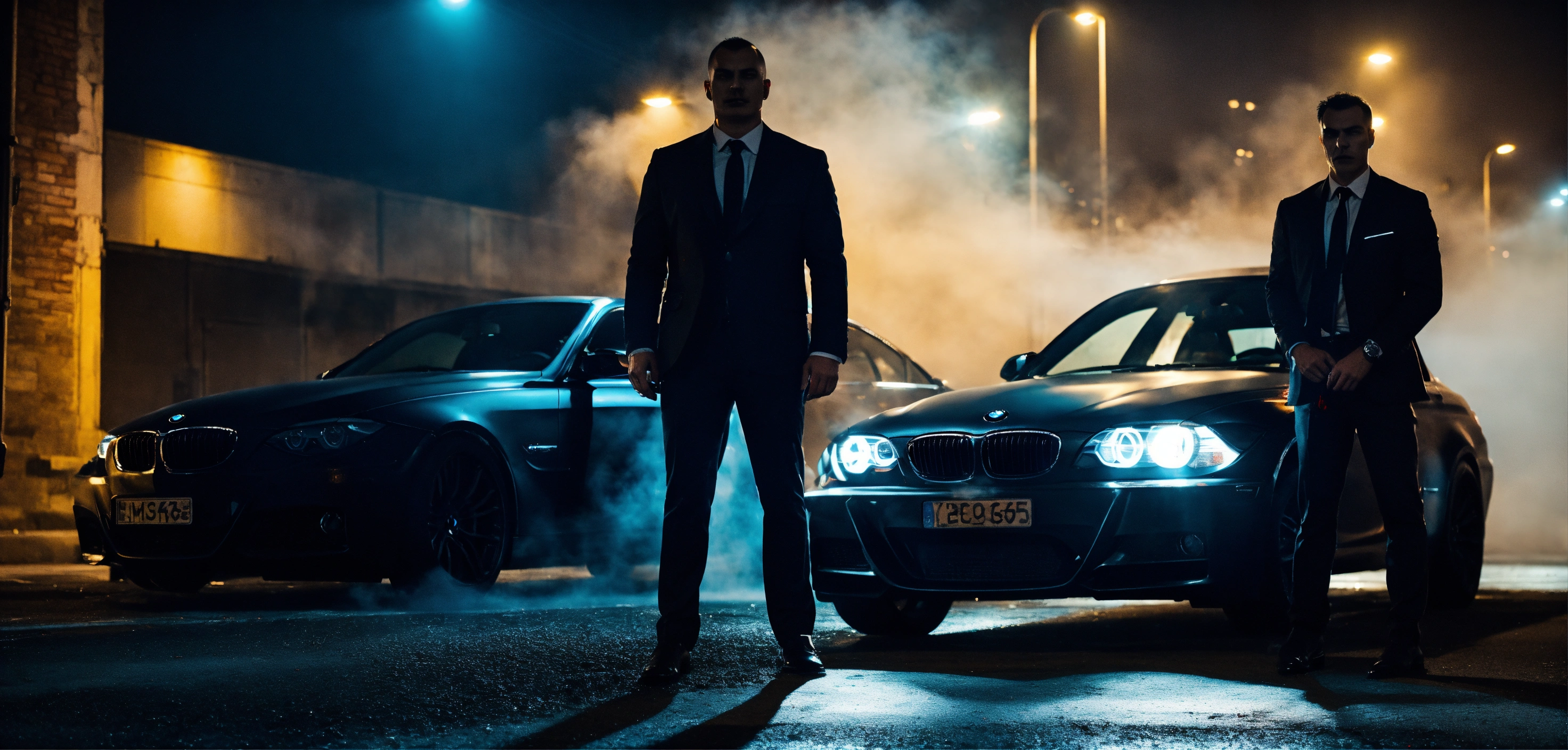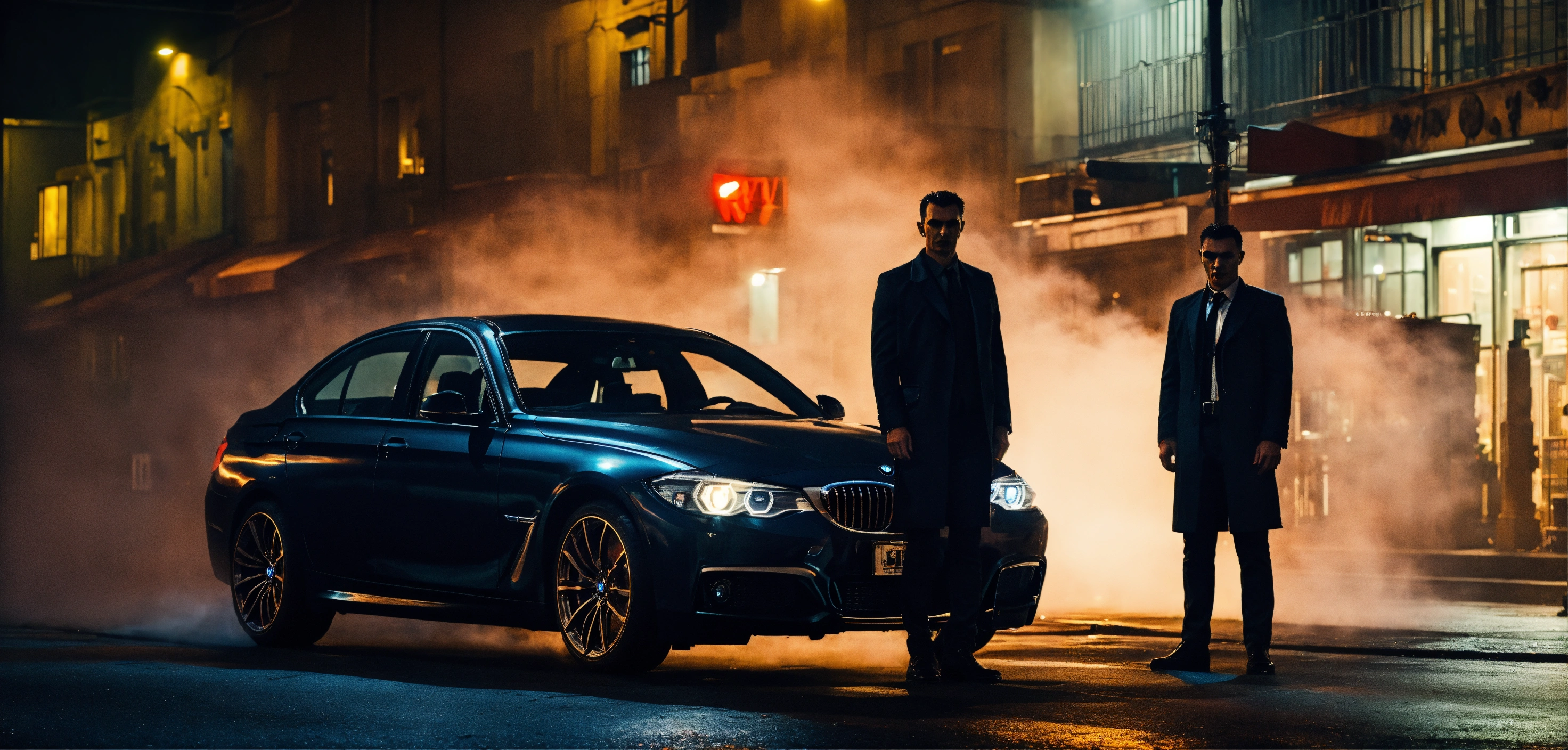 Cinematic look, urban side street by night haze, dim light, two bodyguards standing in front of a black modern bmw car, backlight of the car headlights, steaming manhole covers, underworld vampire movie style