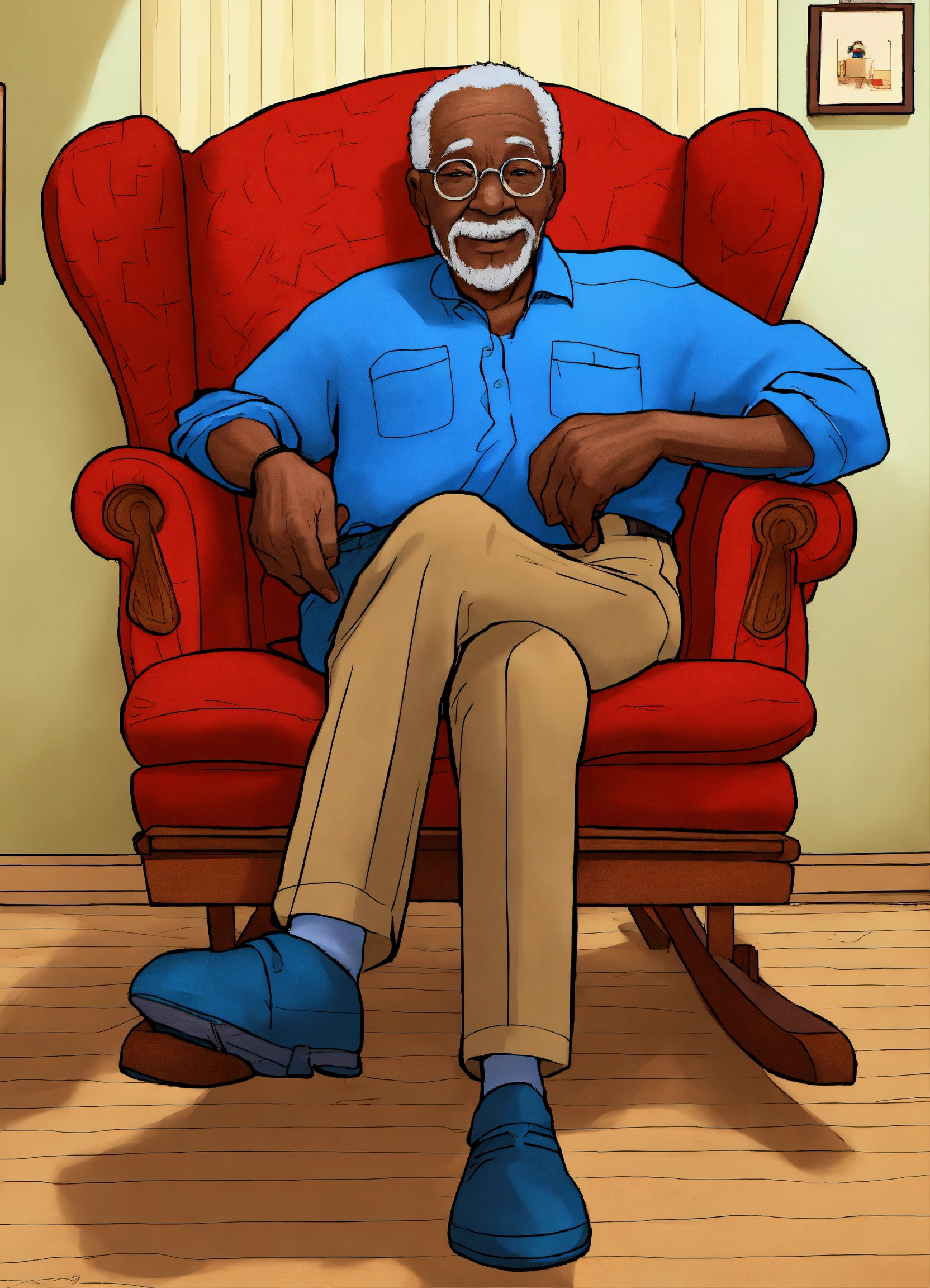 Black elderly cartoon grandpa wearing a blue shirt and blue pants, in his new rocking chair, withred pillows