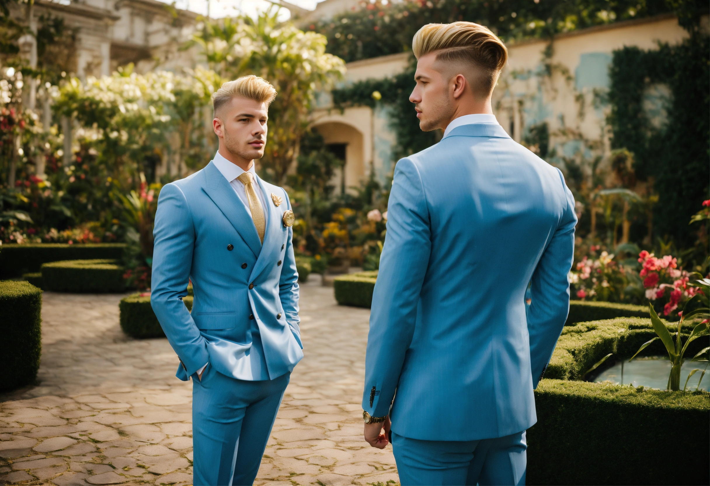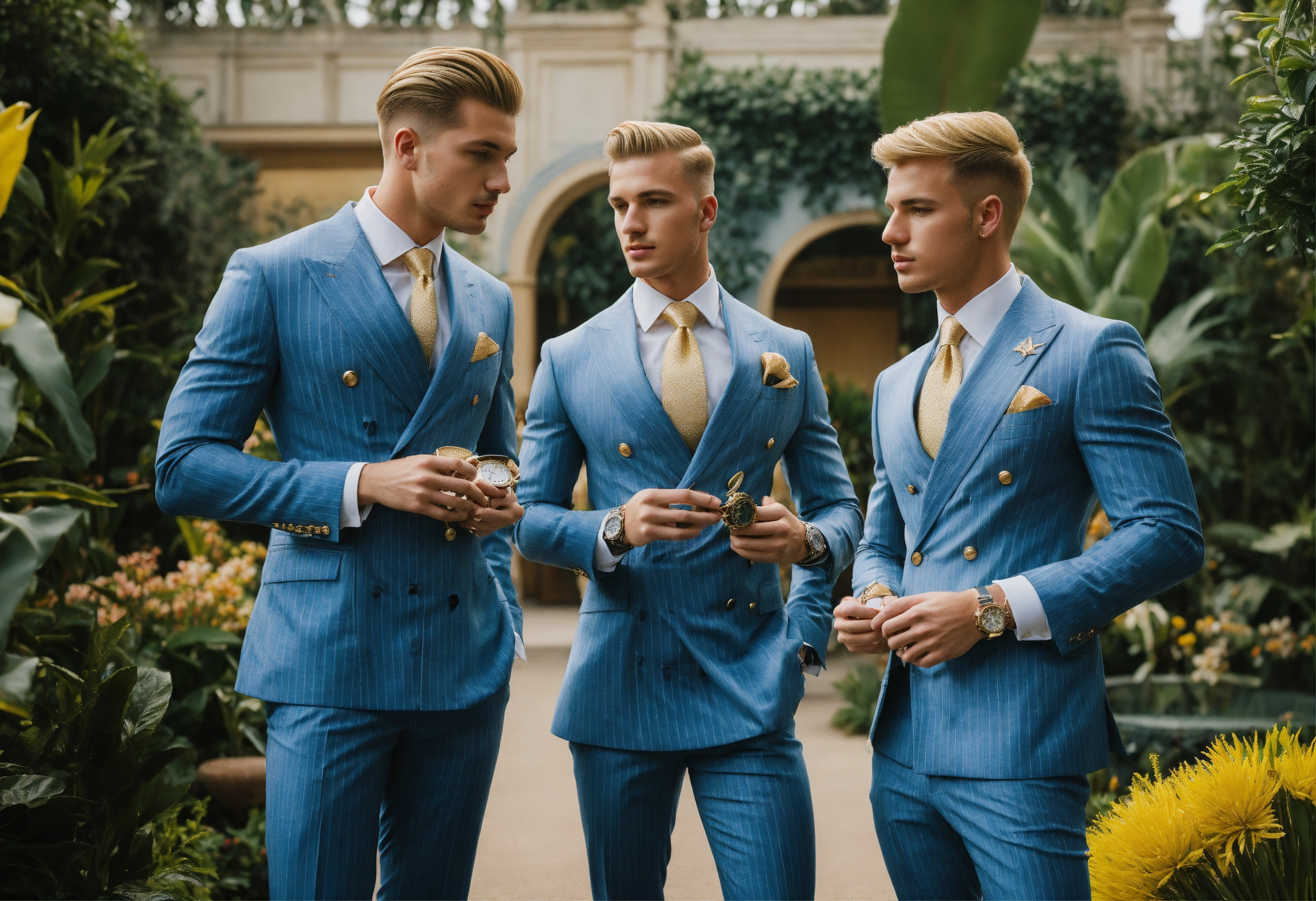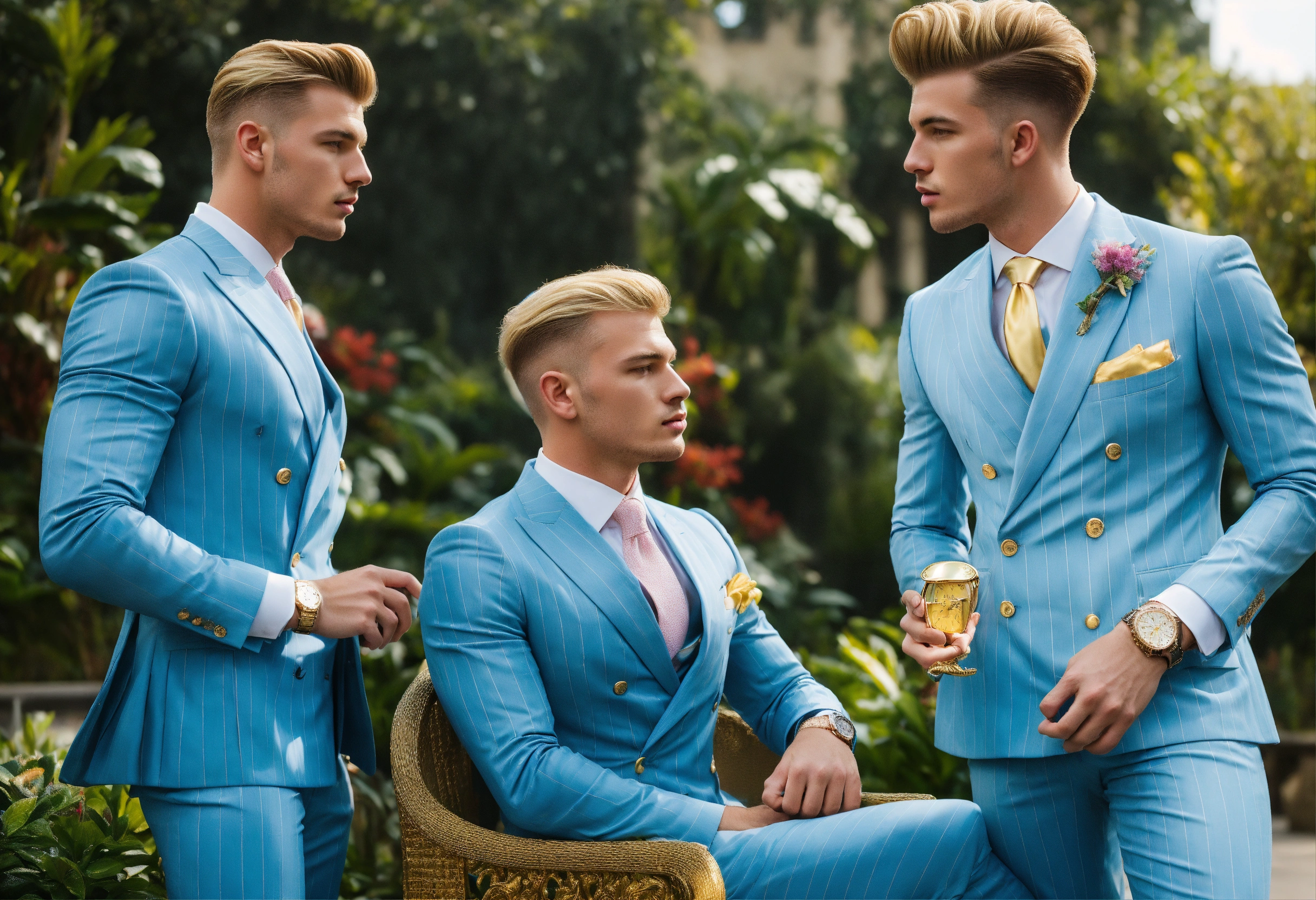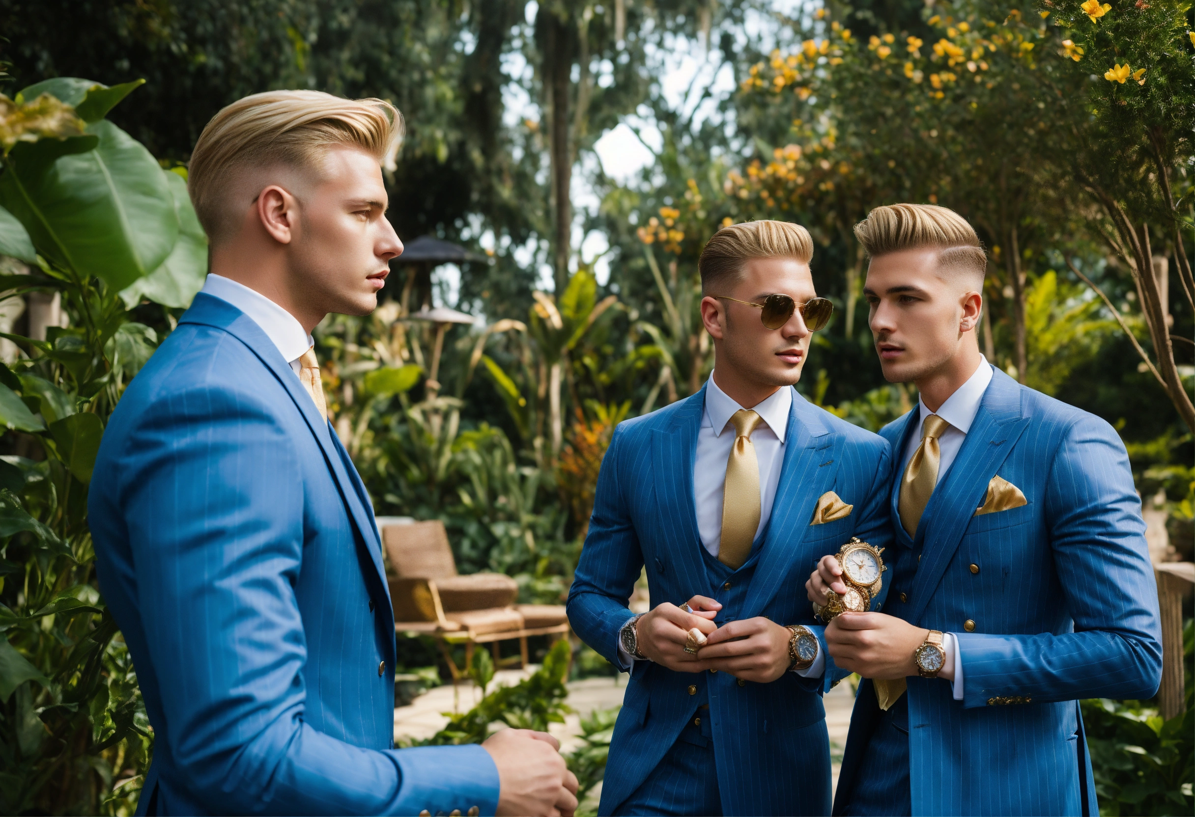 Three young blonde businessmen in light blue pinstripe double breasted suit, pompadour haircut, golden watch, talking in an exotic garden