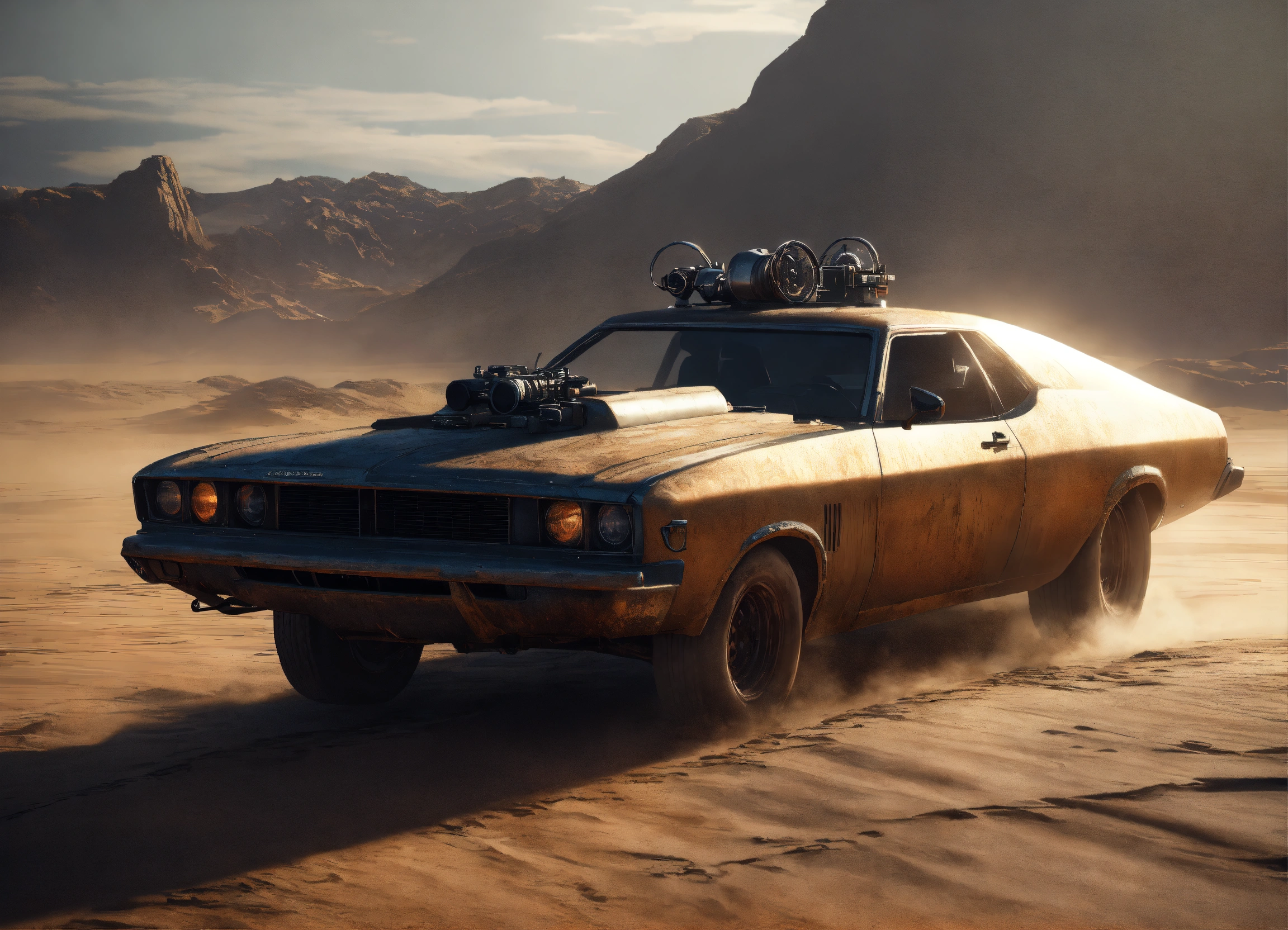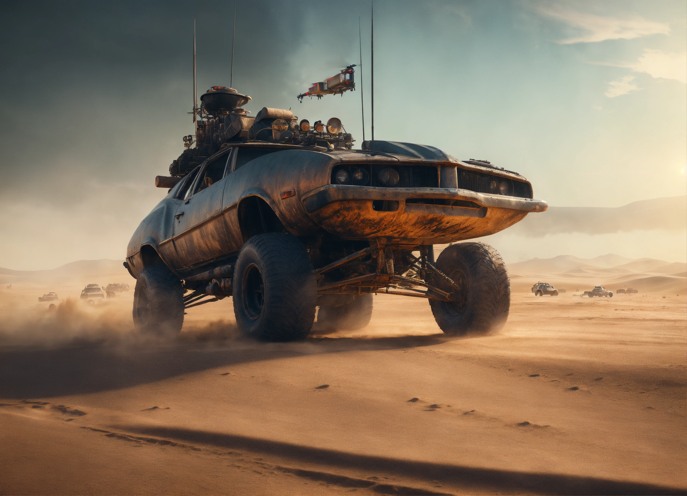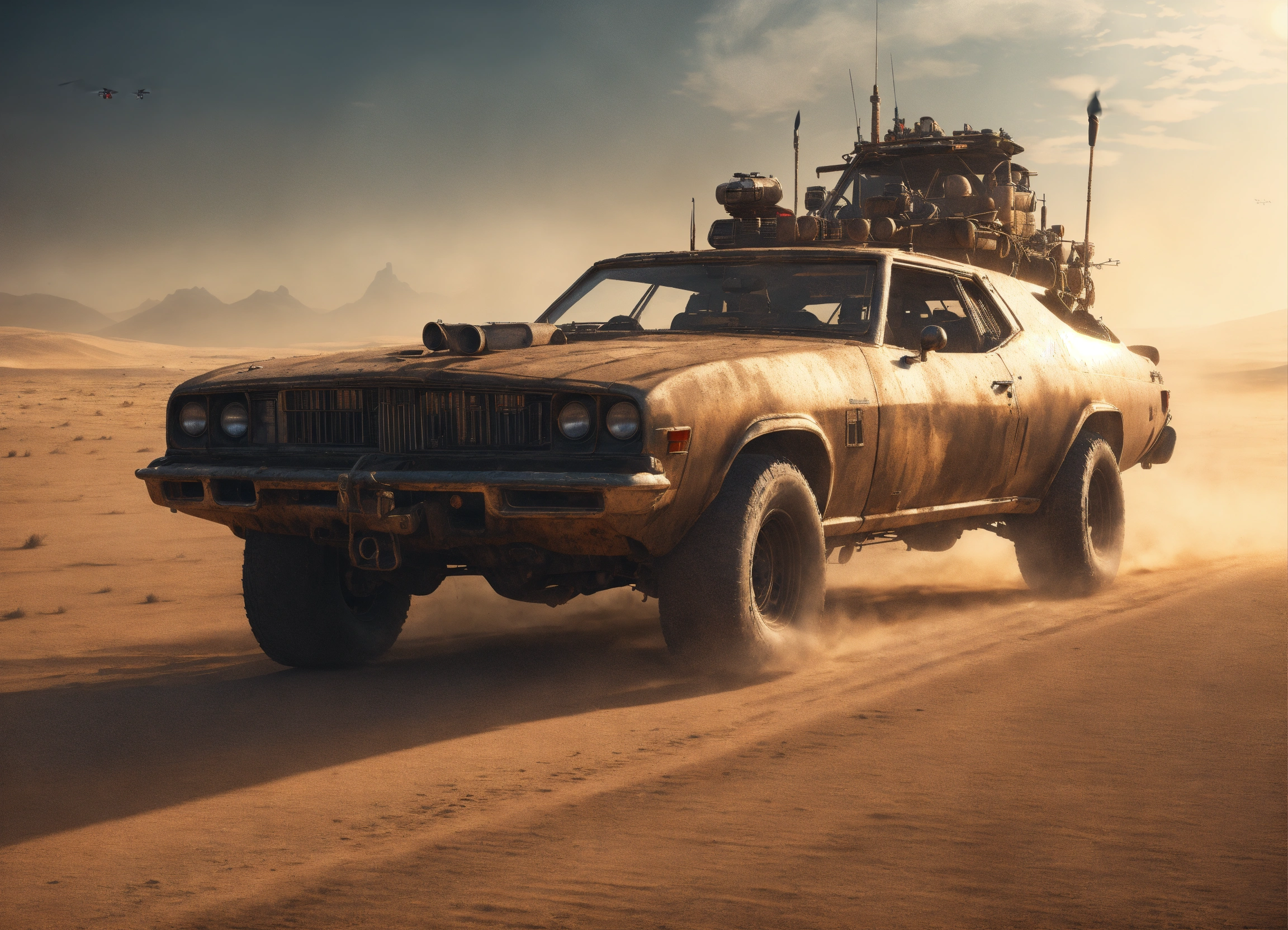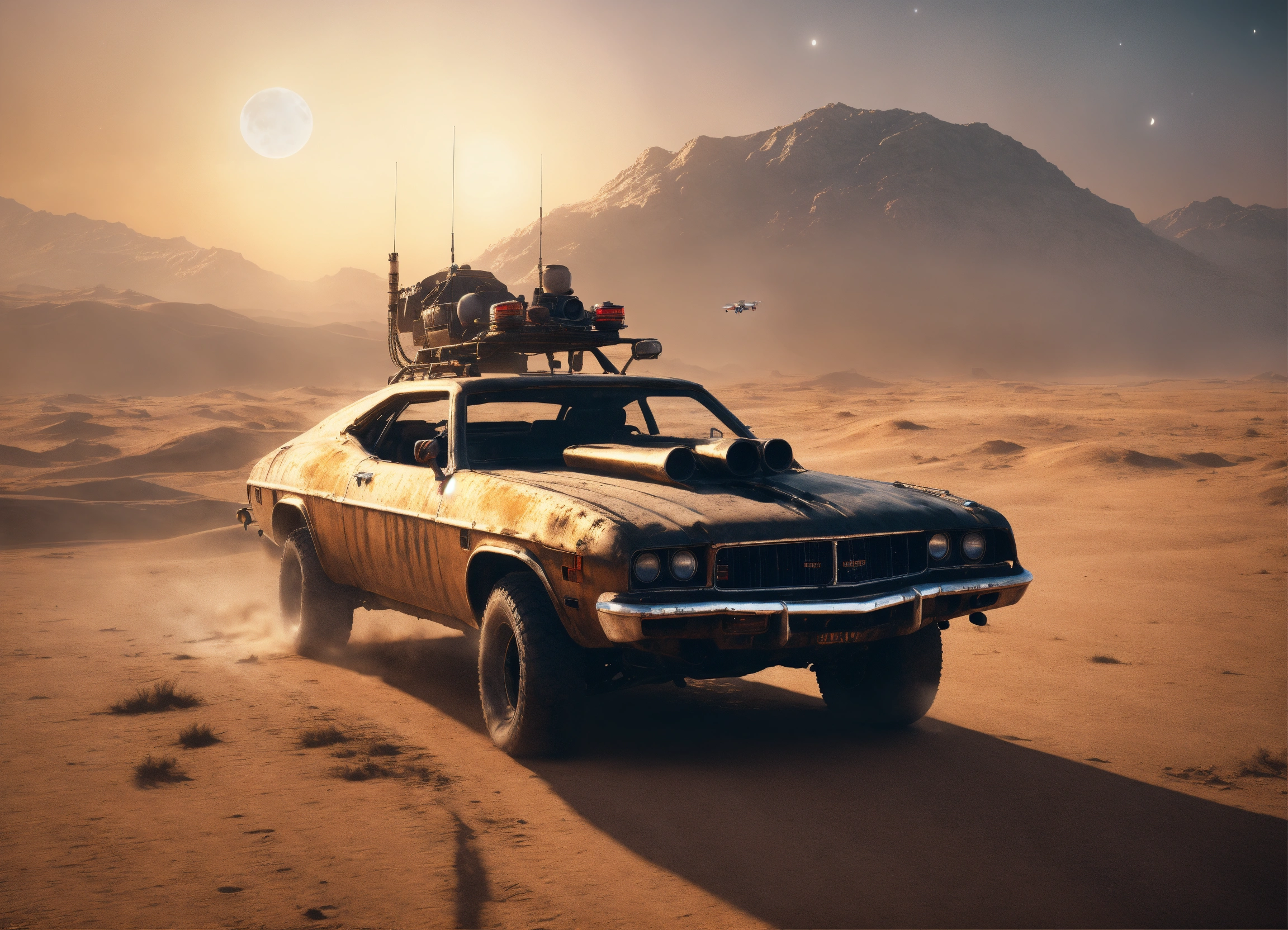 Mad max vehicle, trending on artstation, cinematic realism, ethereal moonlight, calm, drone wide shot.