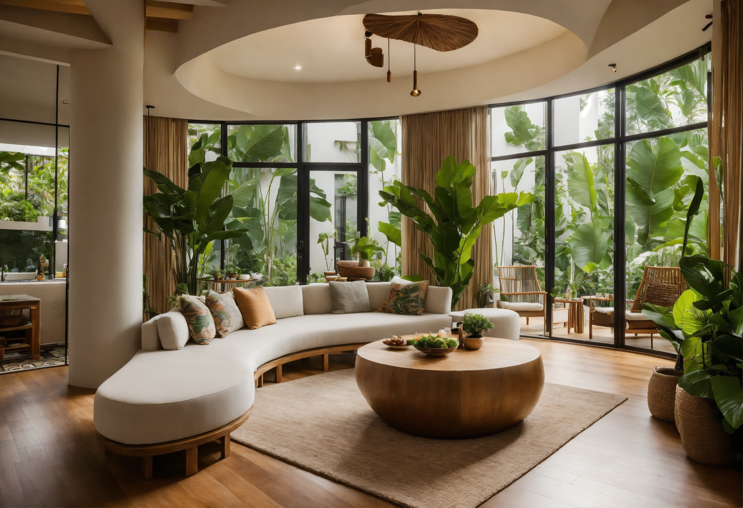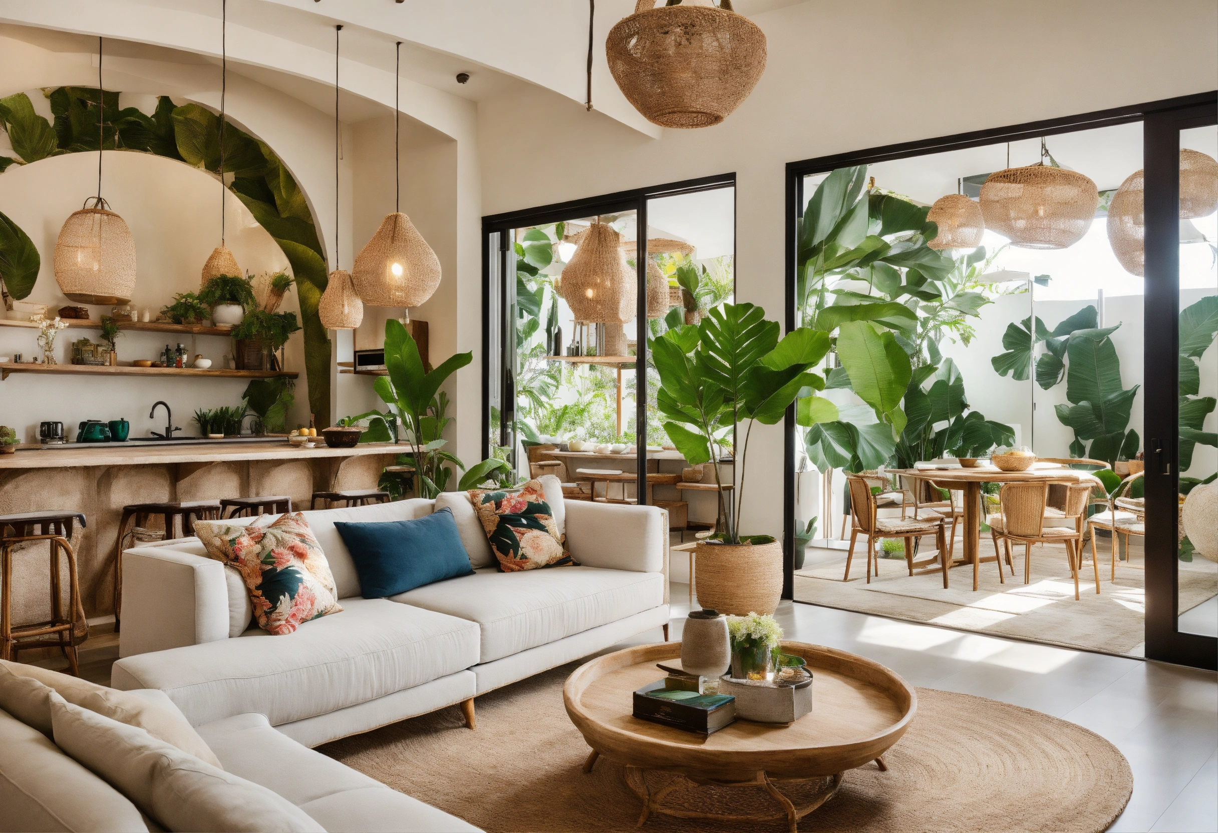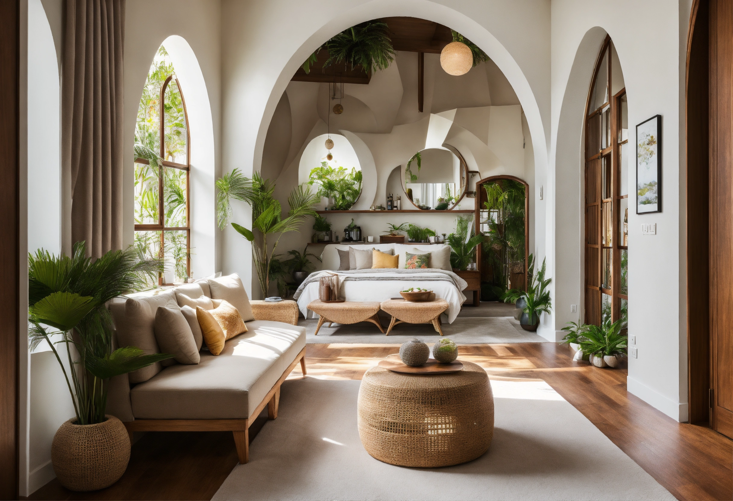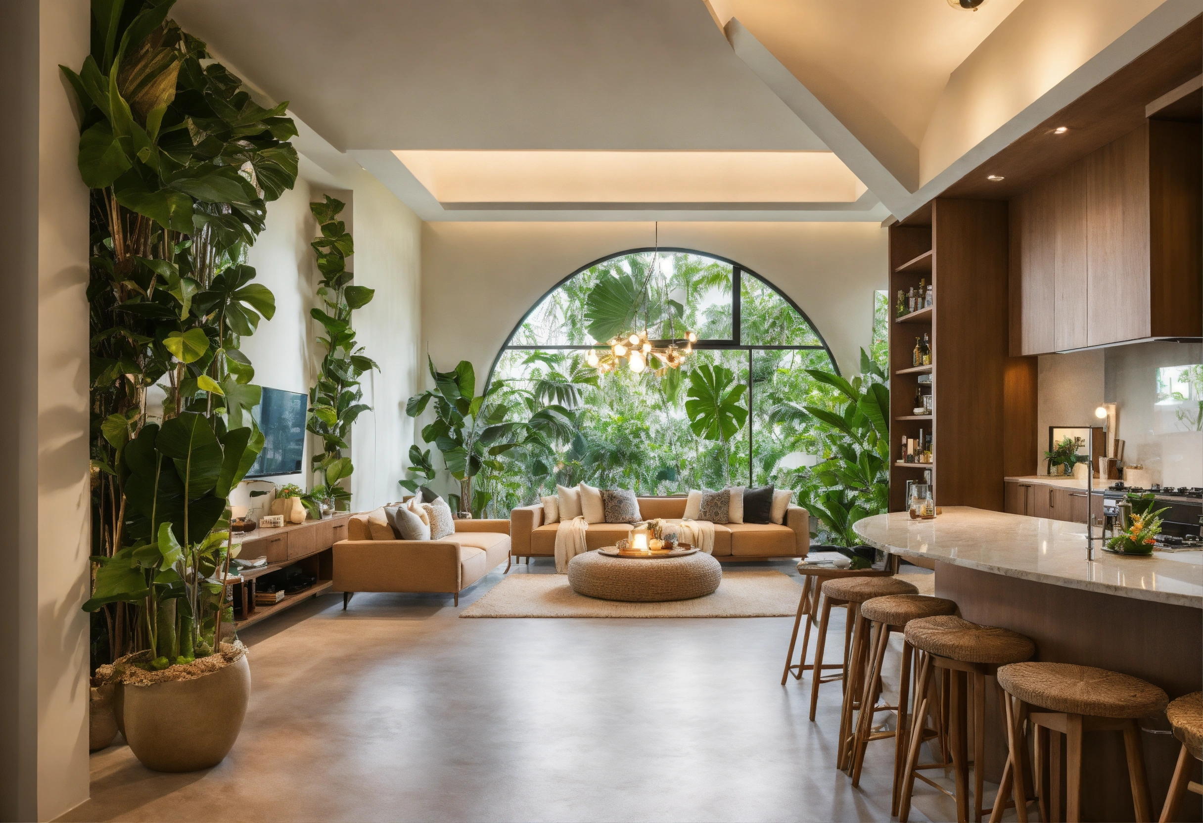 Modern take on upscale bali inspired small condo white round arches interor view of kitchen living room bedroom tropical foliage