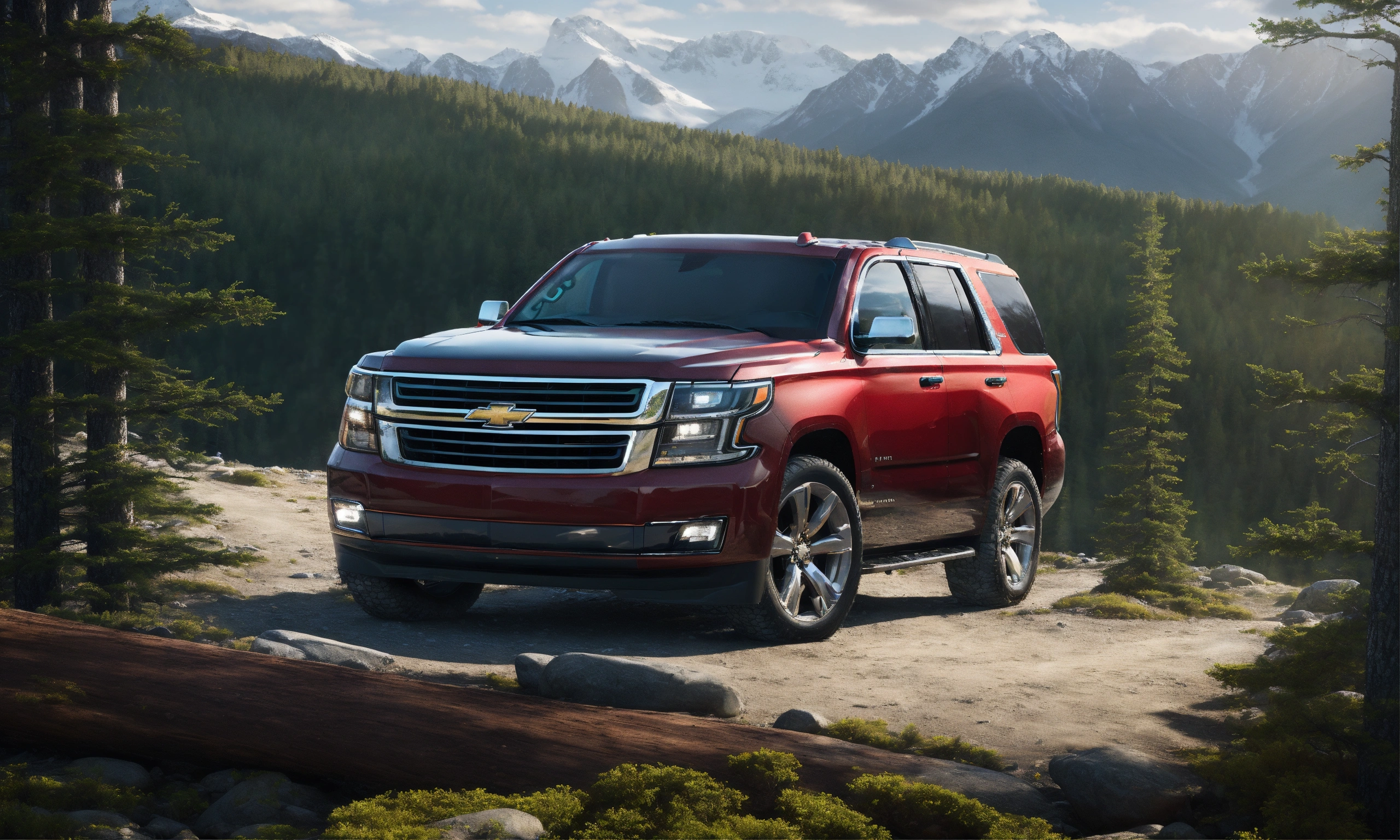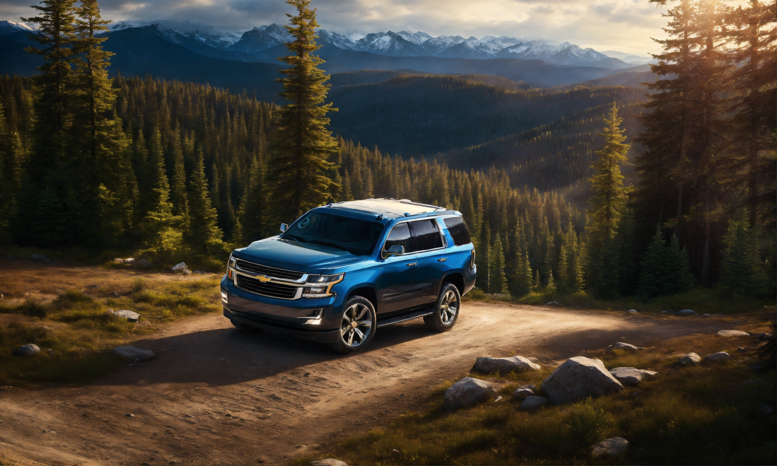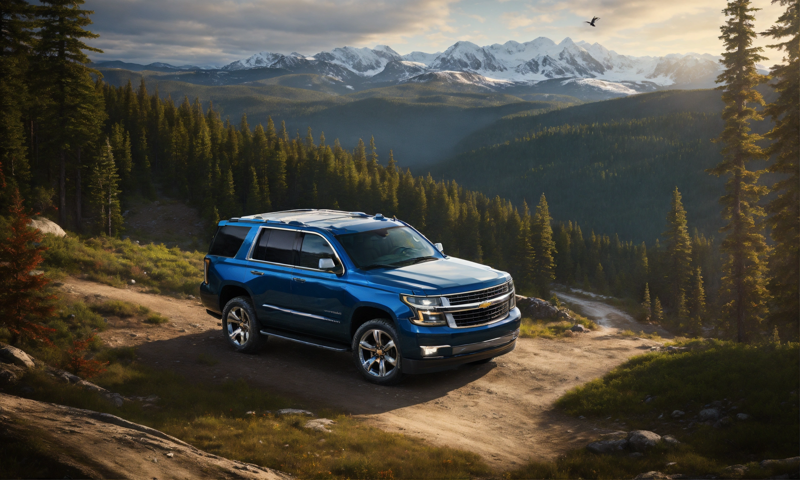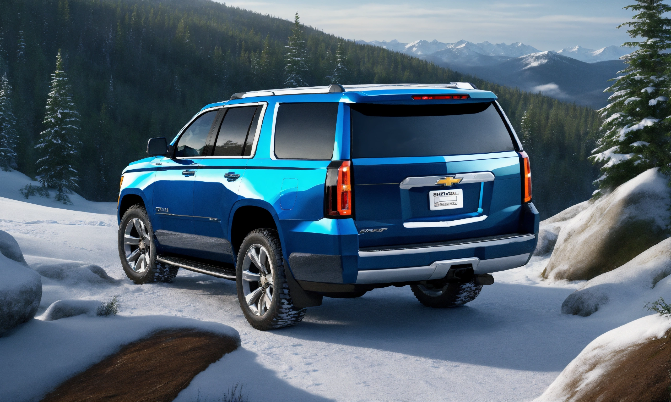 Chevrolet tahoe parked at the edge of a back country skii trail, forest, bird eye view, photo realistic
