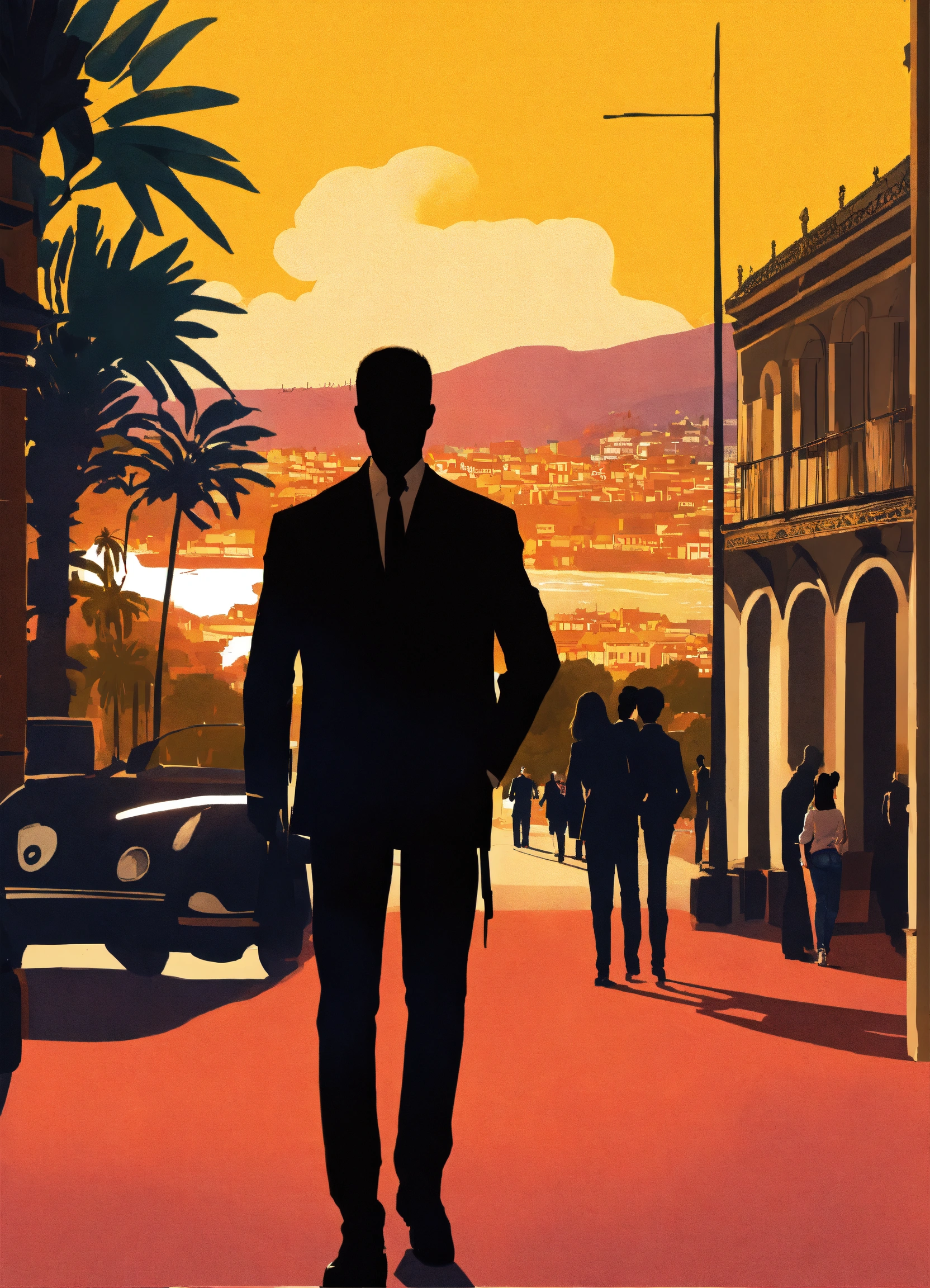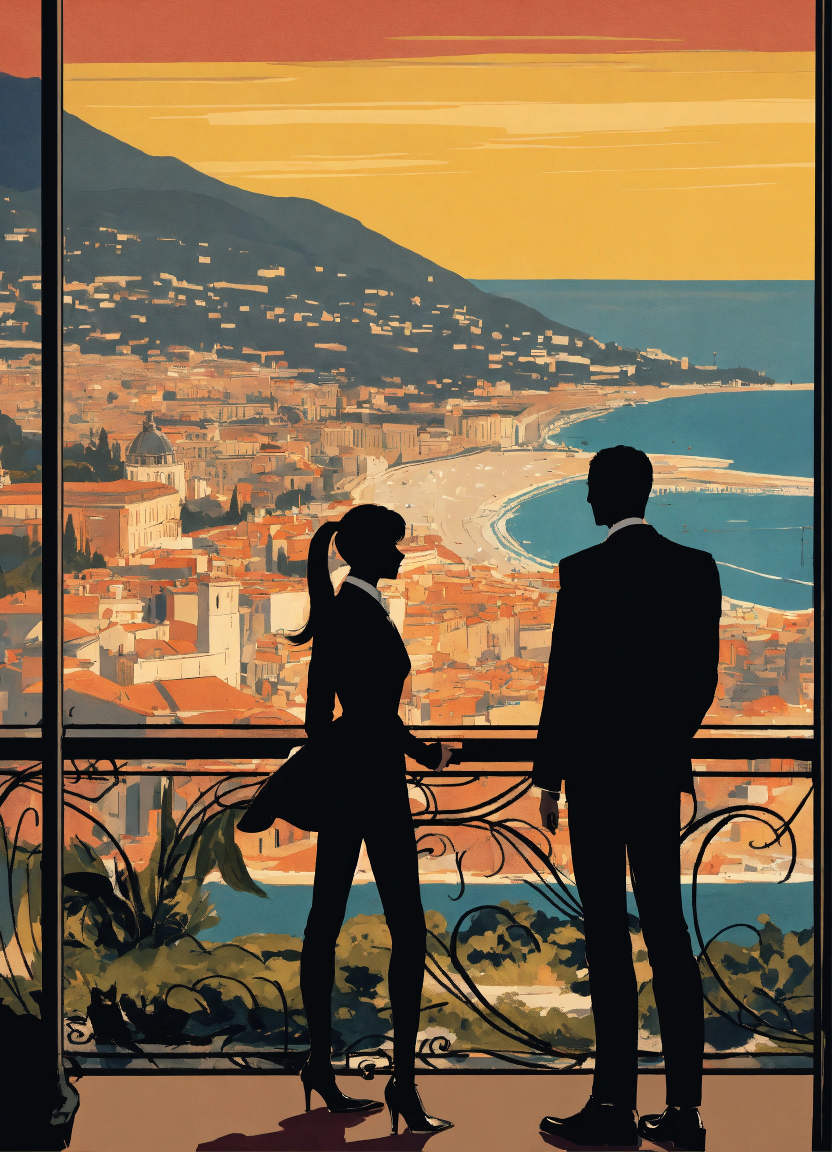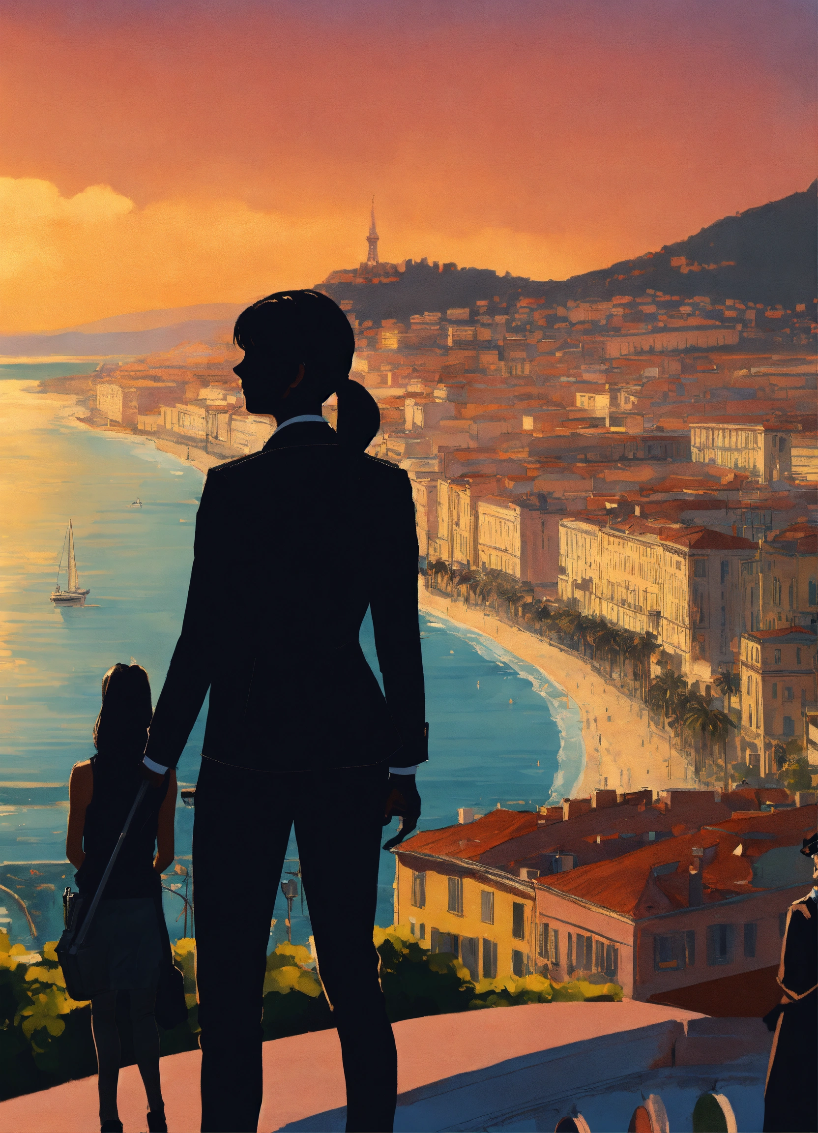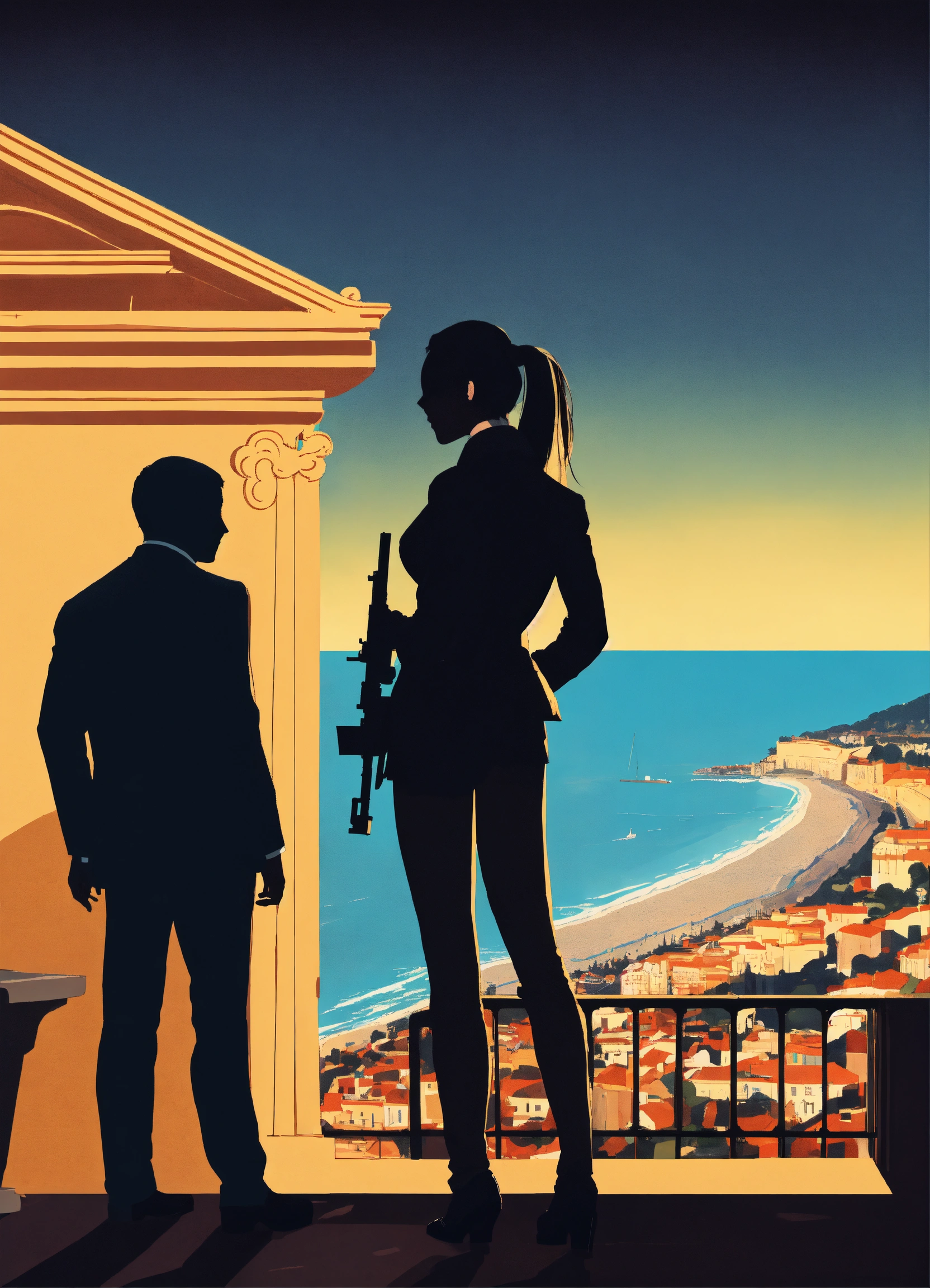 In the background, bay of angel in nice, the silhouette of an armed spy in a black suit with a woman wearing jeans and a pony tail