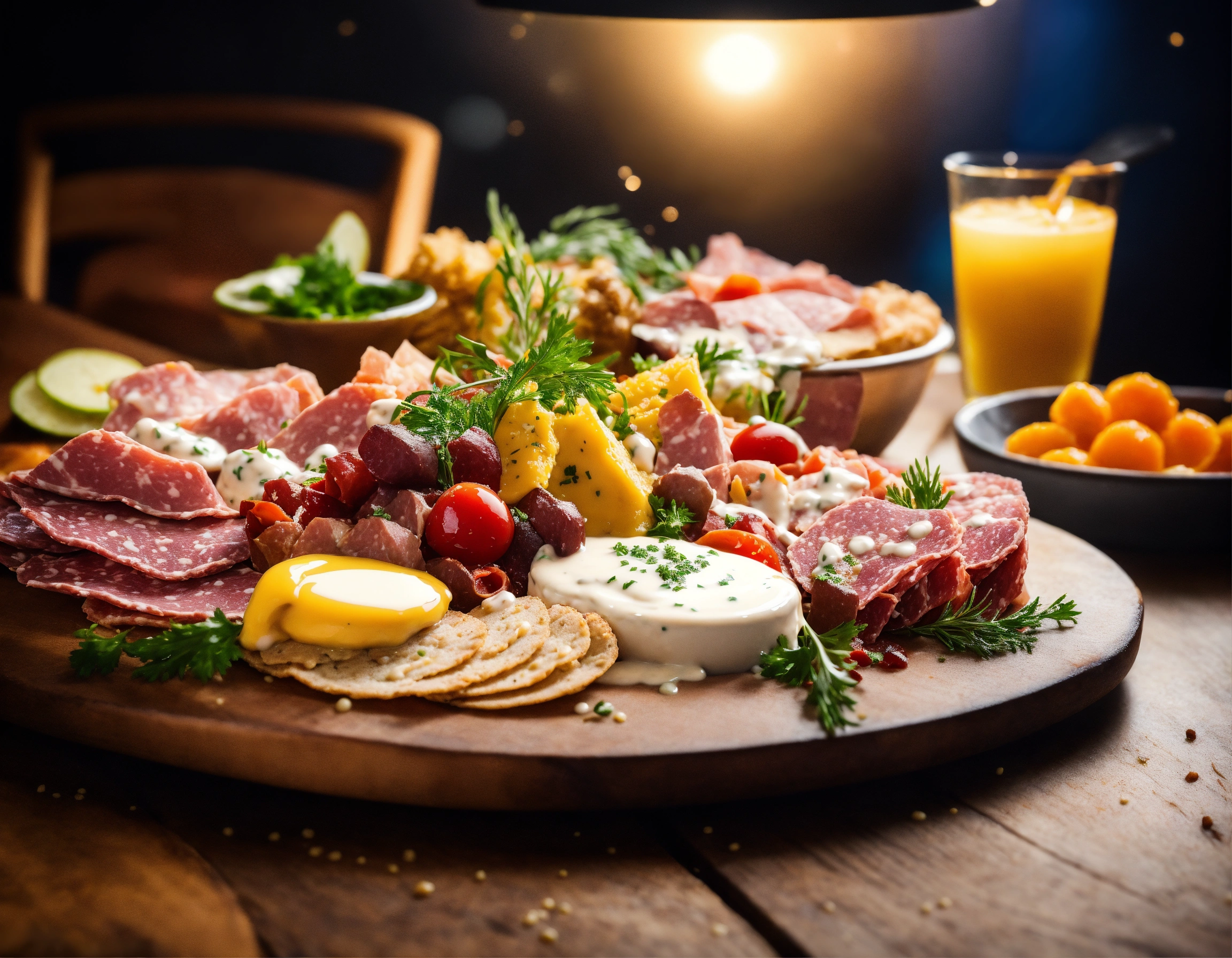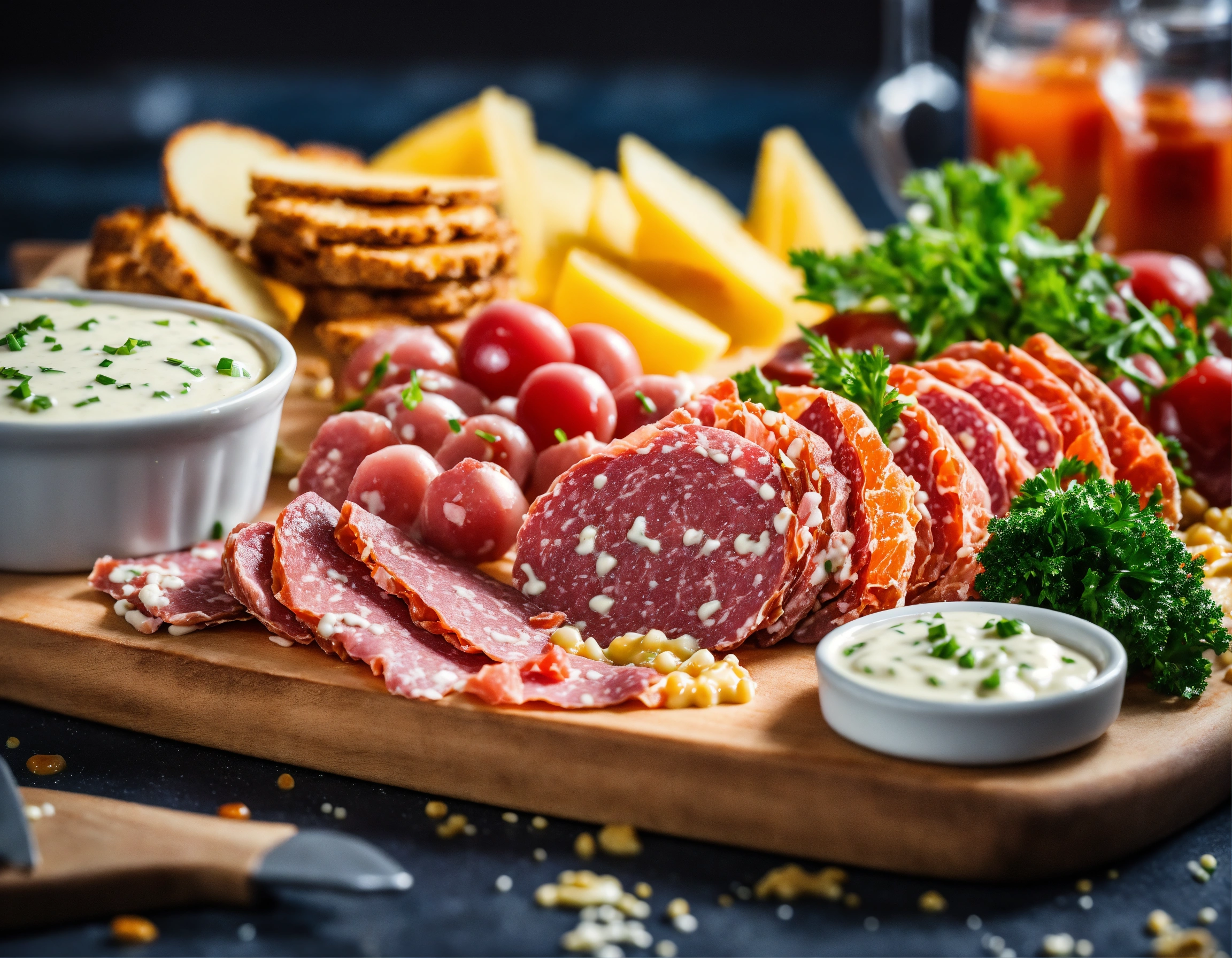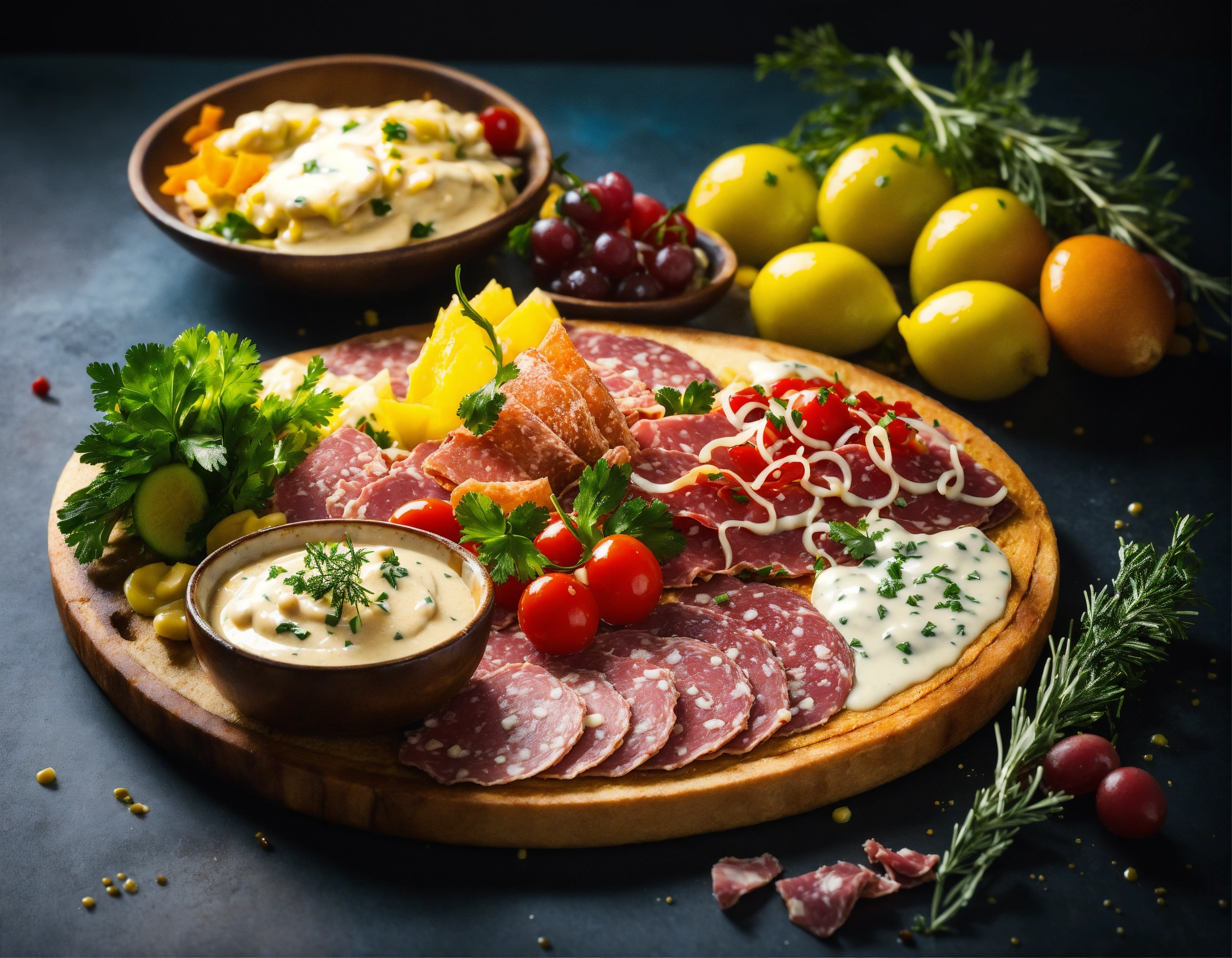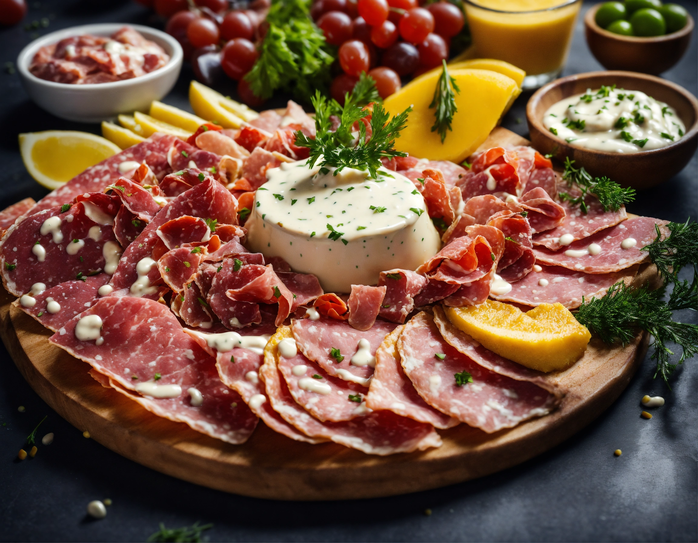Charcuterie platter. with spectacular splashes of tartare sauce. creative dynamic composition varies the angle. macro food photography, taken by an expensive, very high-tech camera. eye-catching, enticing and captivating. photo product, ideal for poster promotion. 8k, hd quality, ultra realistic, hyper detailed. original idea taken from a different angle.