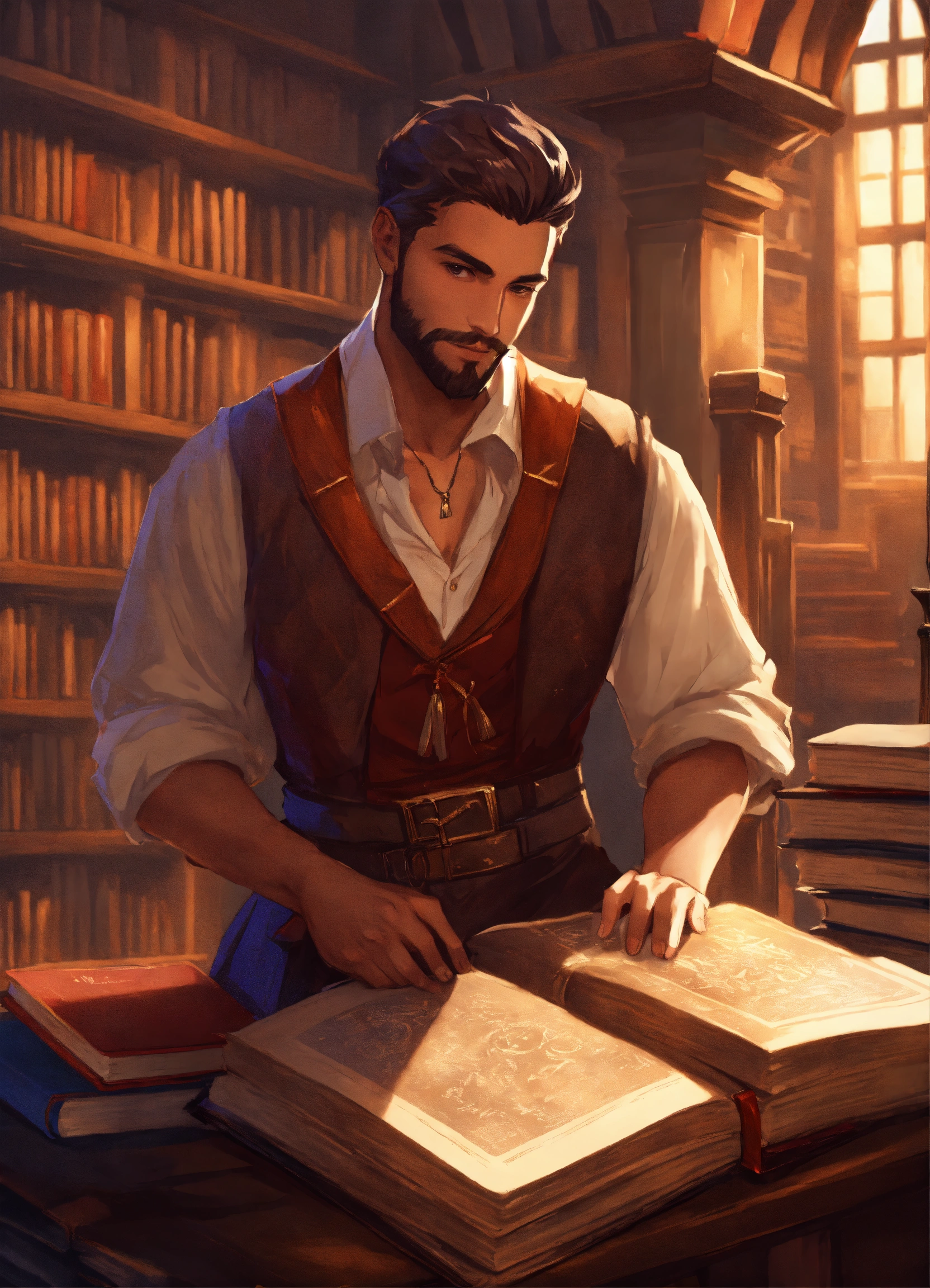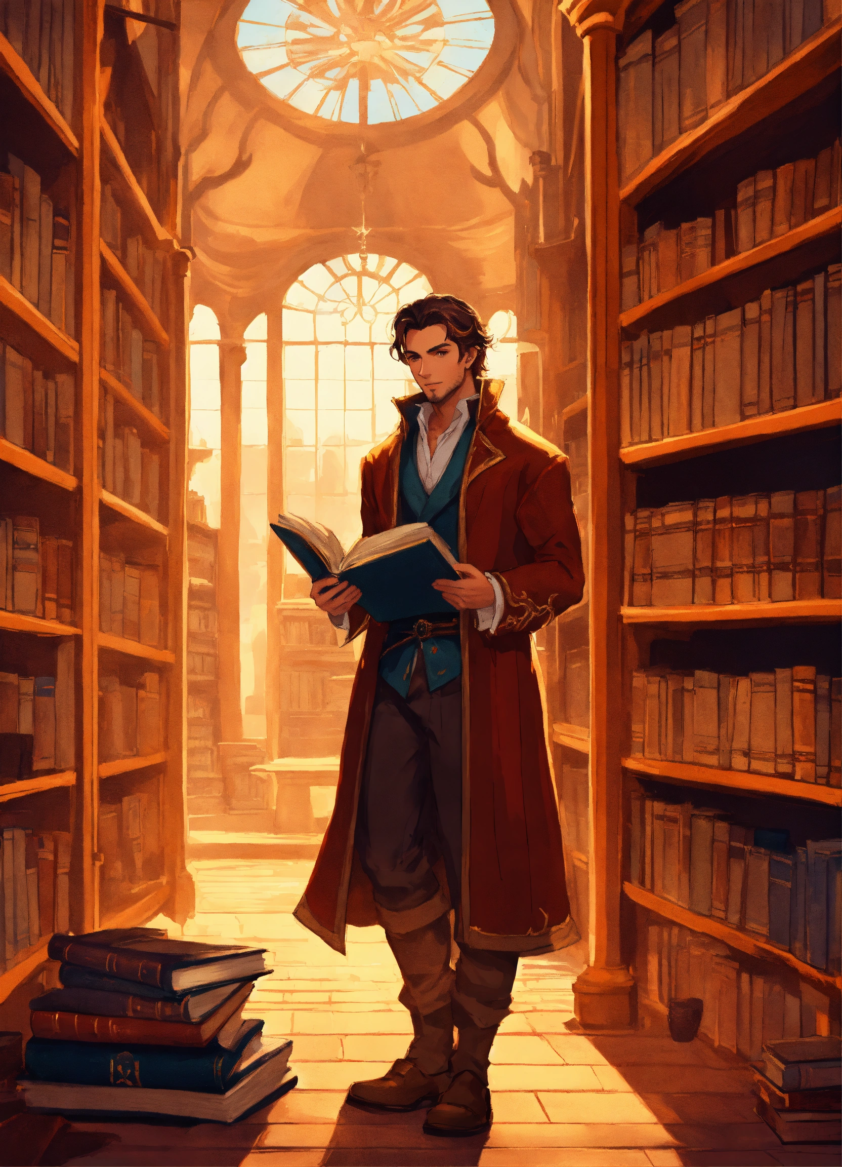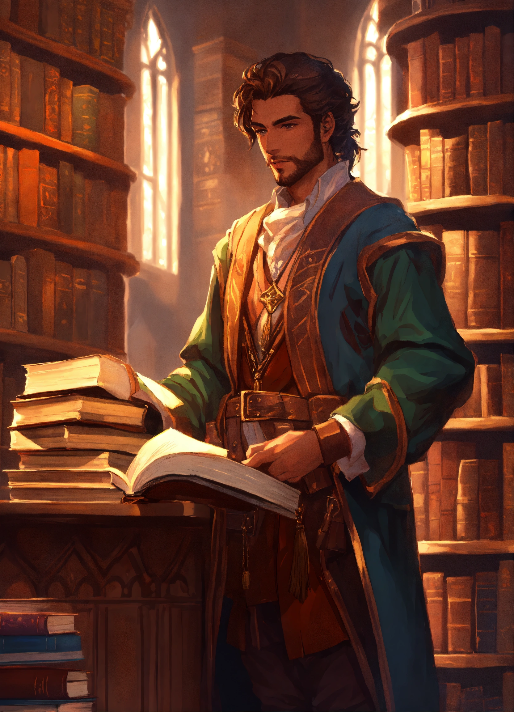 A handsome scholar holding a stack of books in a library dnd character art