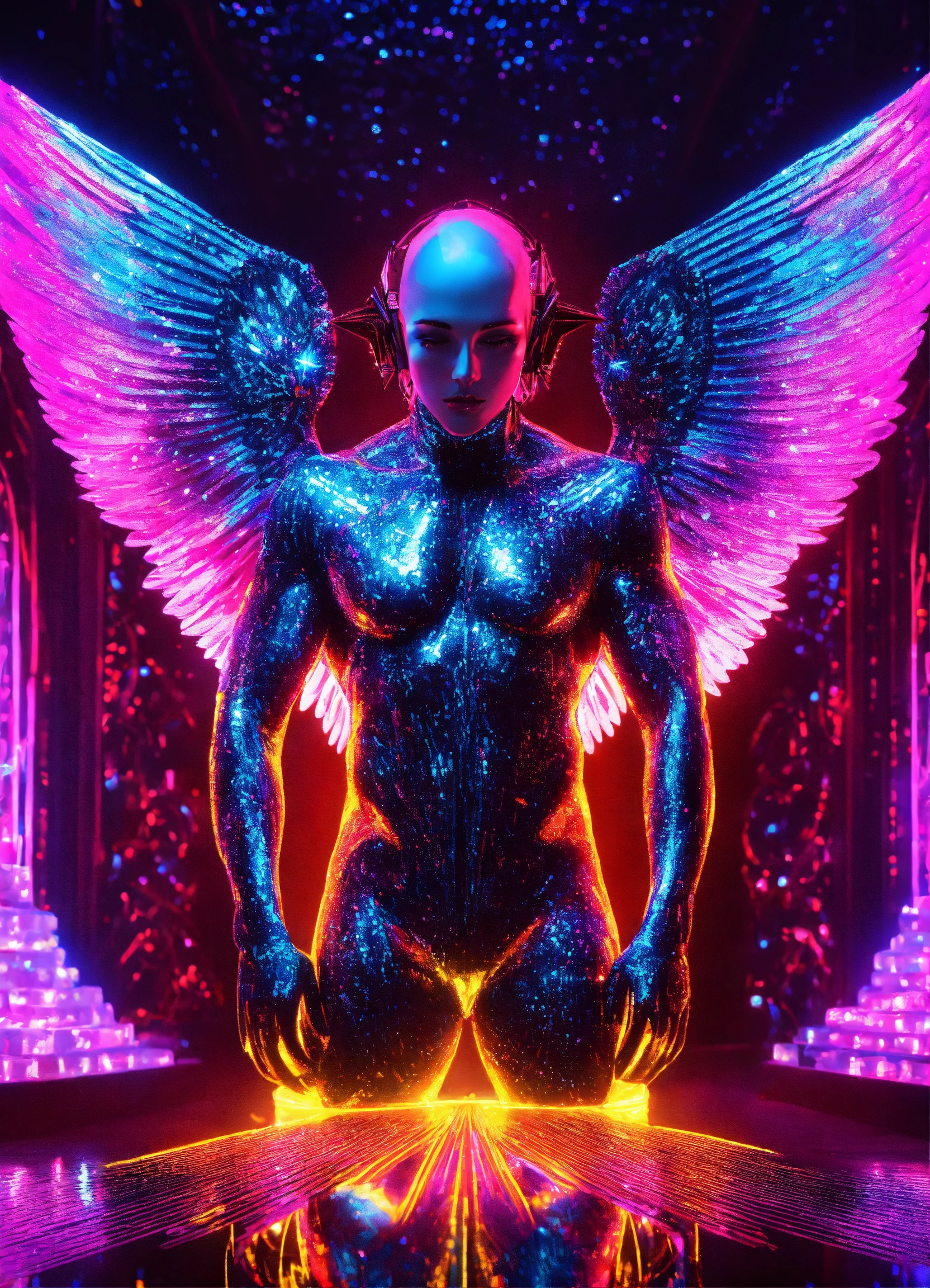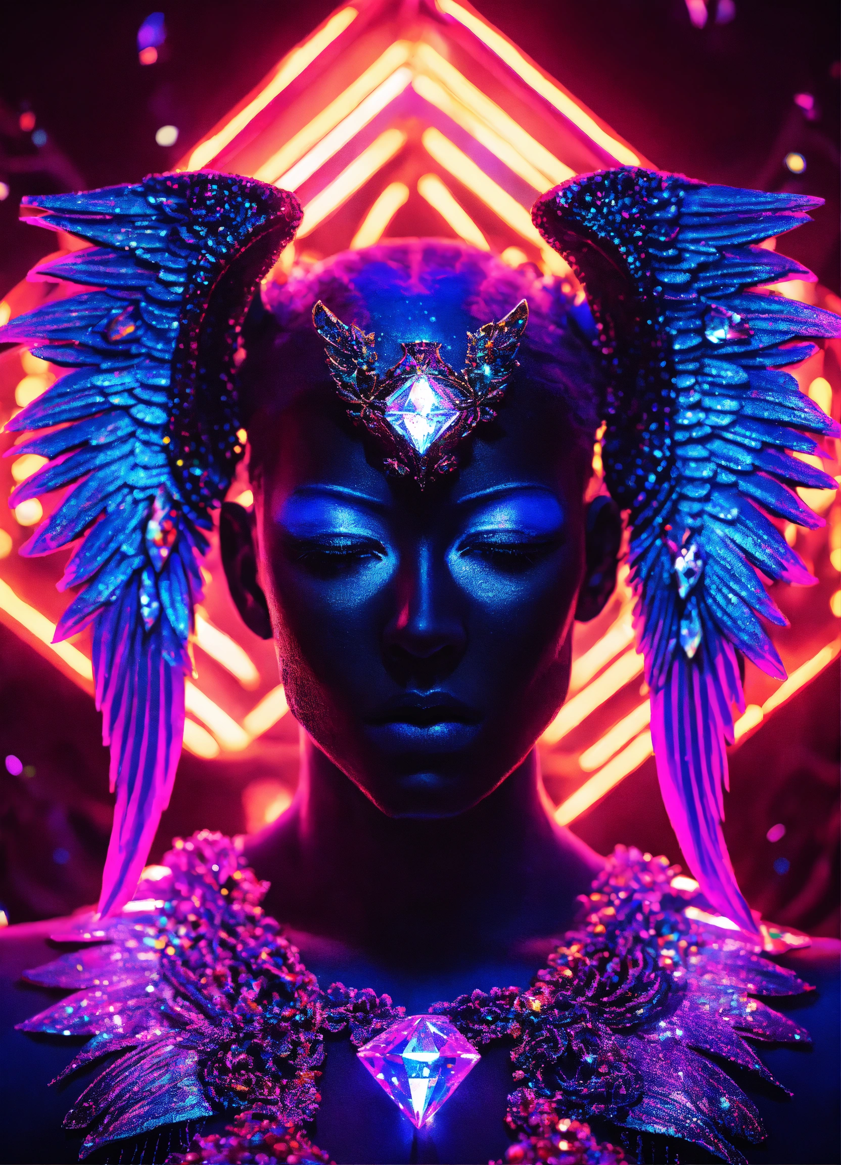 Perfect focus ultra realistic pinhead with diamond angel wings in a diamond neon black light dmt demon glitter room