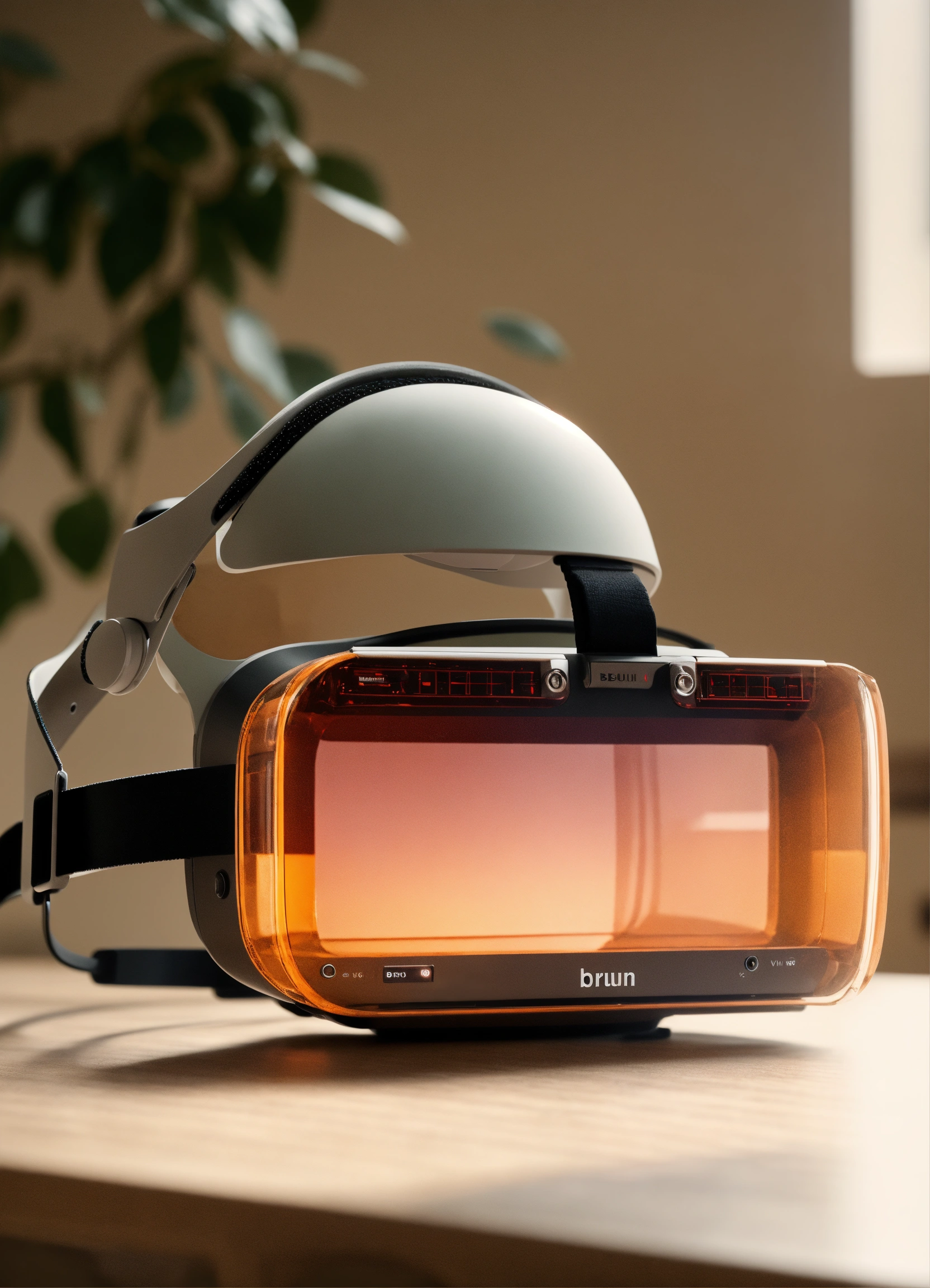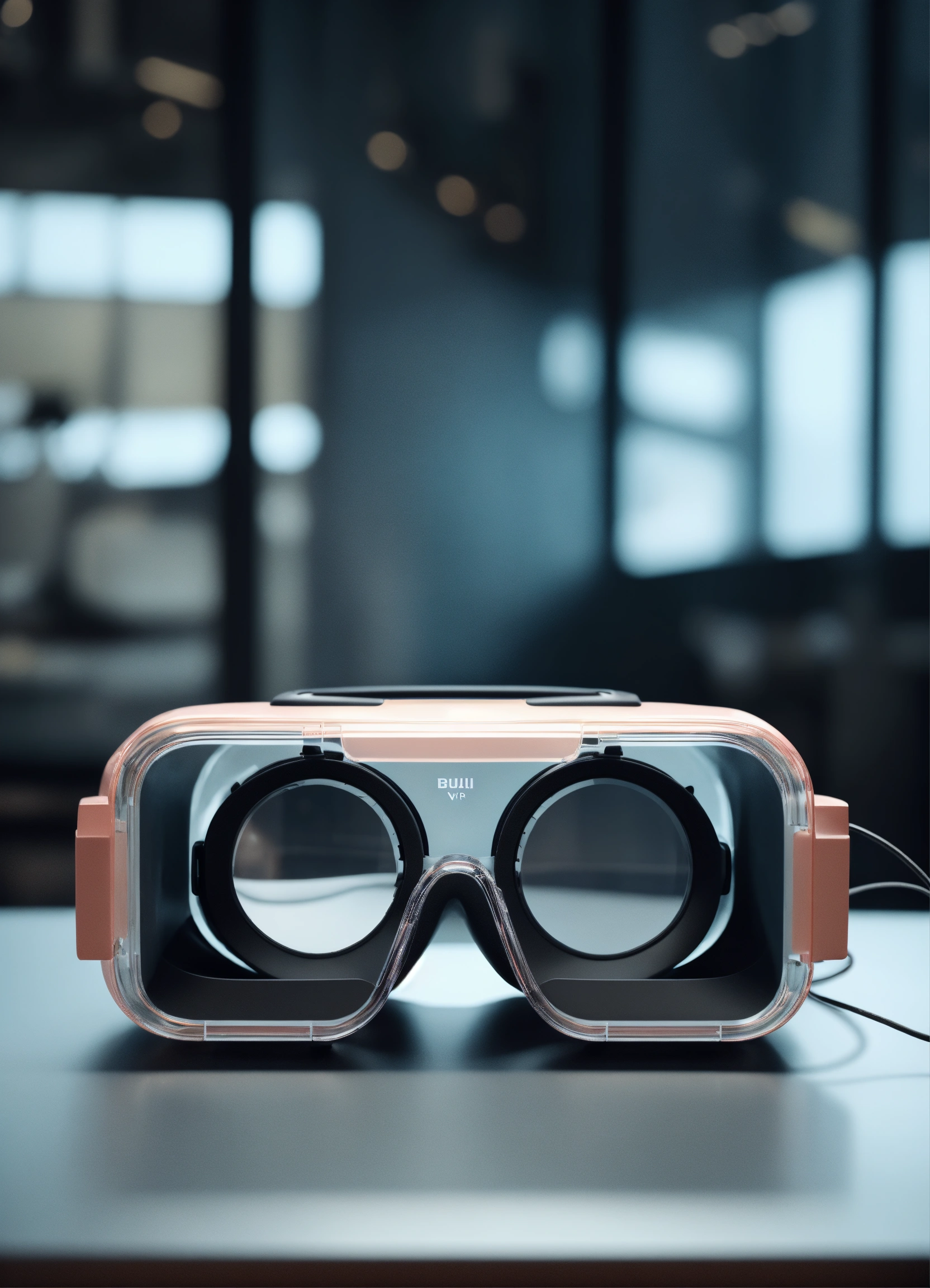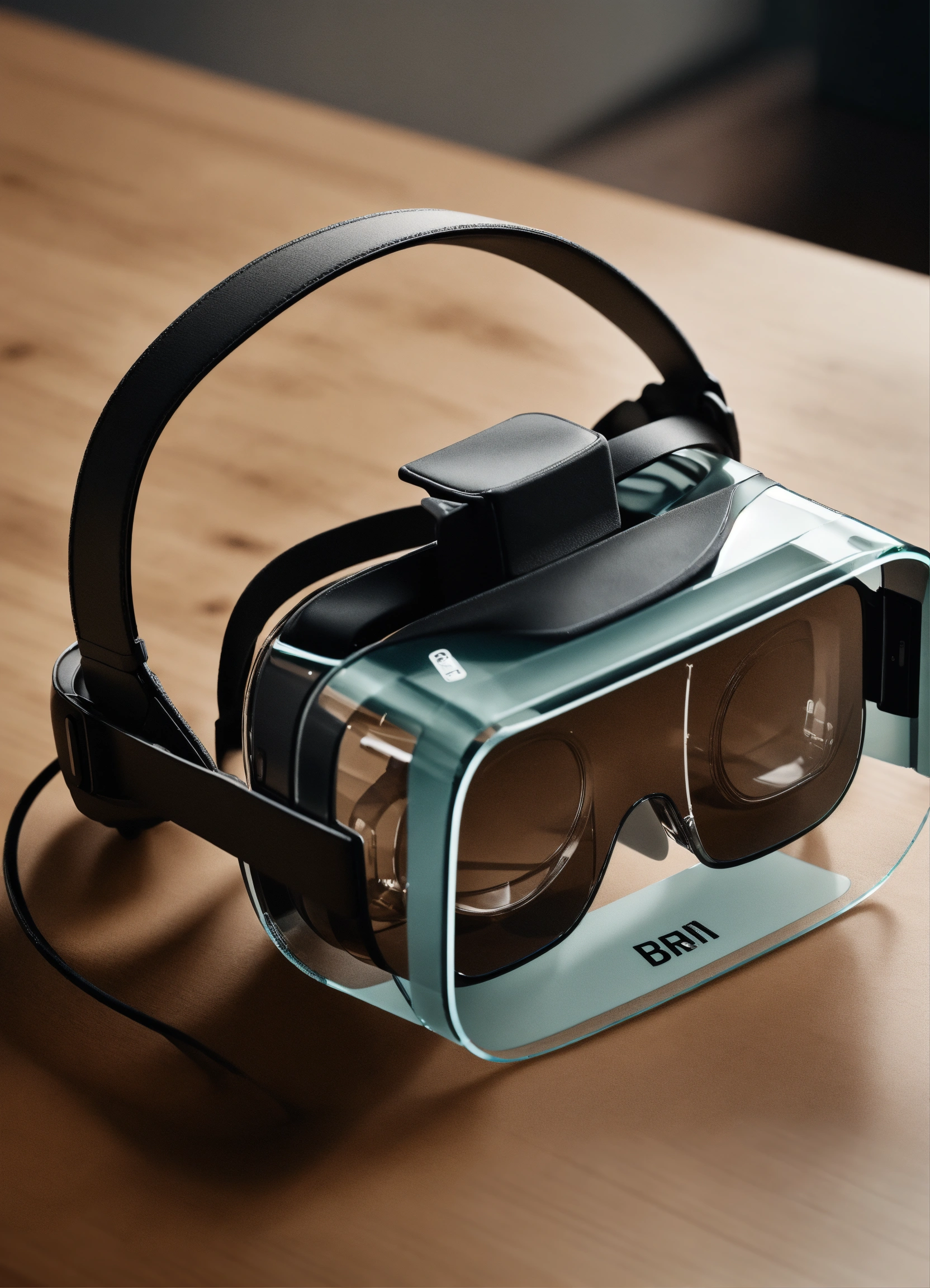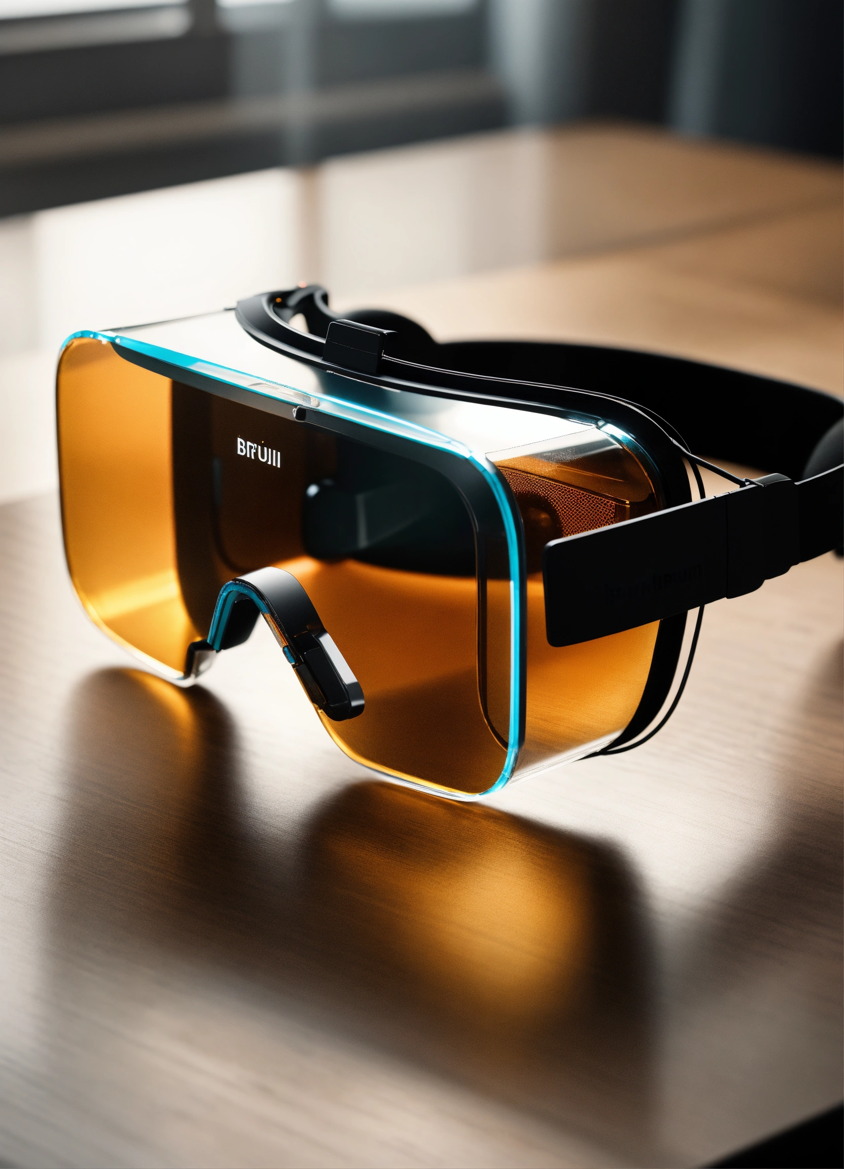 Medium close-up, a stunning, minimalist, thin, translucent glass vr headset designed by braun, dieter rams. product ad retro. industrial design inspiration. unreal engine render, natural lighting, on desk, beautiful shot, extremely detailed, realistic photo, 4k realistic photo