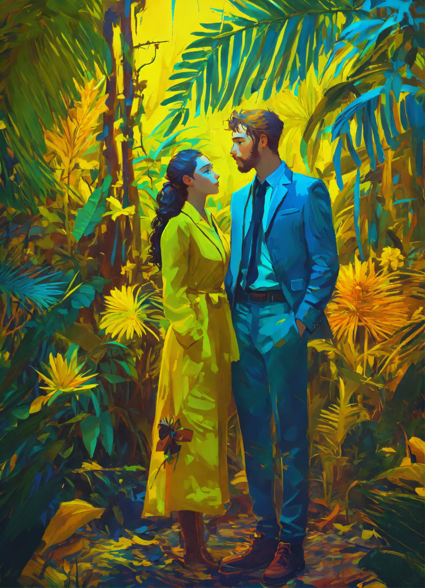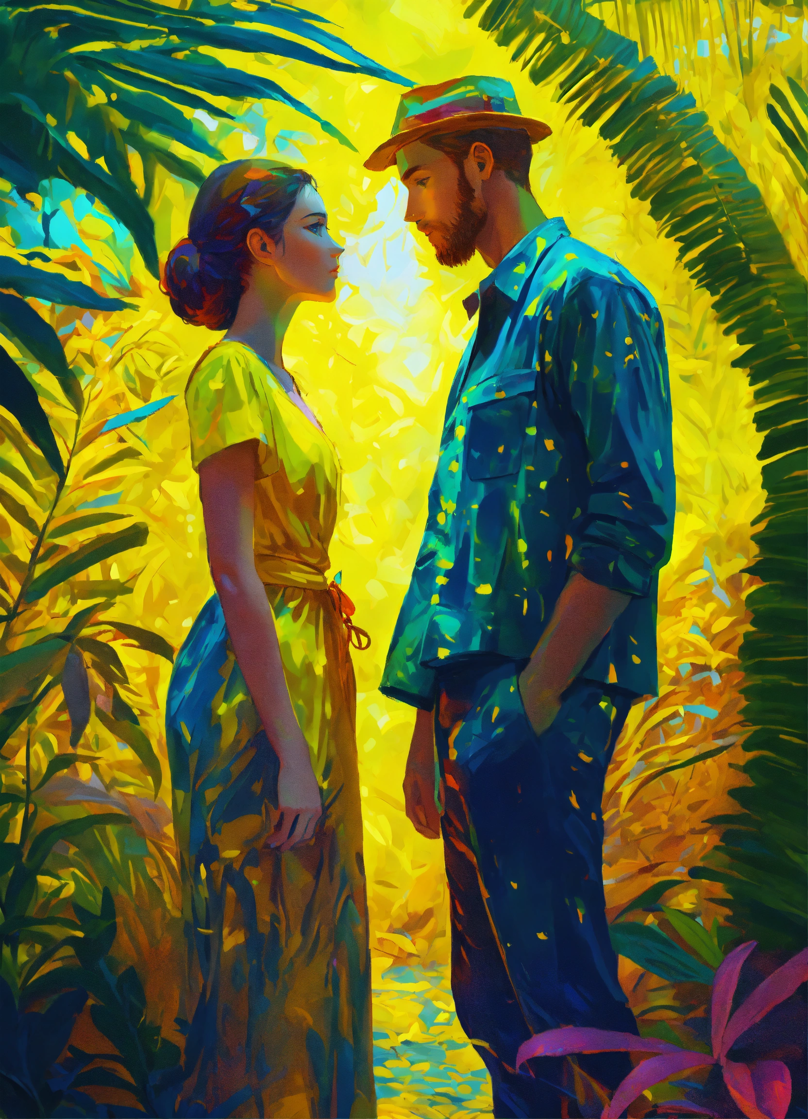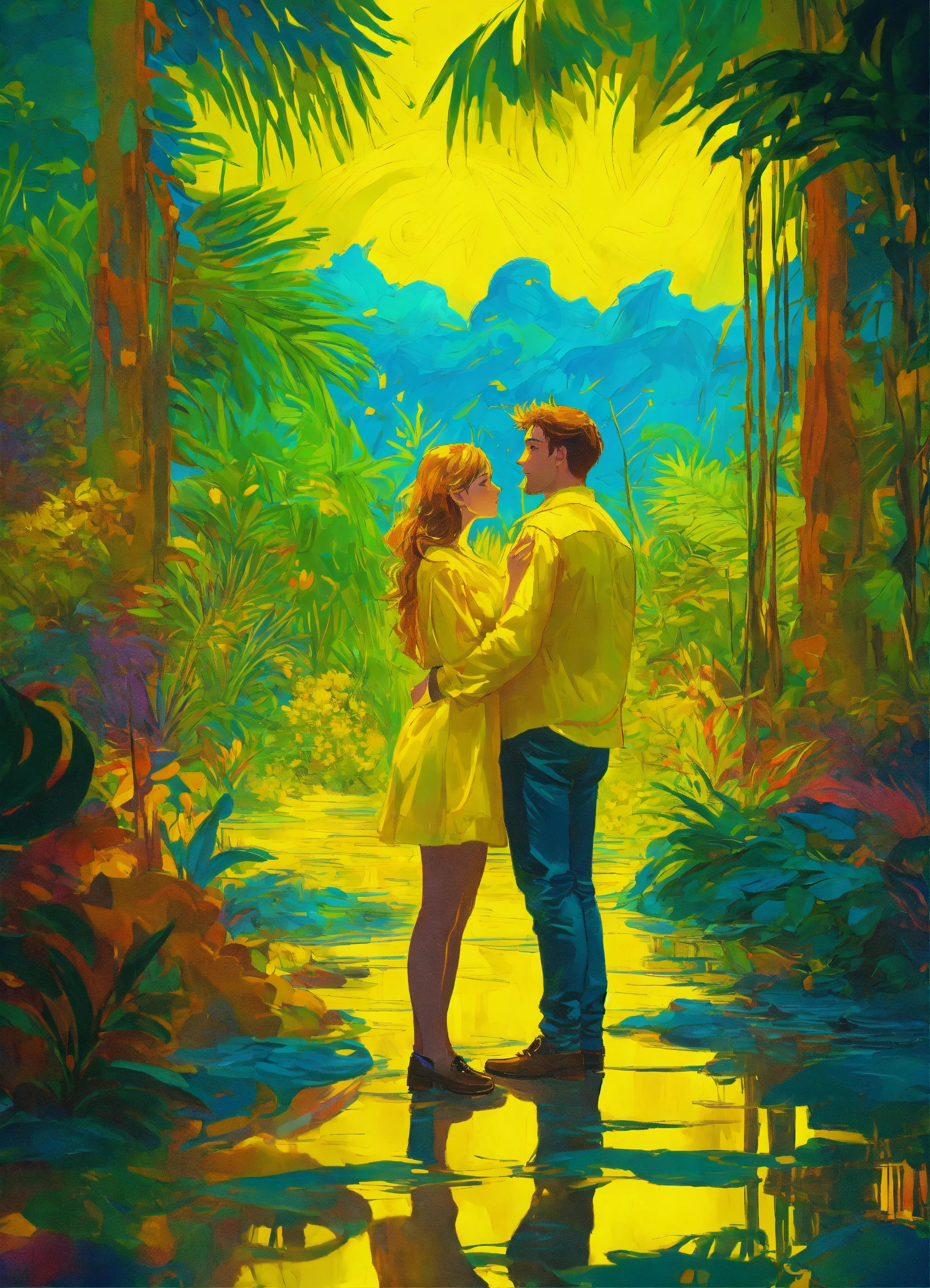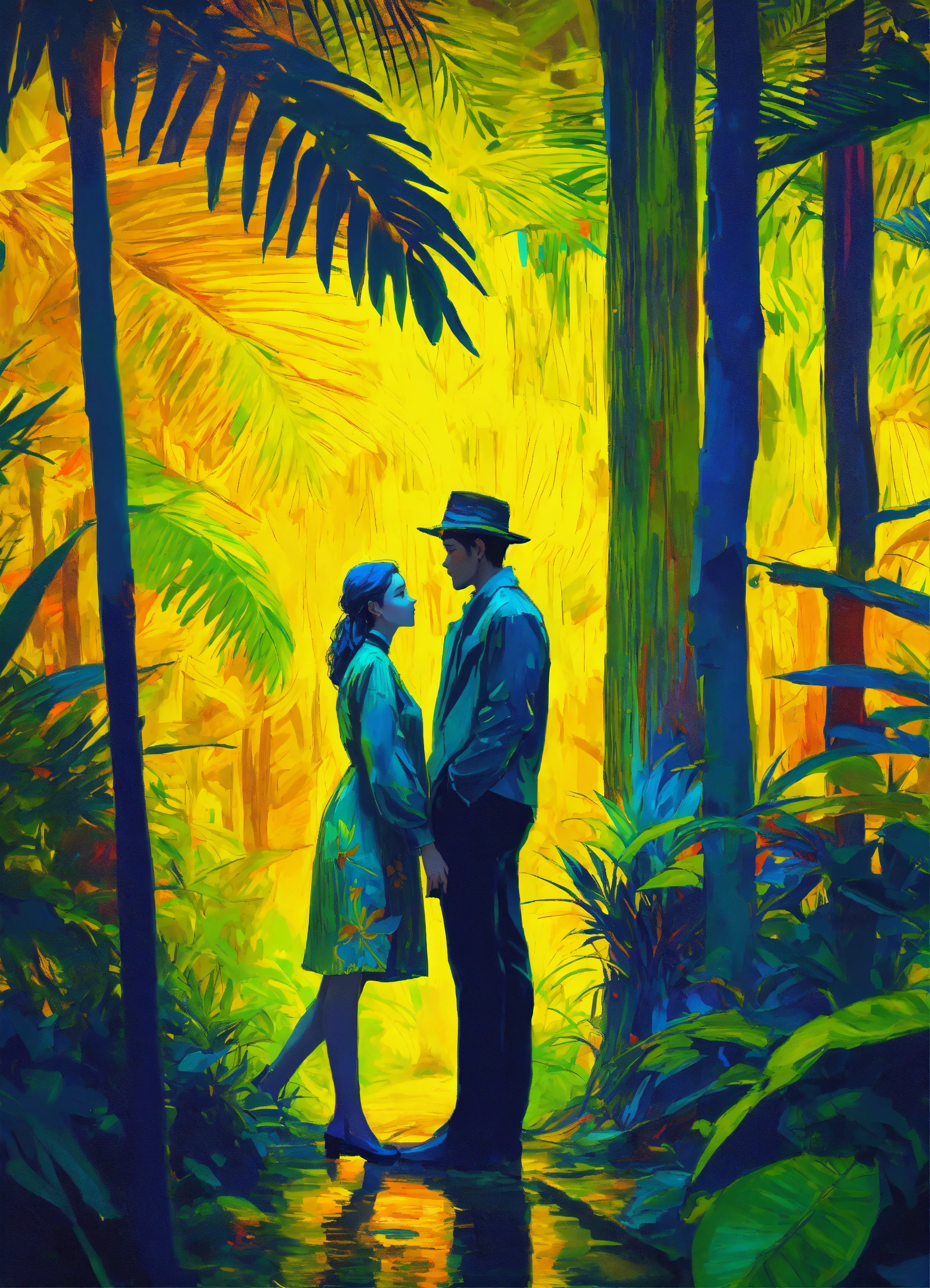 Van gogh style art a young couple standing full size in the tropical jungle and look to each other around them are many yellow starts, love and passion surrealistic futuristic digital art fantasy neon colors