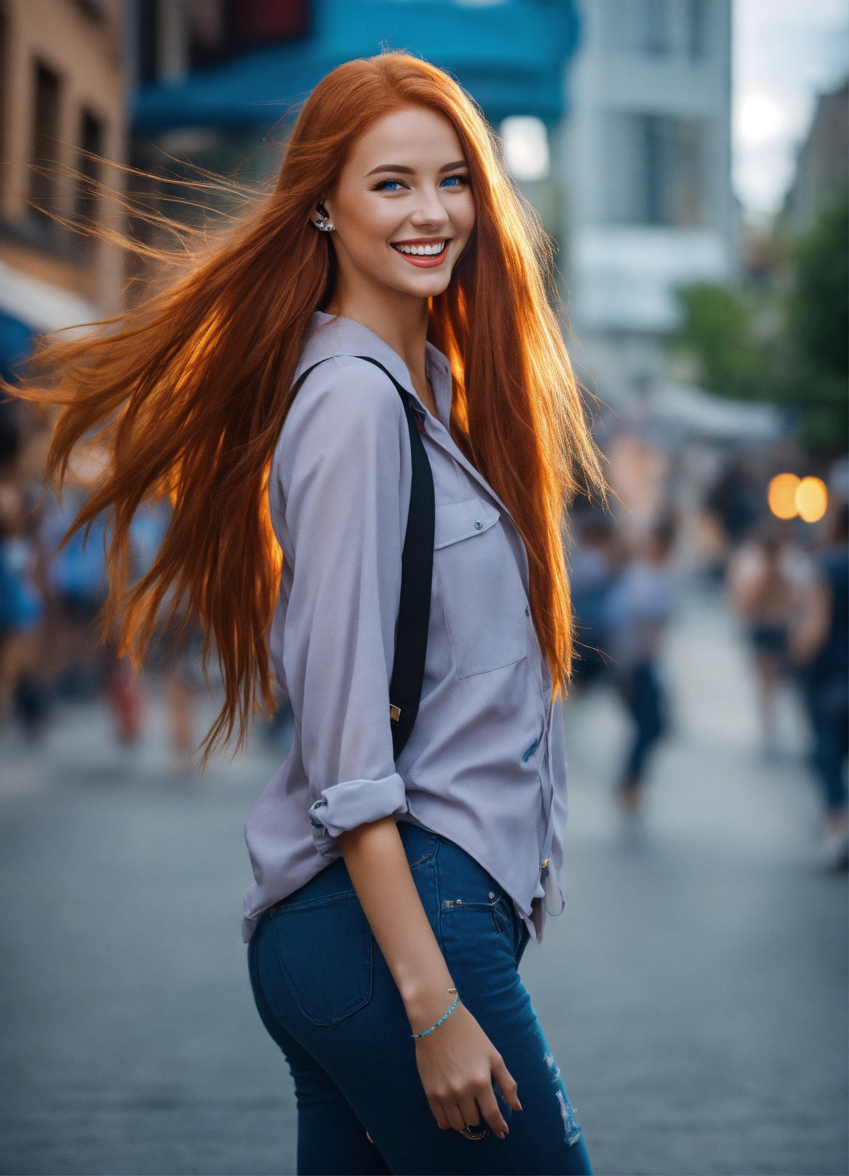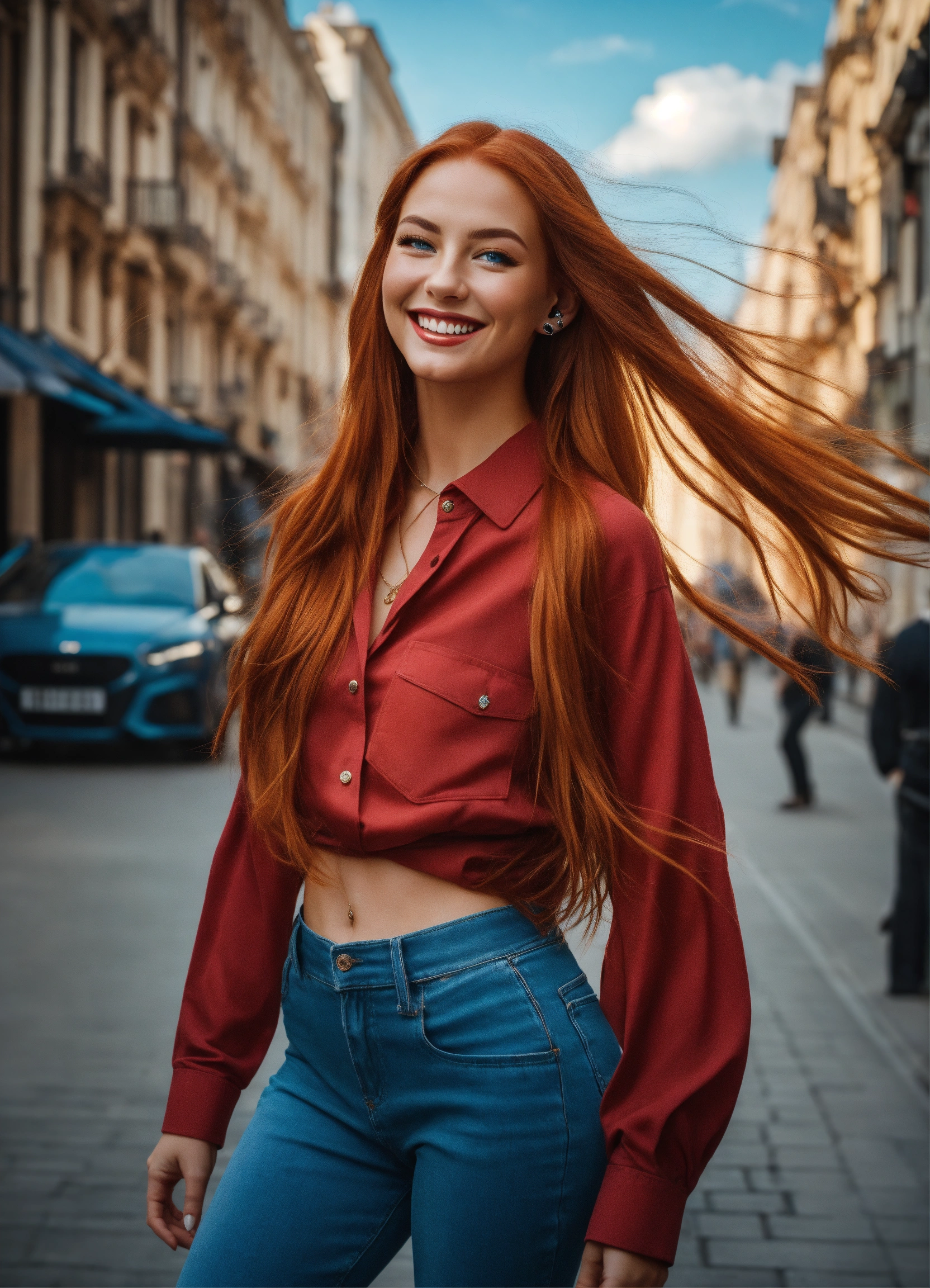 Hyper realist, beautiful young woman, long straight red hair, blue eyes, using in ear monitors, dancing in the street, full body, smiling at the camera, ultra modern outfit