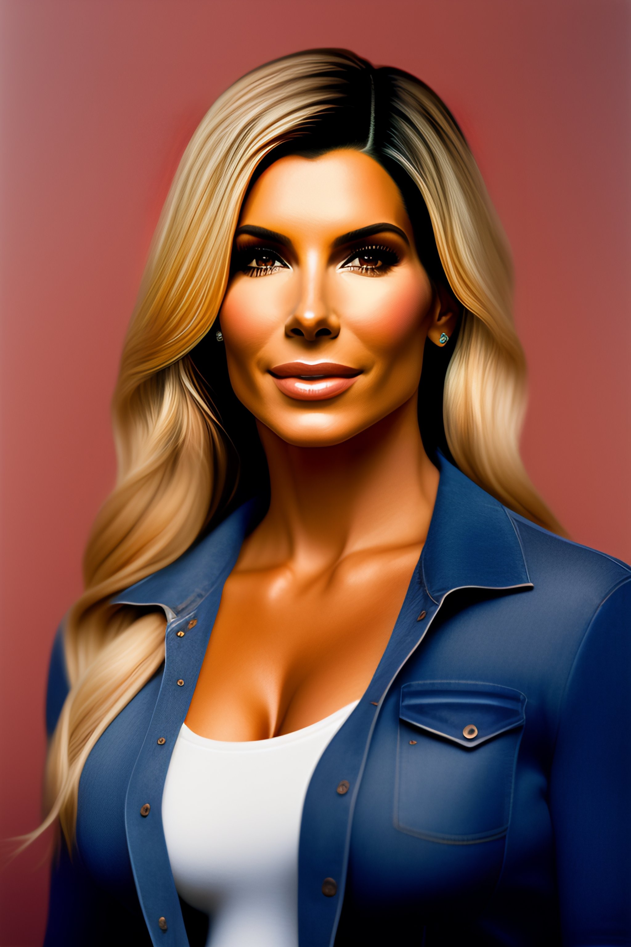 Kim kardashian perfect hourglass body, sandra bullock pretty face, blond wearing shirt and jeans, portra 400 medium format, plain background, futurstic concept art