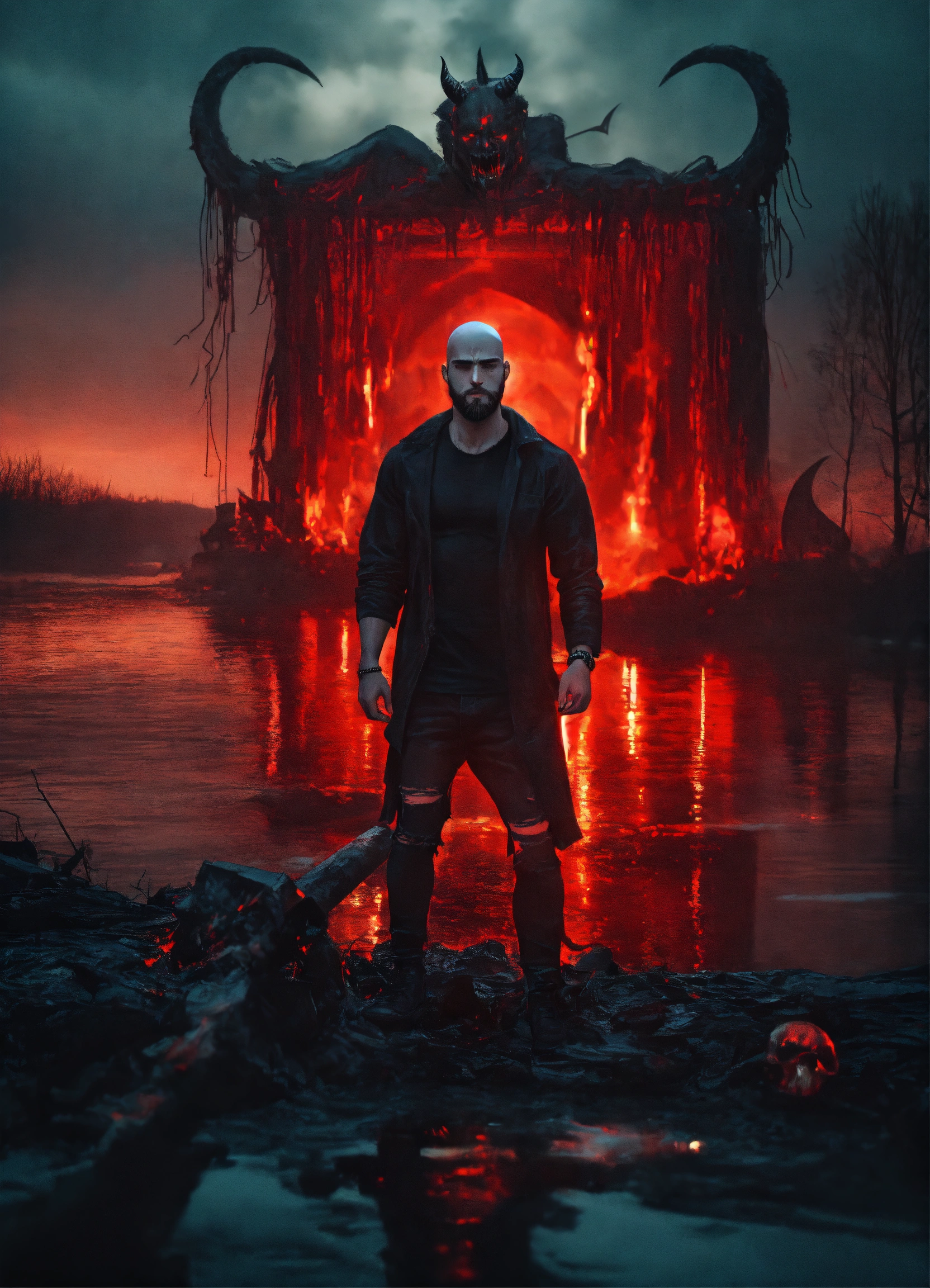 A young bald man with beard dressed as satan with horns 8k modern day 2023 clothing blank t shirt and ripped jeans a nightmarish scene in the depths of hell, where satan presides over a lake, surrounded by demonic creatures