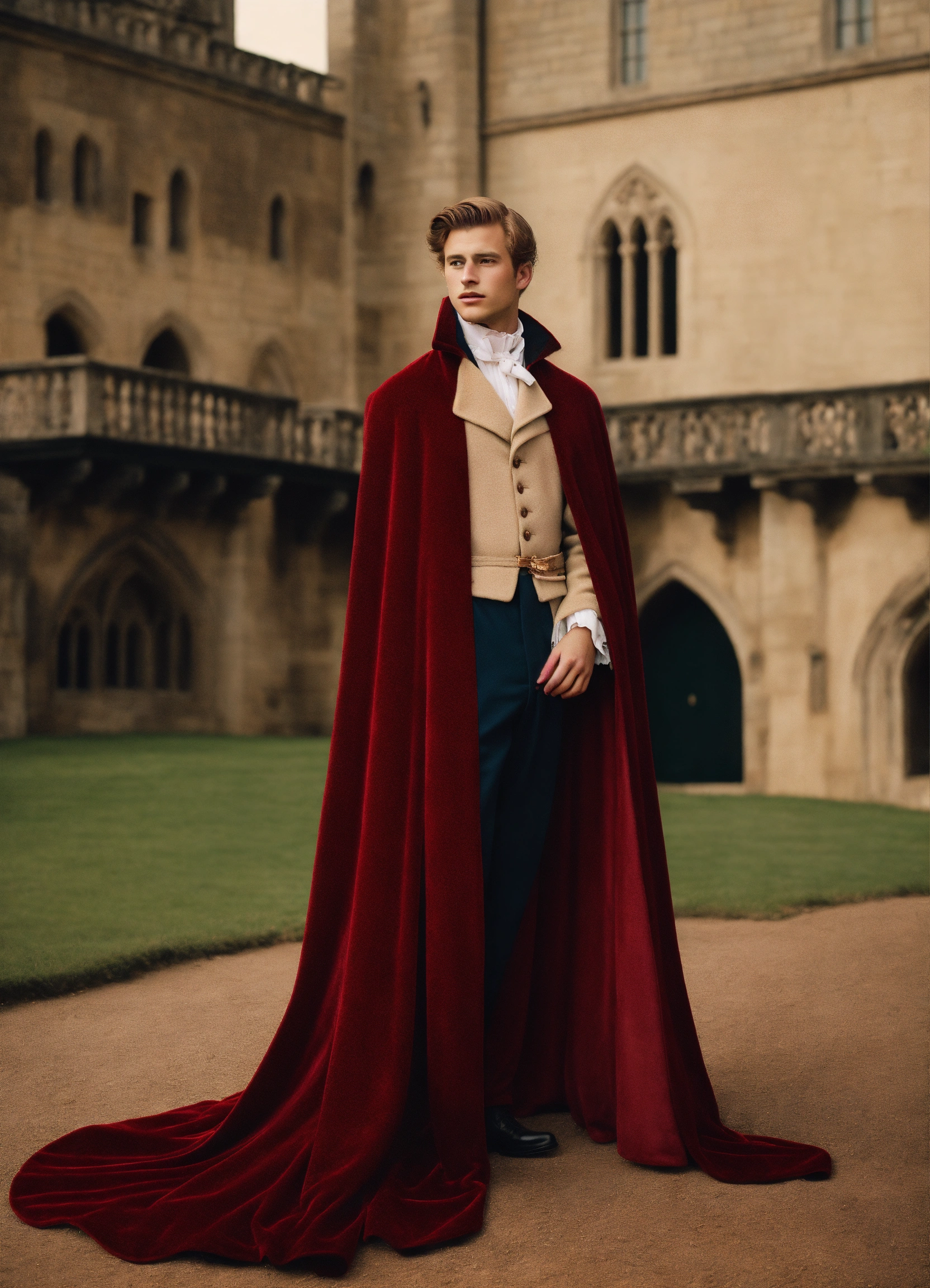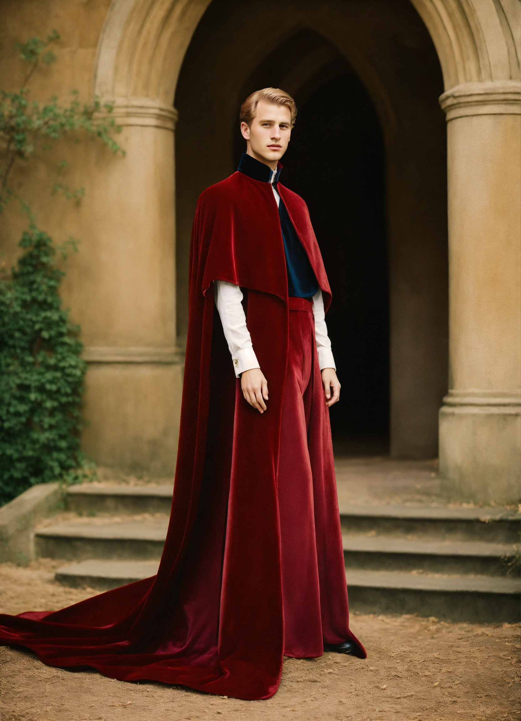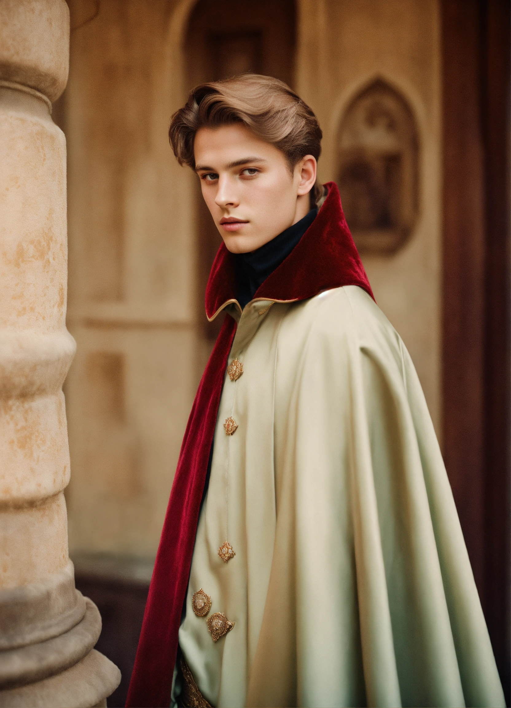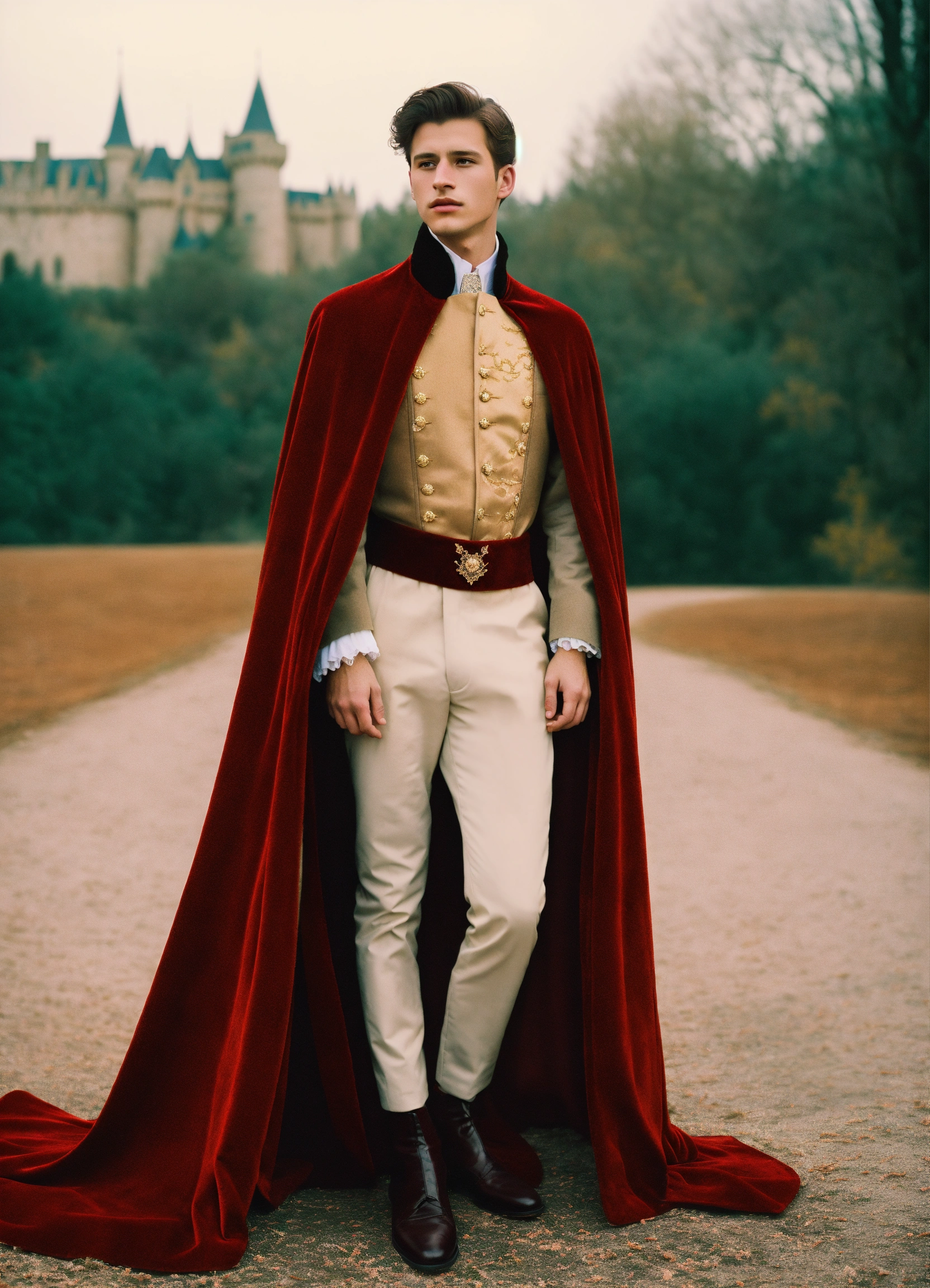 Fashion editorial. castle edition, analog fashion portrait. portra 400 high dpi scan. beautiful american young, twenty years old, as disney prince philip sepia pastel colors, long dark red velvet cape