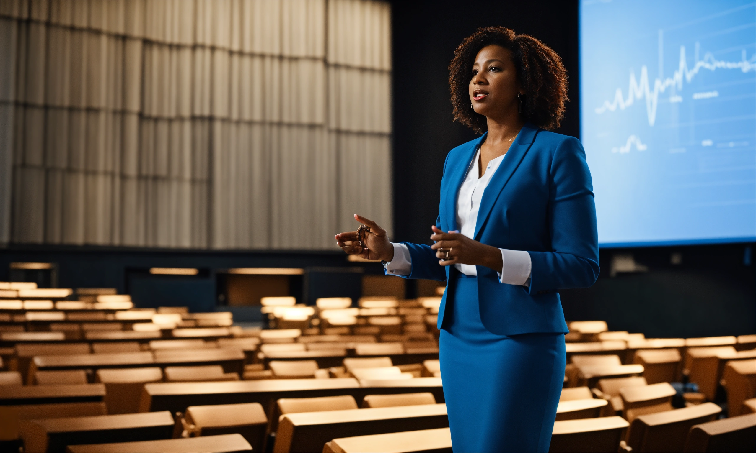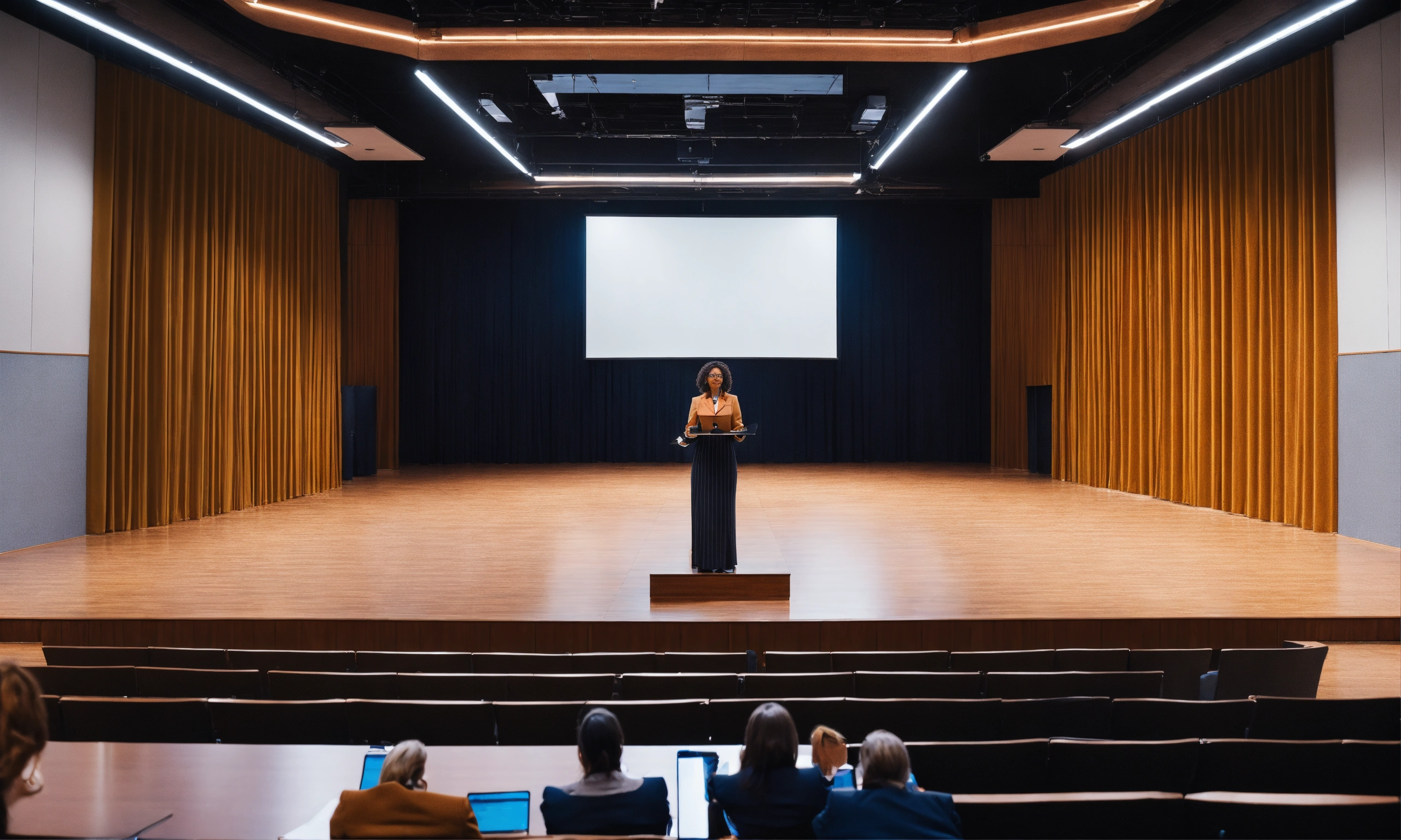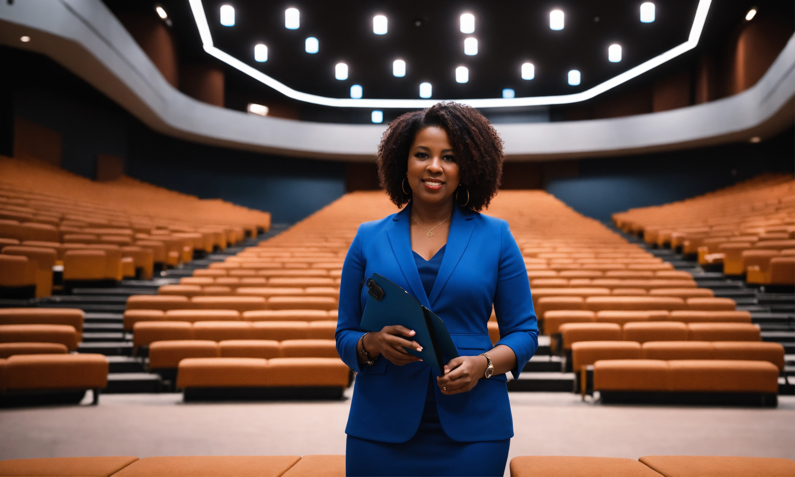 A stylish professional 4k photo of an female executive school principal of color presenting in front of filled an ultra modern auditorium