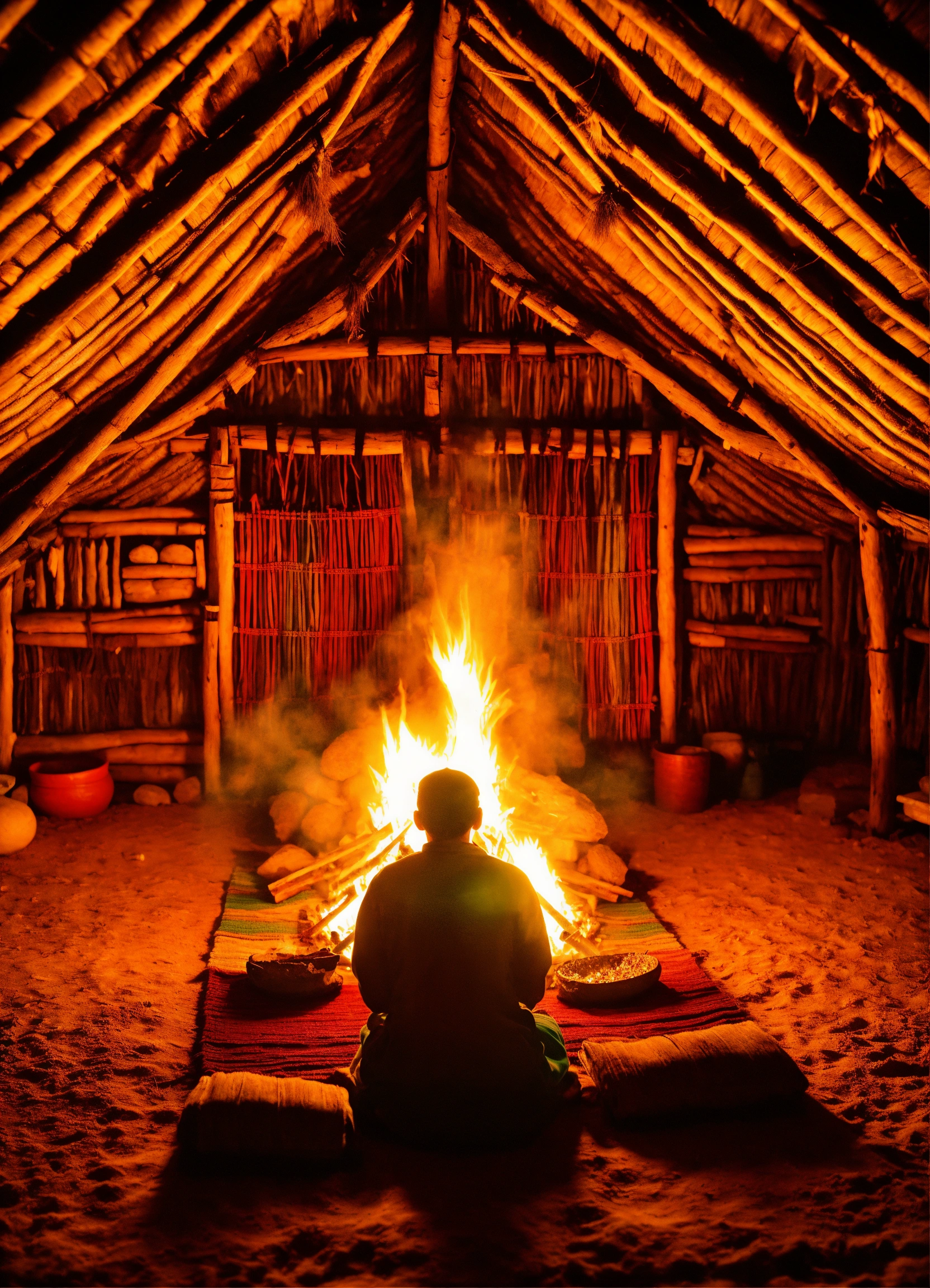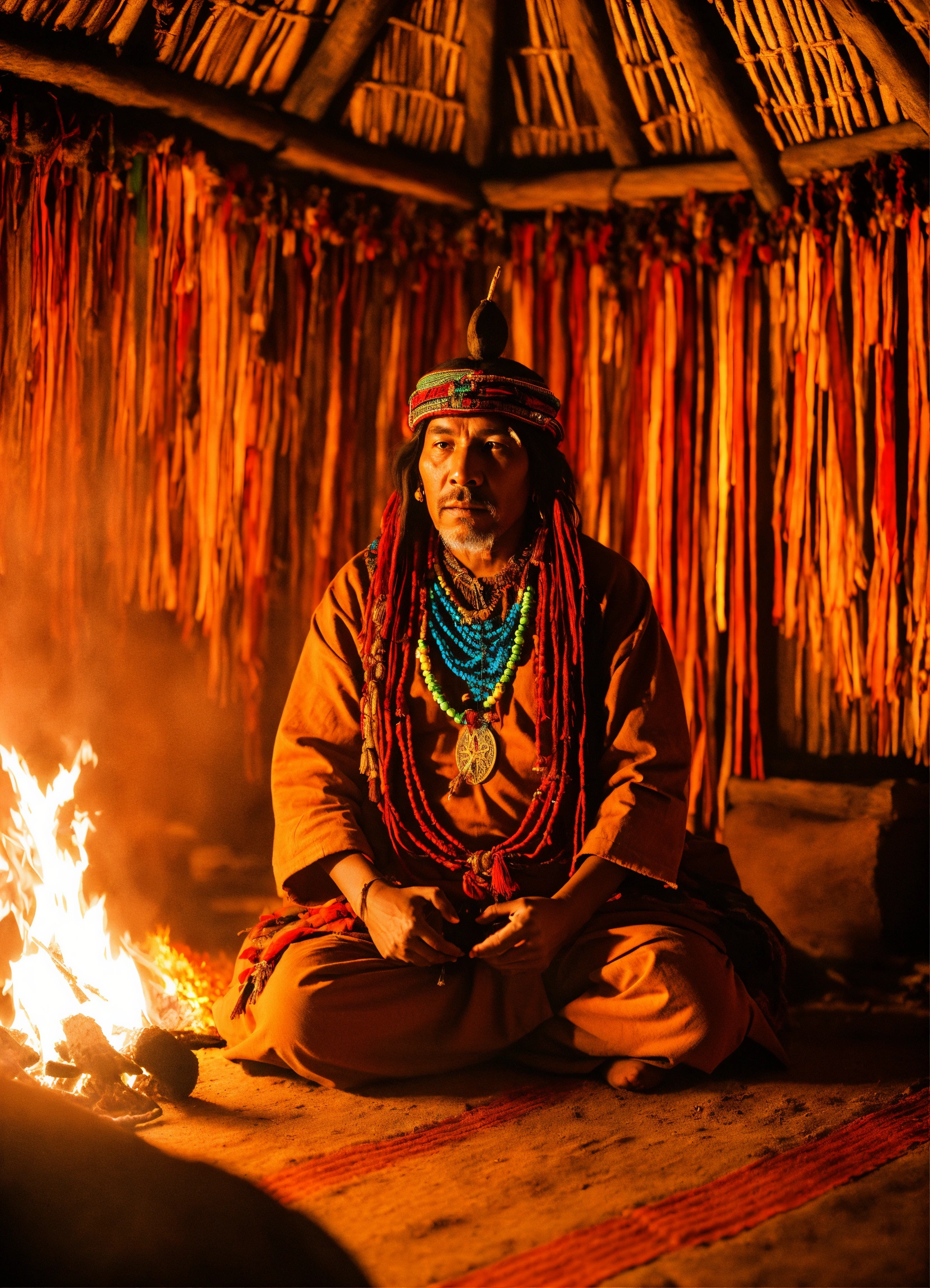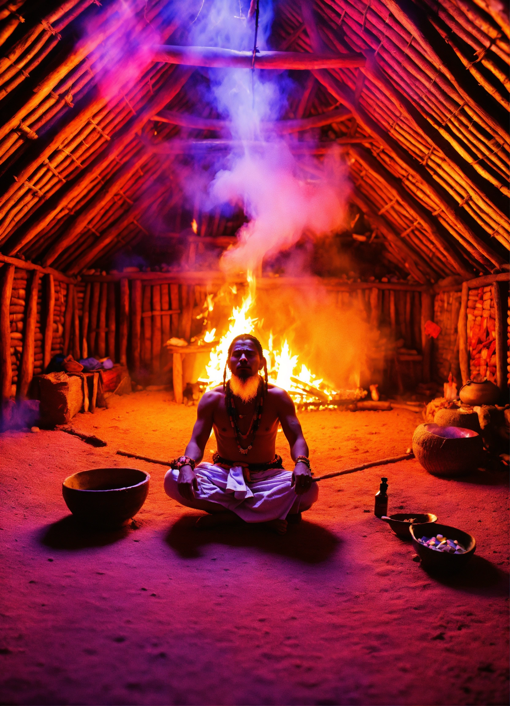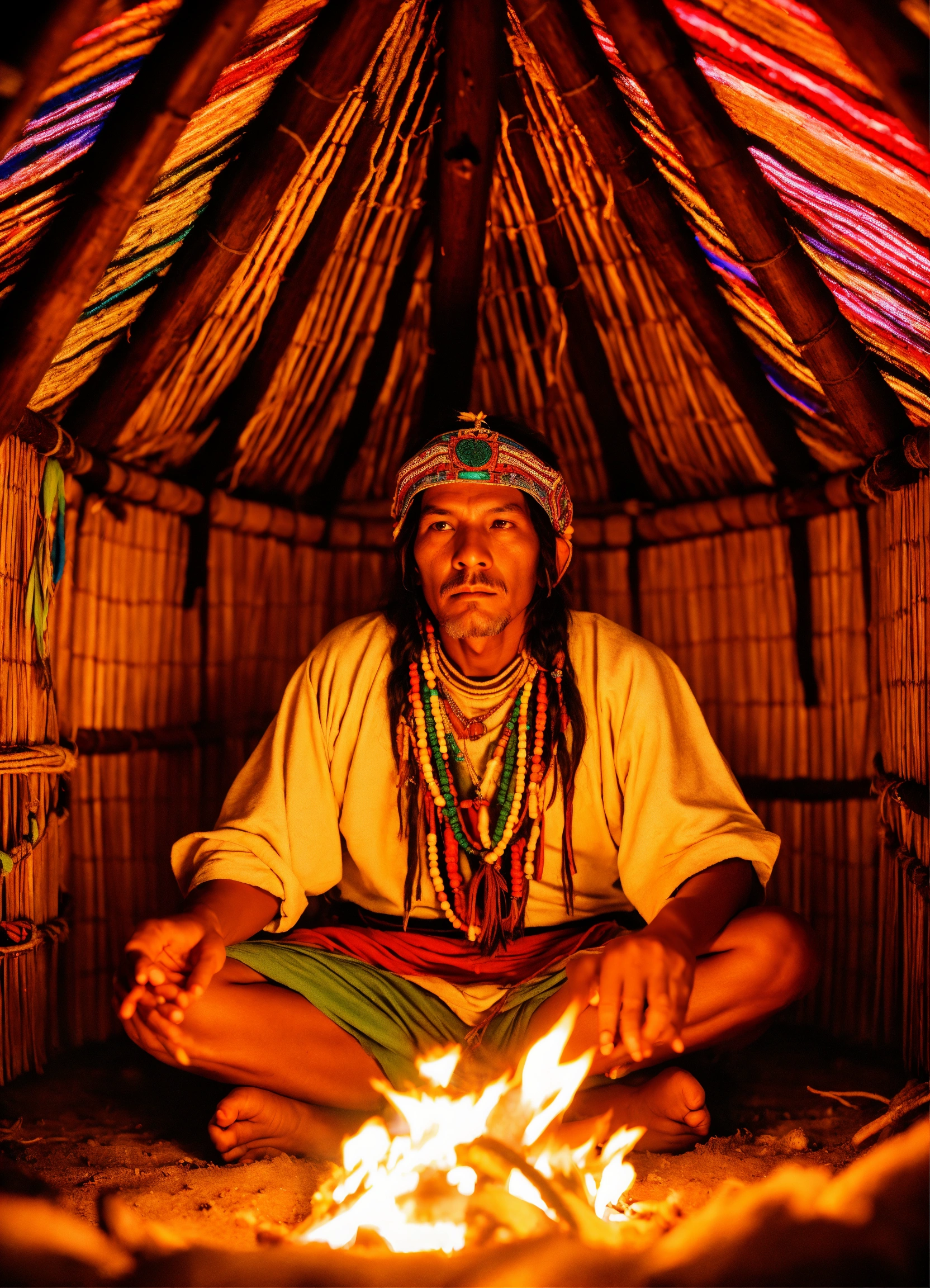 Peruvian shaman sitting cross-legged in shamanic trance illusion ayahuasca visions in his hut aura multi-color front of fire aura
