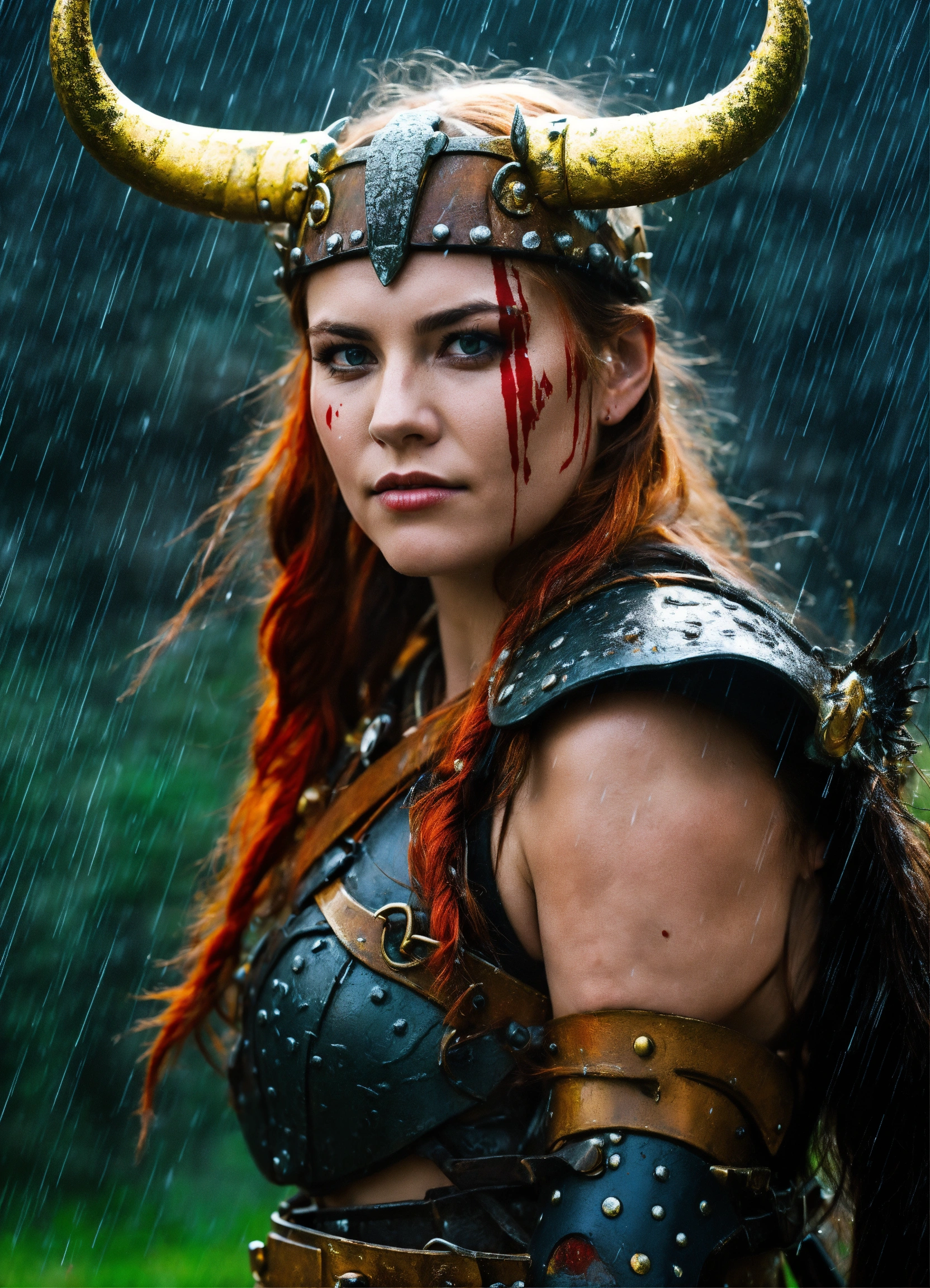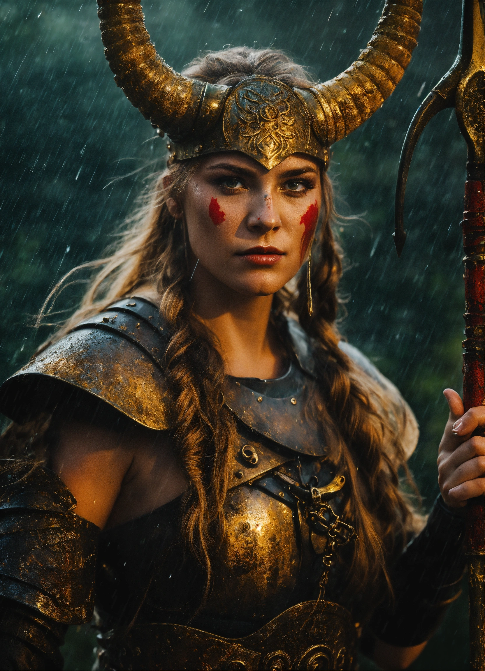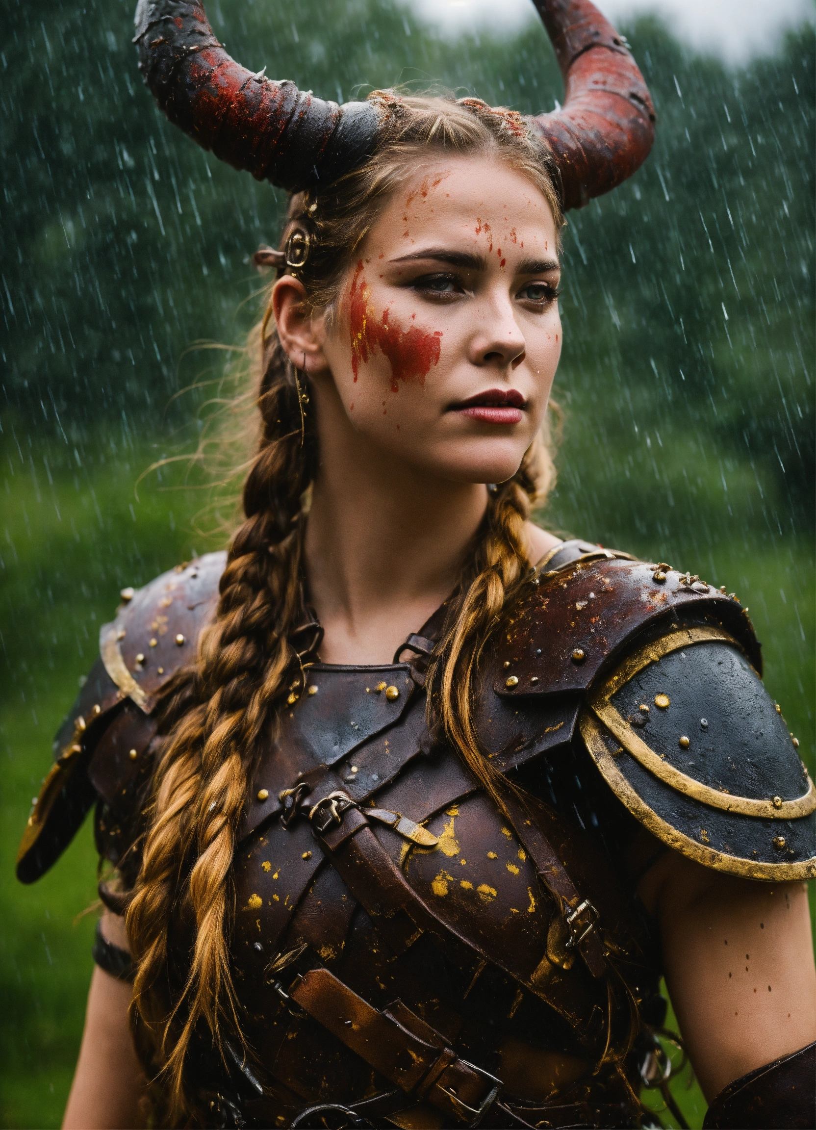 Horned shieldmaiden in rain with warpaint