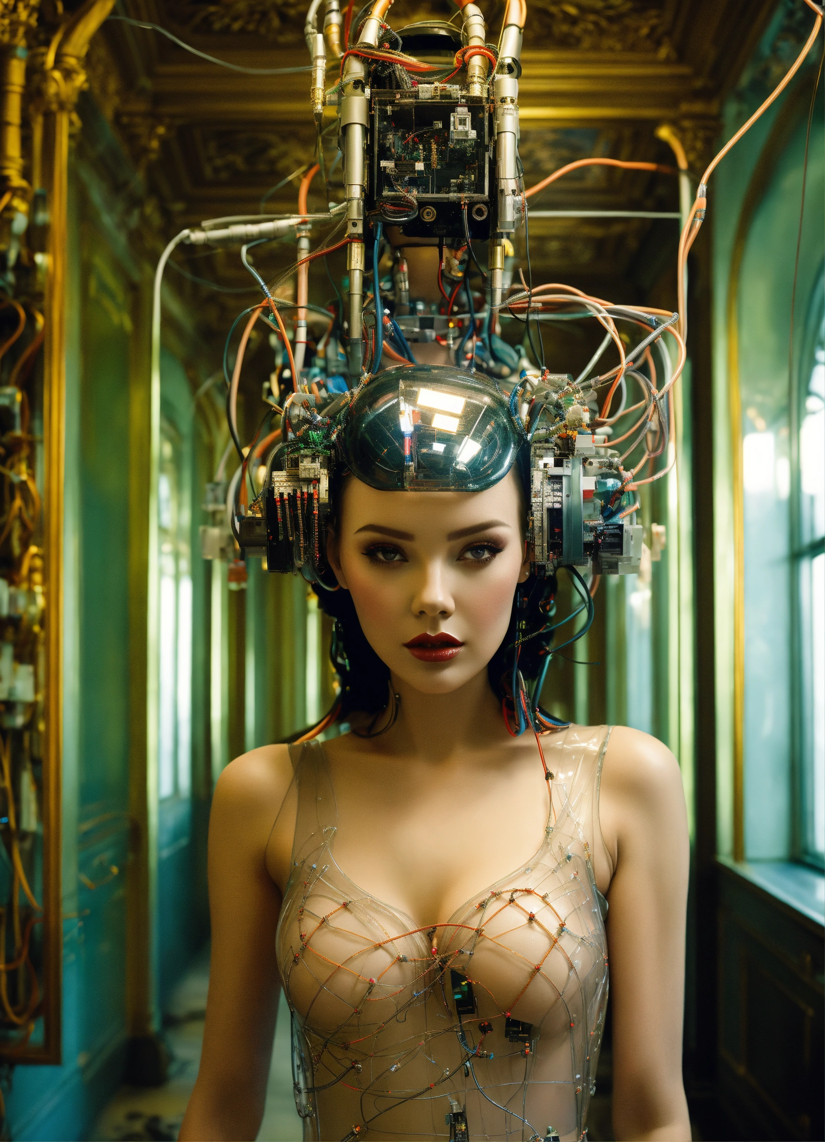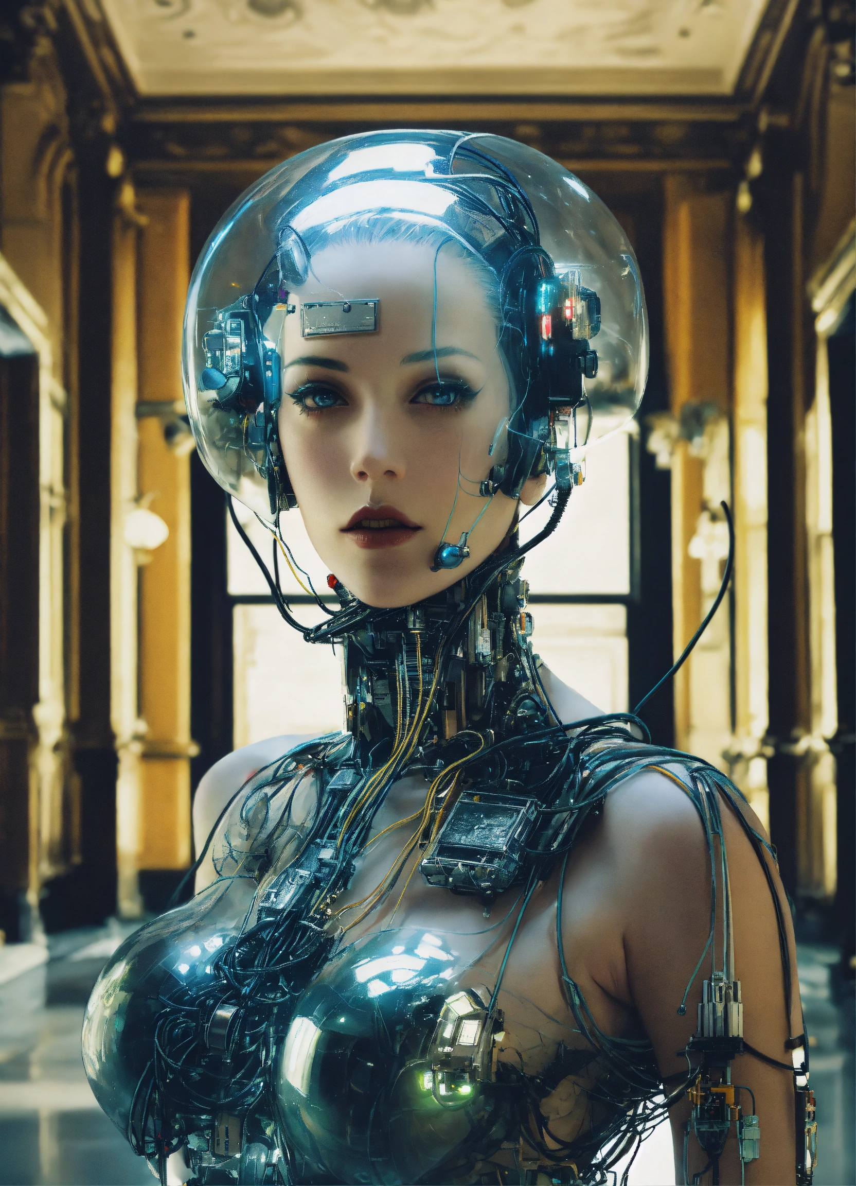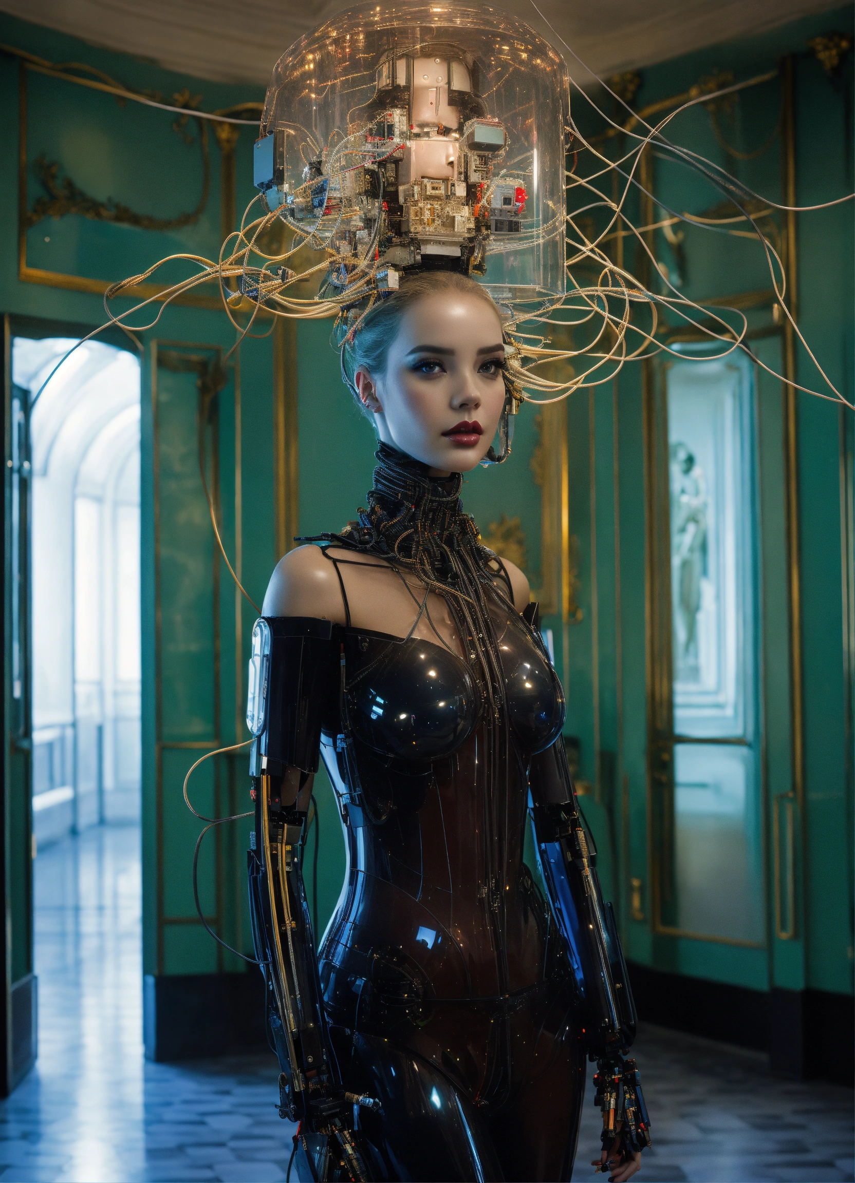 Half body photography, in front of a palace hotel corridor, a futuristic bombshell cyborg woman, full of cables and wires and led, an well shaped transparent dark plexiglass latex body plc robots with silver motor head, 80 degree view, art by sergio lopez, natalie shau, james jean and salvador dali