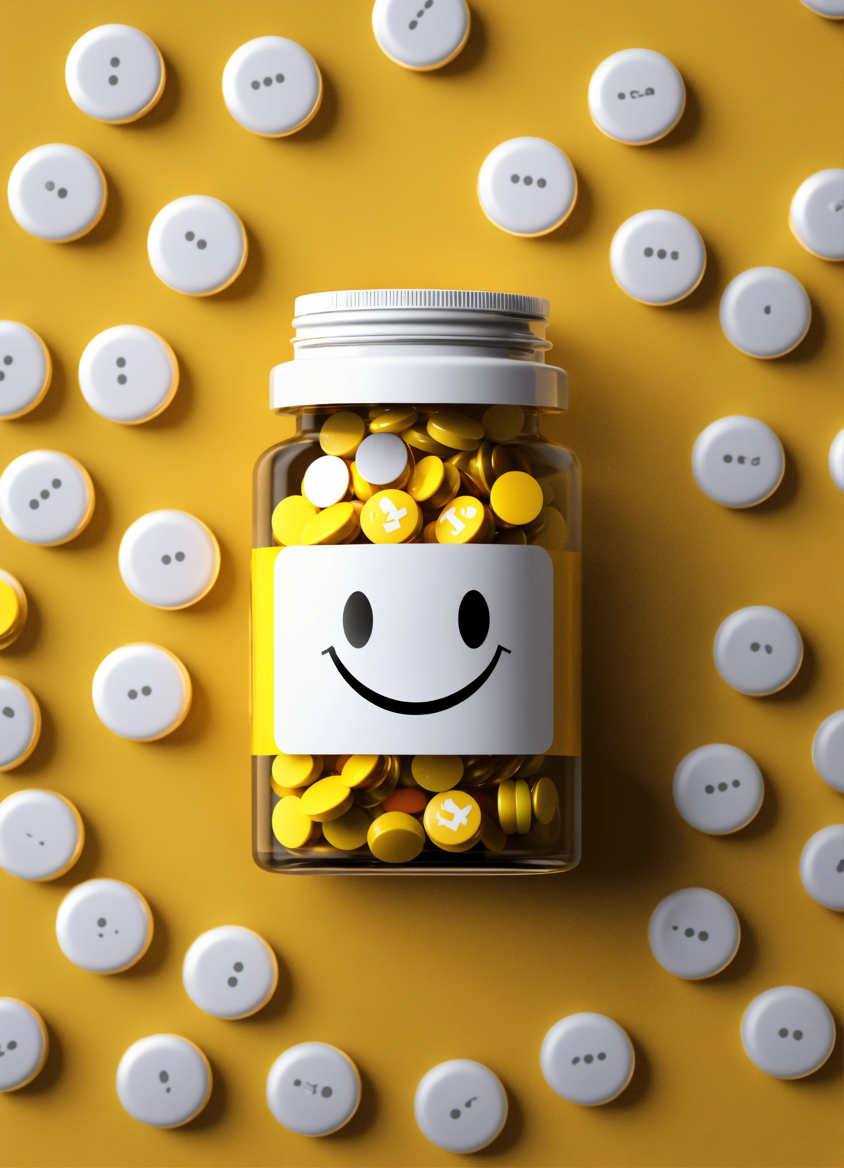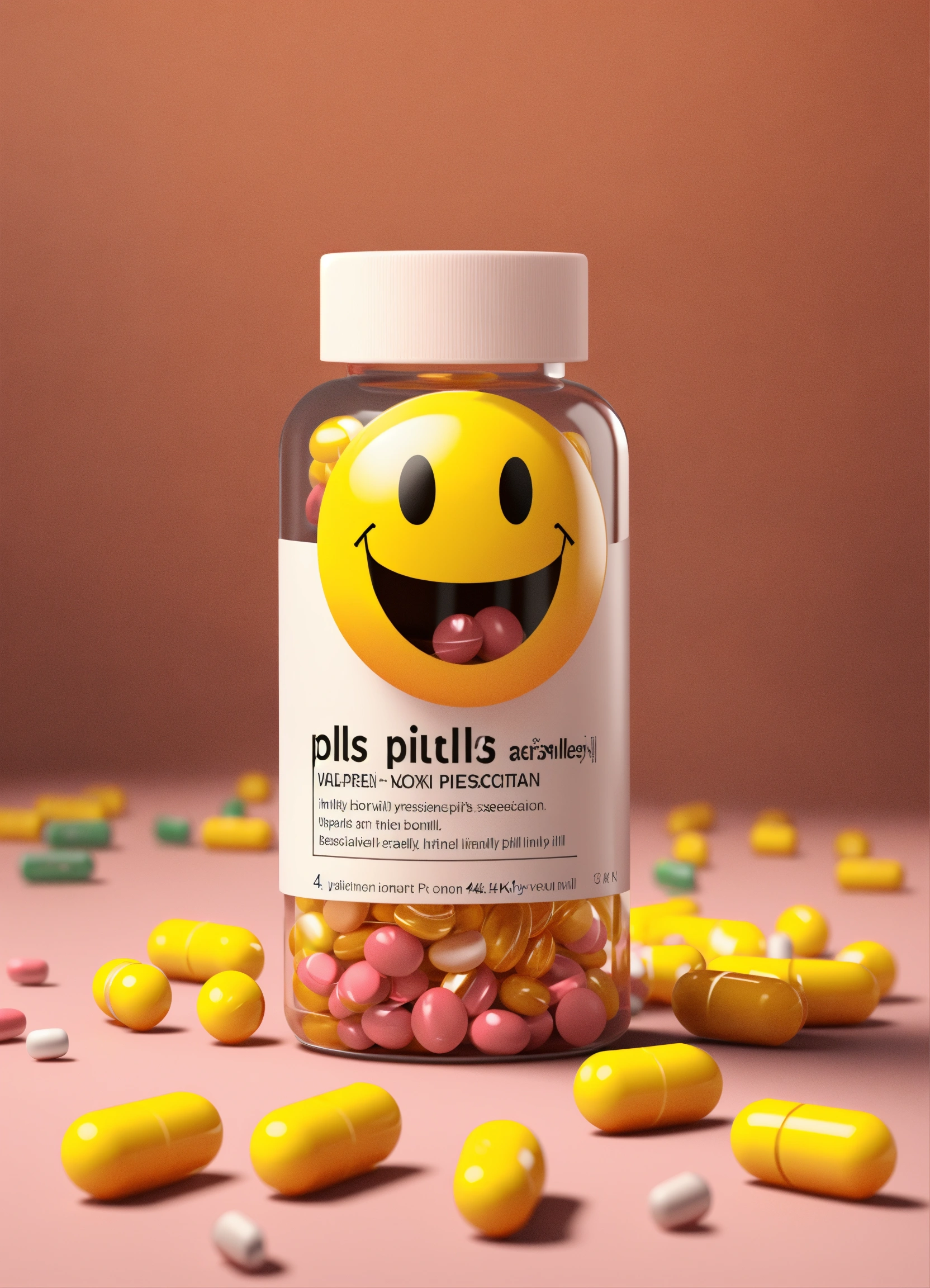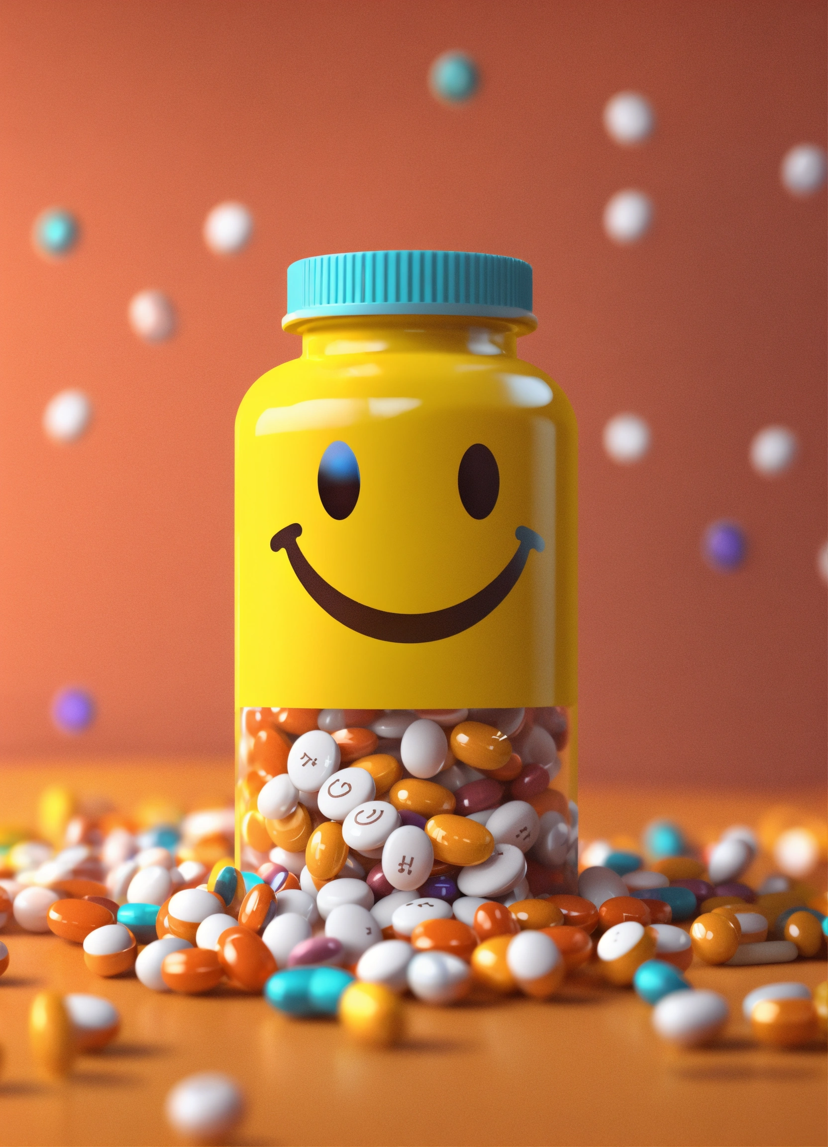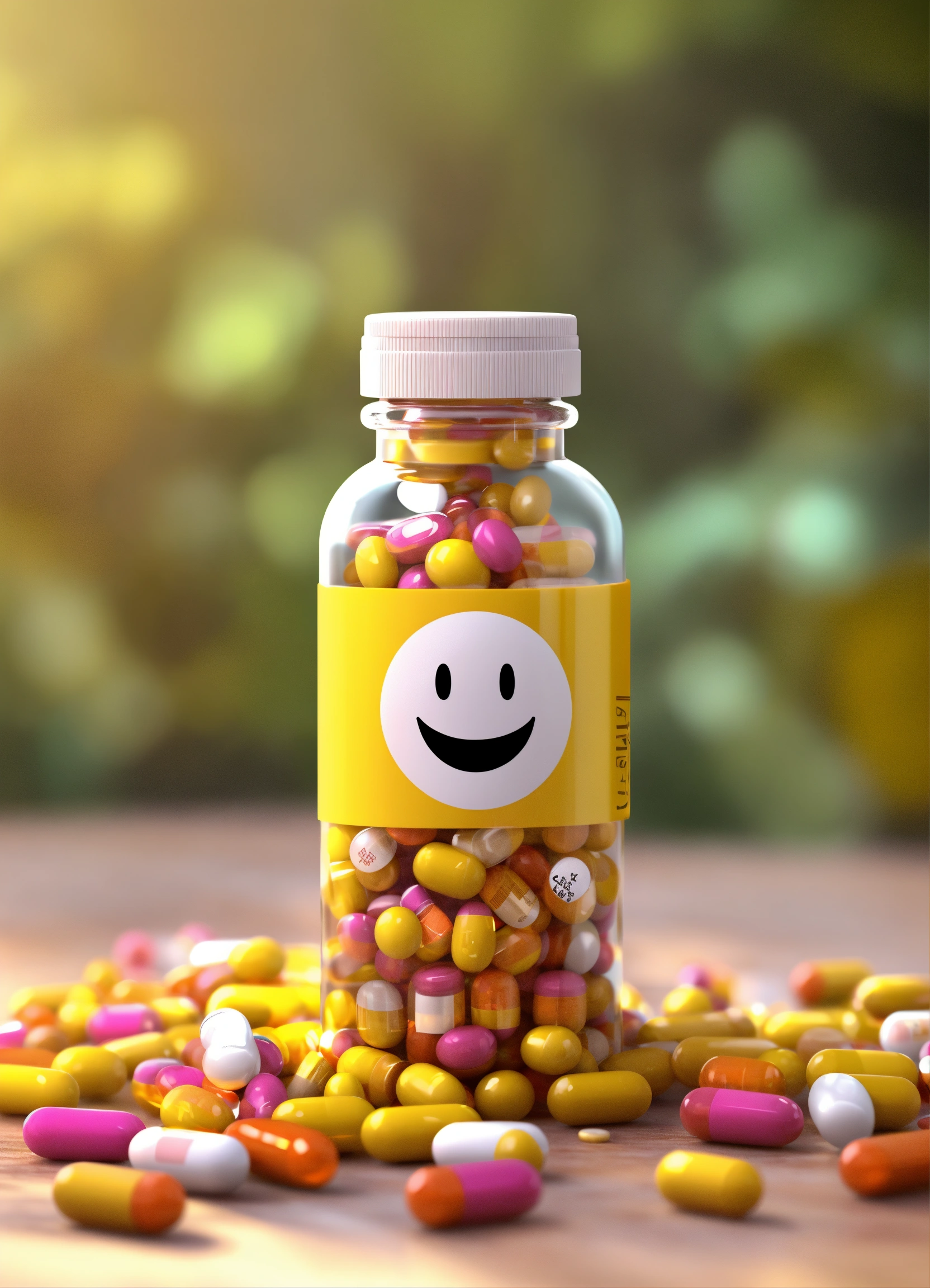 Tiny pills with smiley faces on pills, that are inside of a prescription pill bottle with label on the outside, 4k render, surreal, happiness pills