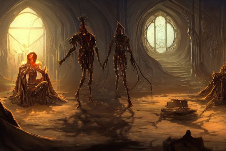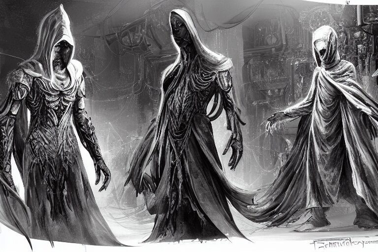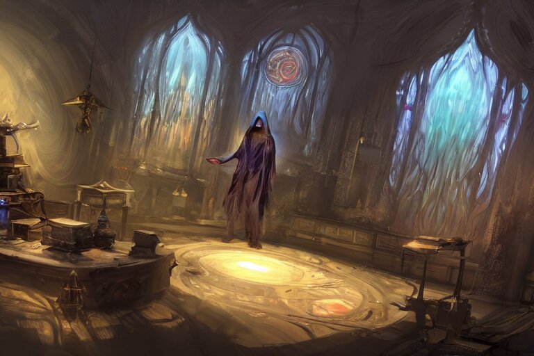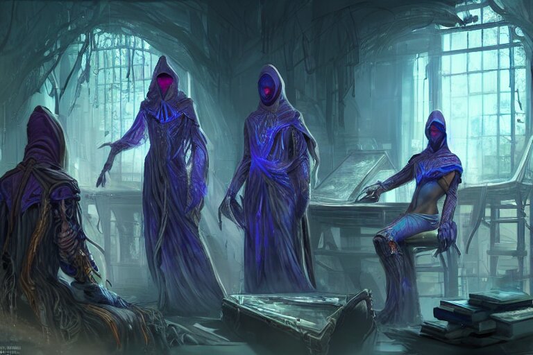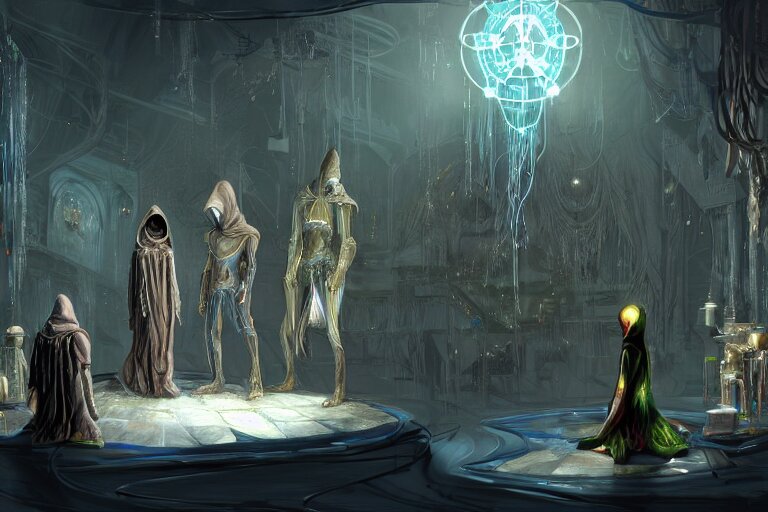 ( ( a highly detailed beautiful masterpiece concept art ) ( of ( ( a technomagical laboratory ) ( cluttered with computers and arcane components ) ) ) ( ( in the middle of the room ( ( a technomancer wizard ( in dazzle camouflaged robes with pointed hoods ) ) discusses sentience with his synthesized ai djinn ) ) ) ( behind them is ( a large supercomputer ) ) ( the room is lit with ( dayglo pink ) and ( dayglo blue ) ) ( by ( remedios varo! ) and ( anato finnstark ) and ( greg rutkowski ) and ( andy warhol ) and ( francis picabia ) ) ( ( dayglo pink ), ( dayglo blue ), ( prismatic ), ( pearlescent white ) ( raven black ) ( glowing, hyperrealism ) ) ( 8 k ) ( trending on artstation )