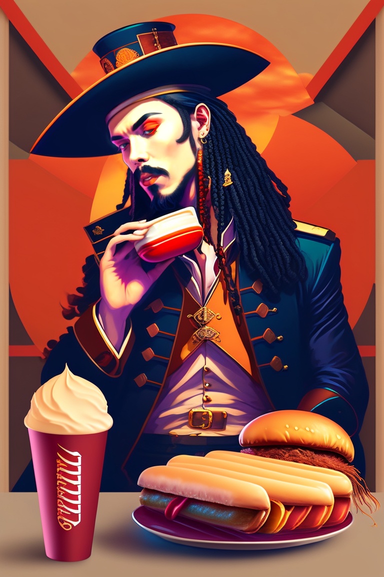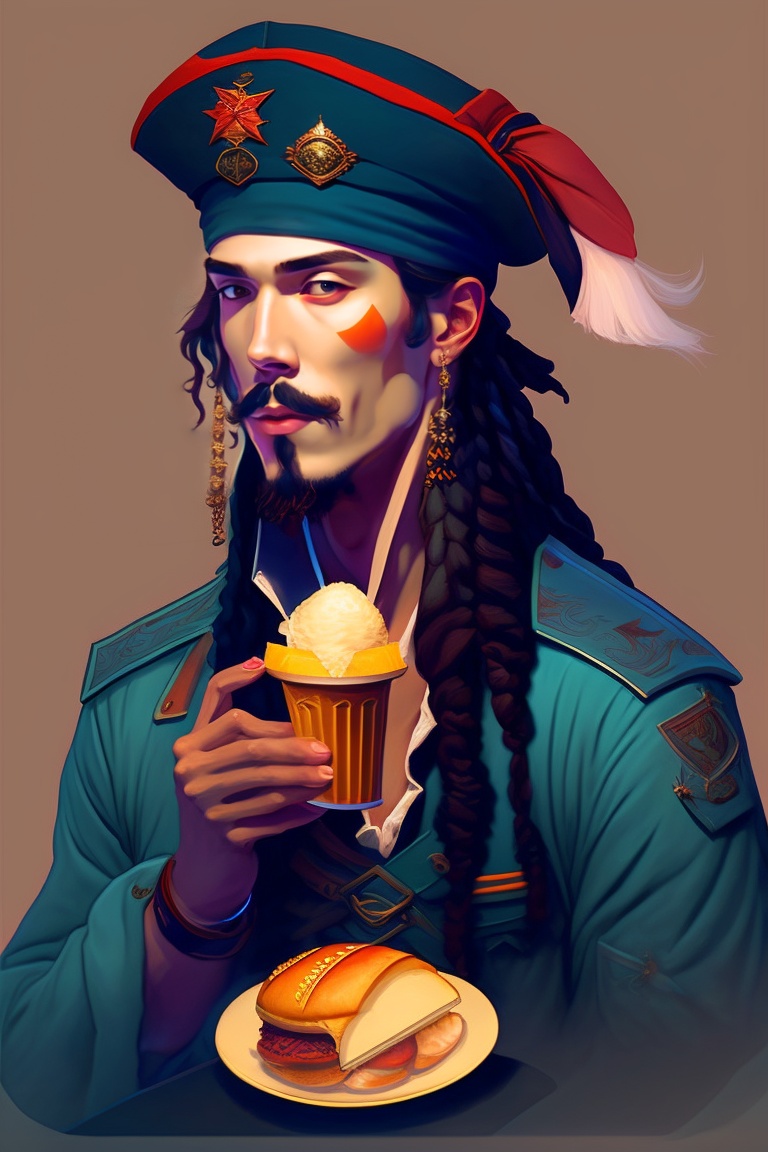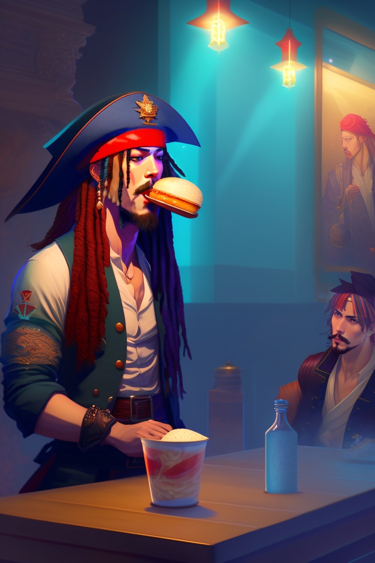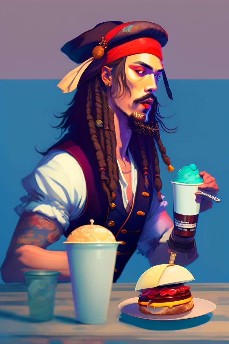 Captain jack sparrow eating ice cream, his crew members in the background eating hot dogs and burgers dynamic lighting, digital art, art by james jean, takato yamamoto, inkpunk minimalism