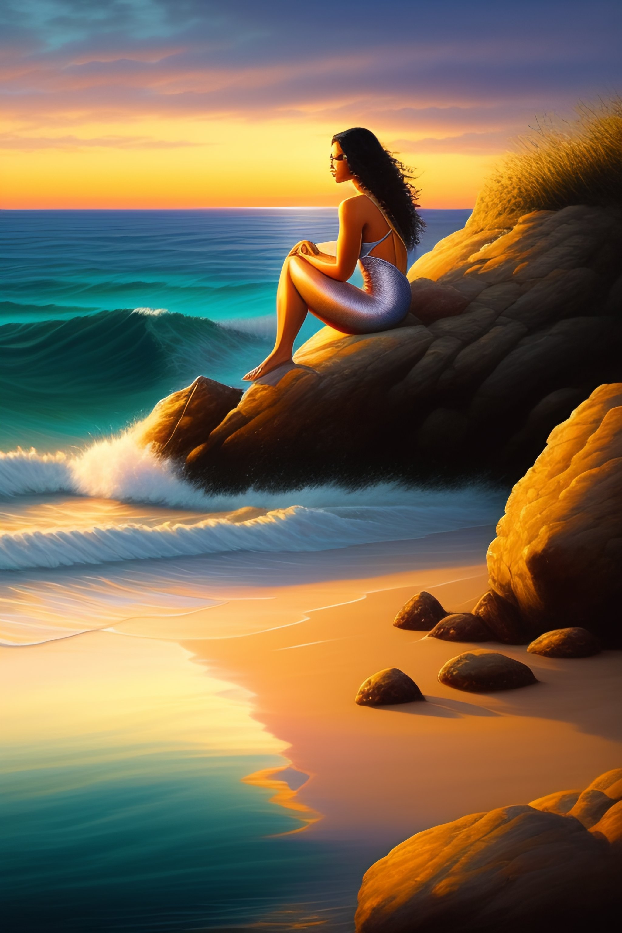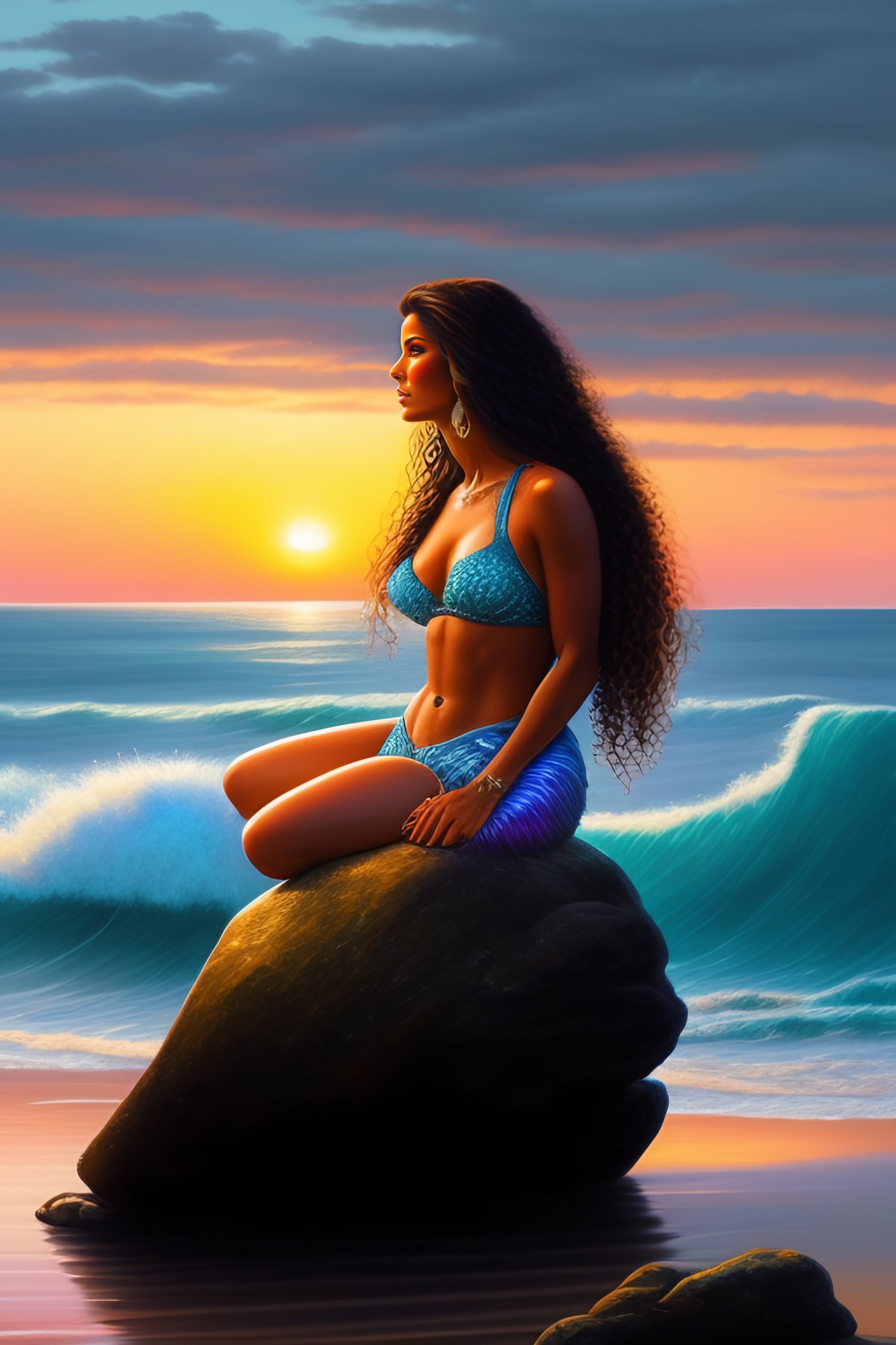 Peurto rican mermaid sitting on a rock at the ocean at sunset