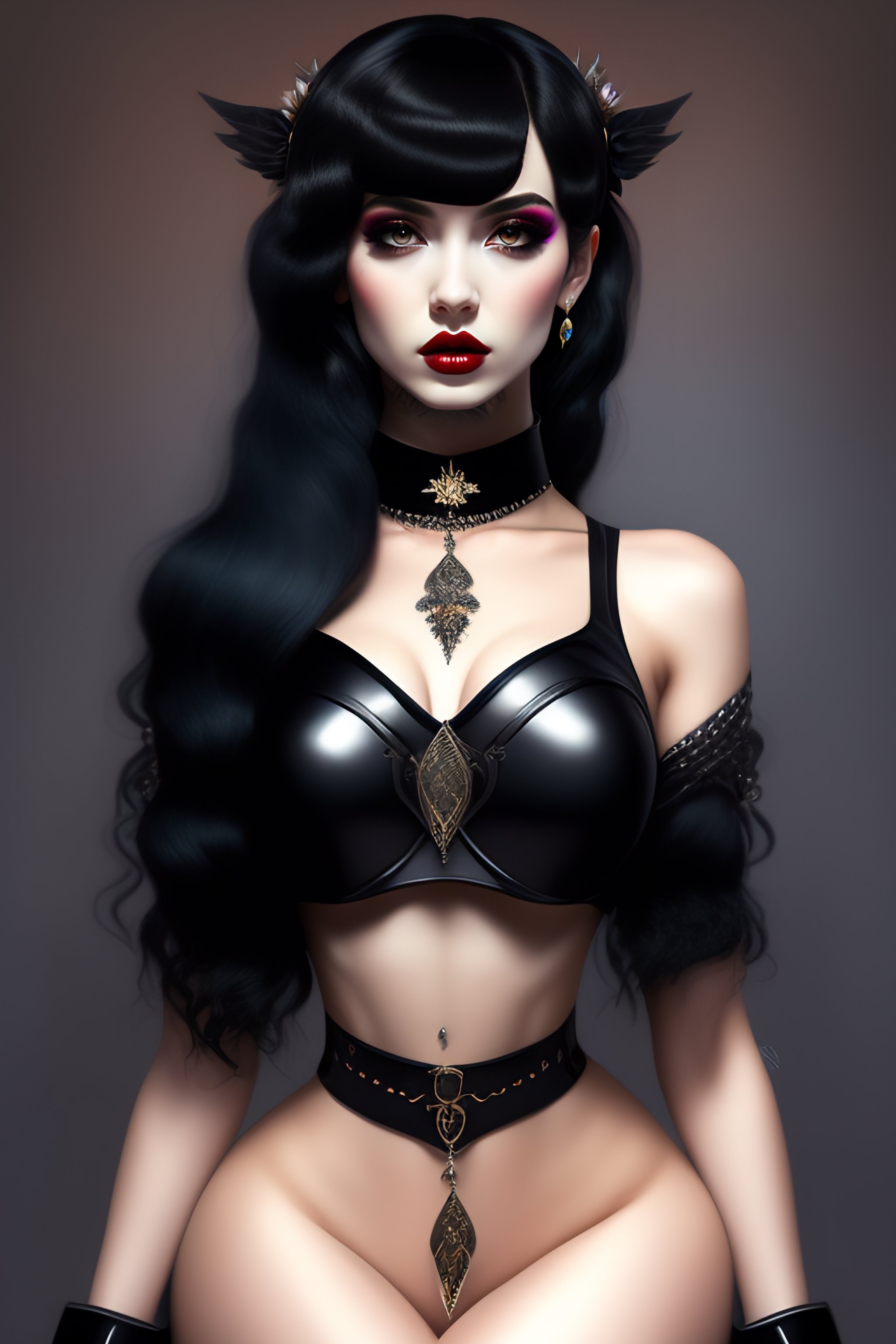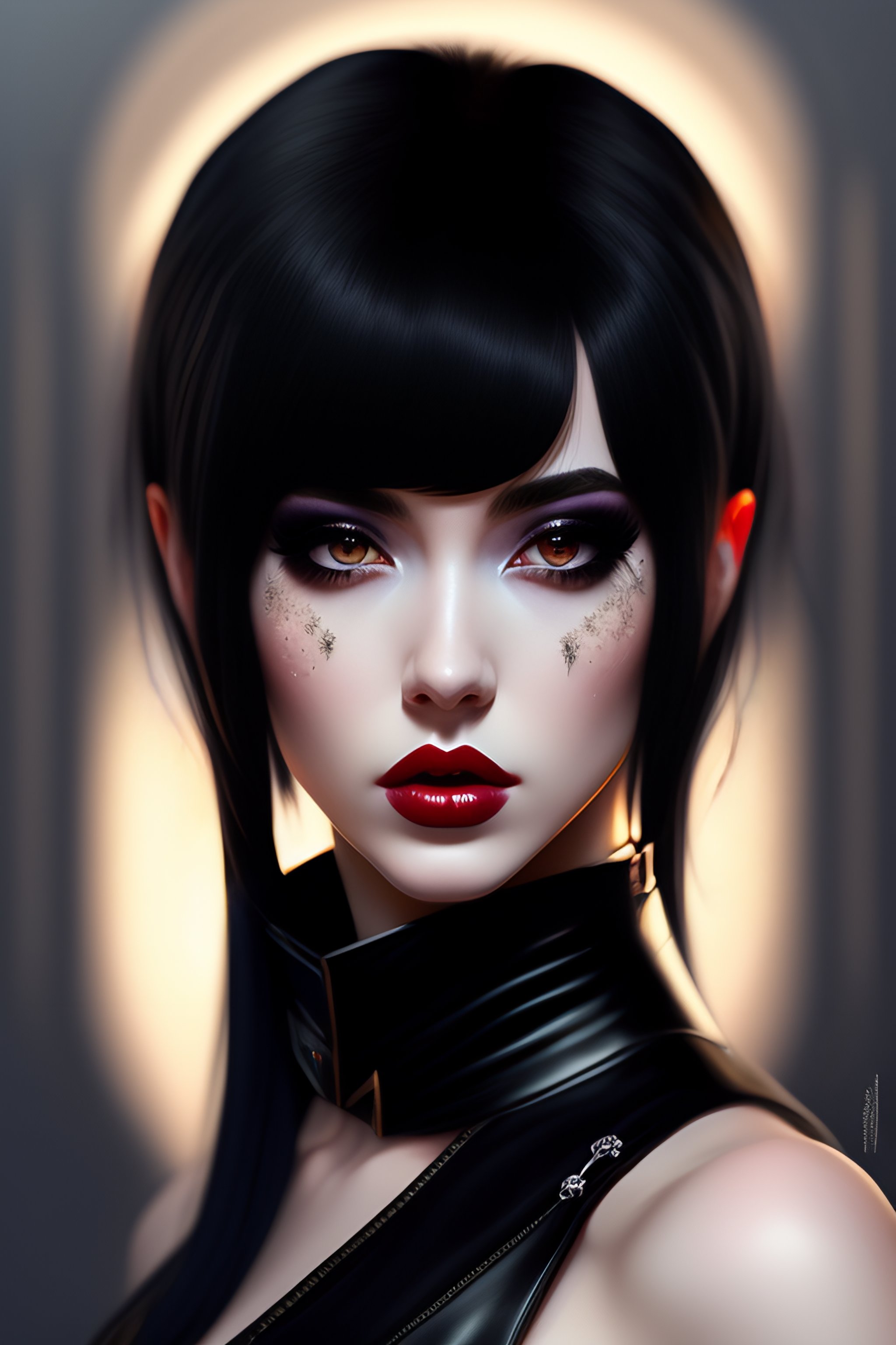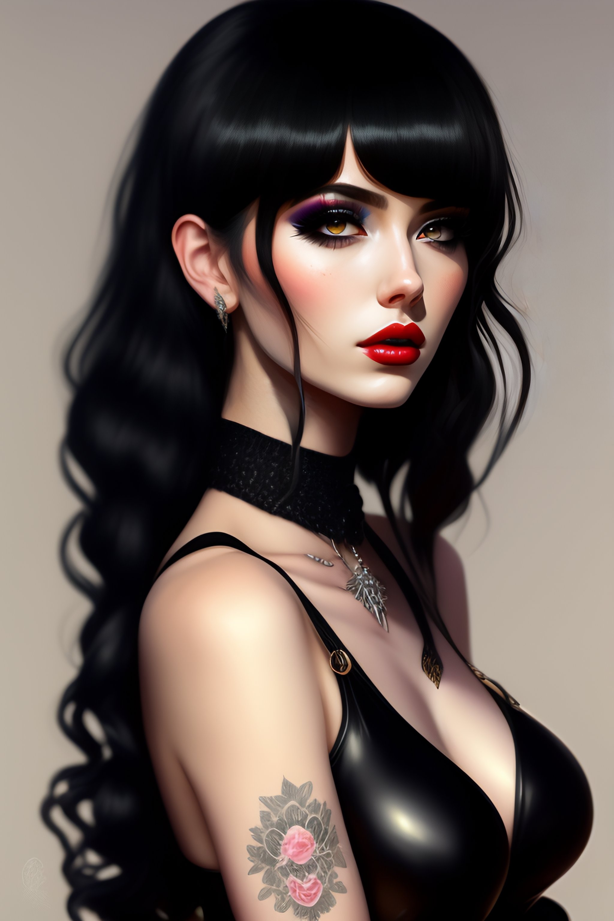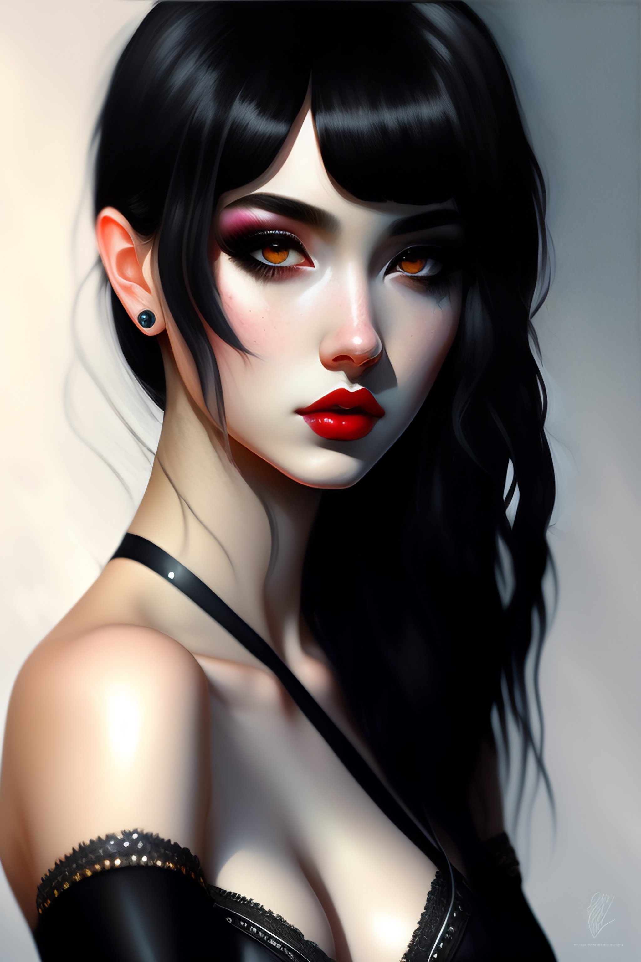 E-girl, fully body, black hair, bangs hairstyle, pale skin, high detail, highly detailed, digital painting, blank background, black fingernails on fingers, black lipstick, goth clothing, emo