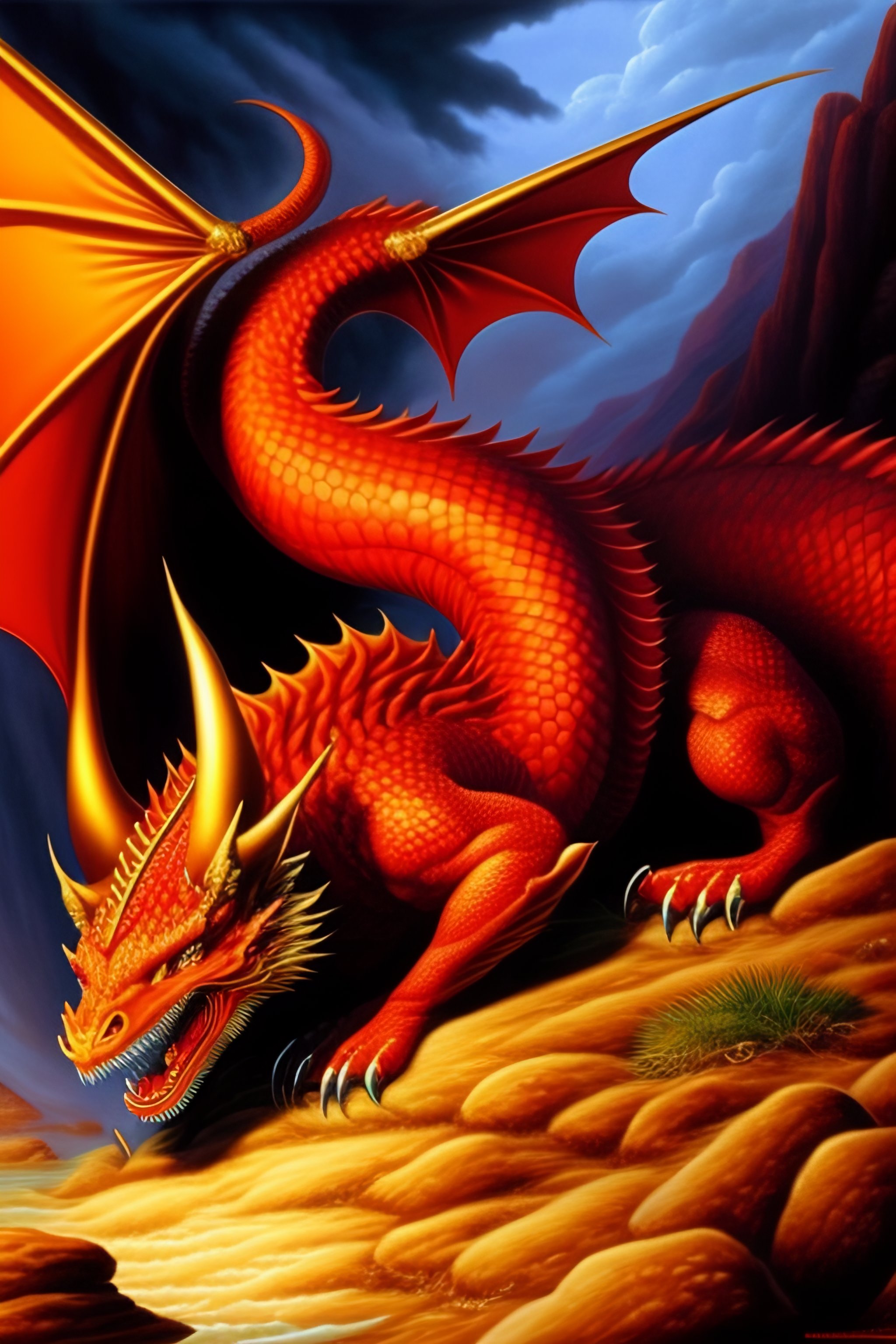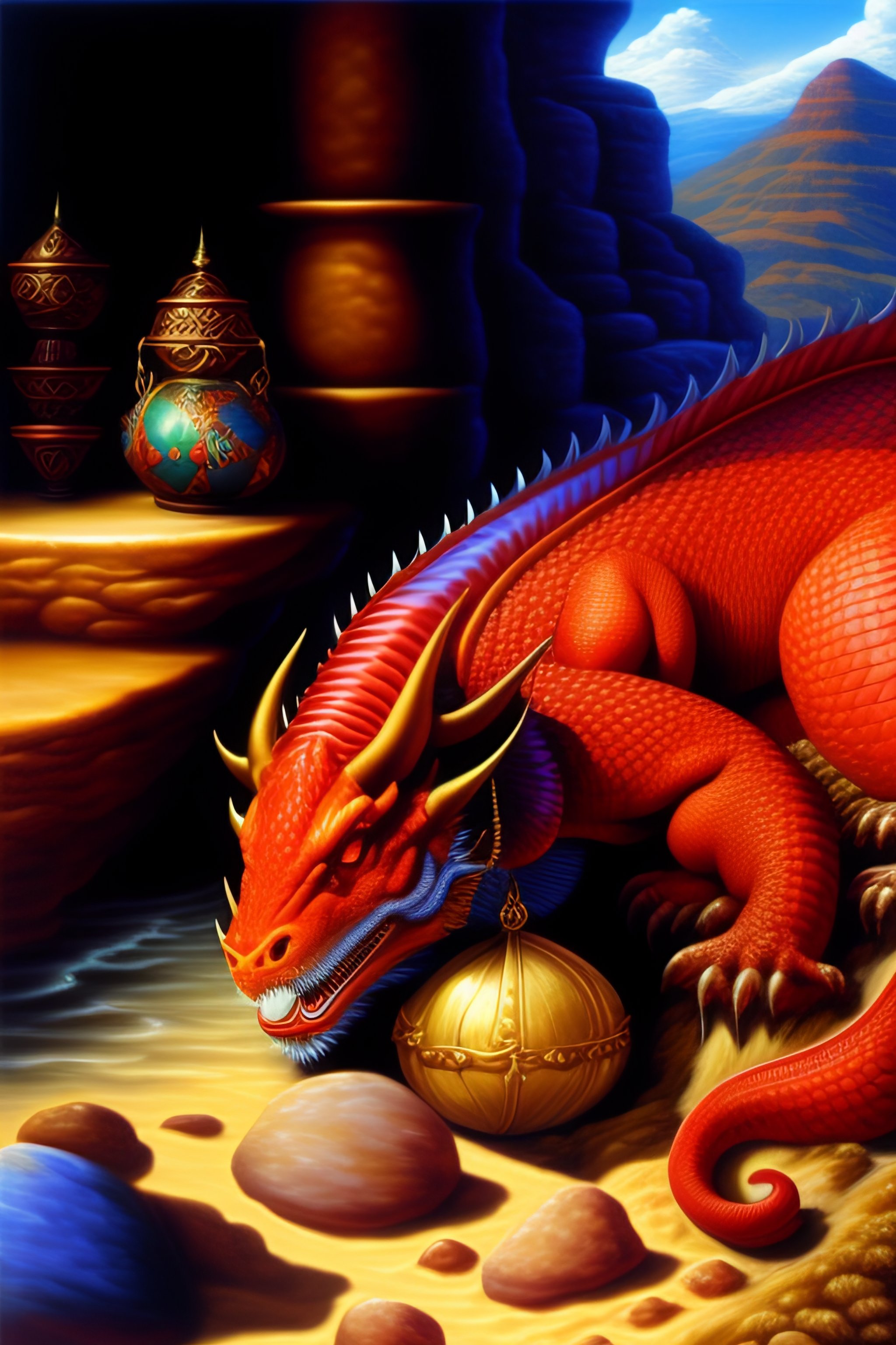 red dragon lying on treasures