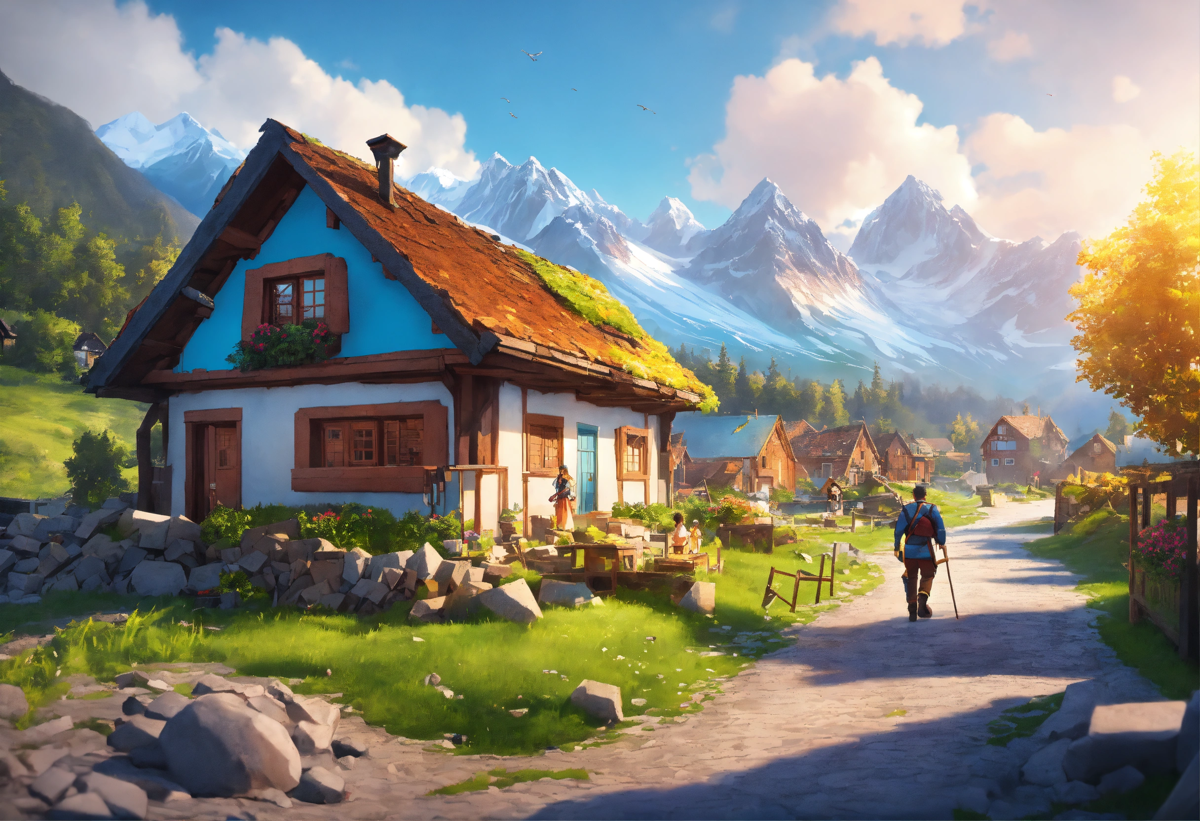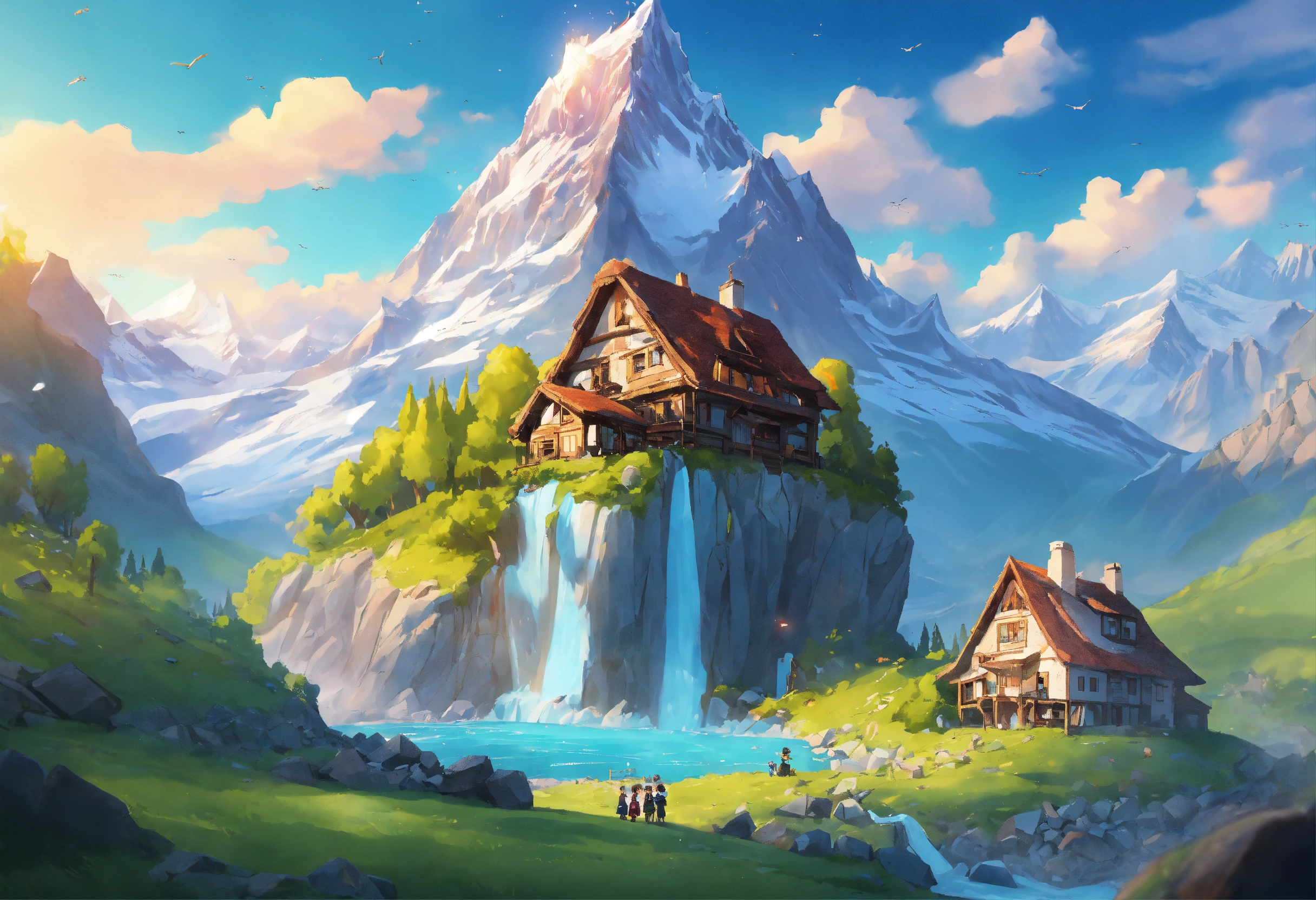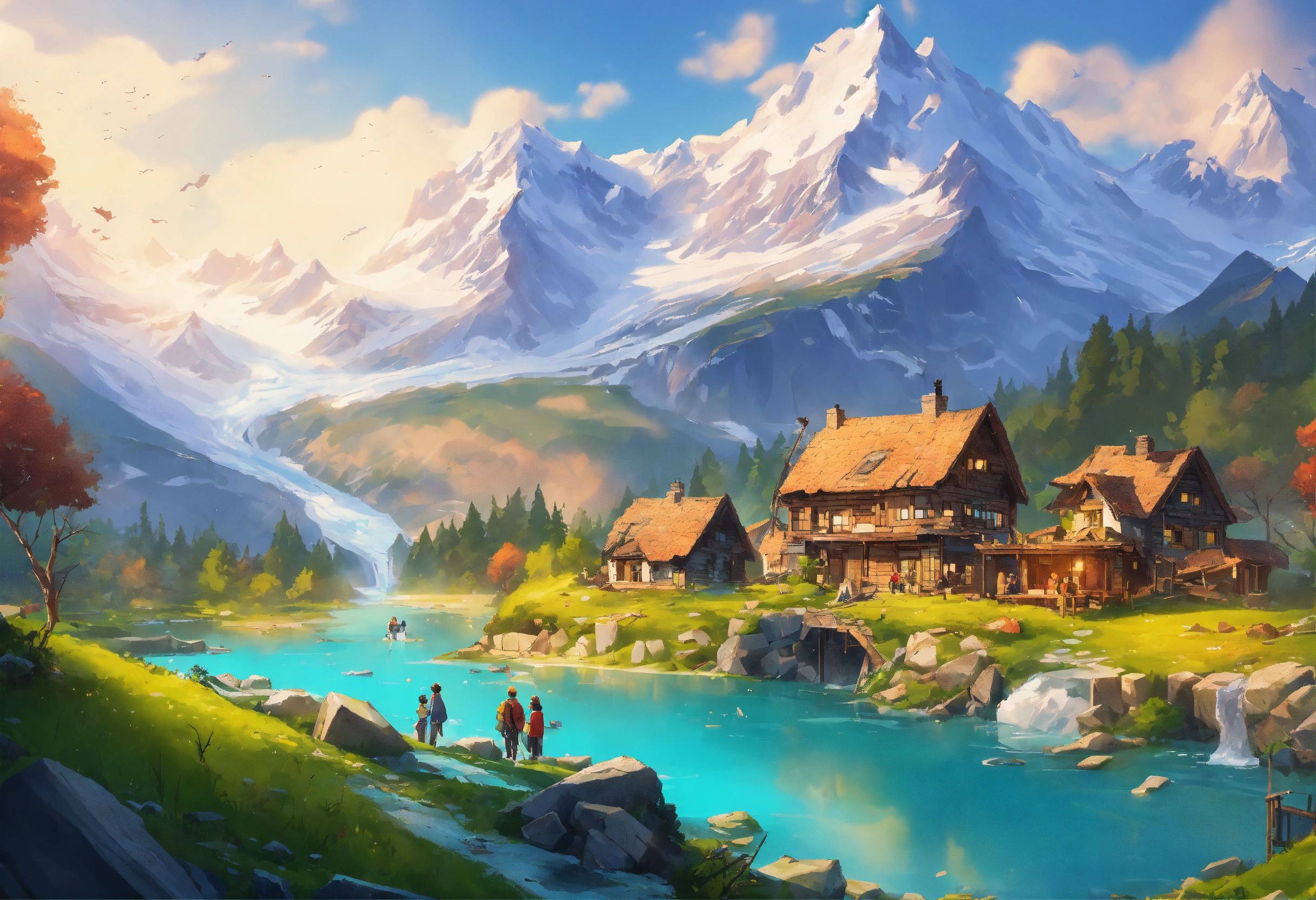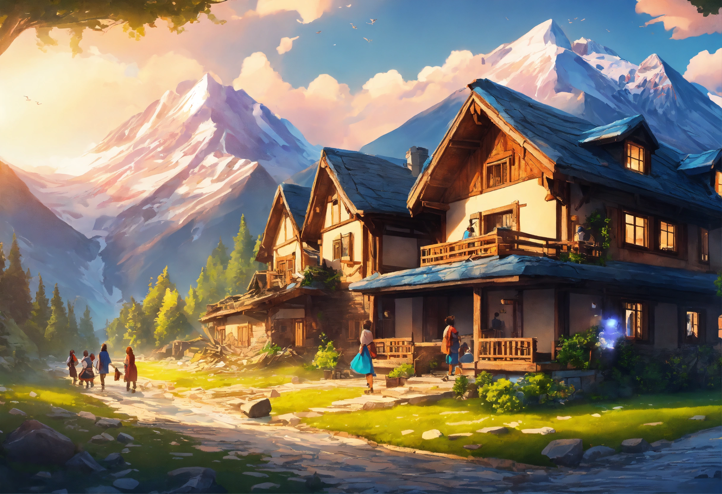 And then everyone saw that the glacier fell on the village and all the houses were destroyed, but there was no loss of life, the three friends were happy with their success, ai cartoon 4k hd image 2 parallel fast generations