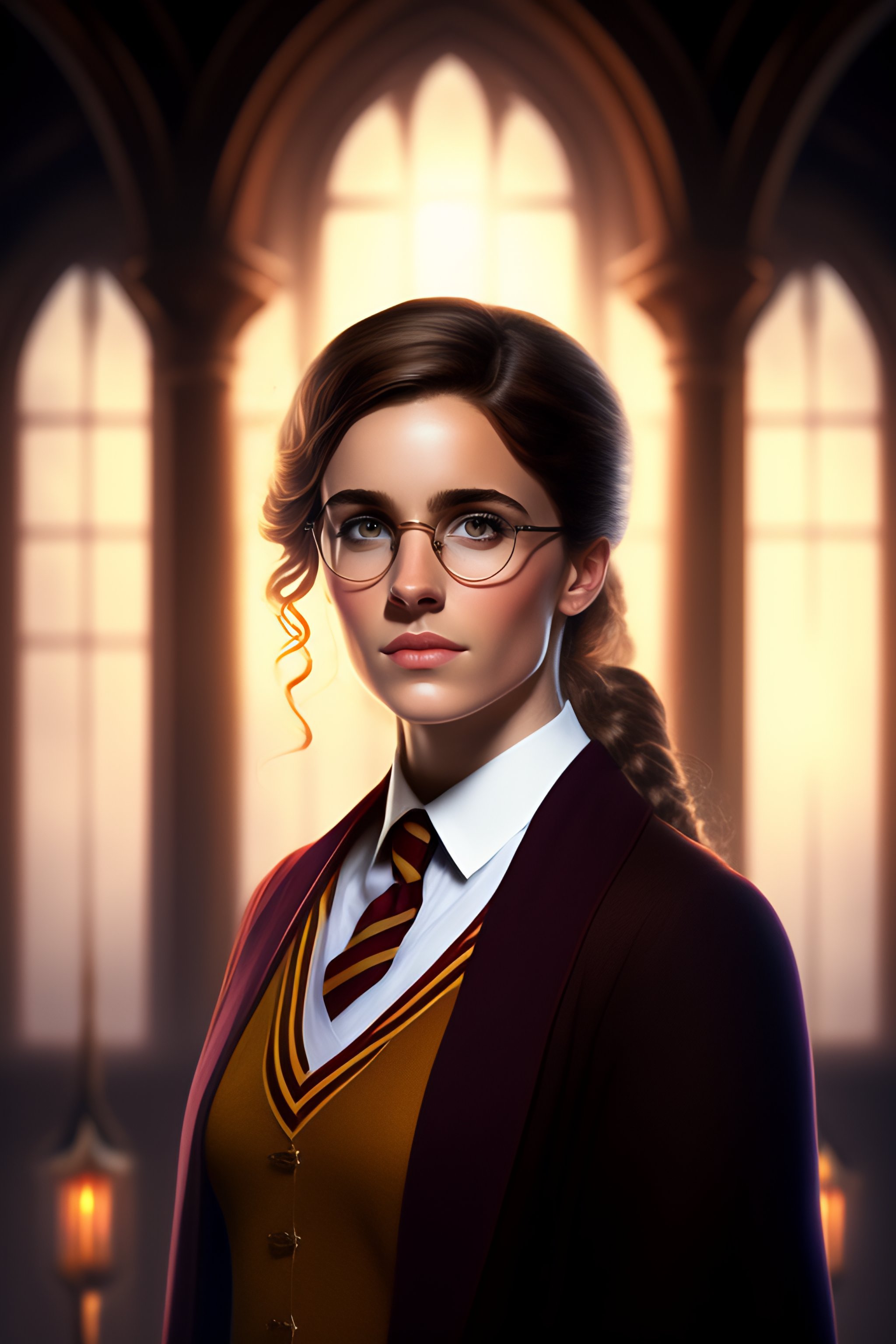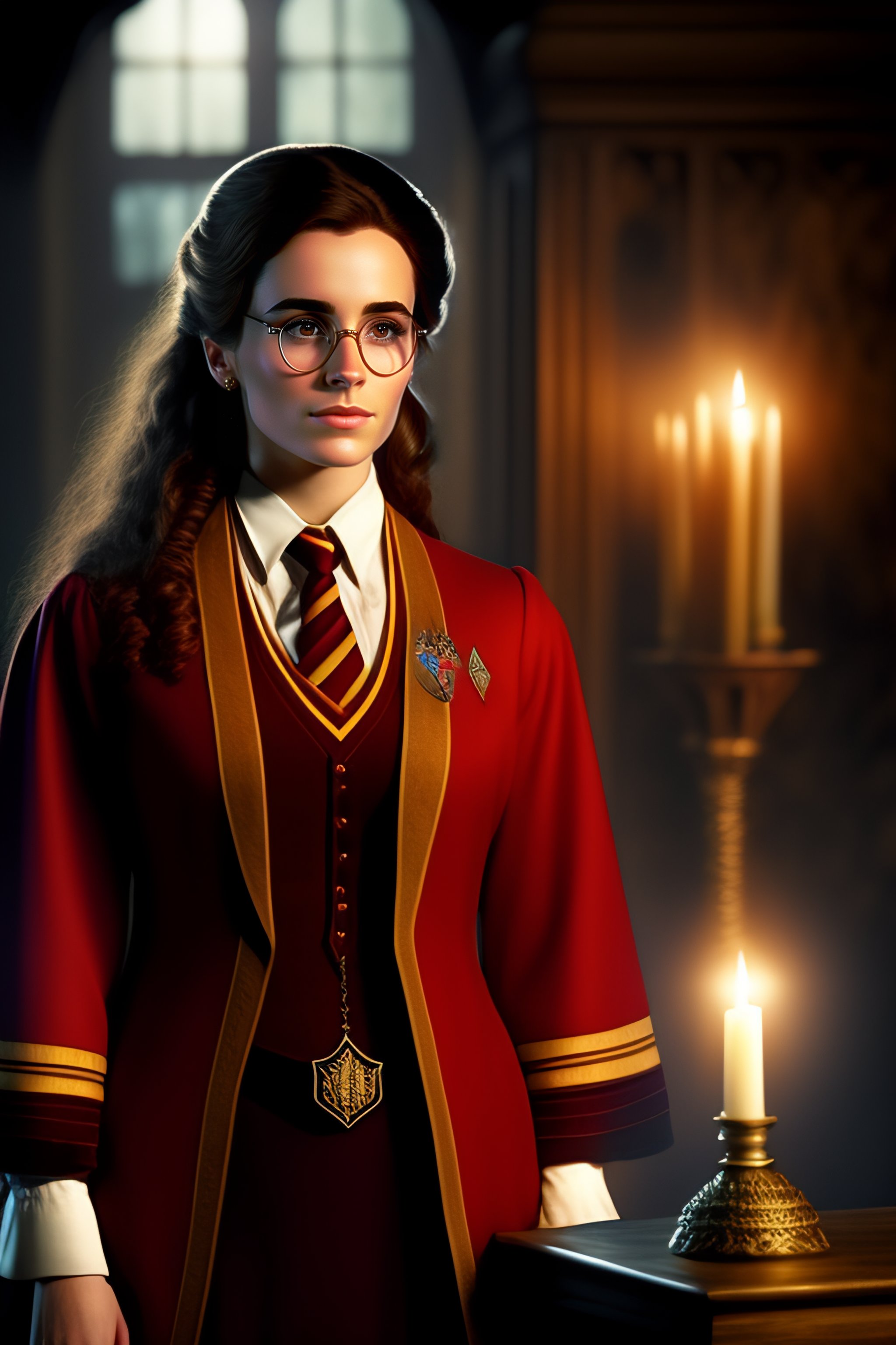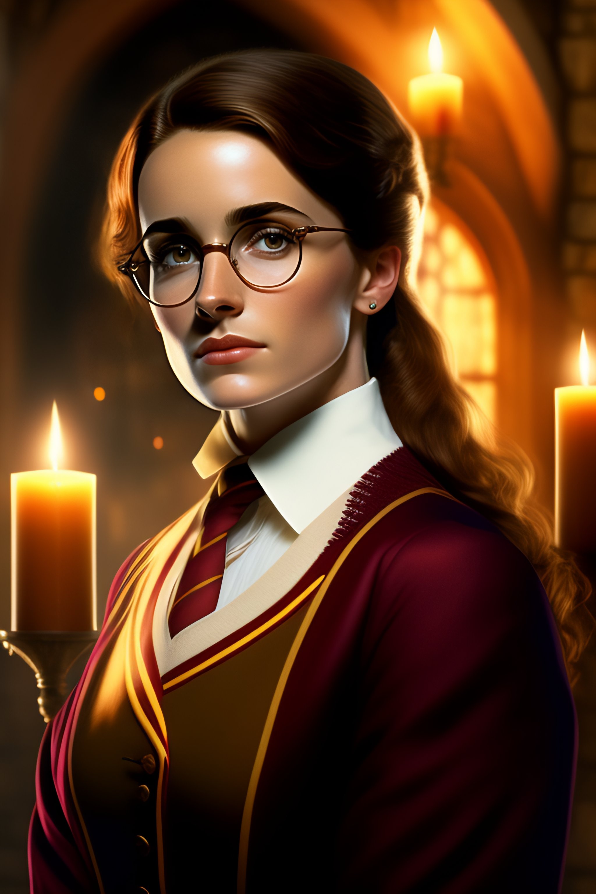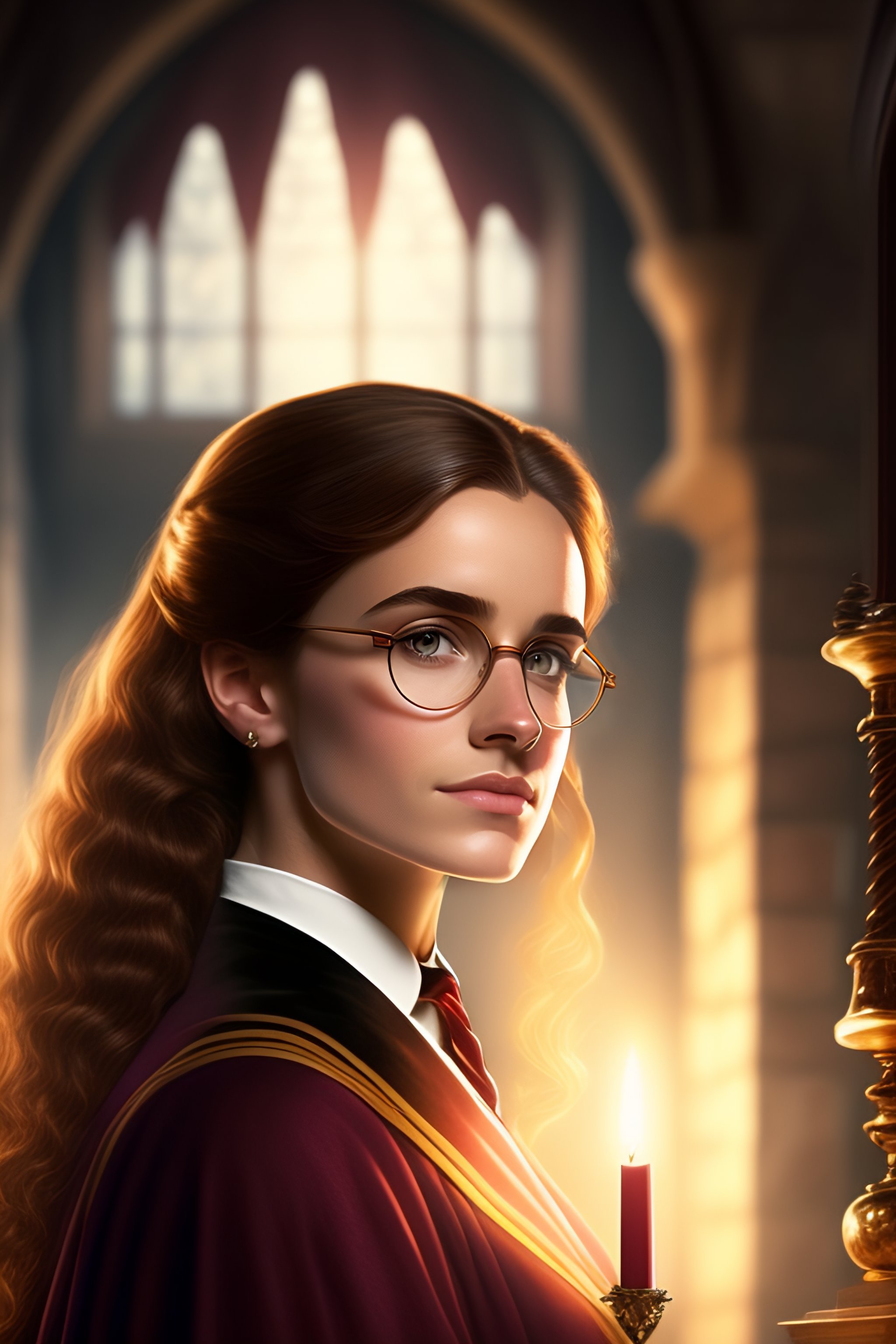 Hermione granger has bushy brown hair styled in a messy bun and glasses perched on her nose, dressed in her hogwarts school uniform, with a crisp white blouse, a maroon and gold striped tie, and a black robe, posed in a way that captures her intelligence and determination, arms crossed and a serious expression on her face. background depicting the interior of hogwarts castle, with stone walls, arched windows, and flickering candles, soft and atmospheric lighting, magic and mystery. the overall tone of the image should be dynamic and engaging, evoking the wonder and adventure of the harry potter series