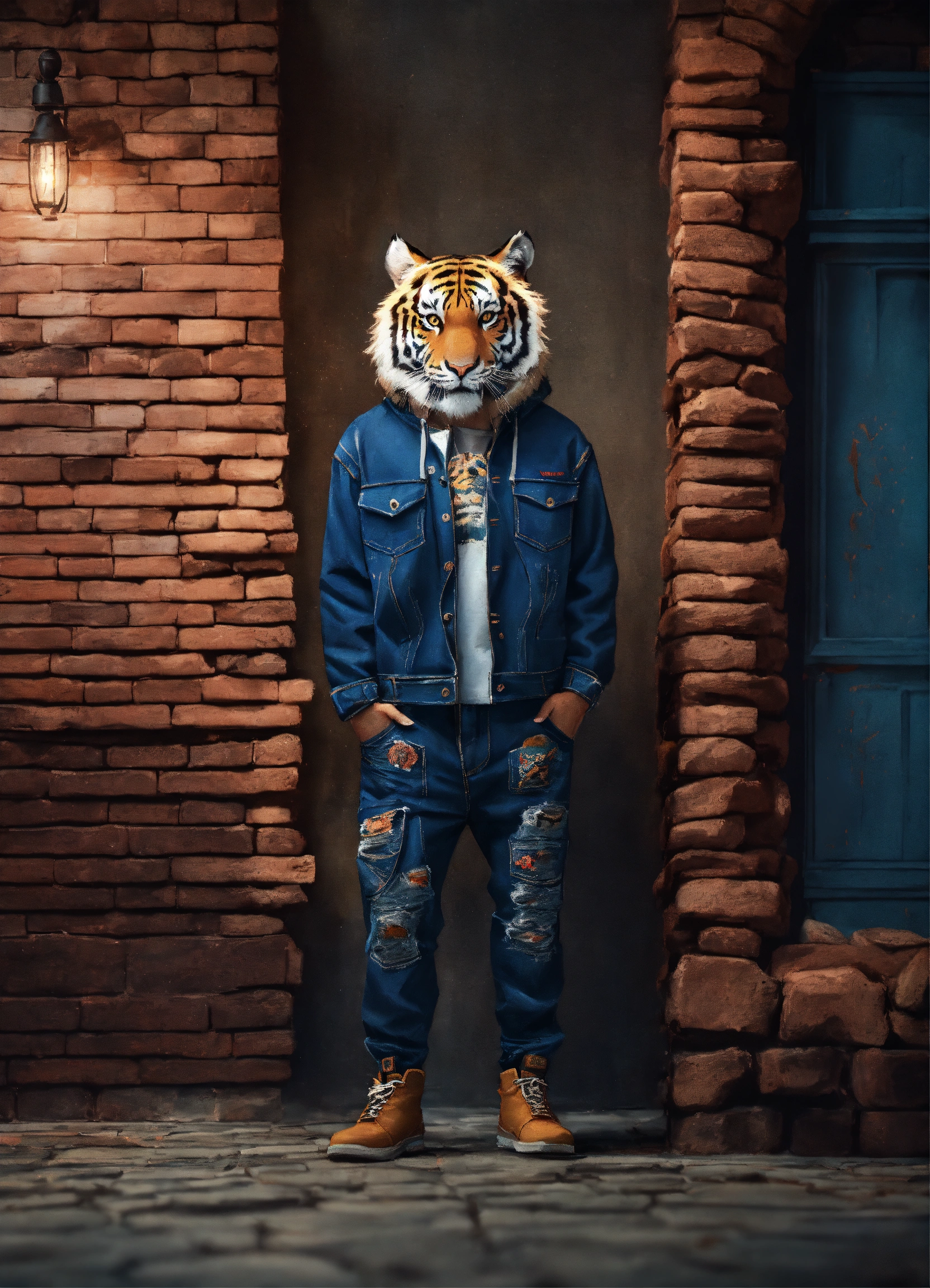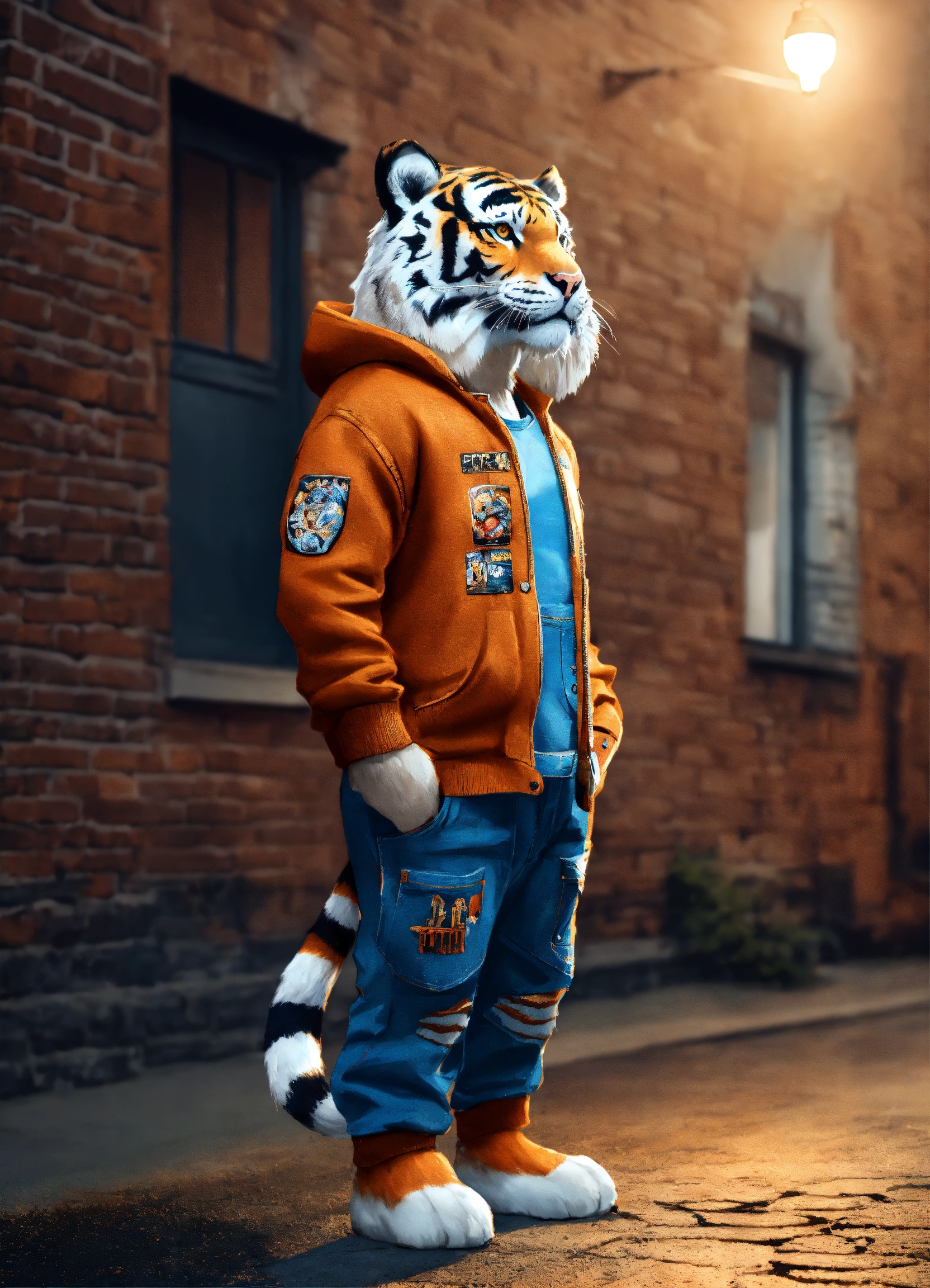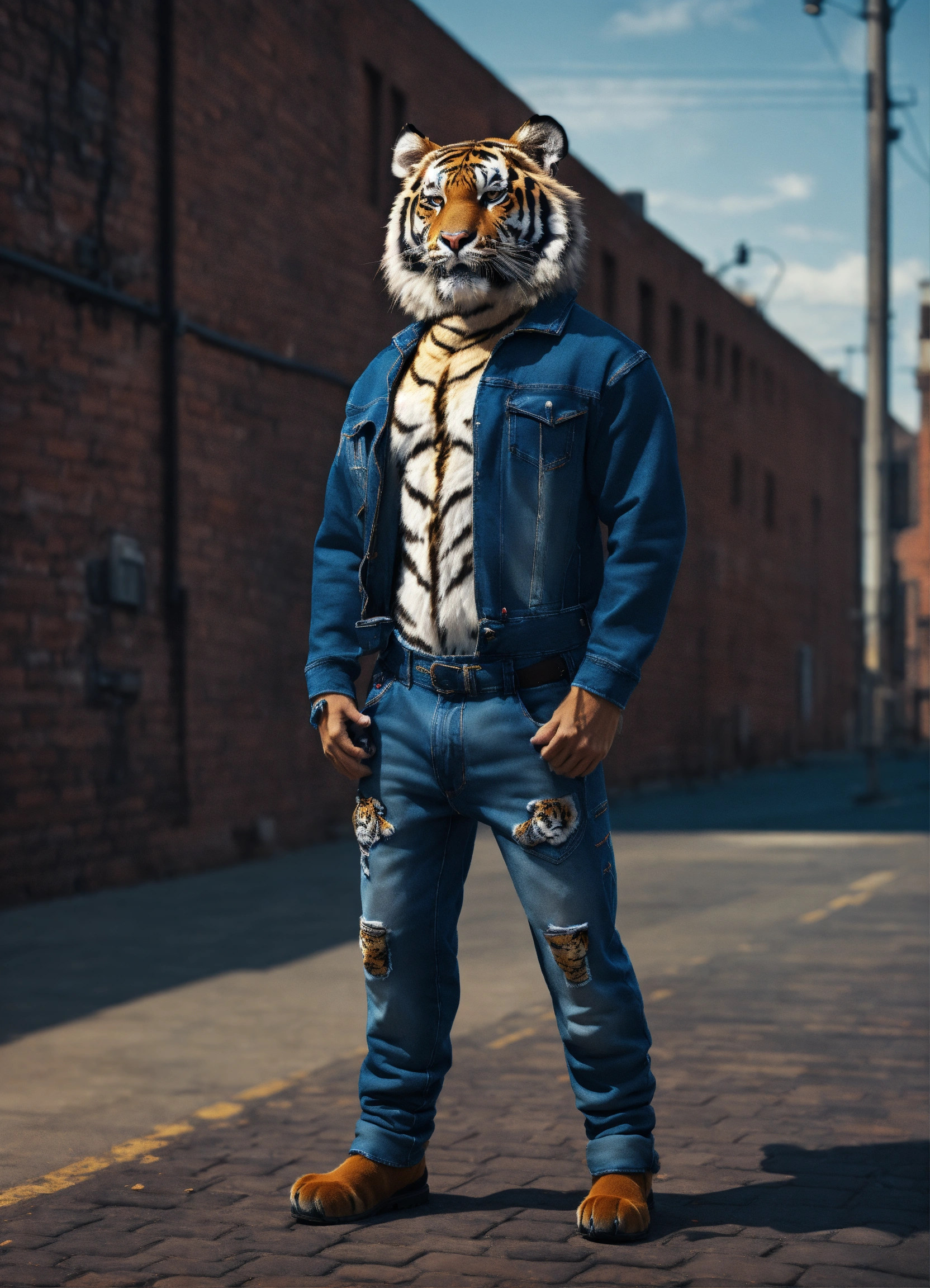Extremely realistic tiger. muscular body in a long sleeve sweatshirt. in denim overalls. standing on the asphalt with his paws in his pockets. against the background of a brick wall. volumetric lighting, maximalist photo illustrations, 8k concept art, meticulously detailed, complex, expansive, fantastical.