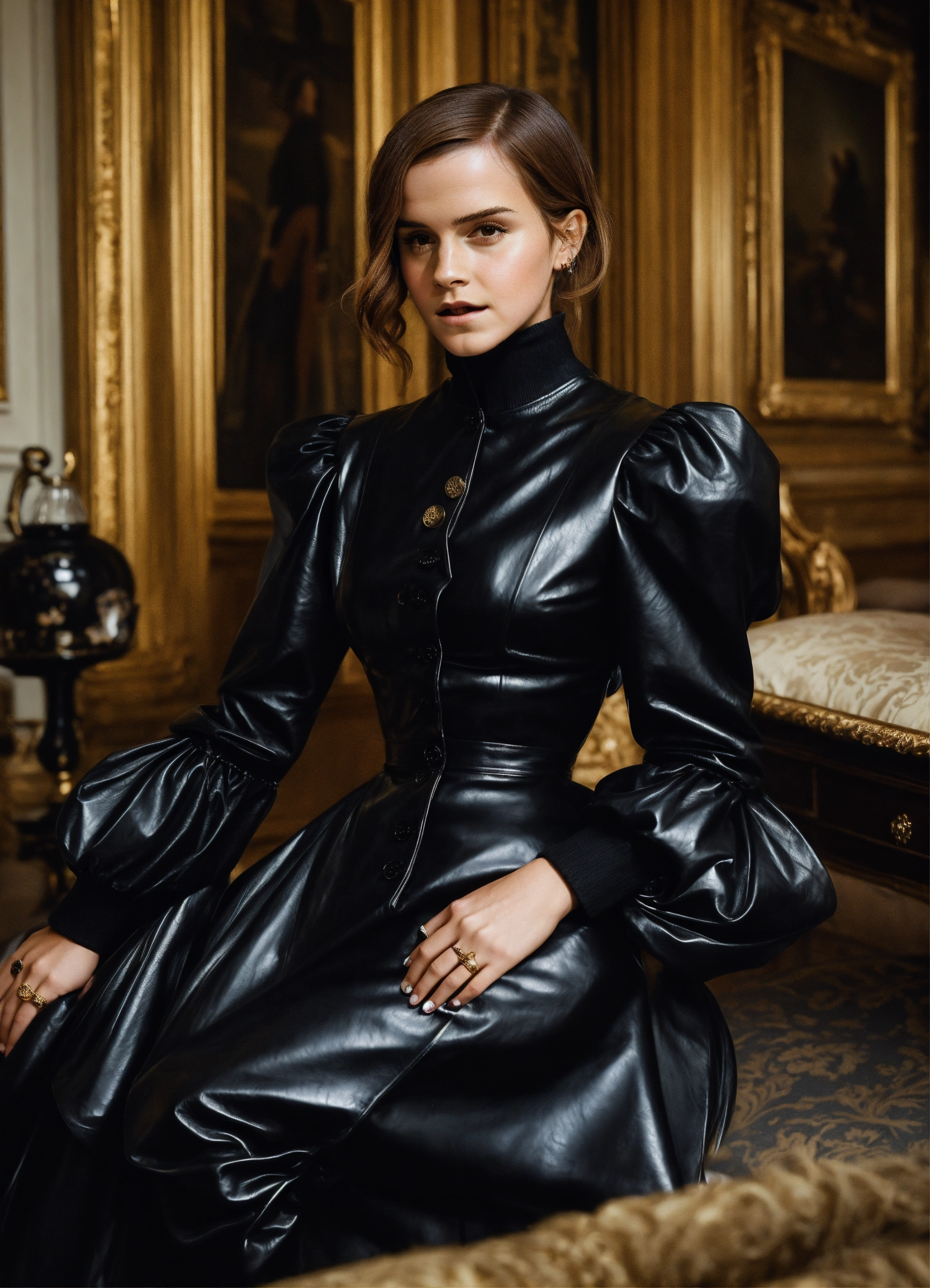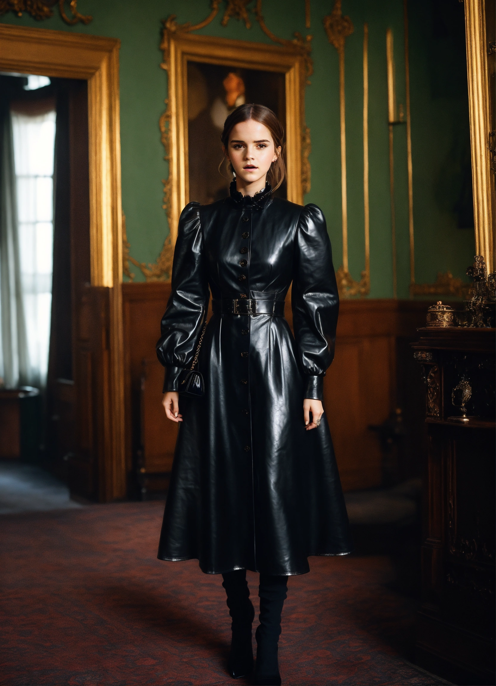 Stunning female emma watson, black victorian governess shiny leather dress with big buttons, big long puff sleeves, mansion room