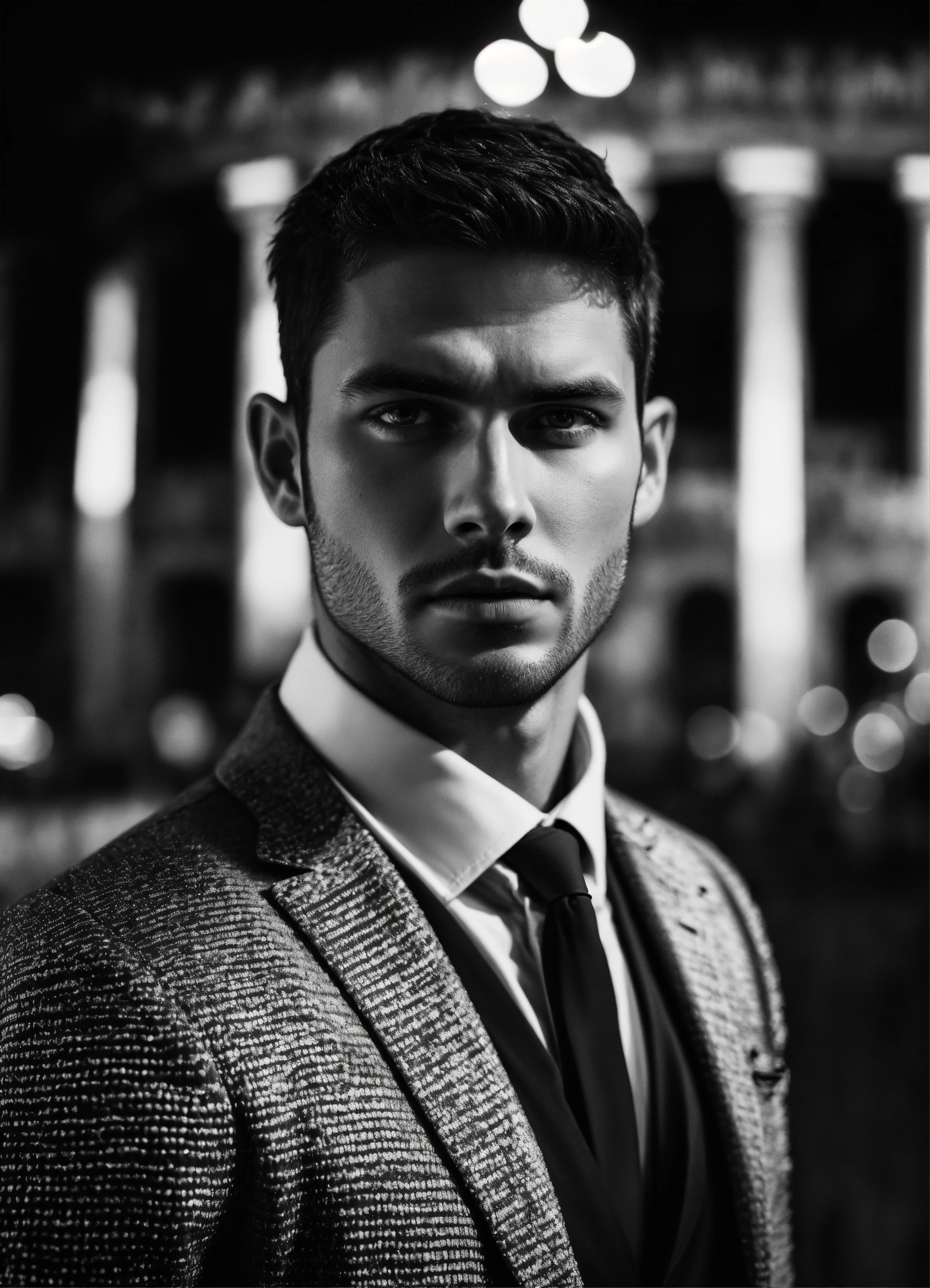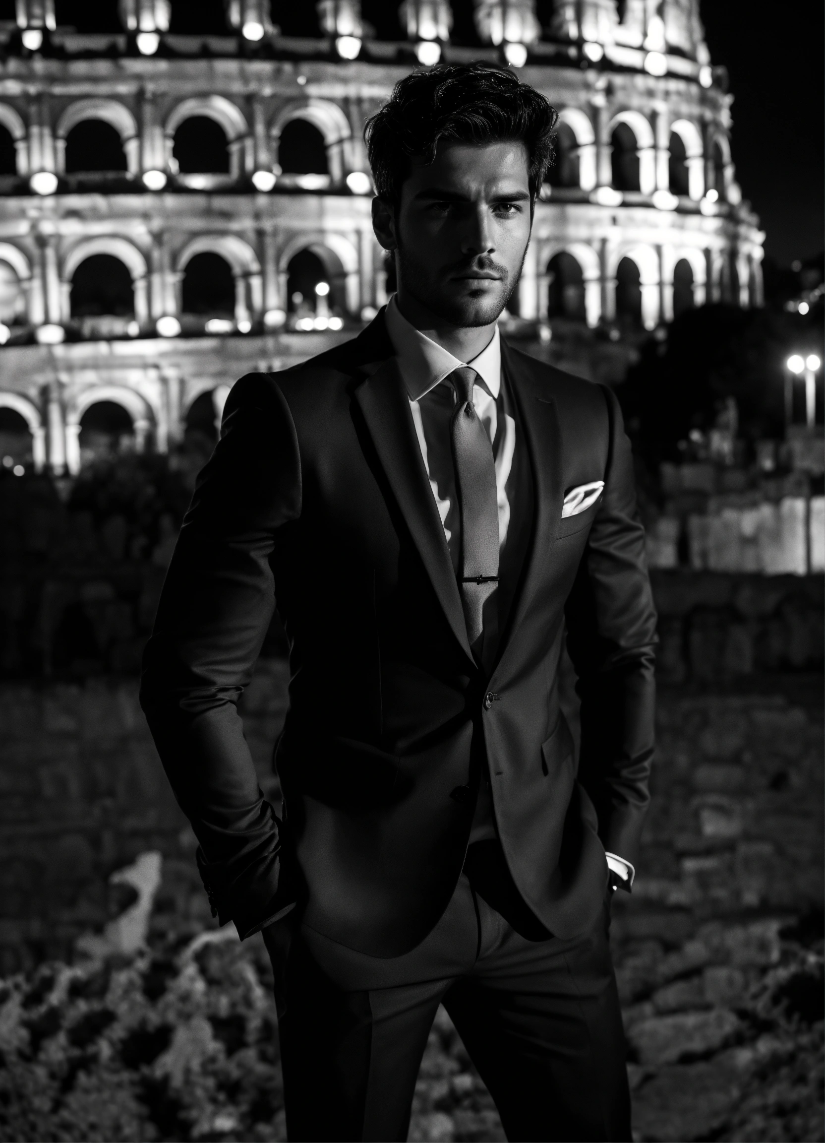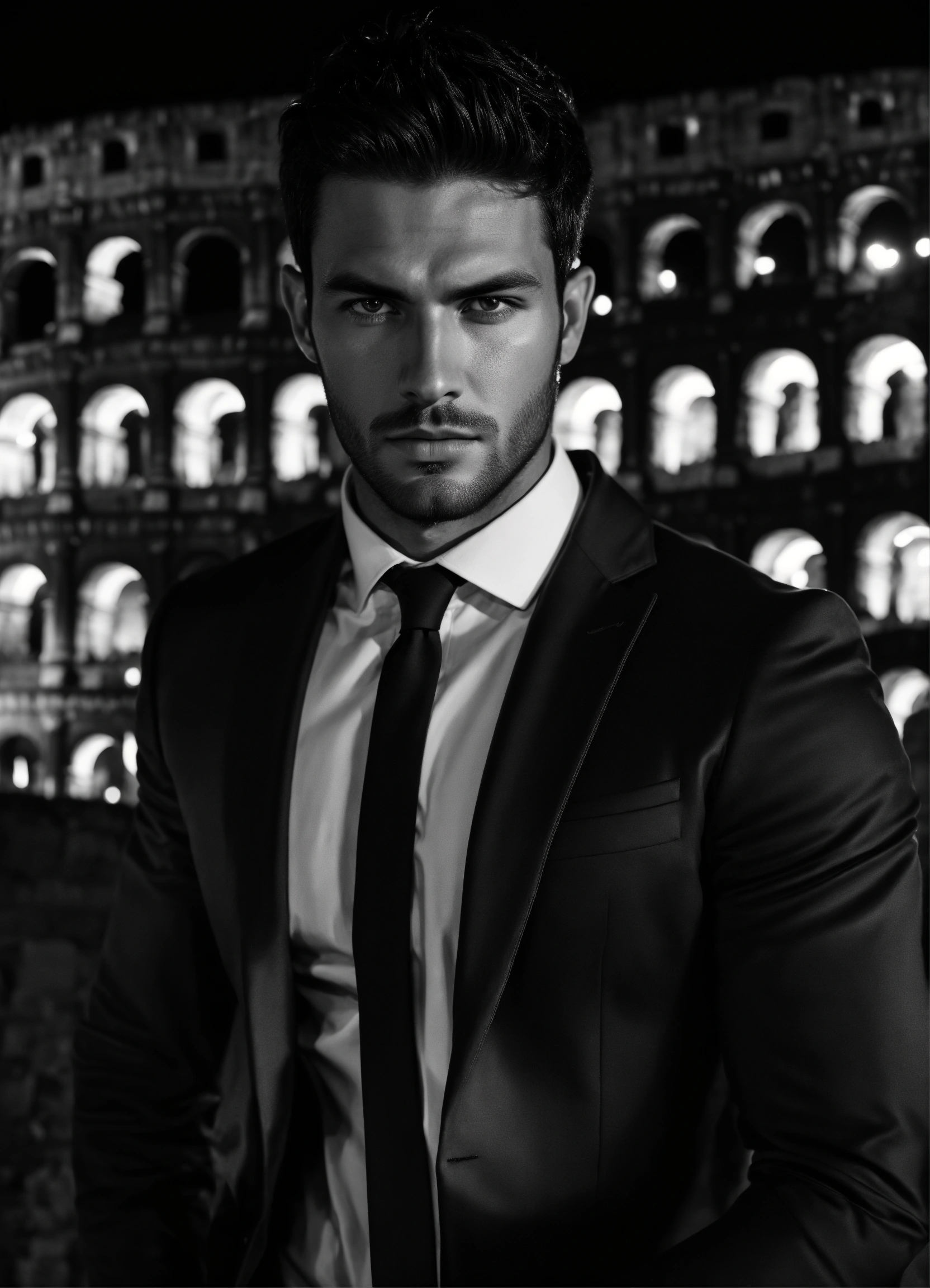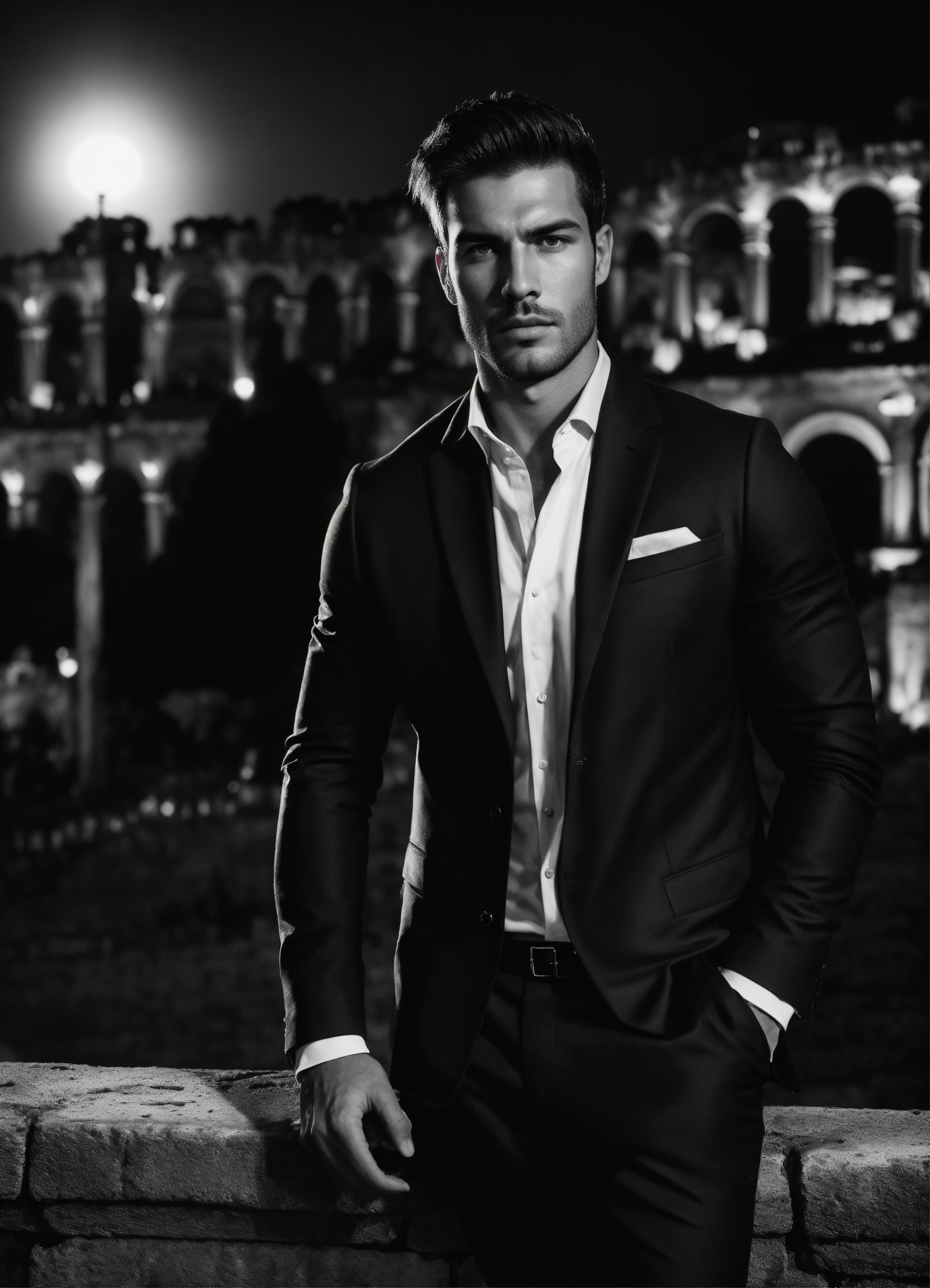 Photo of male model gonçalo teixeira, black and white, realistic, portrait, not painted, very detailed faces, skin with pores, 4k, dark suit, skin not smoothed, desire in the eyes, glowering, looking into the camera, dark shirt. colosseum in rome in full view at night as background